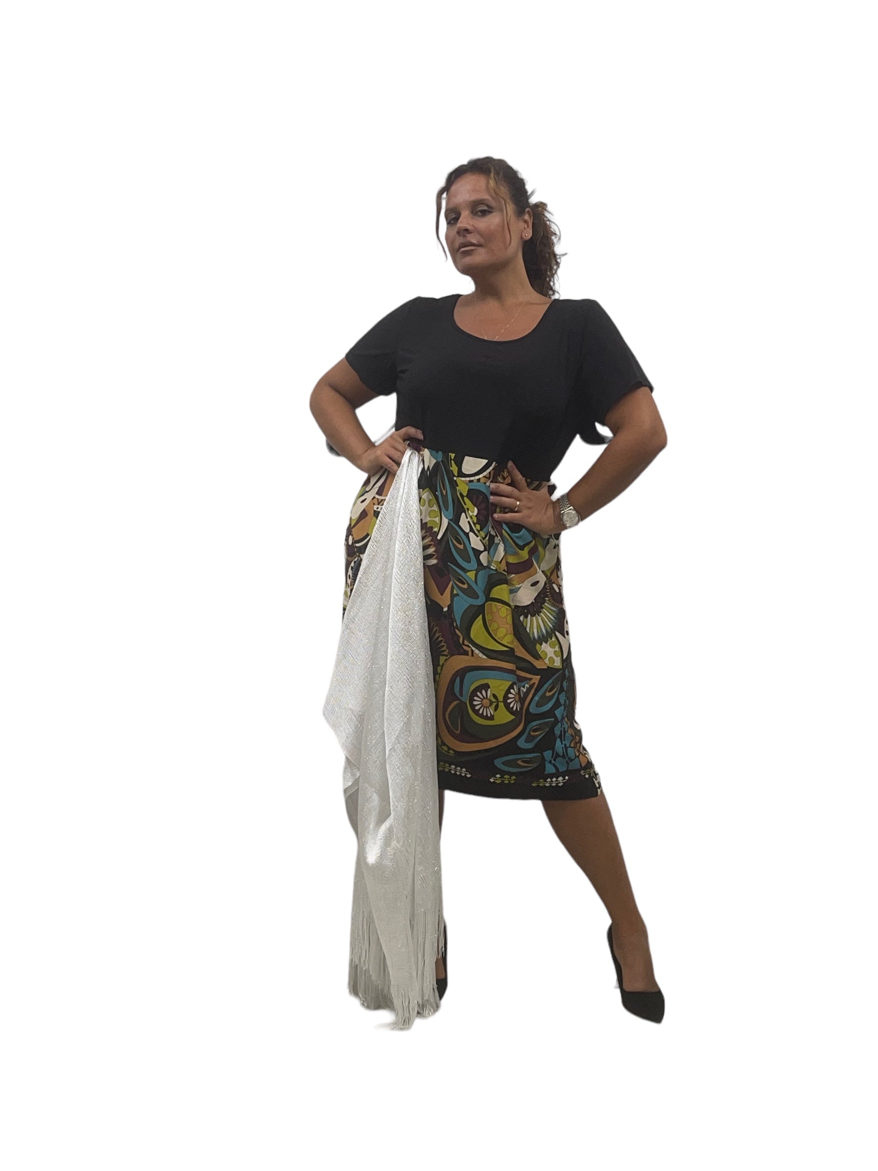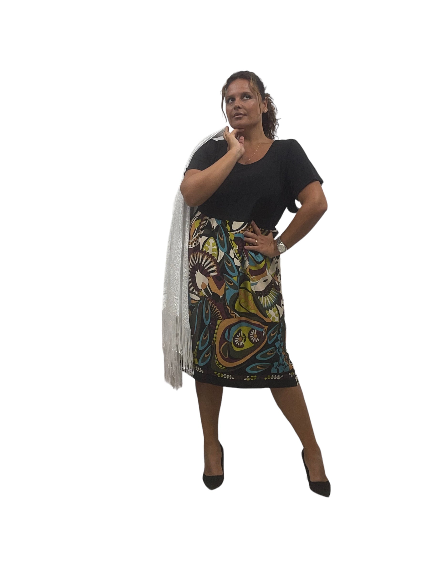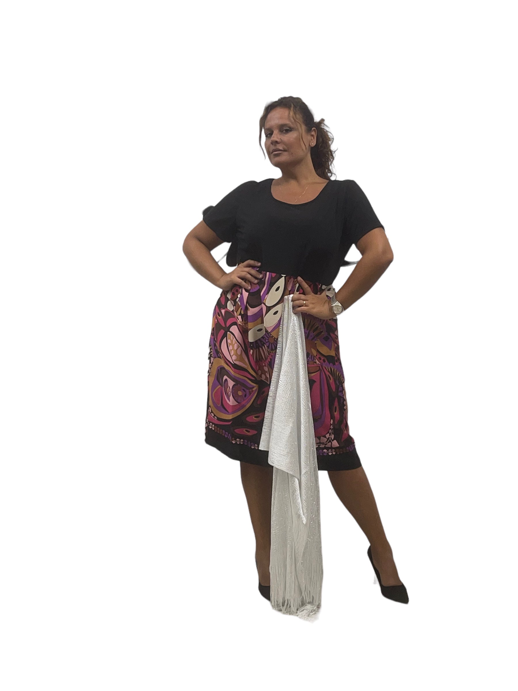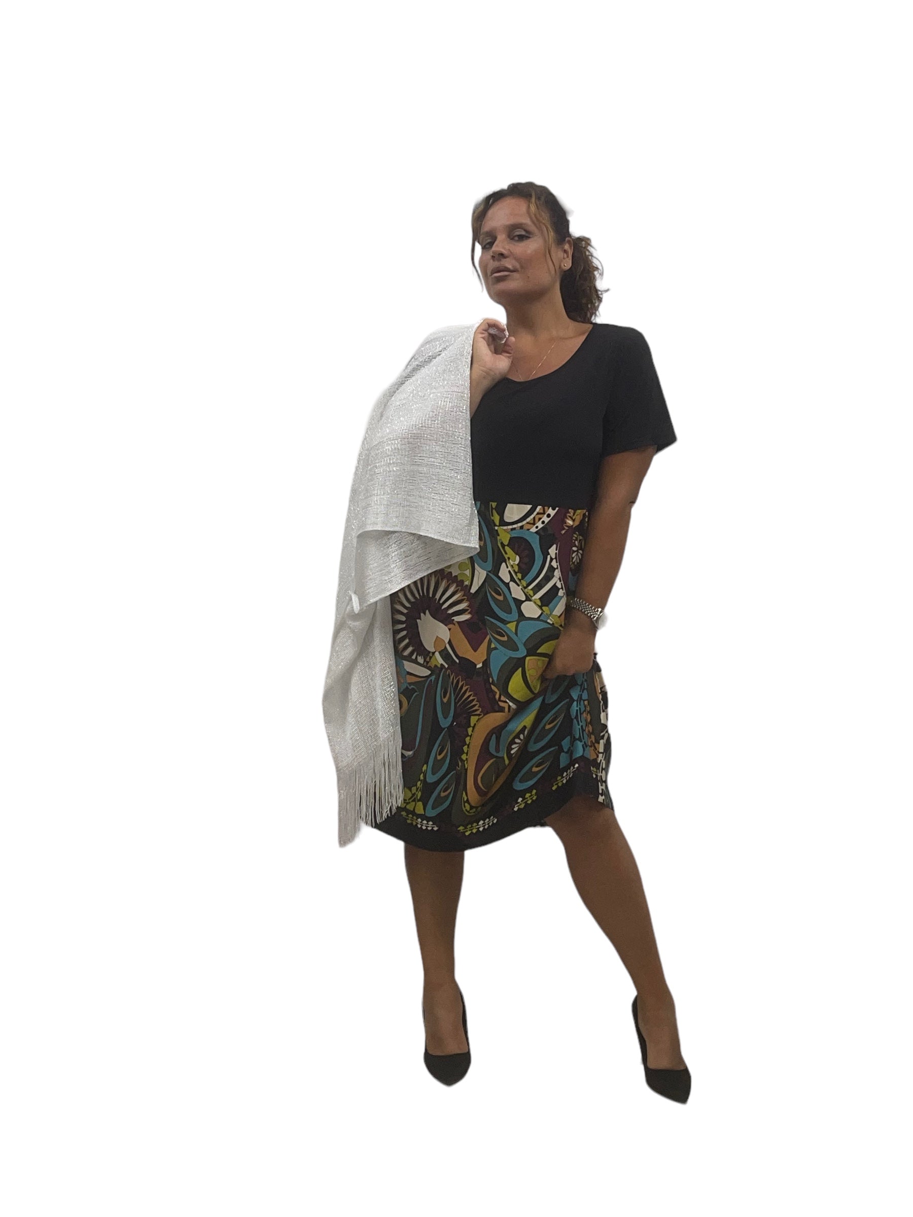 Abito over col sopra in maglina tinta unita e sotto fascia fantasia