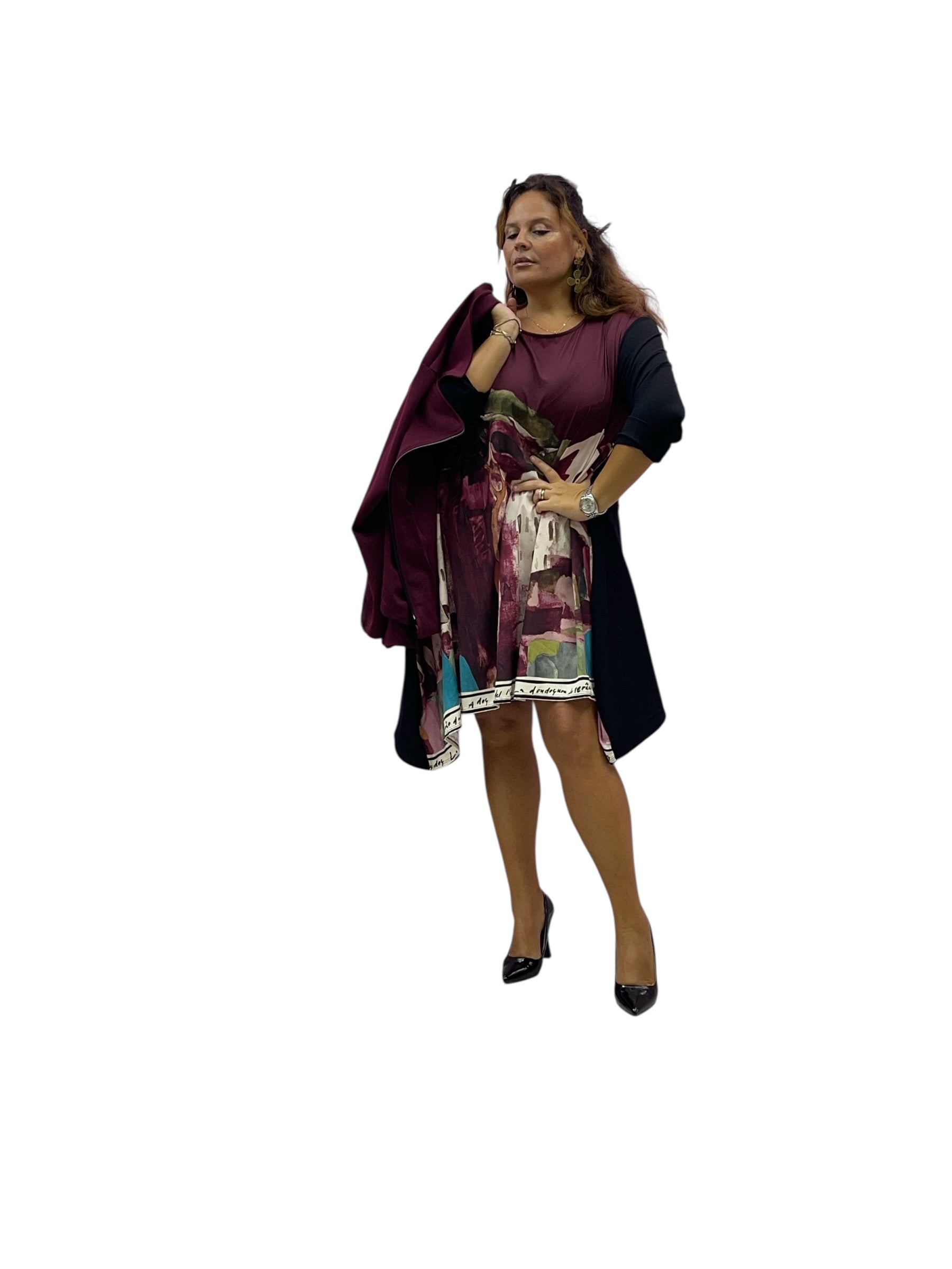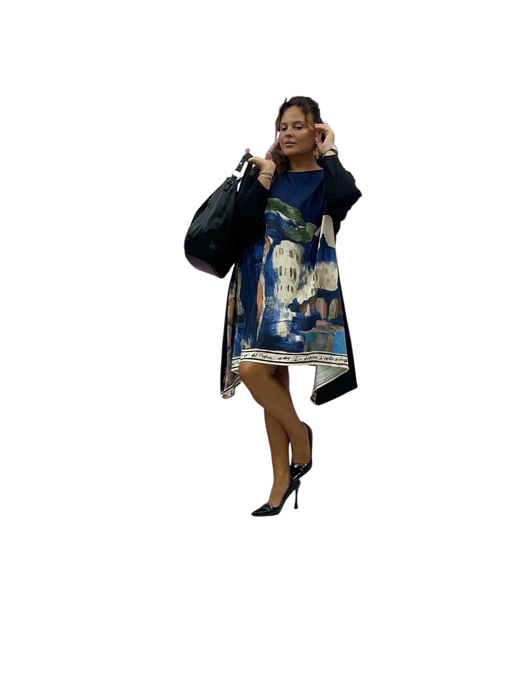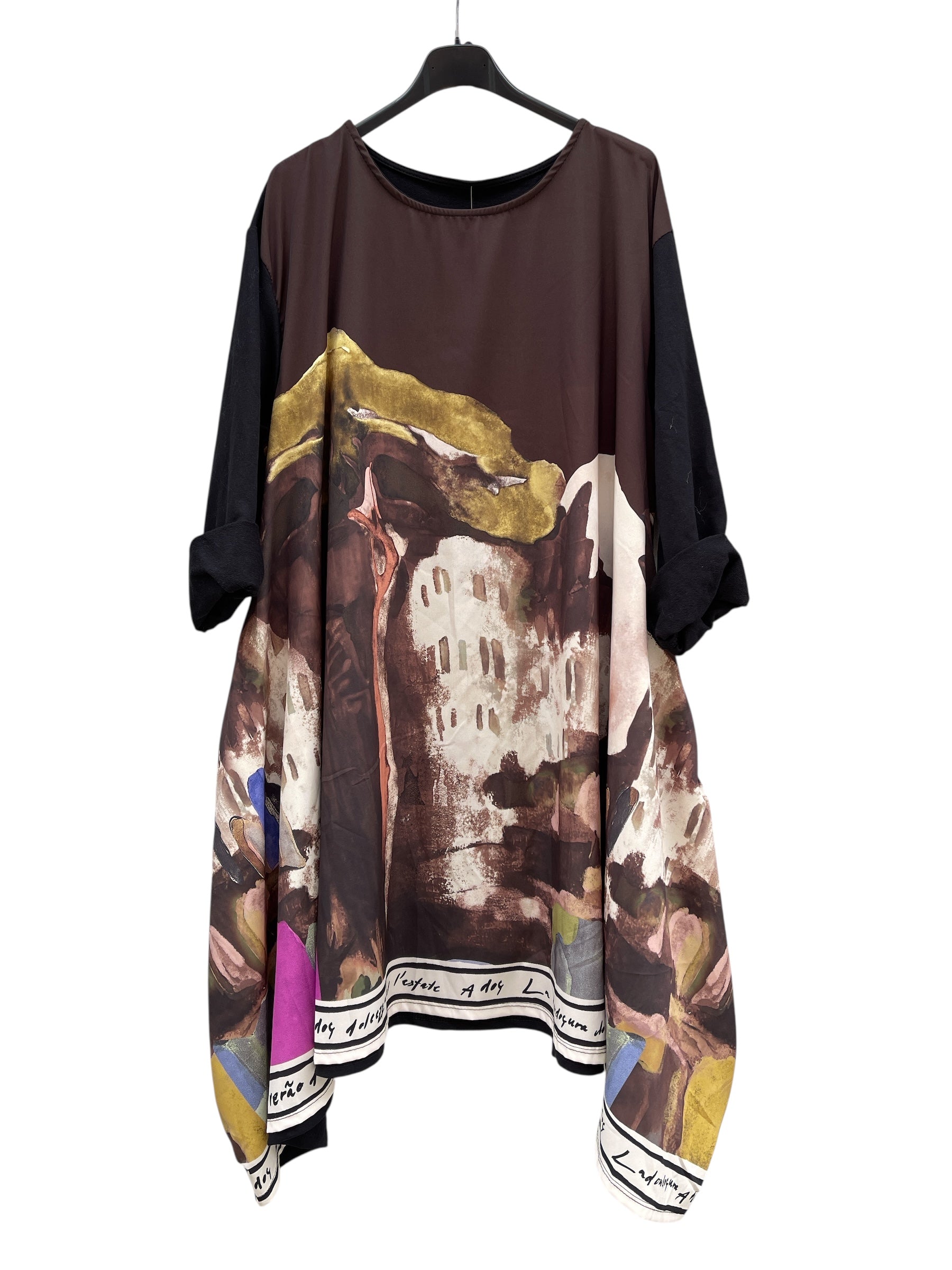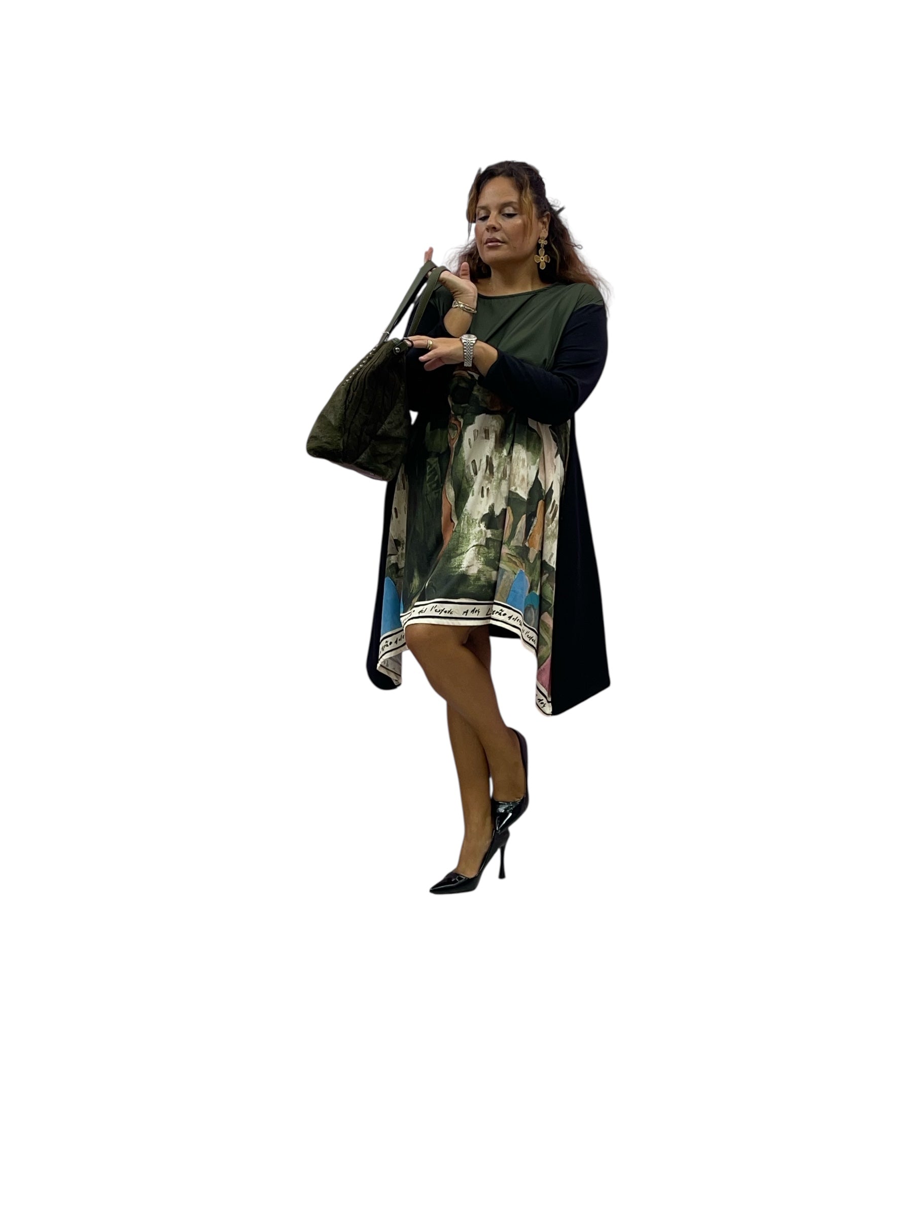 Abito/magliettone over in felpa con pannello in raso fantasia svasato avanti