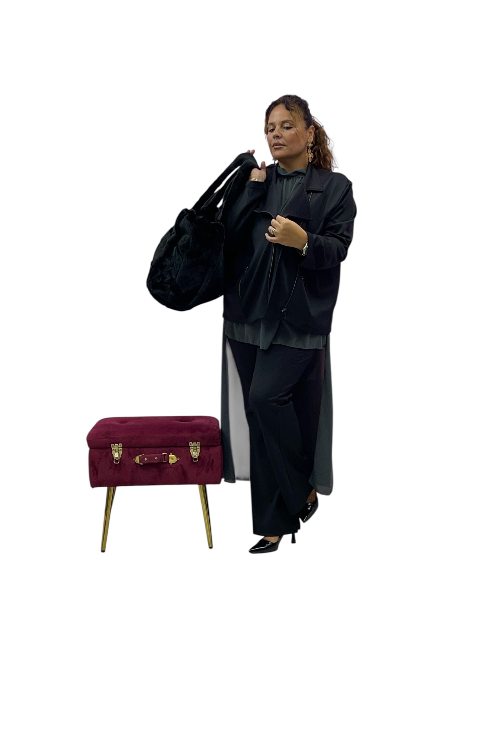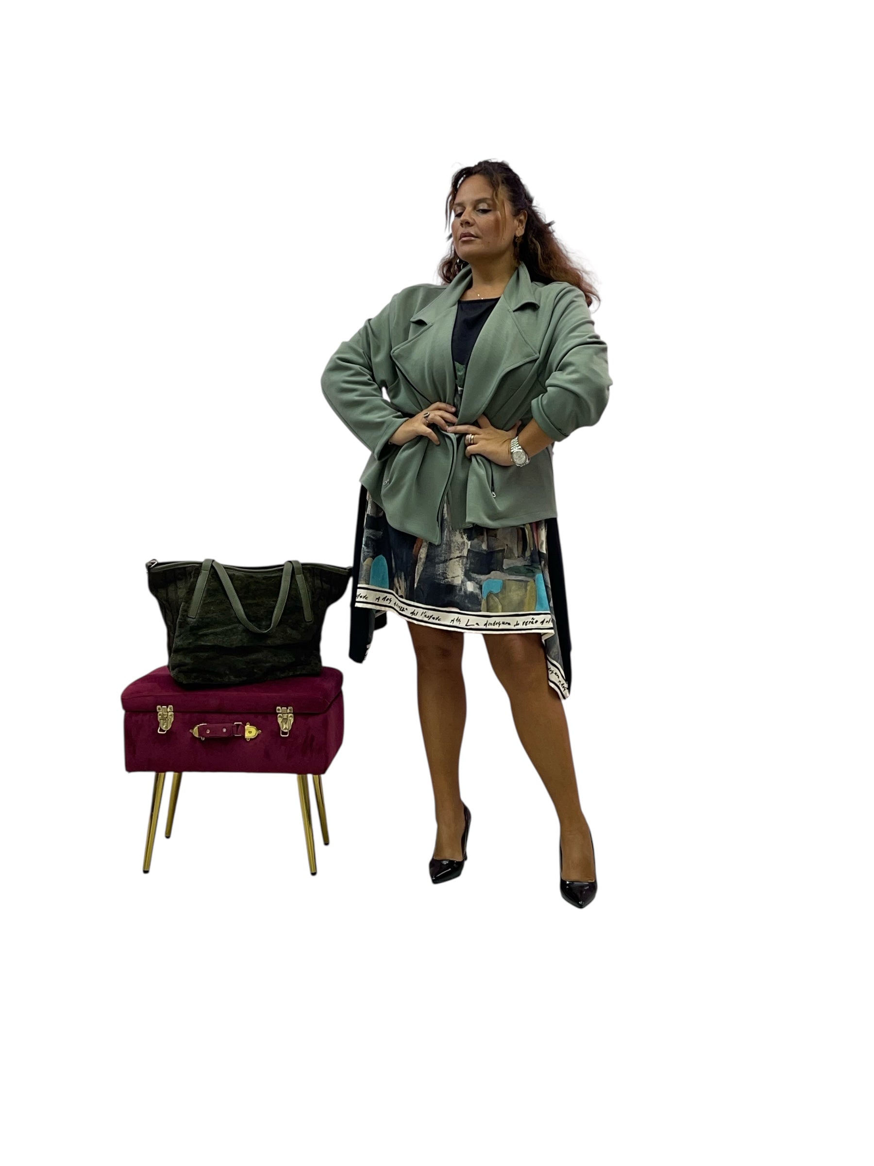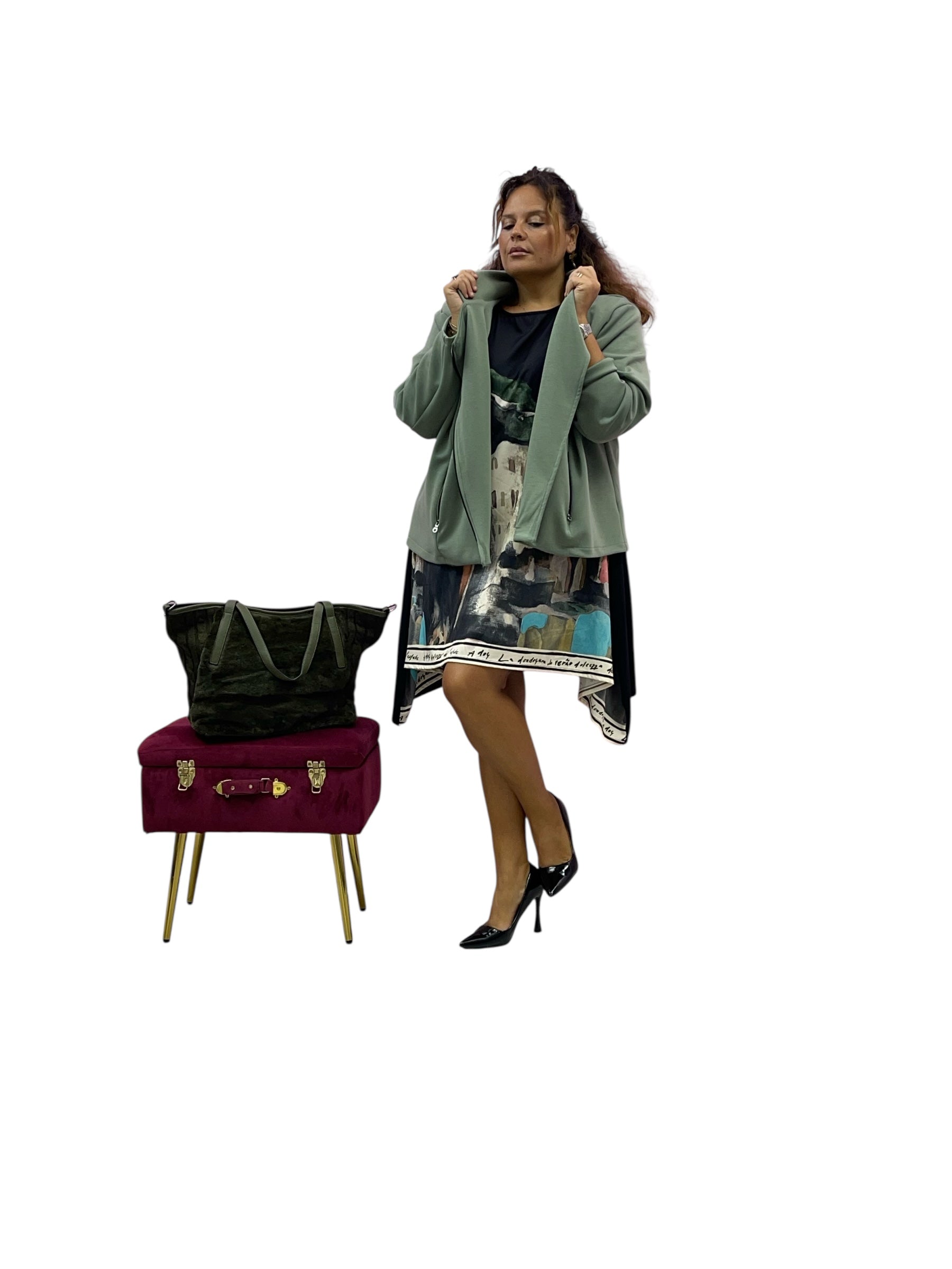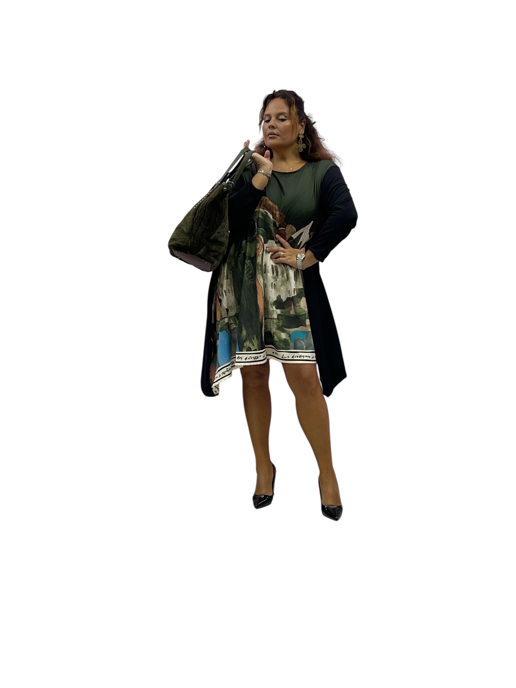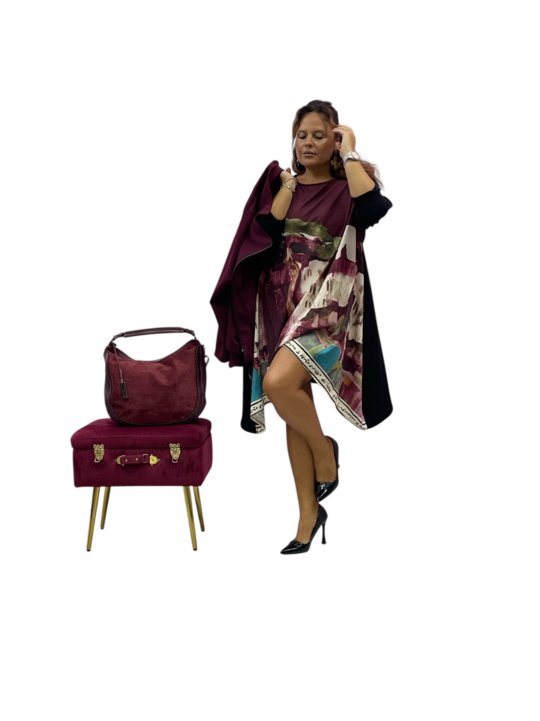 Abito/magliettone over in felpa con pannello in raso fantasia svasato avanti