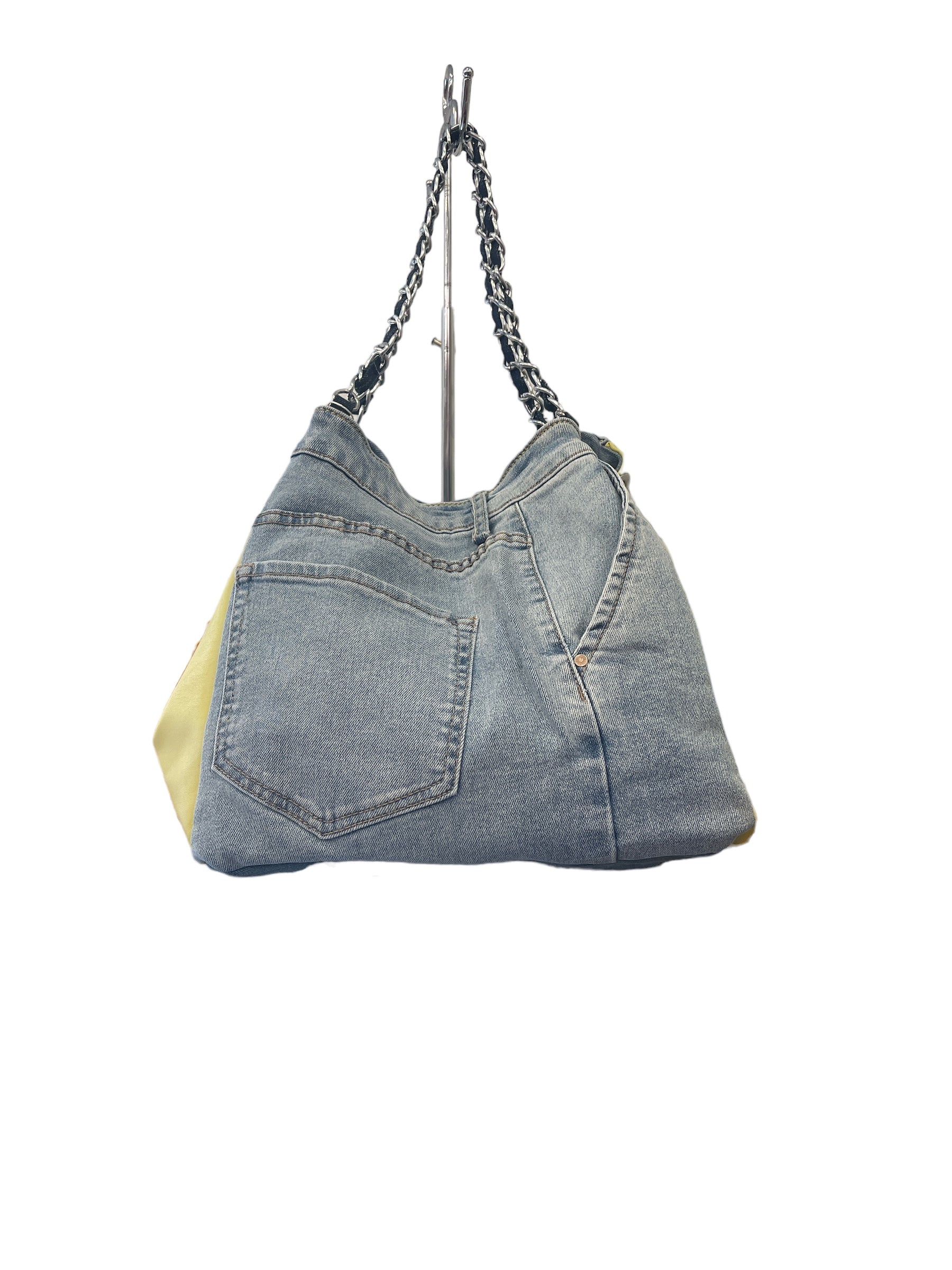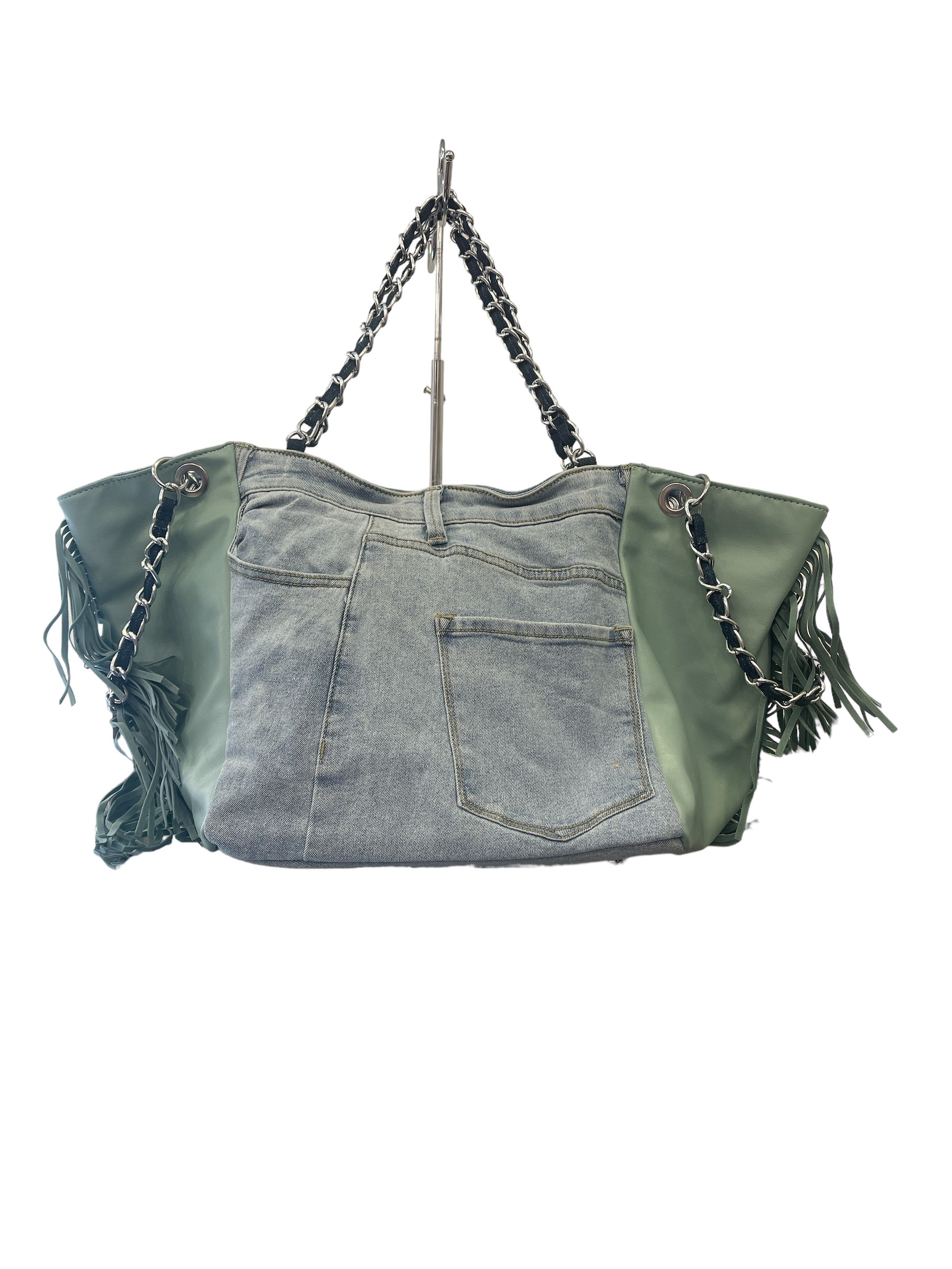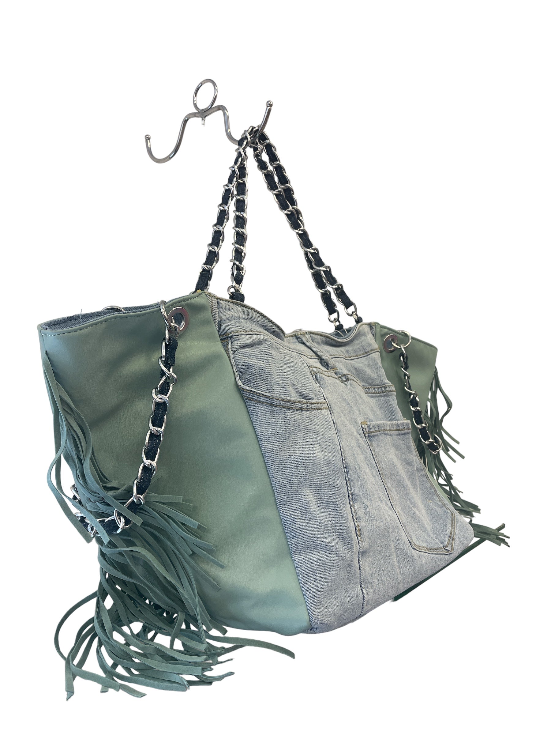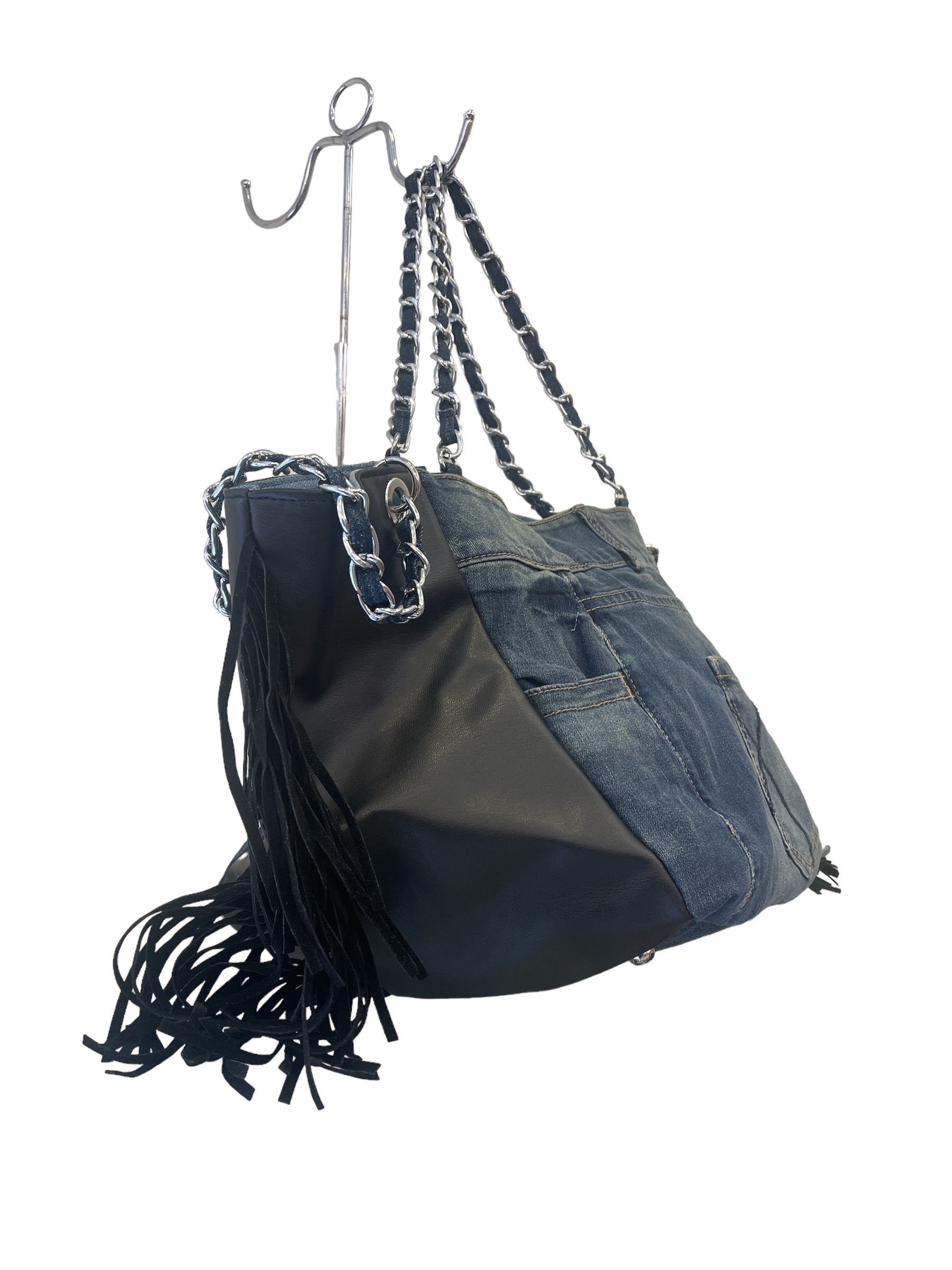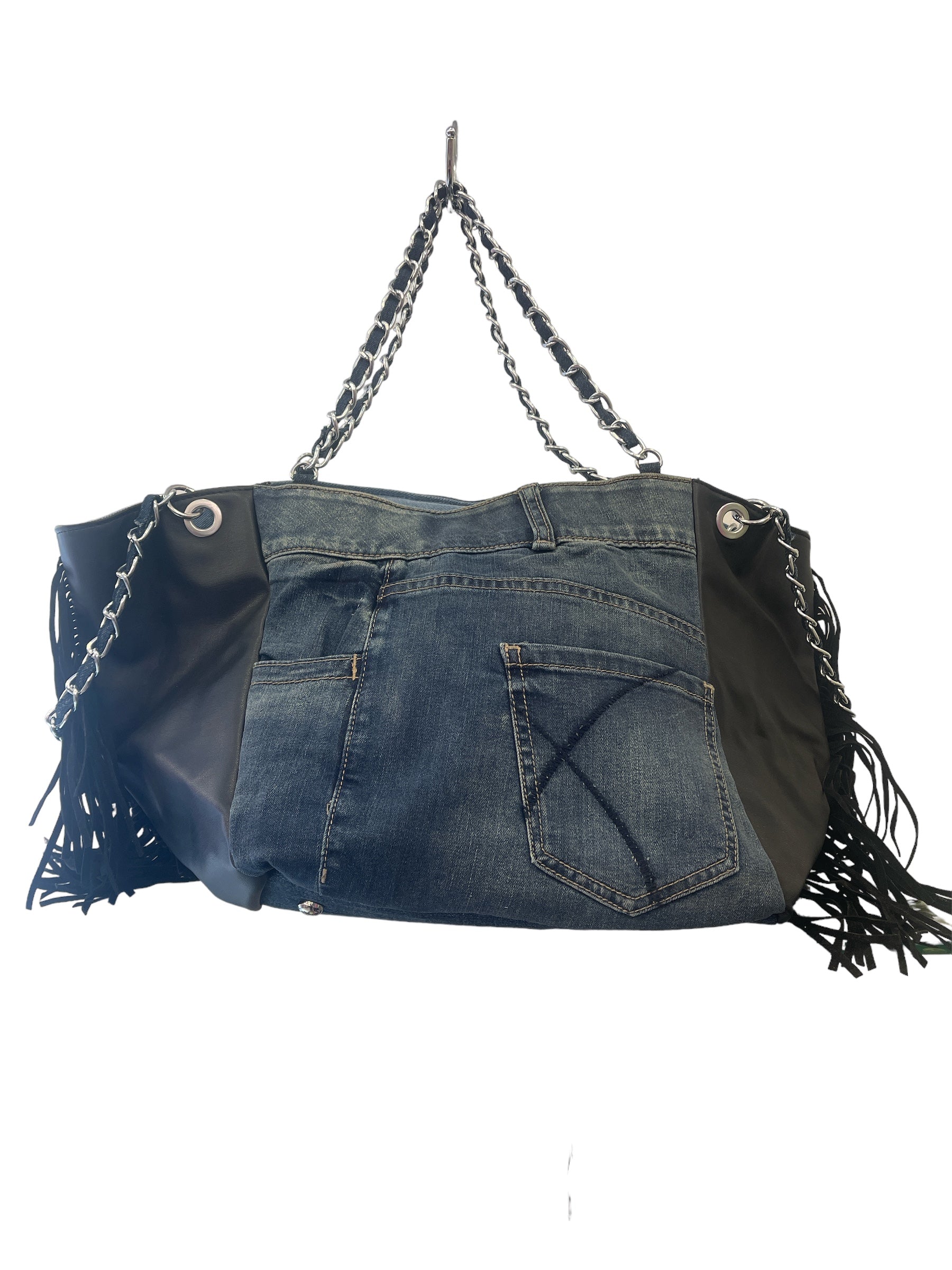 Borsa in ecopelle e jeans ,frange laterali ,manici in catena e doppia chiusura per doppia forma misure larghezza 60 altezza 32
