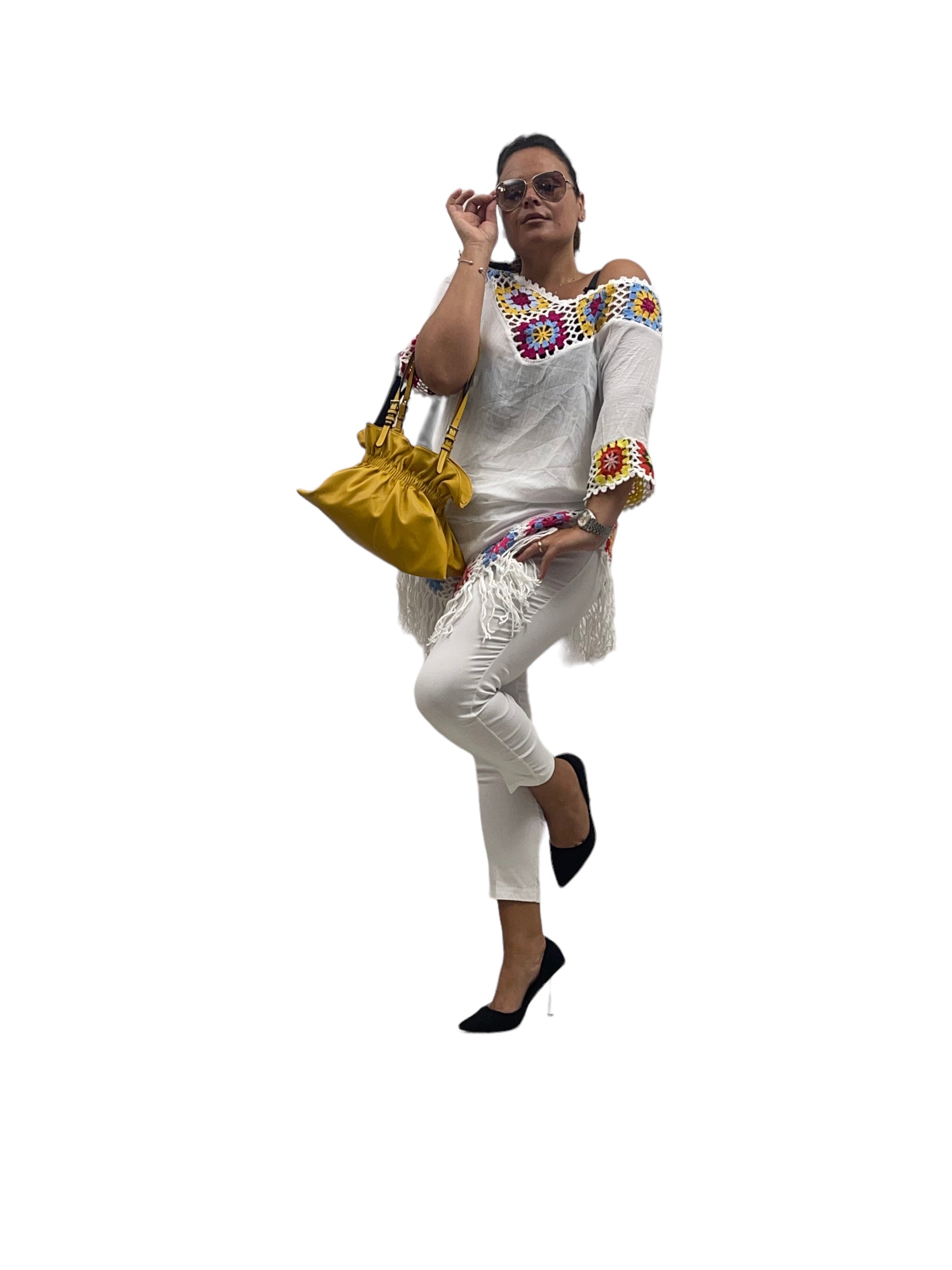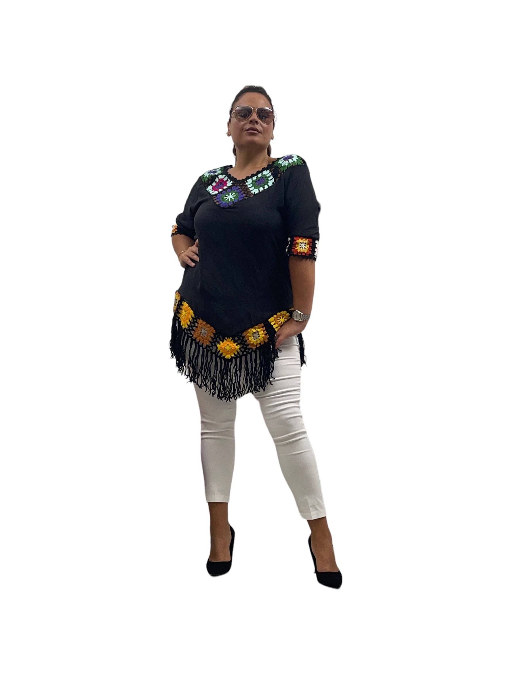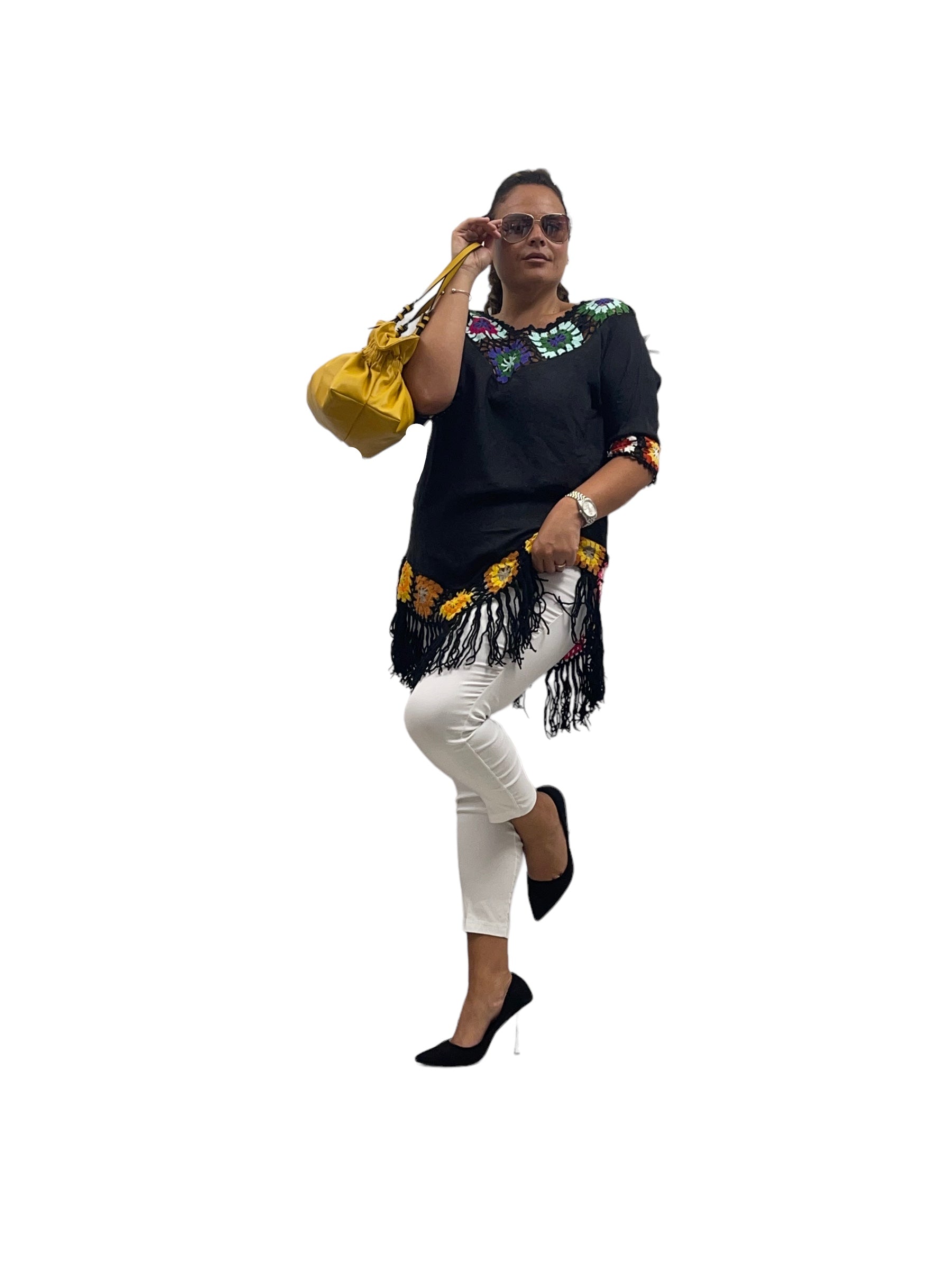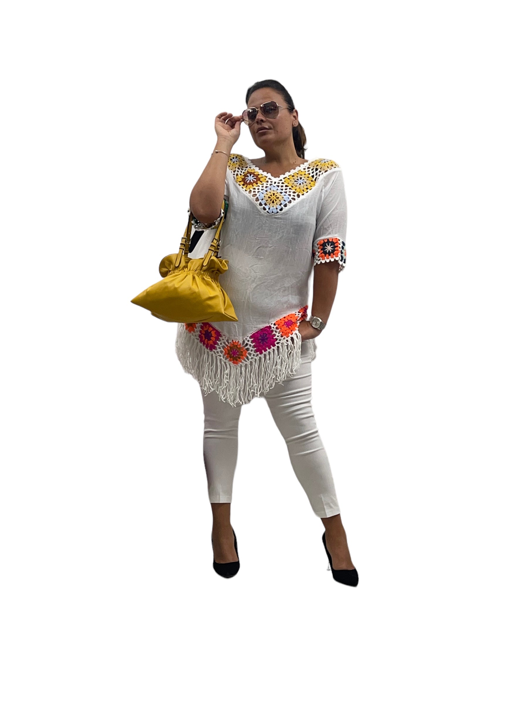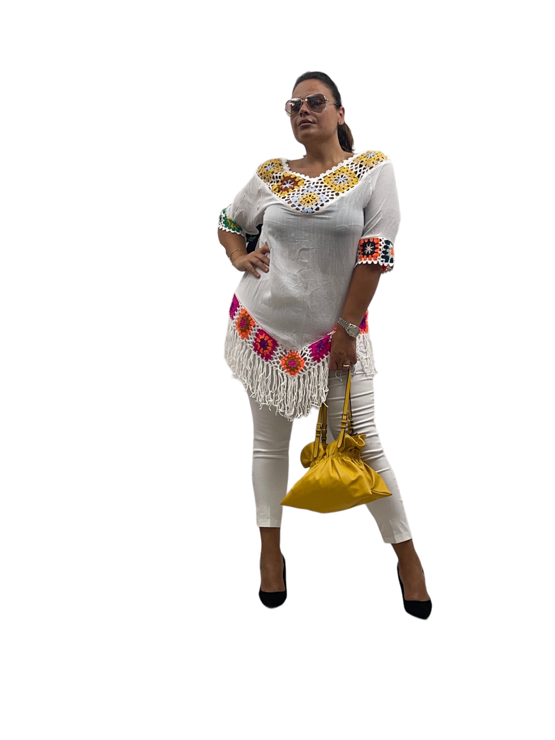 Casacca copricostume con ricamo colorato e frange tessuto poly