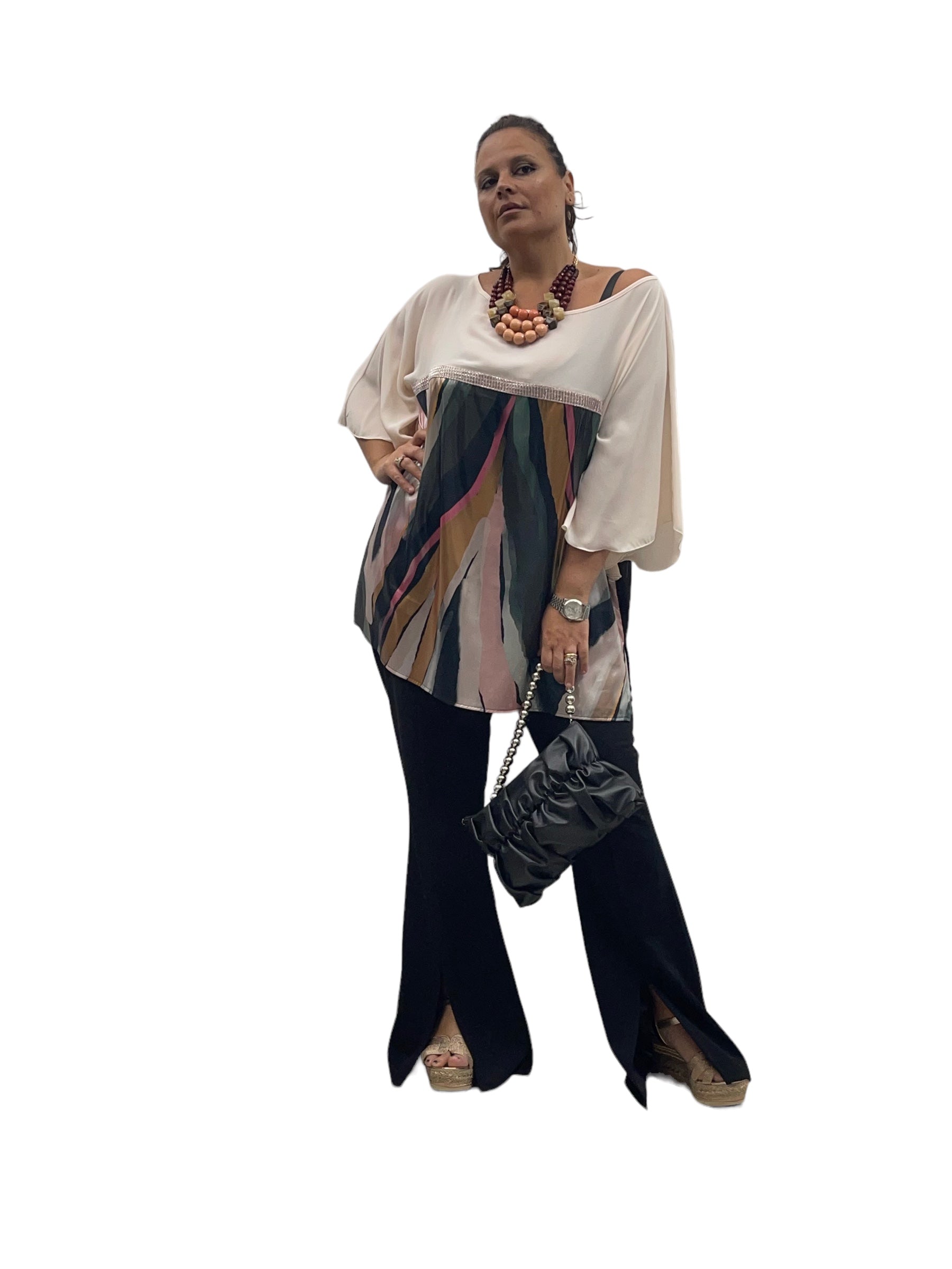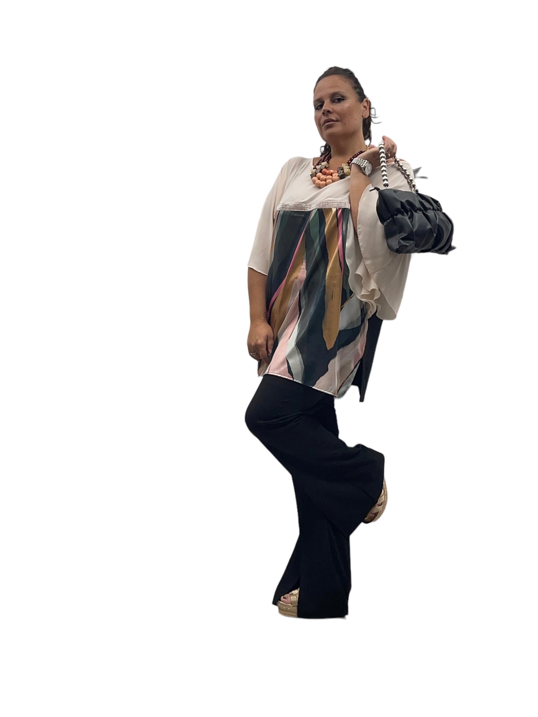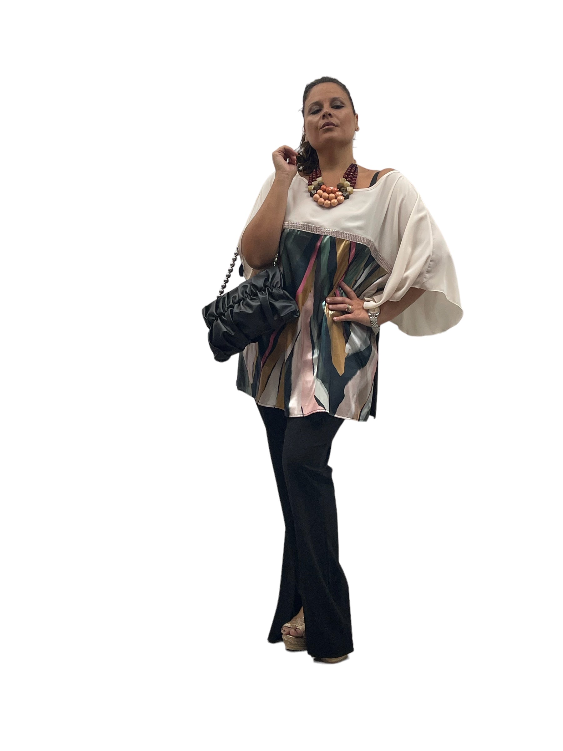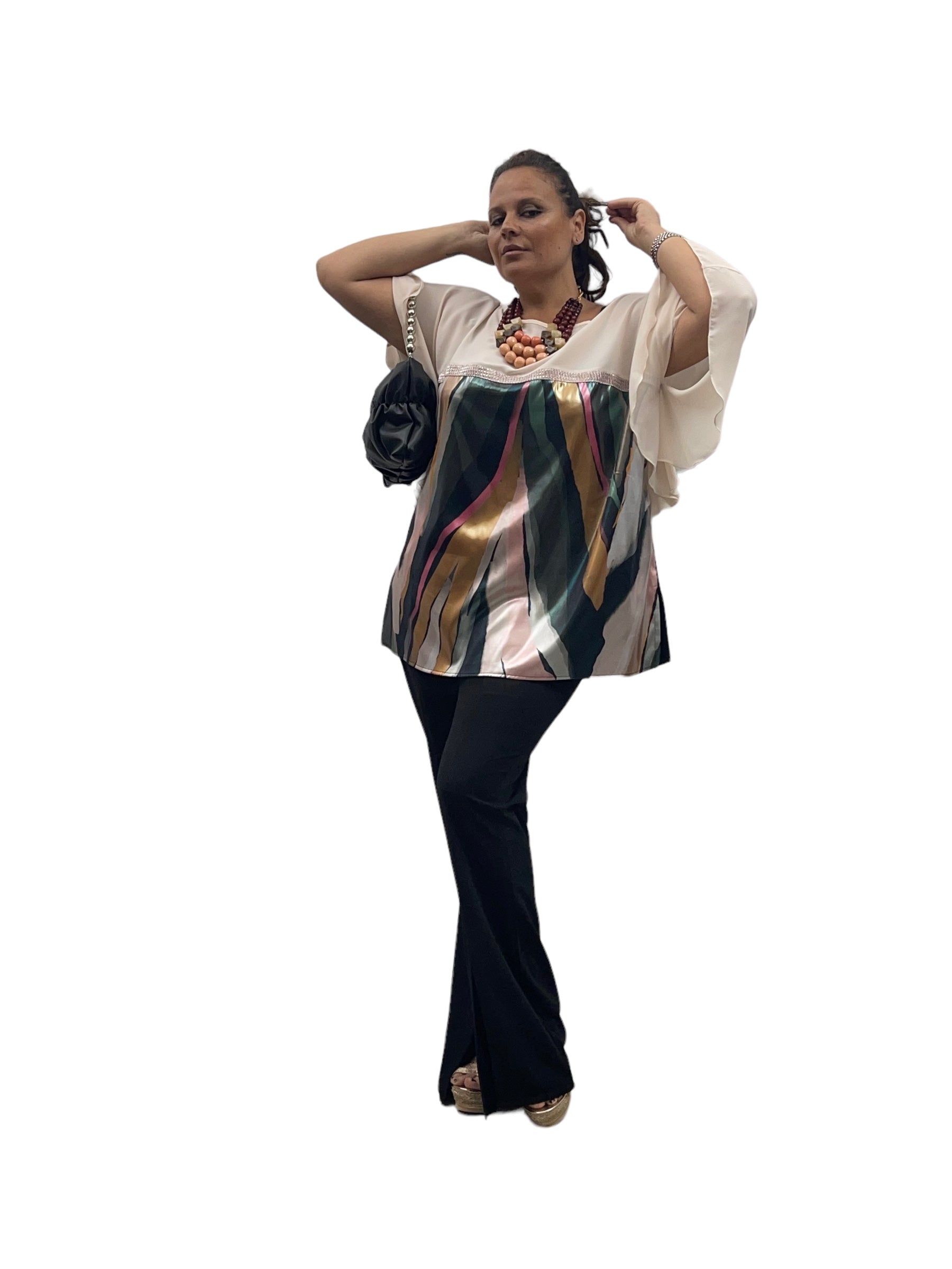 Casacca over con sopra georgette,fascia lame' e pannello fantasia in raso tessuto poly