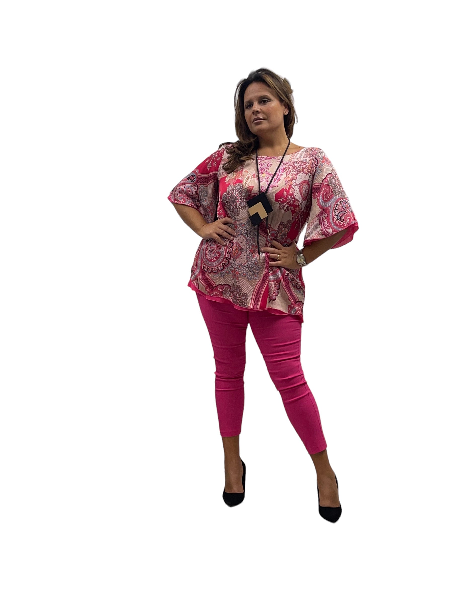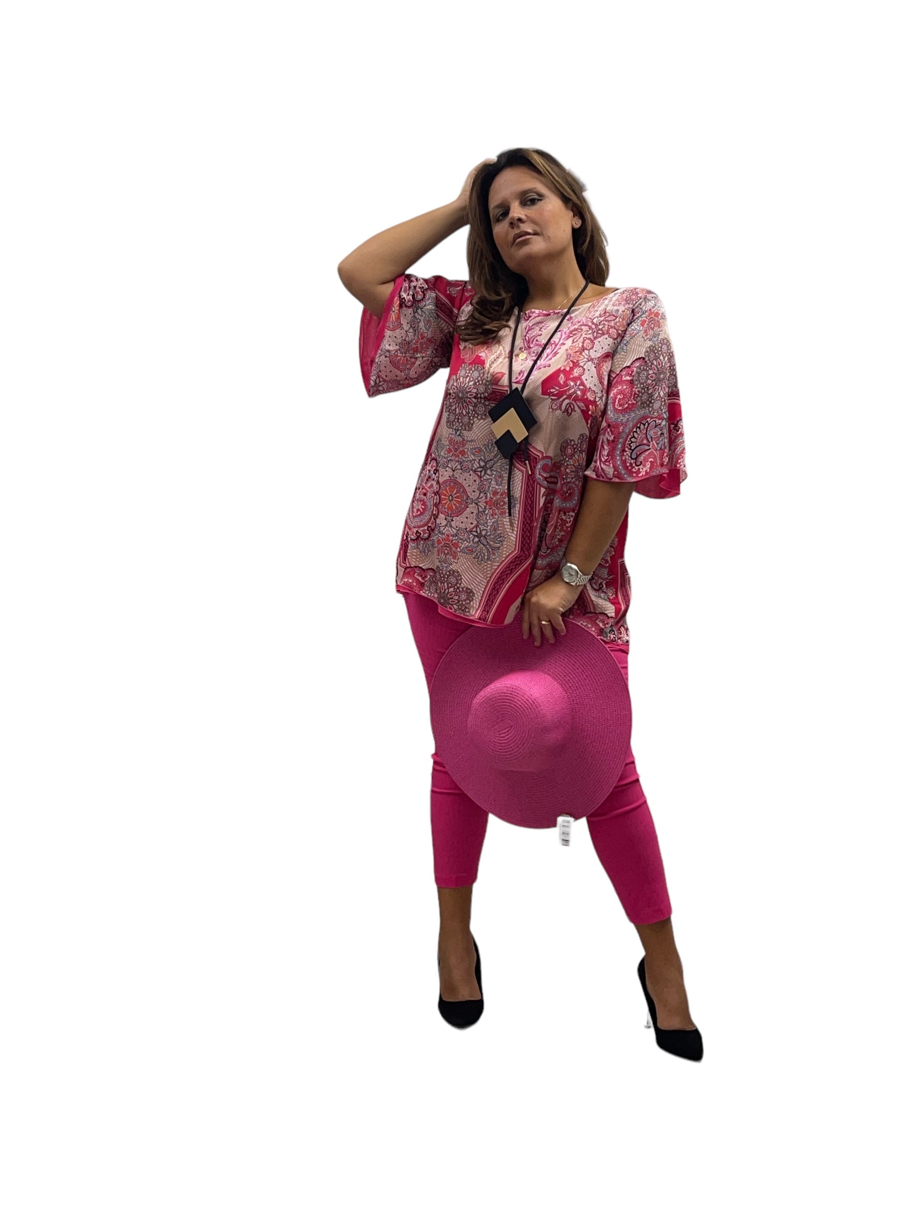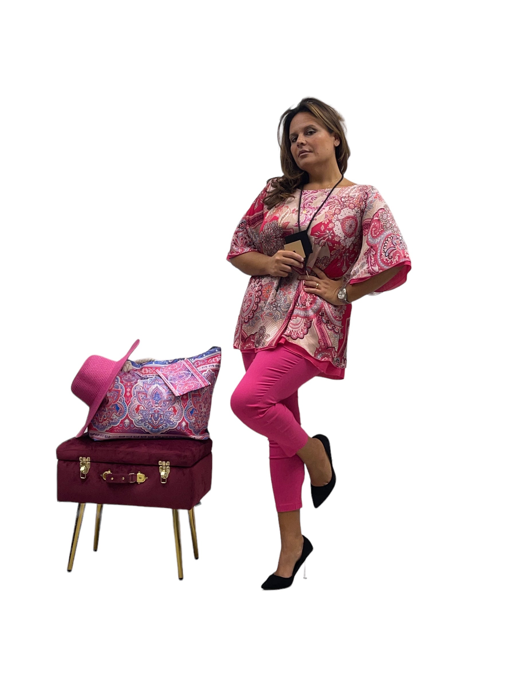 Casacca over doppio pannello raso fantasia sopra georgette fucsia sotto