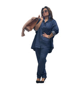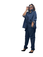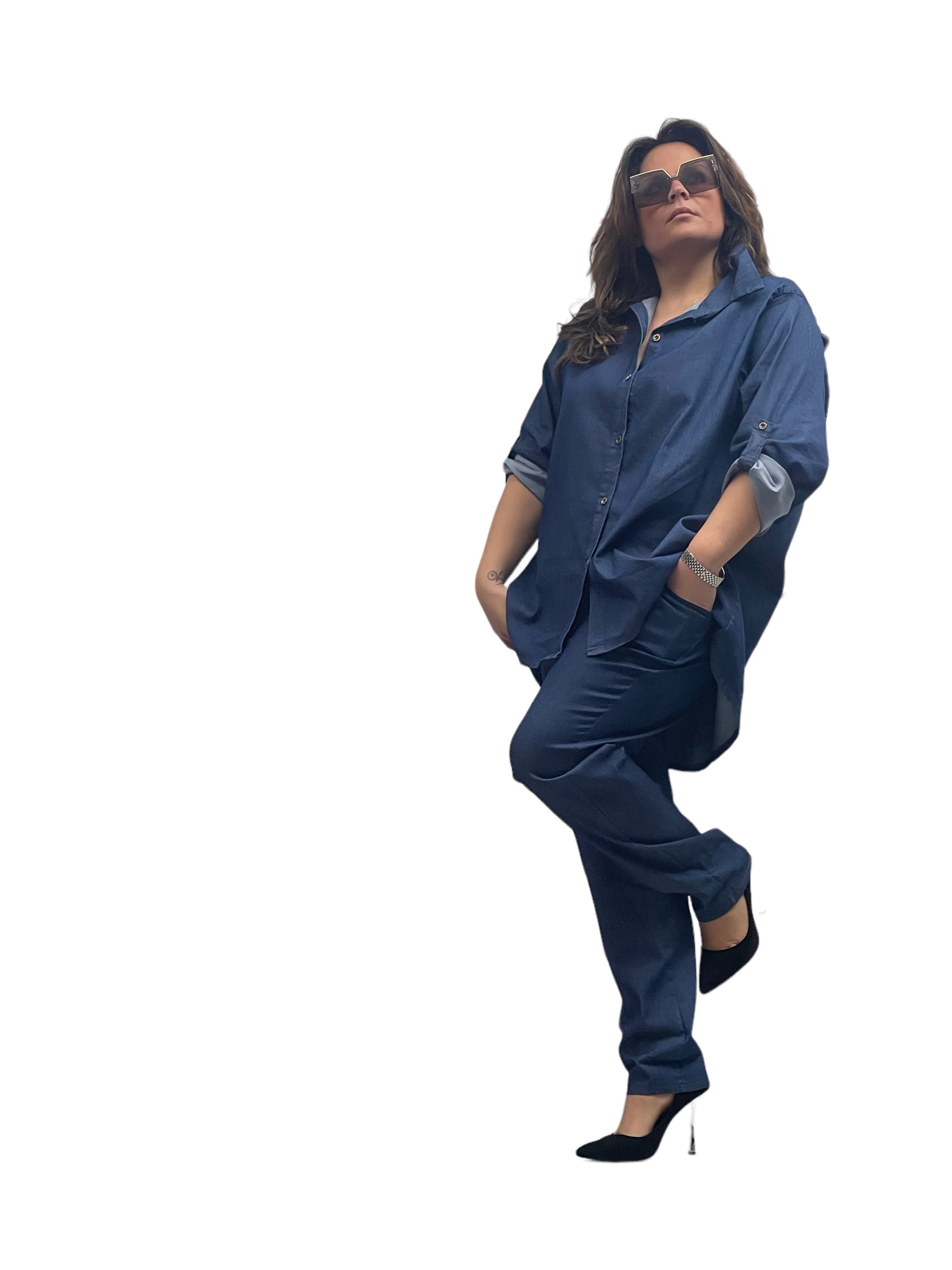 Completo over o in cotone effetto jeans con camicione e pantaloni tasca America con elastico in vita