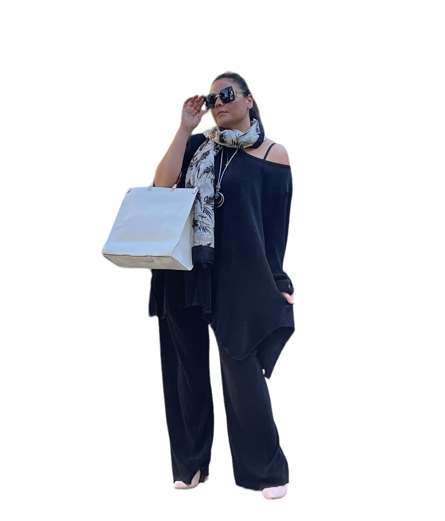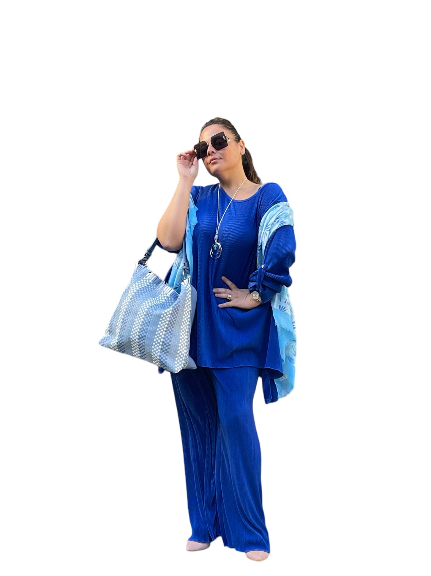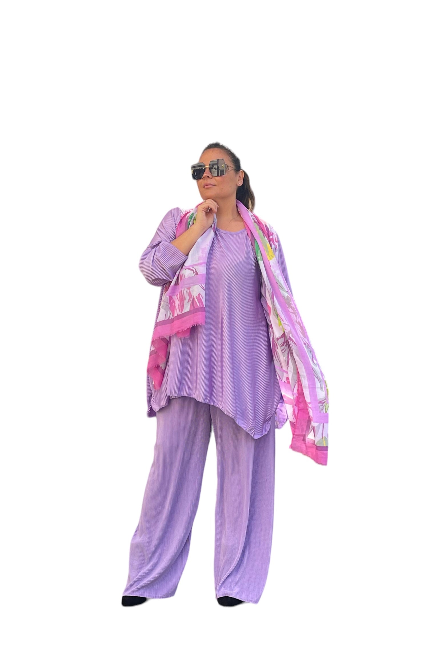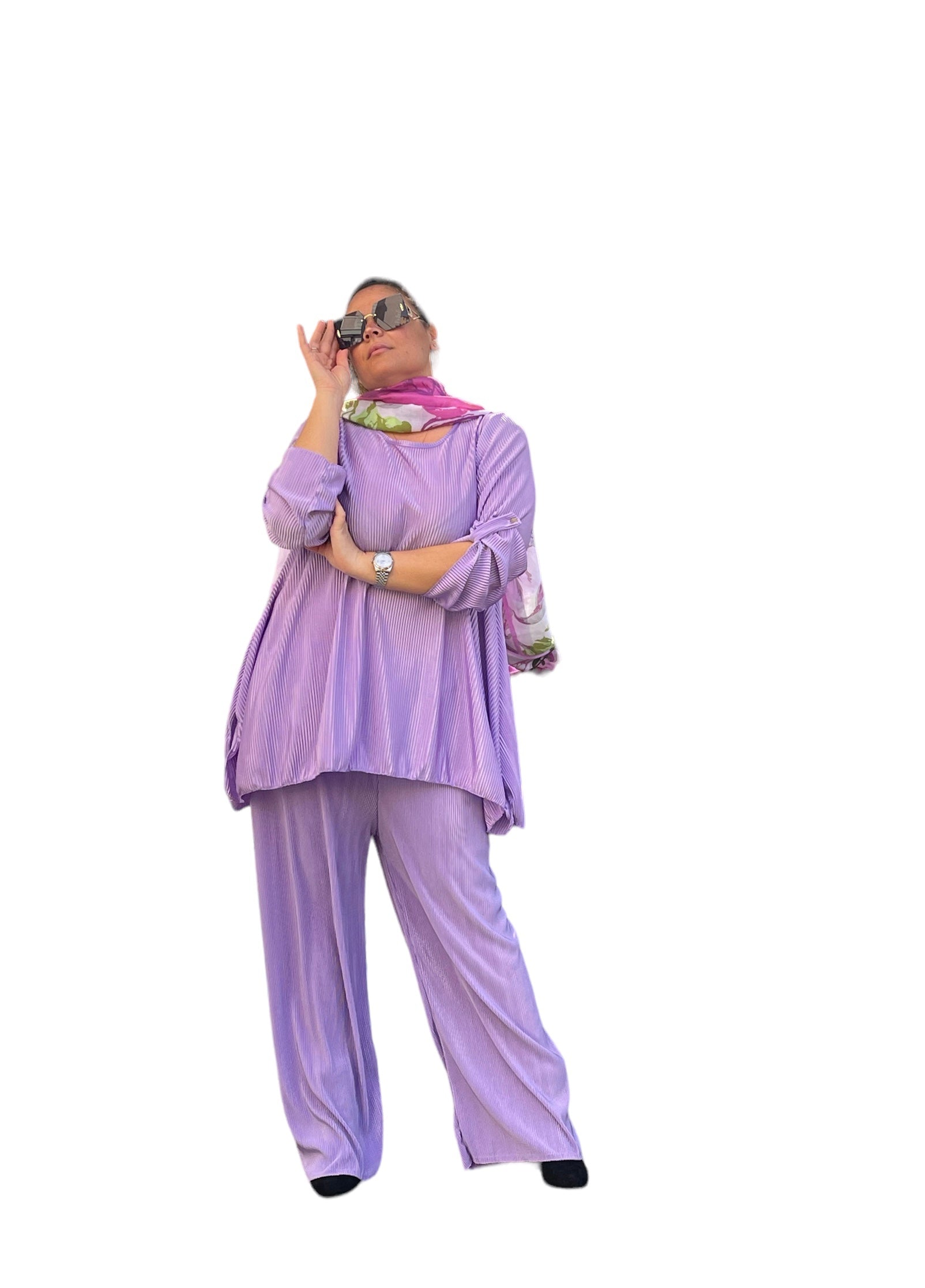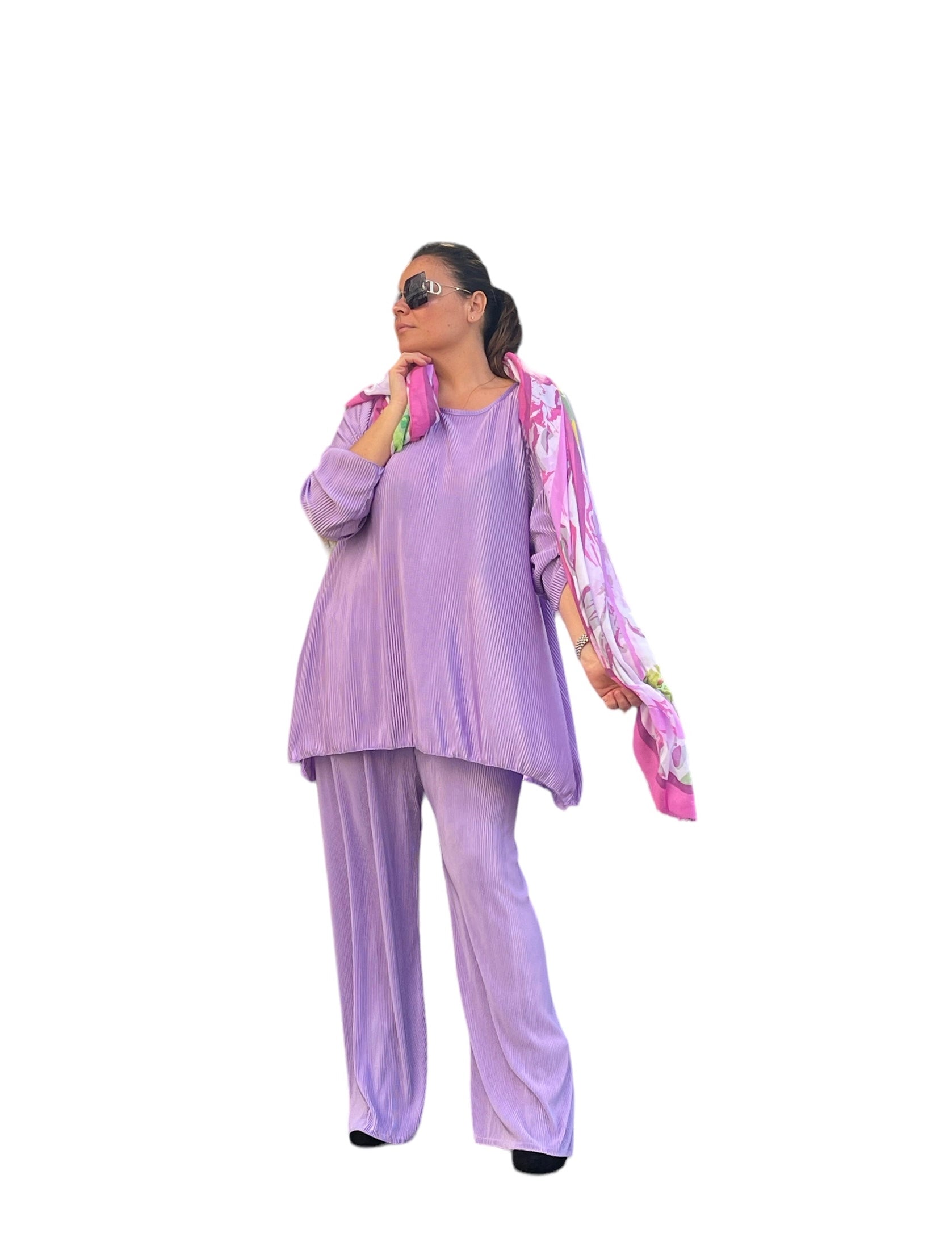 Completo over tessuto costine con pizzi laterali e pantaloni palazzo con elastico tg unica