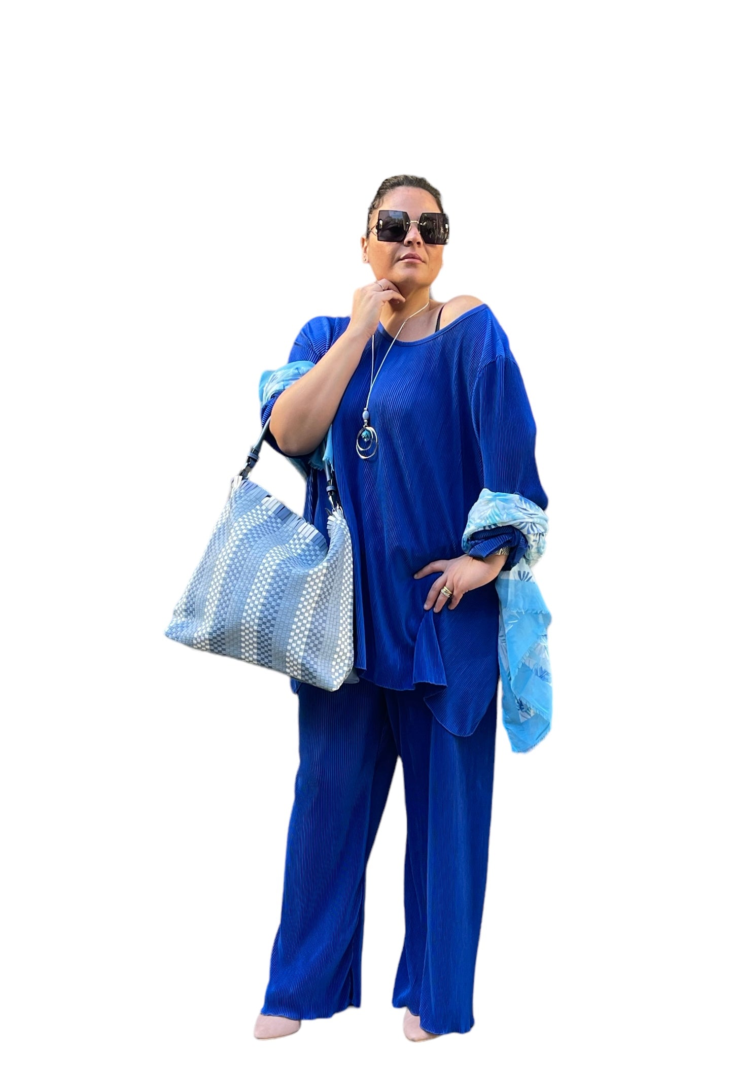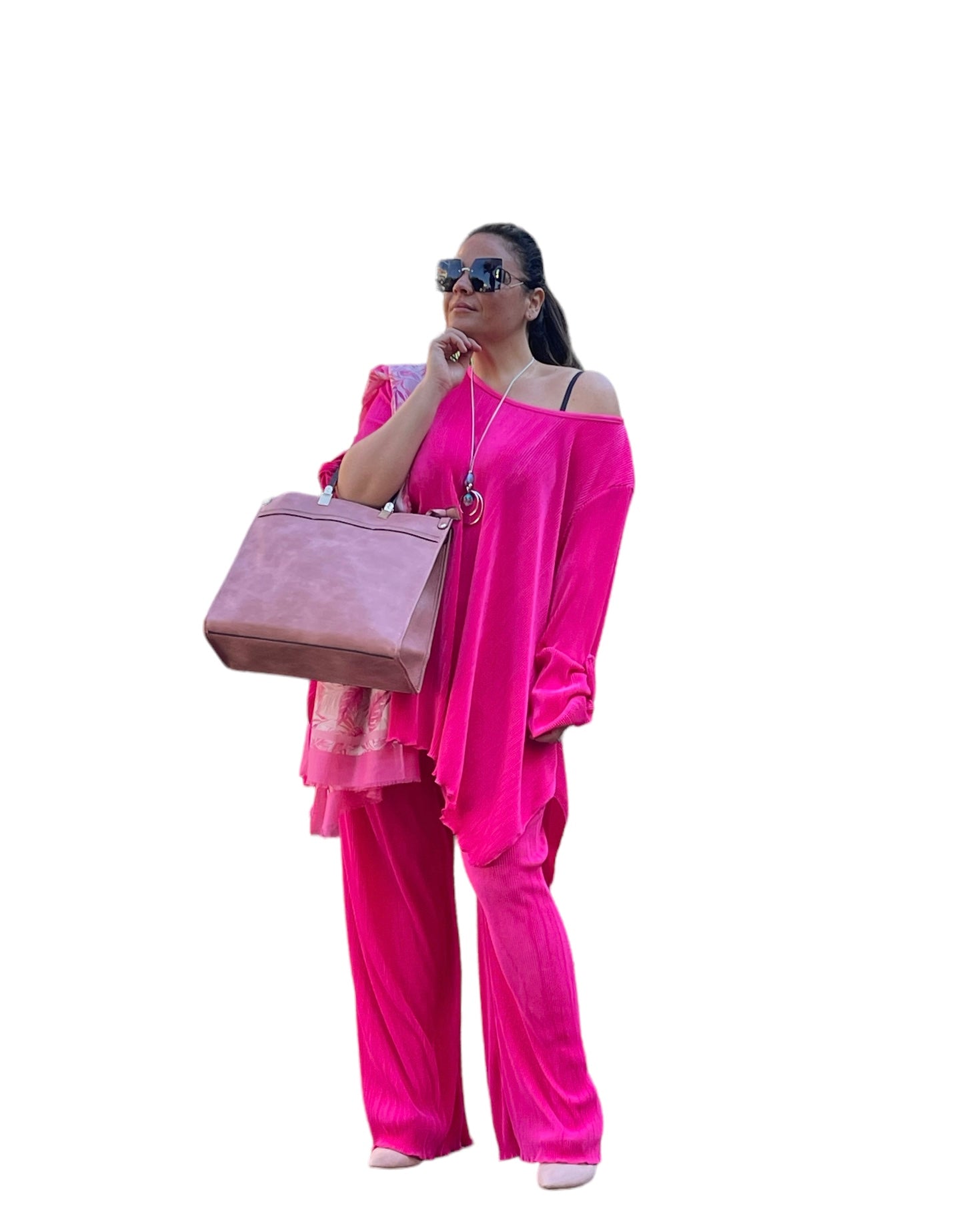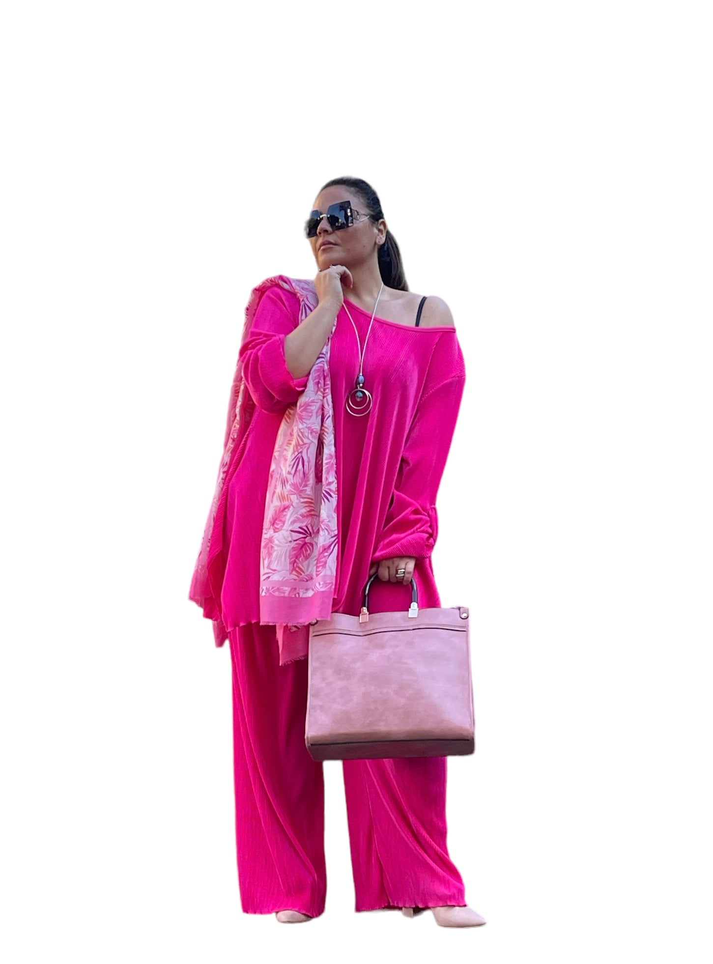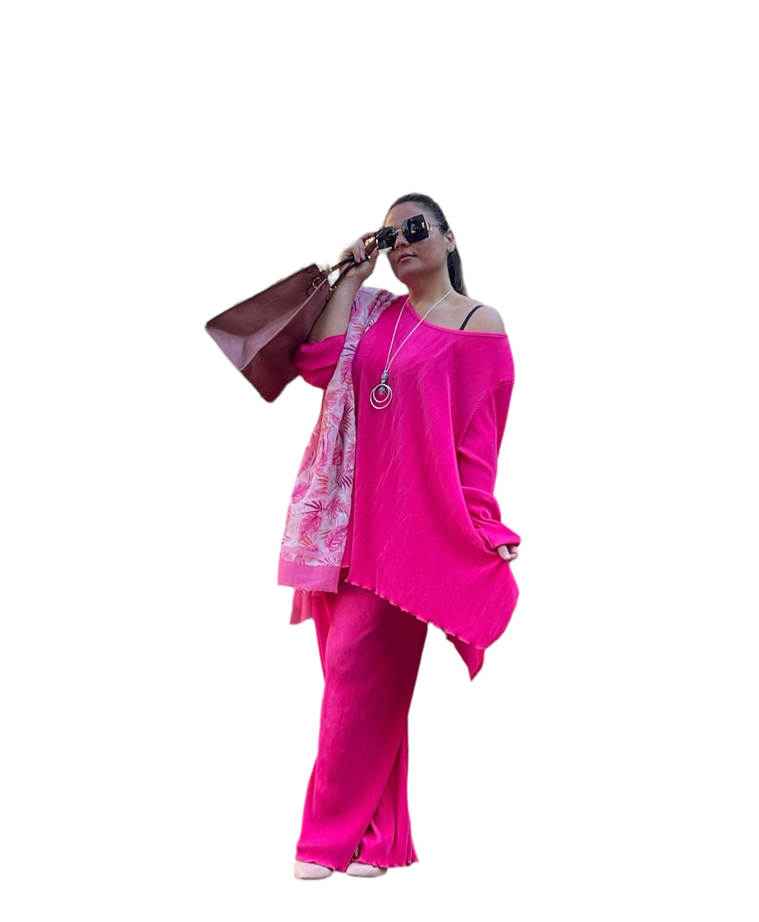 Completo over tessuto costine con pizzi laterali e pantaloni palazzo con elastico tg unica