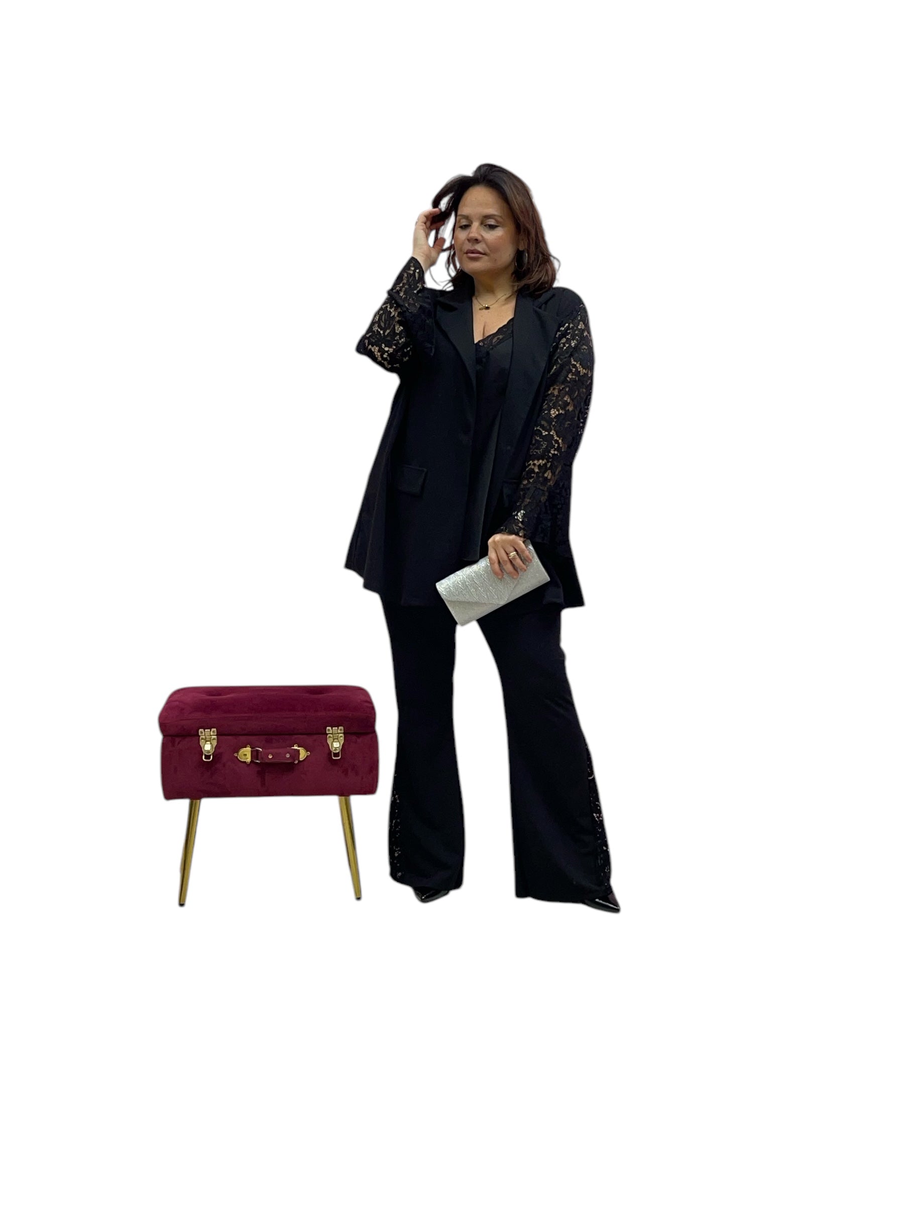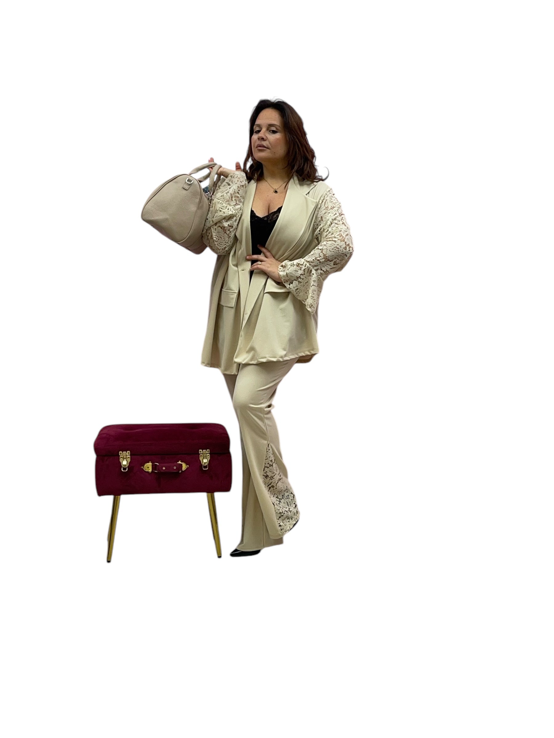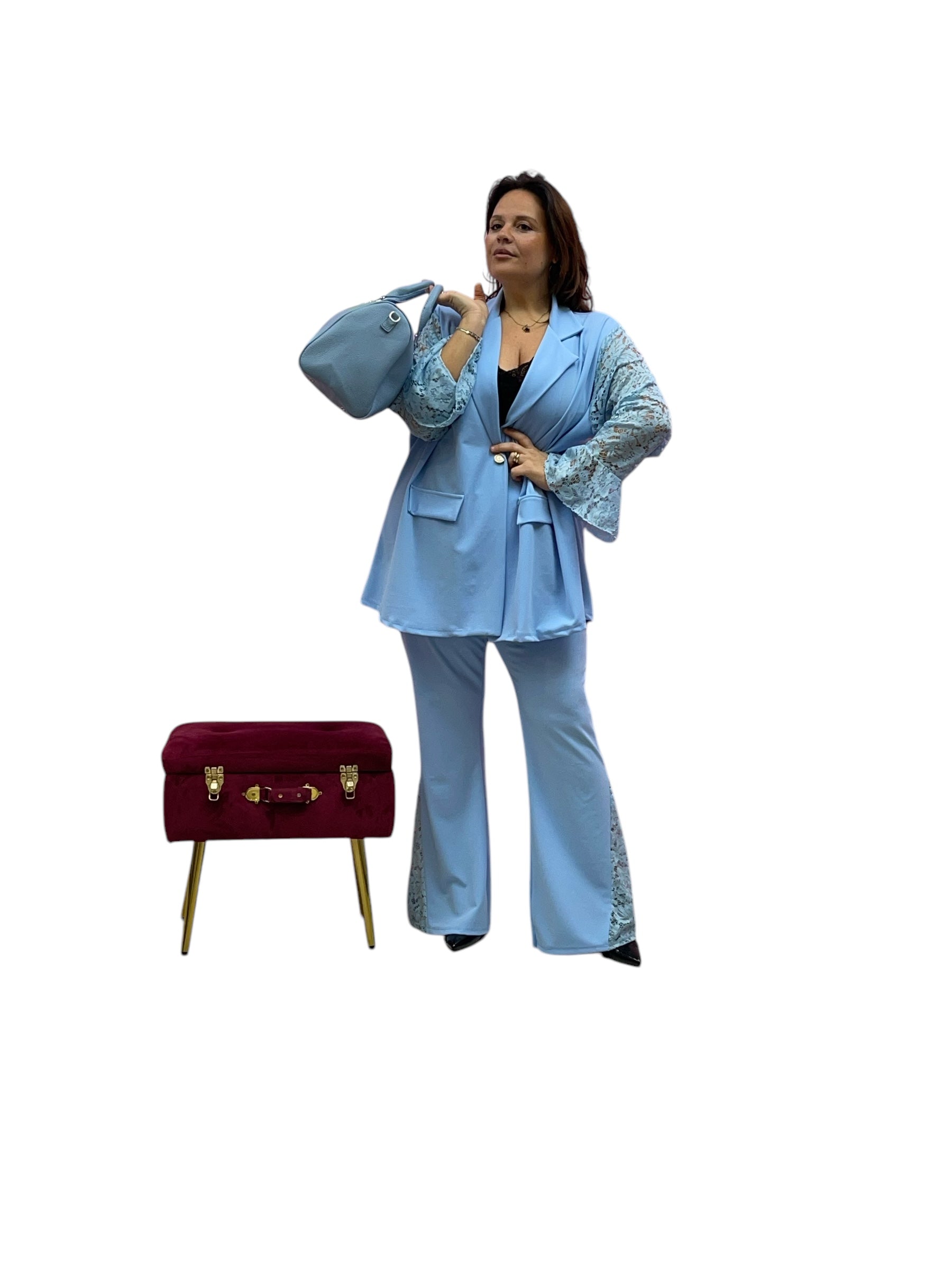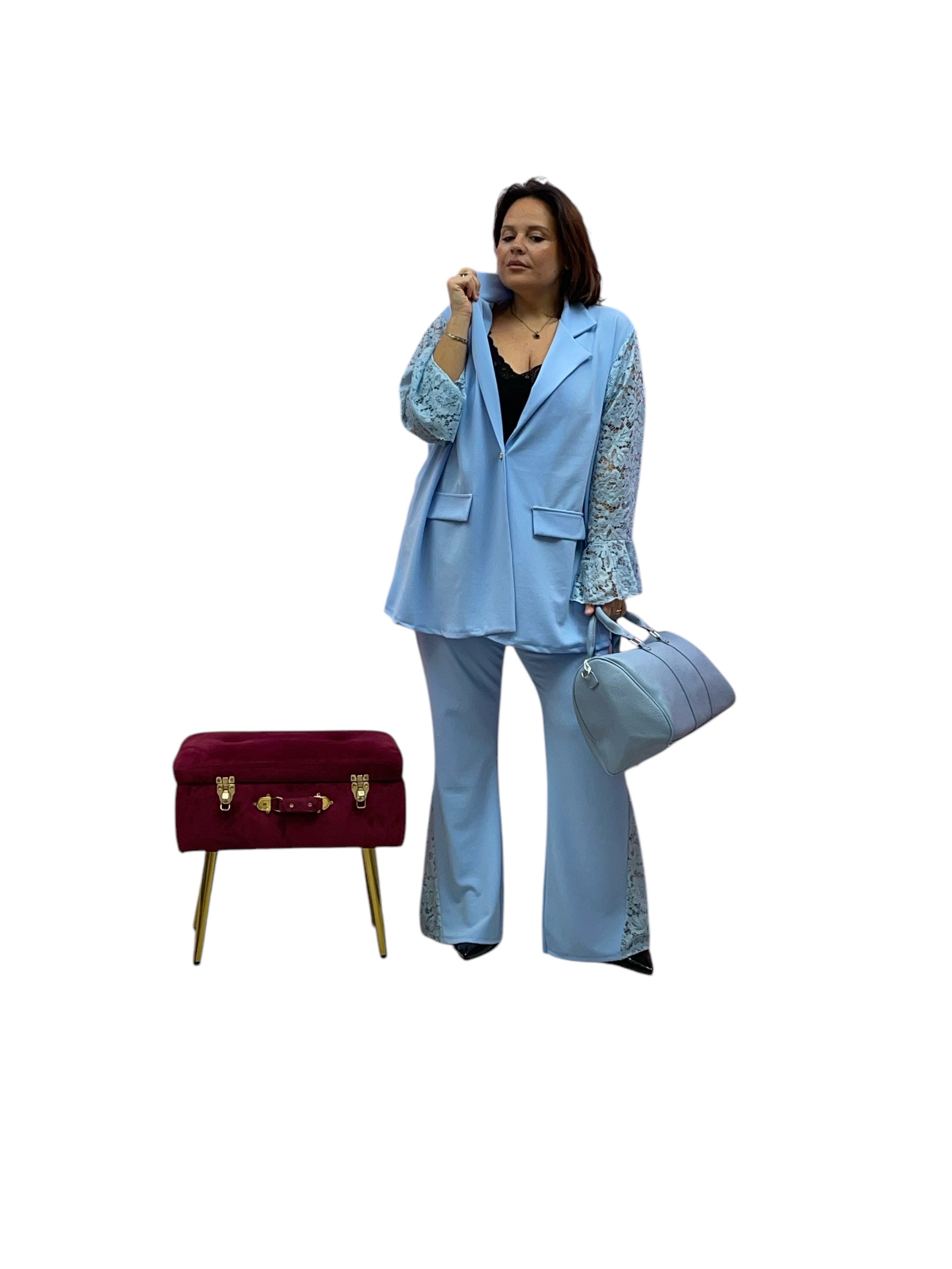 Completo over con giacca manica in merletto e polso svasato e pantaloni a zampa con elastico in vita e merletto alla caviglia