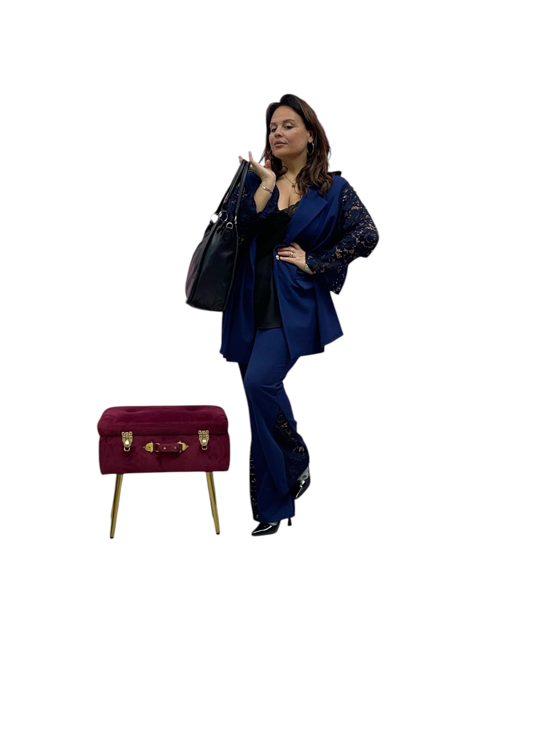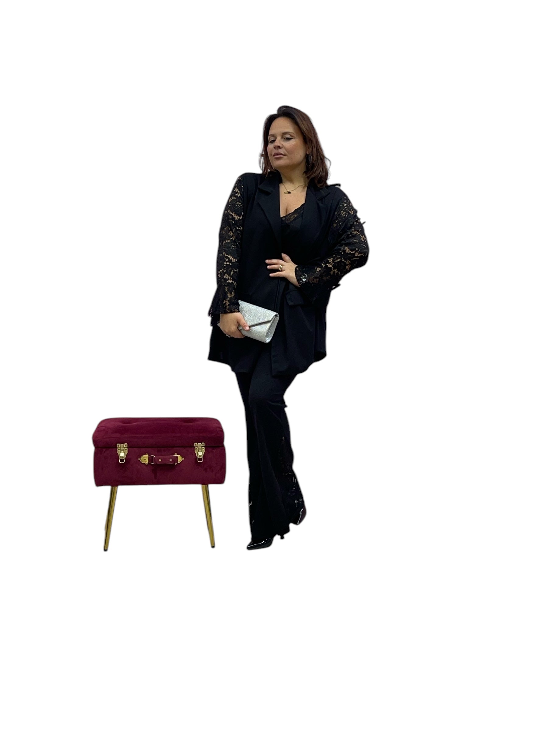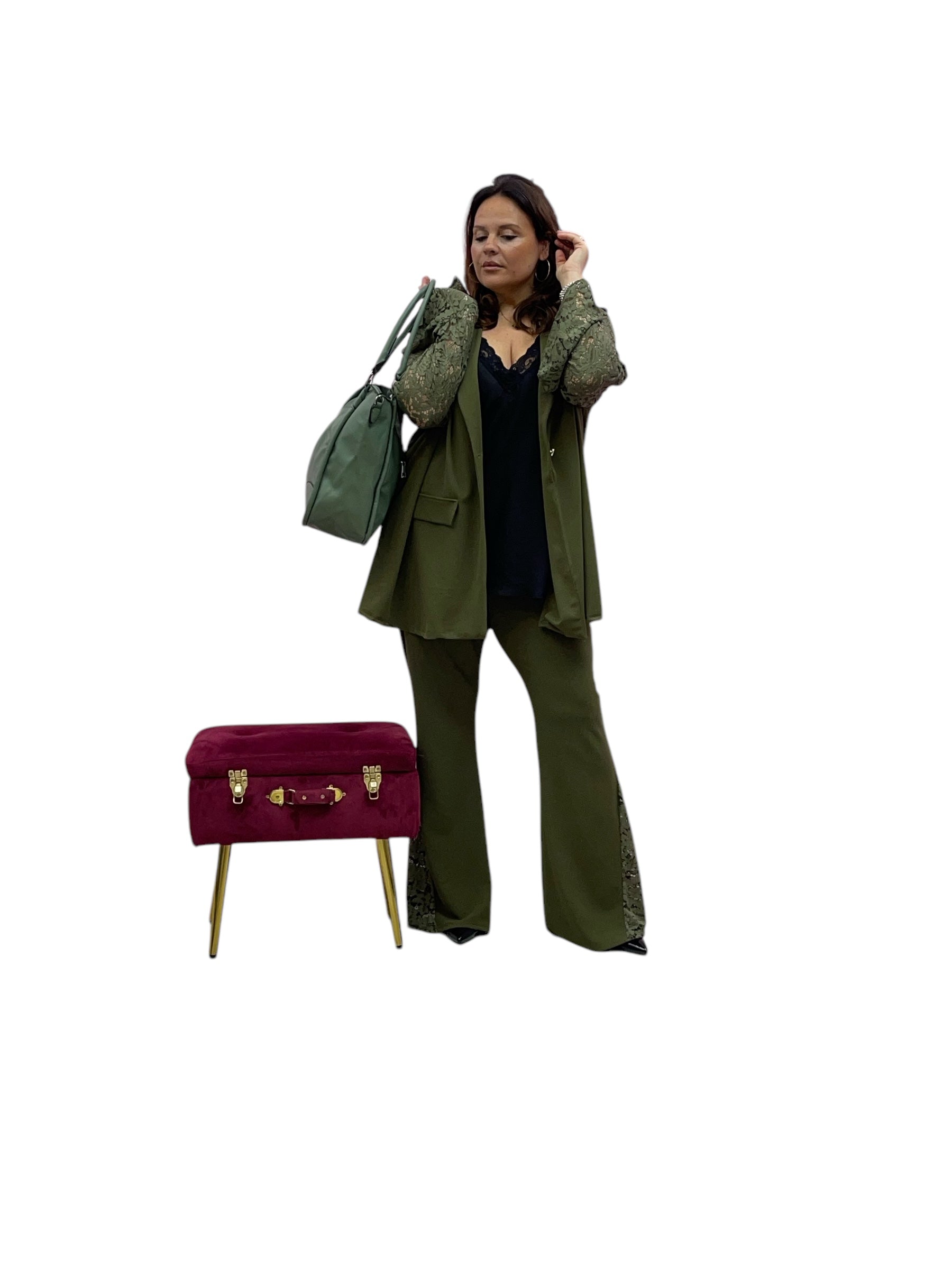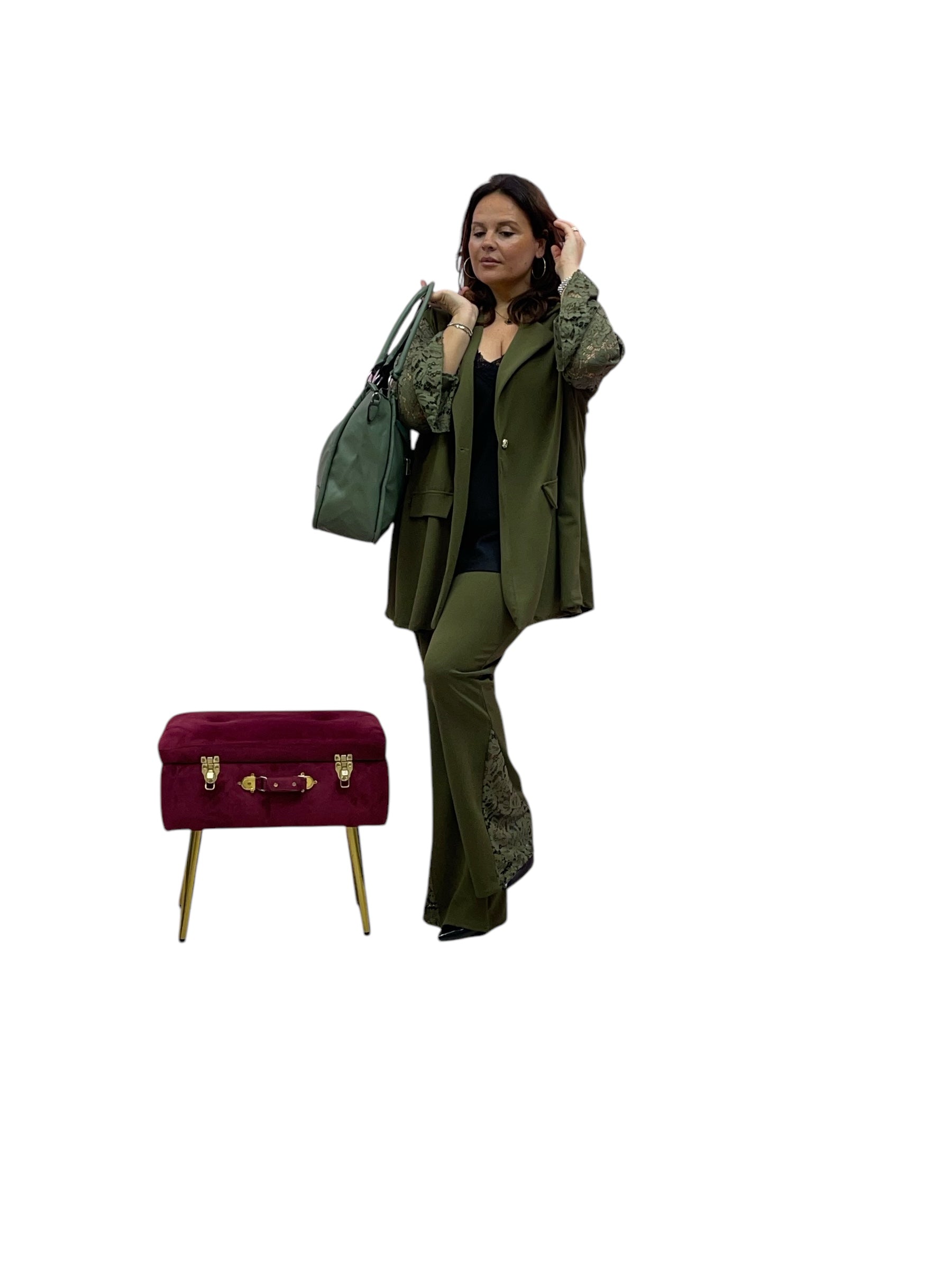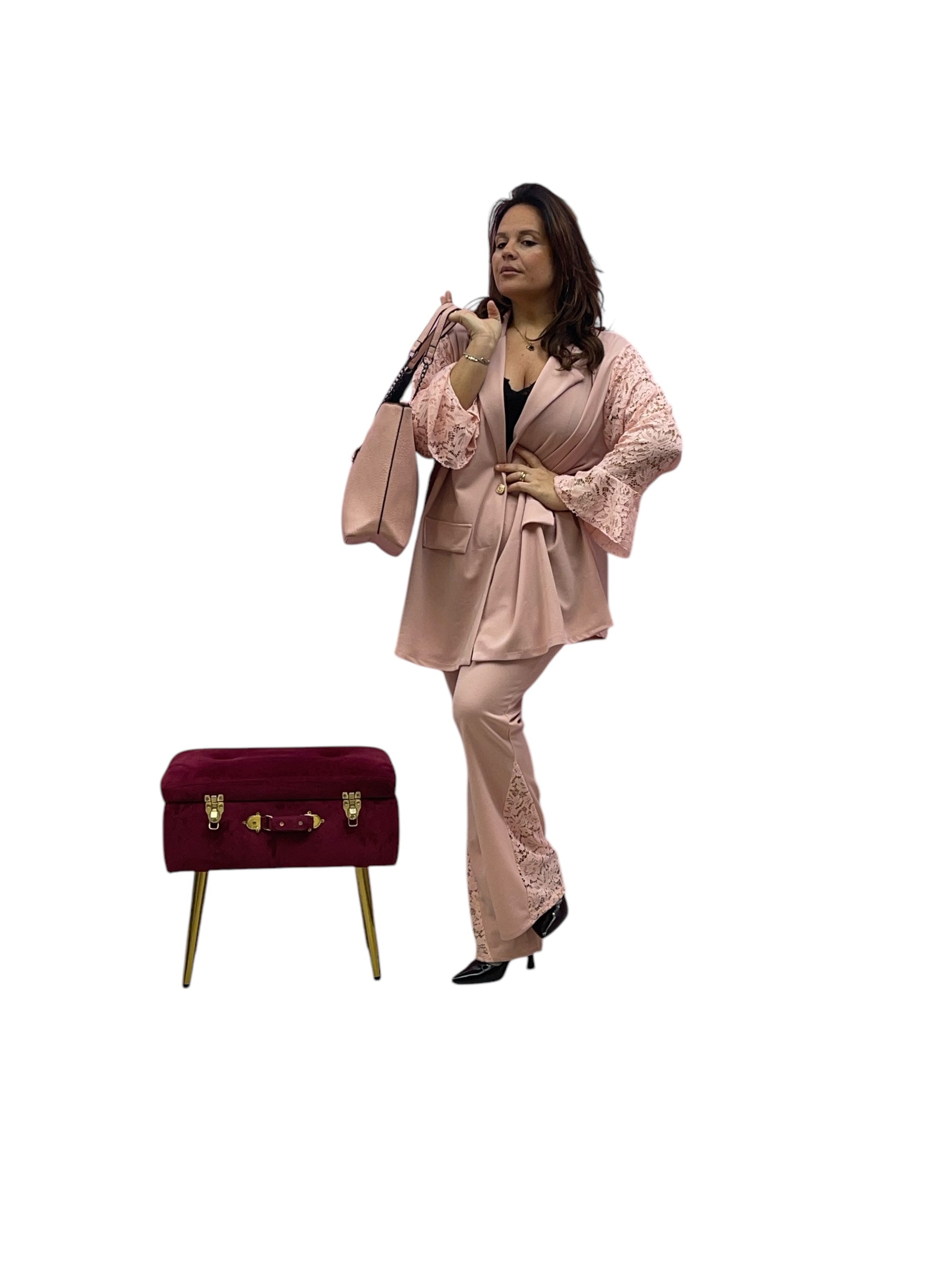 Completo over con giacca manica in merletto e polso svasato e pantaloni a zampa con elastico in vita e merletto alla caviglia