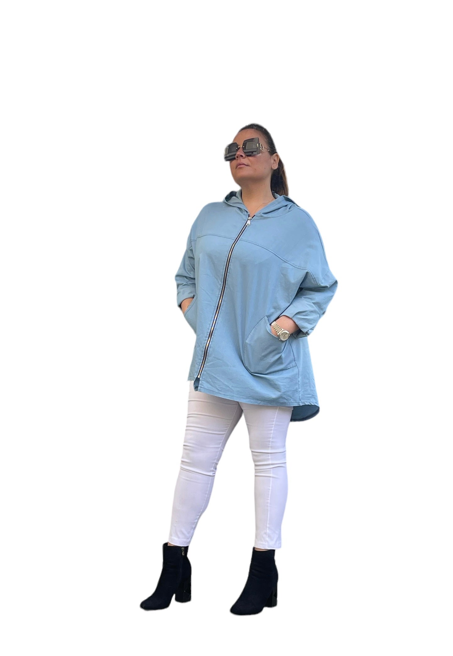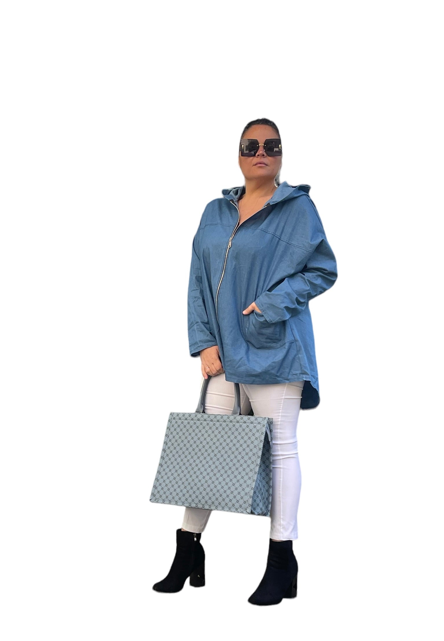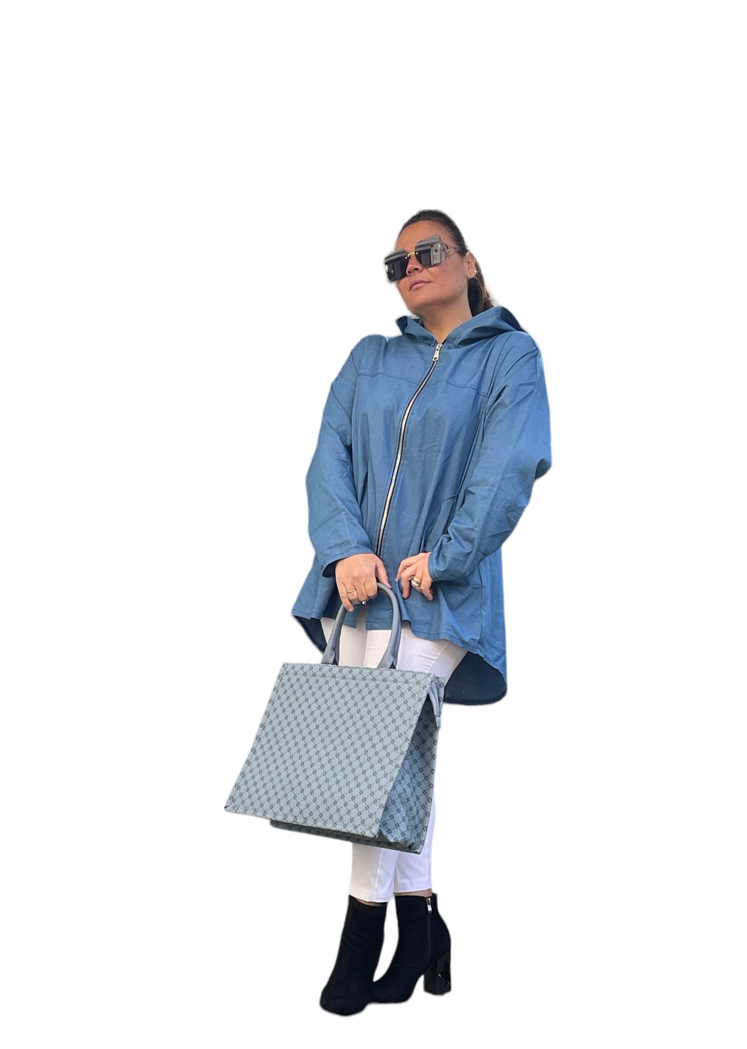 Giacca/cardigan in 100%cotone jeans con cappuccio e zip