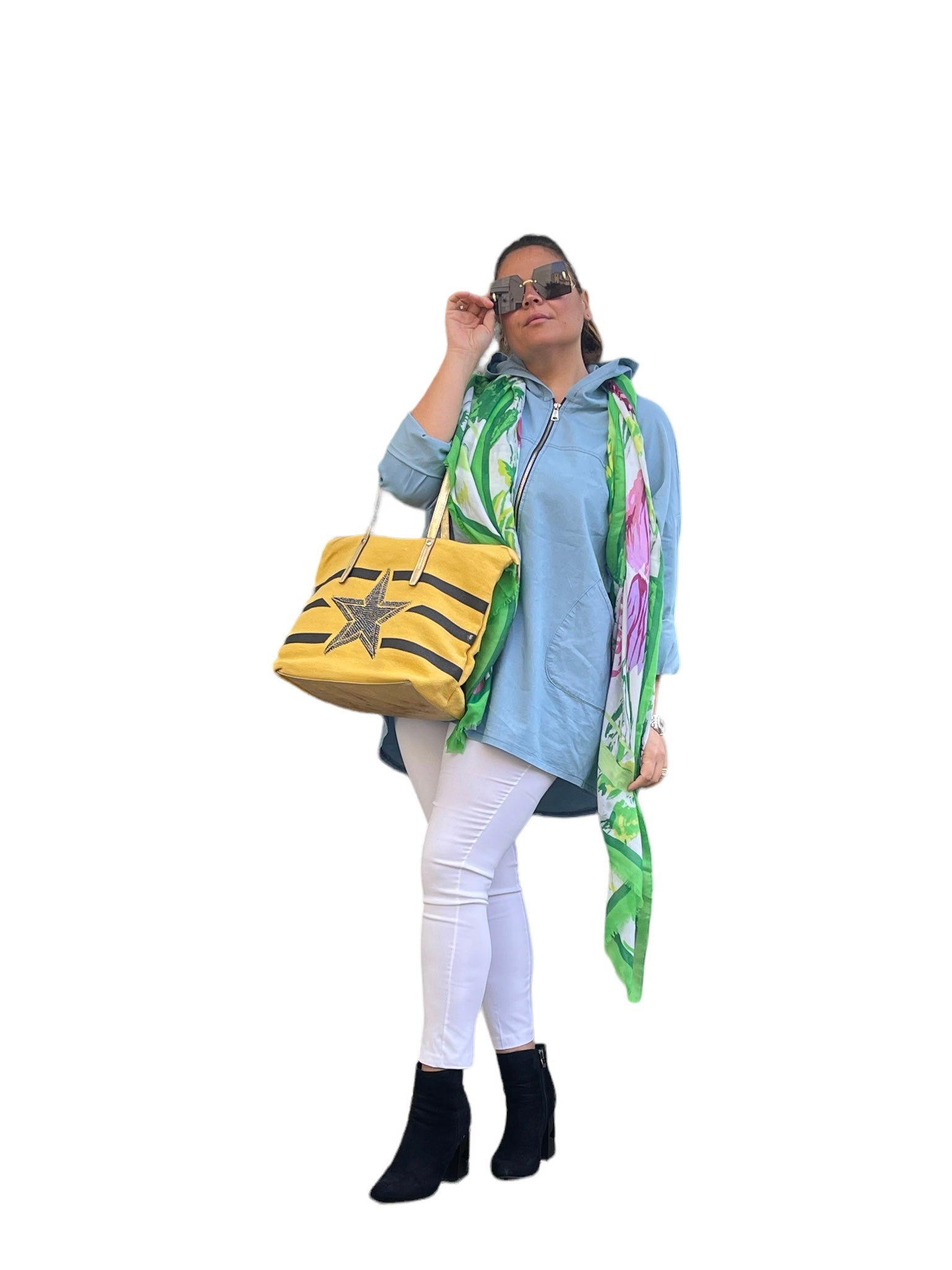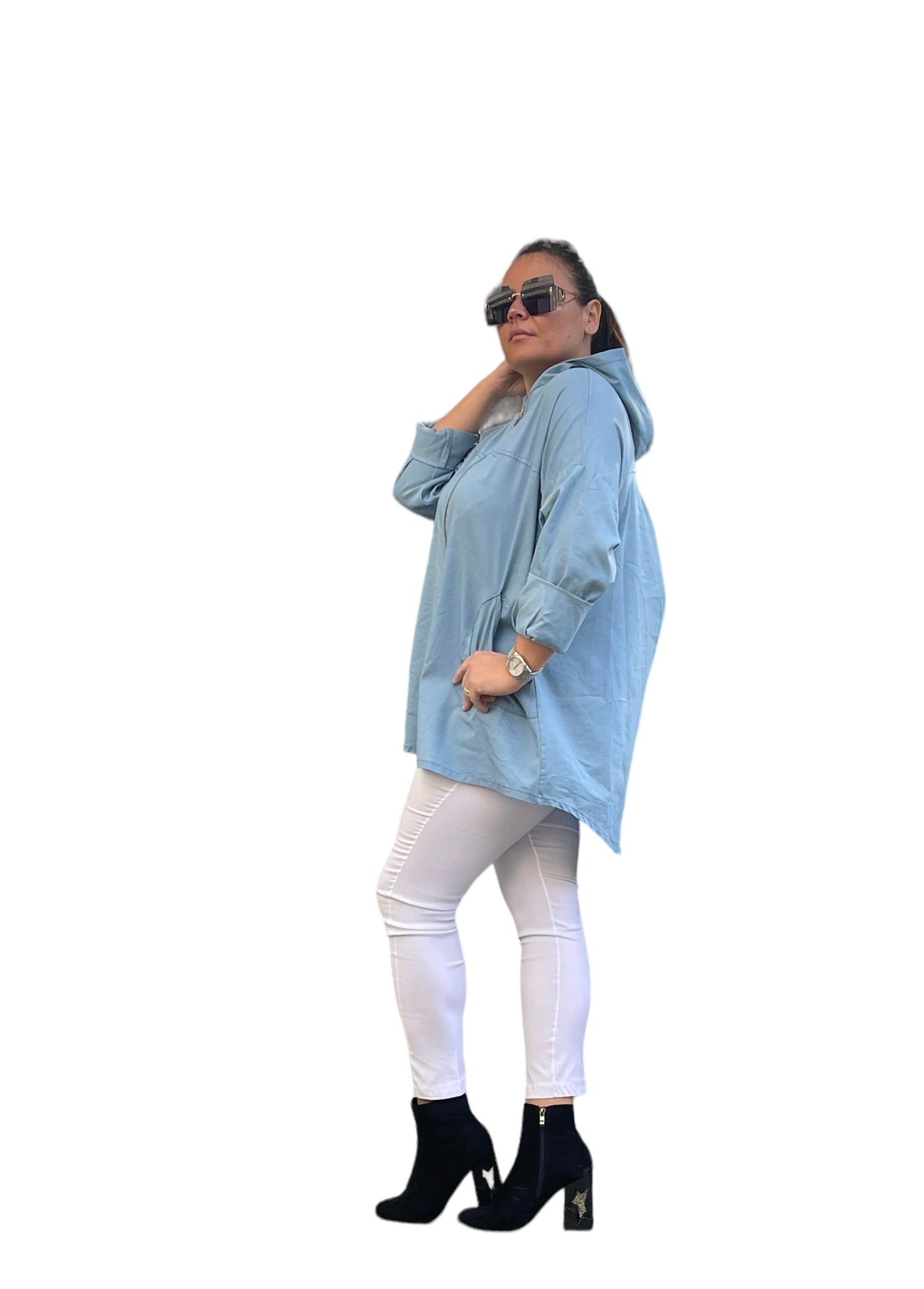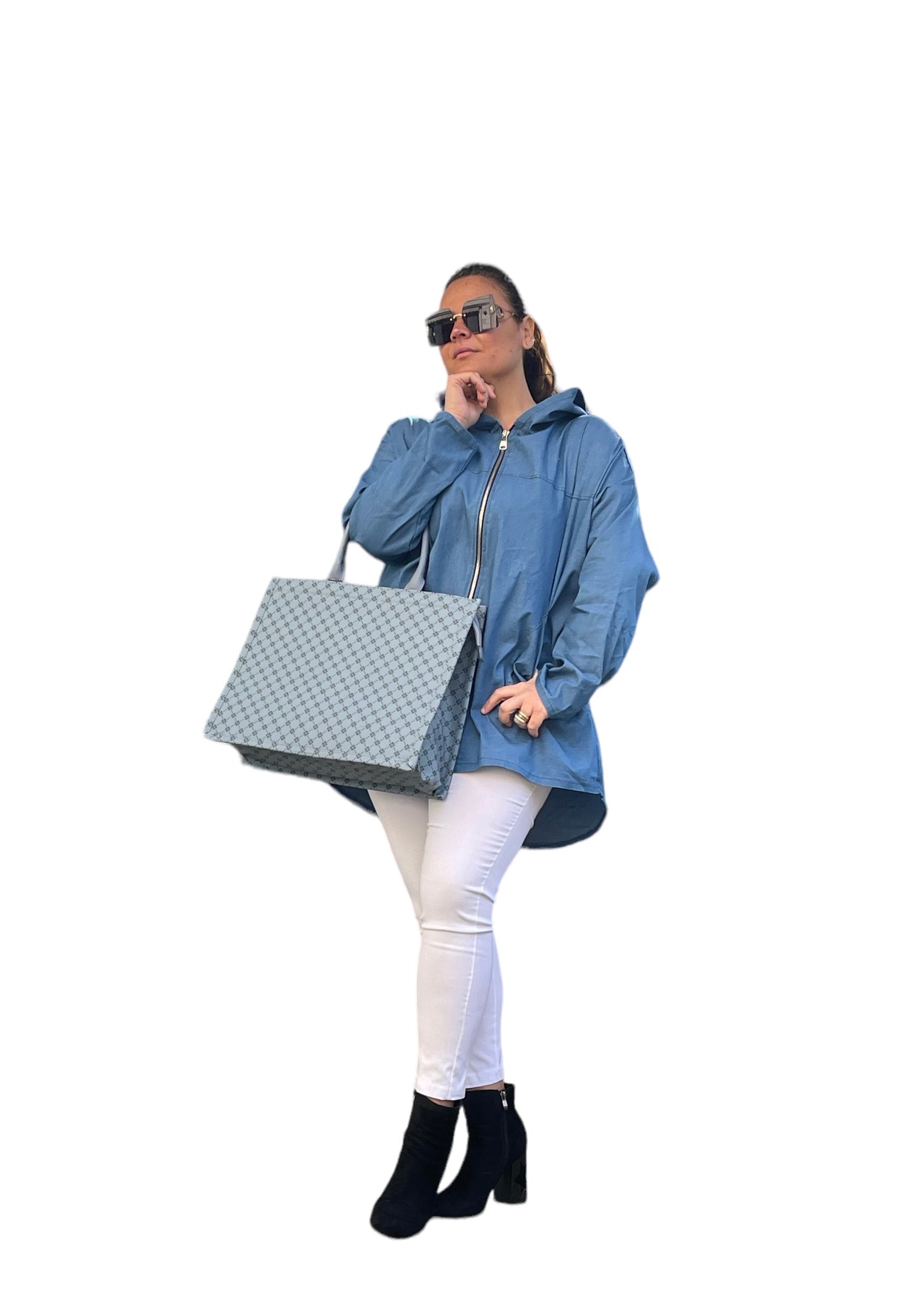 Giacca/cardigan in 100%cotone jeans con cappuccio e zip
