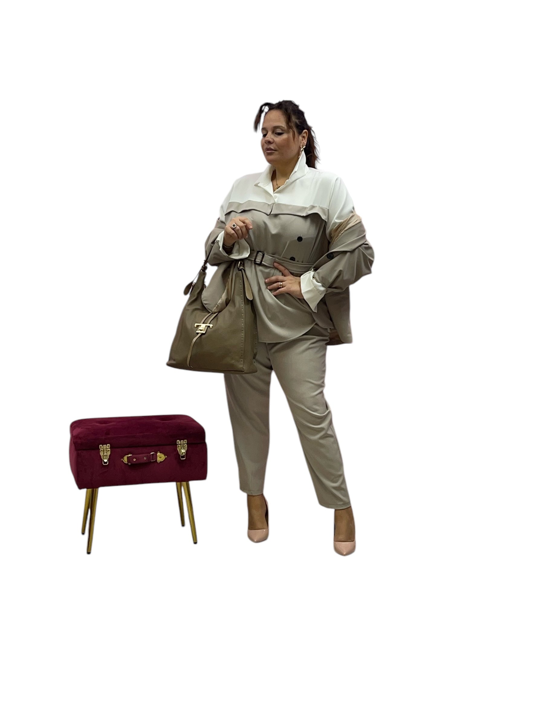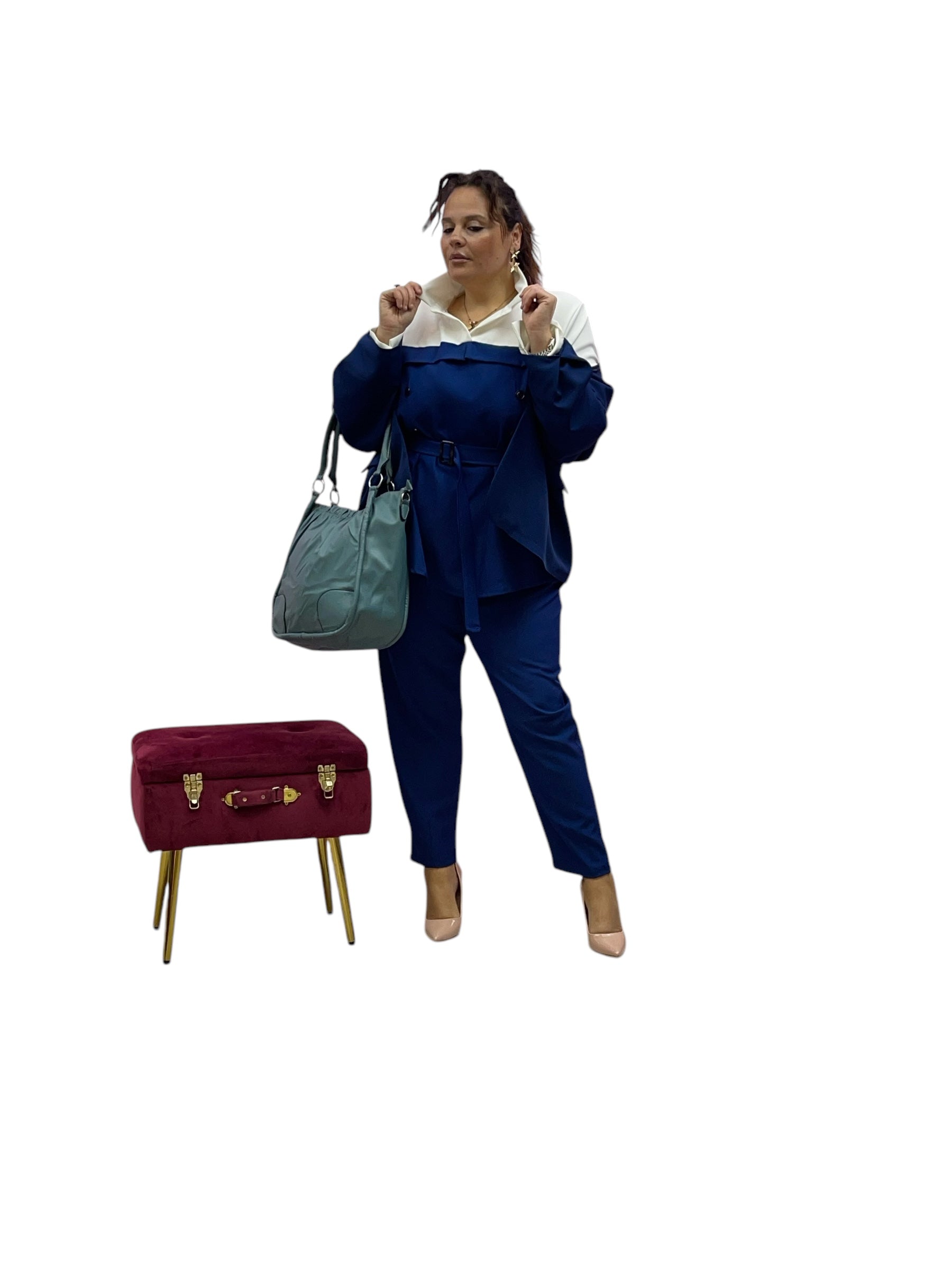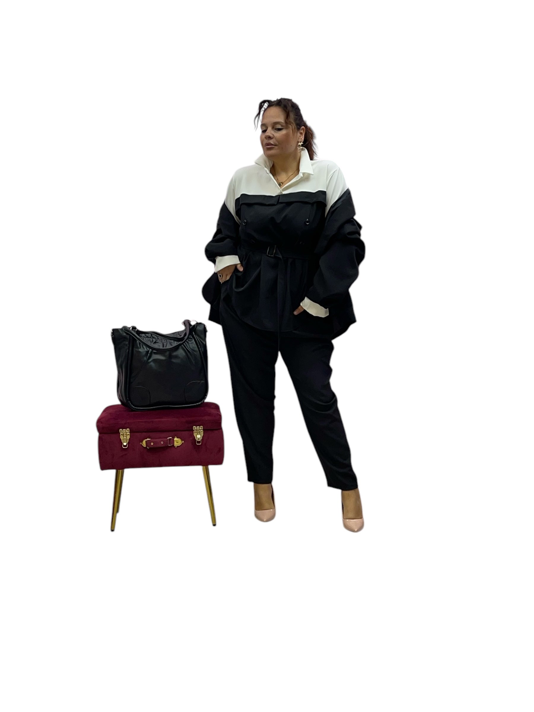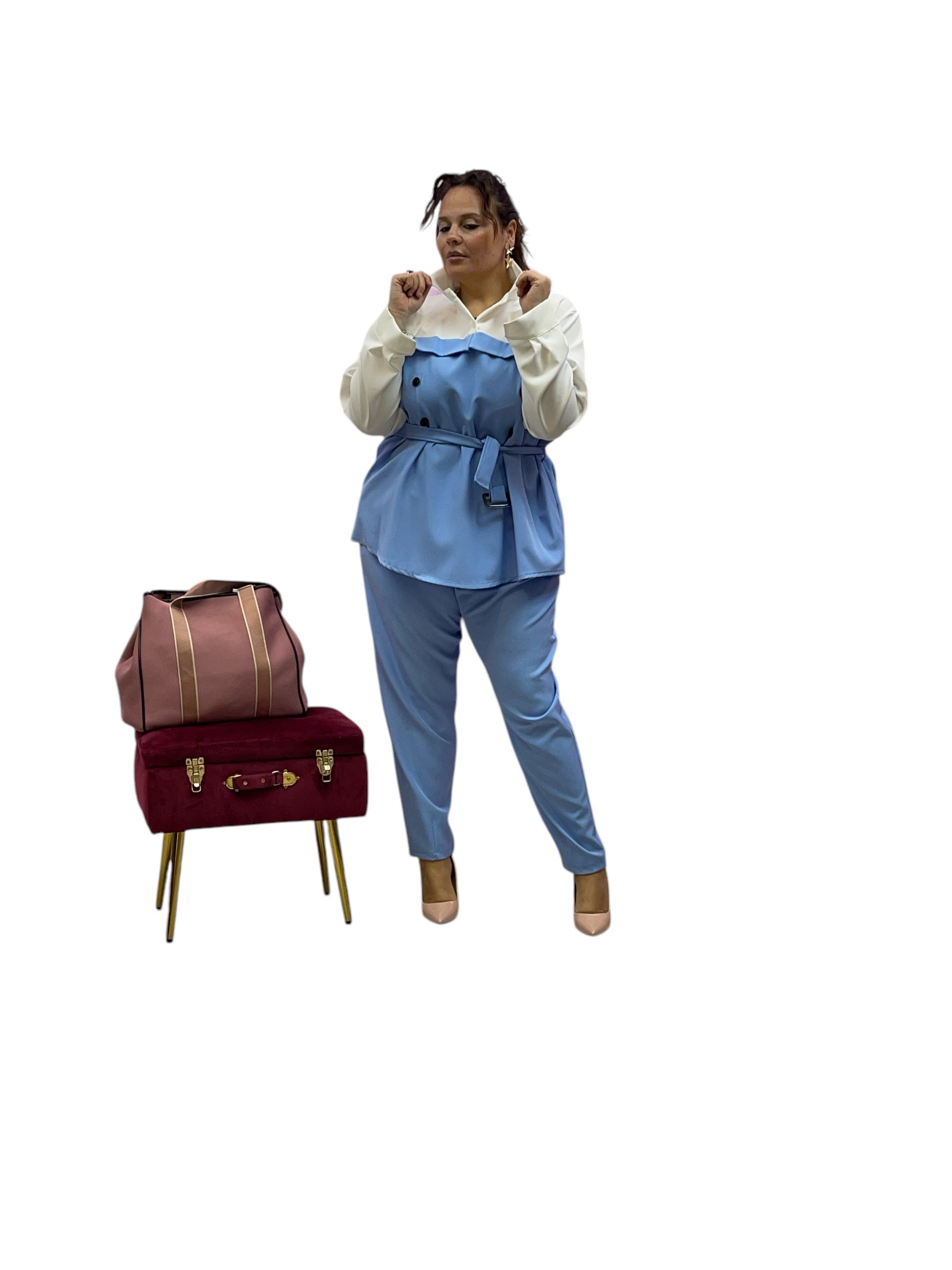 Completo over con pantaloni tasca america ed elastico in vita e blusa con cintura,colletto camicia e bottoni