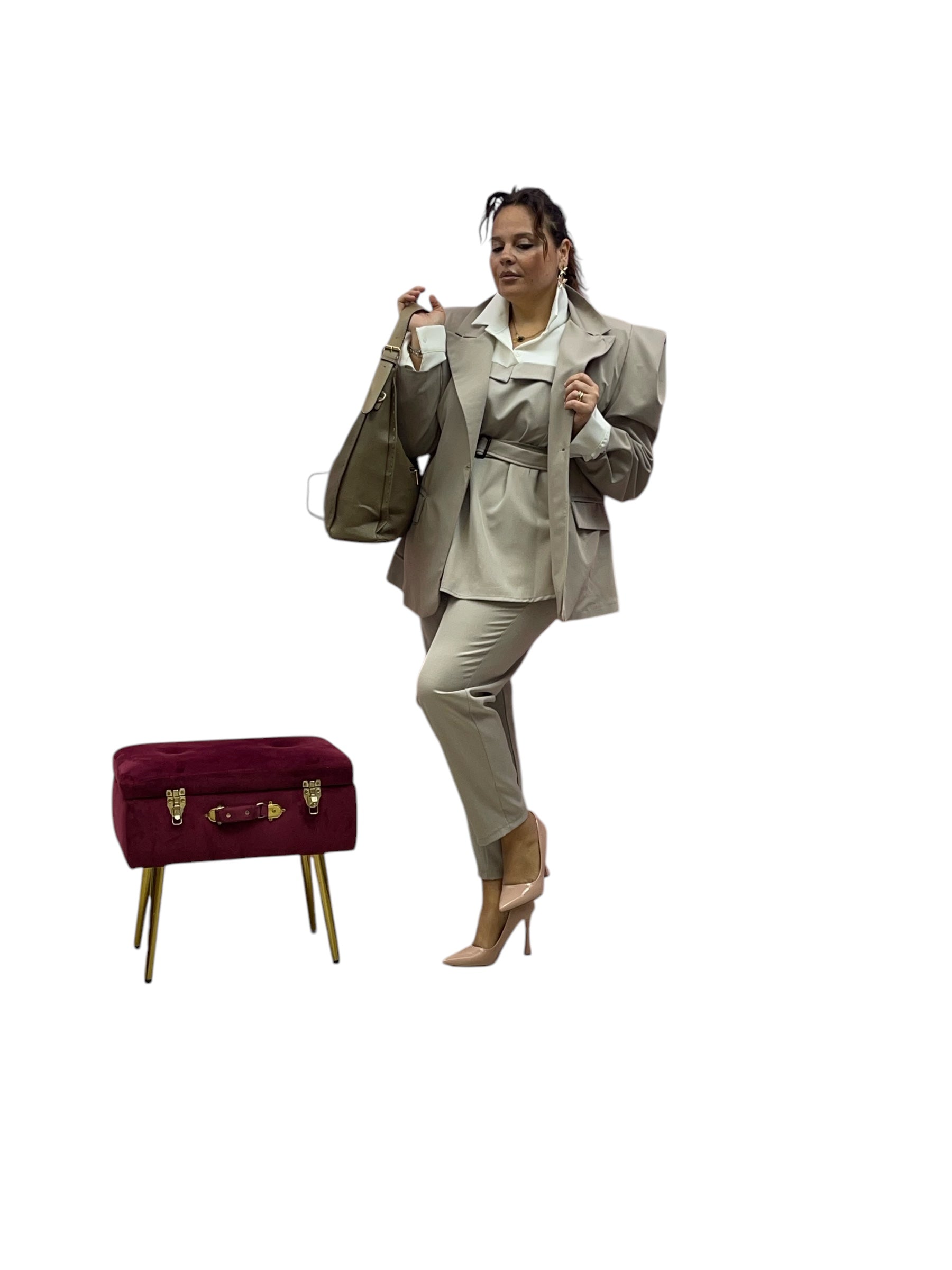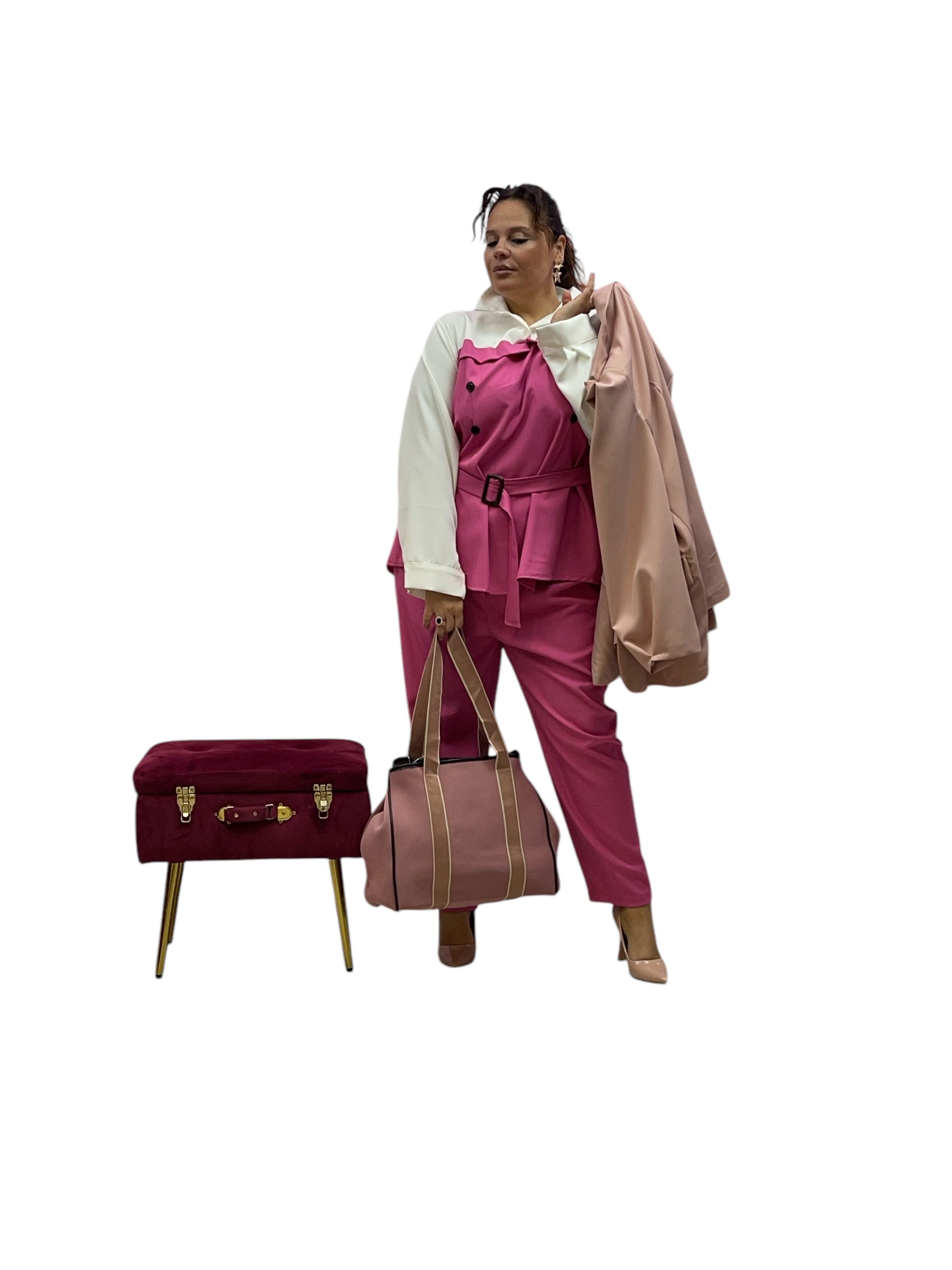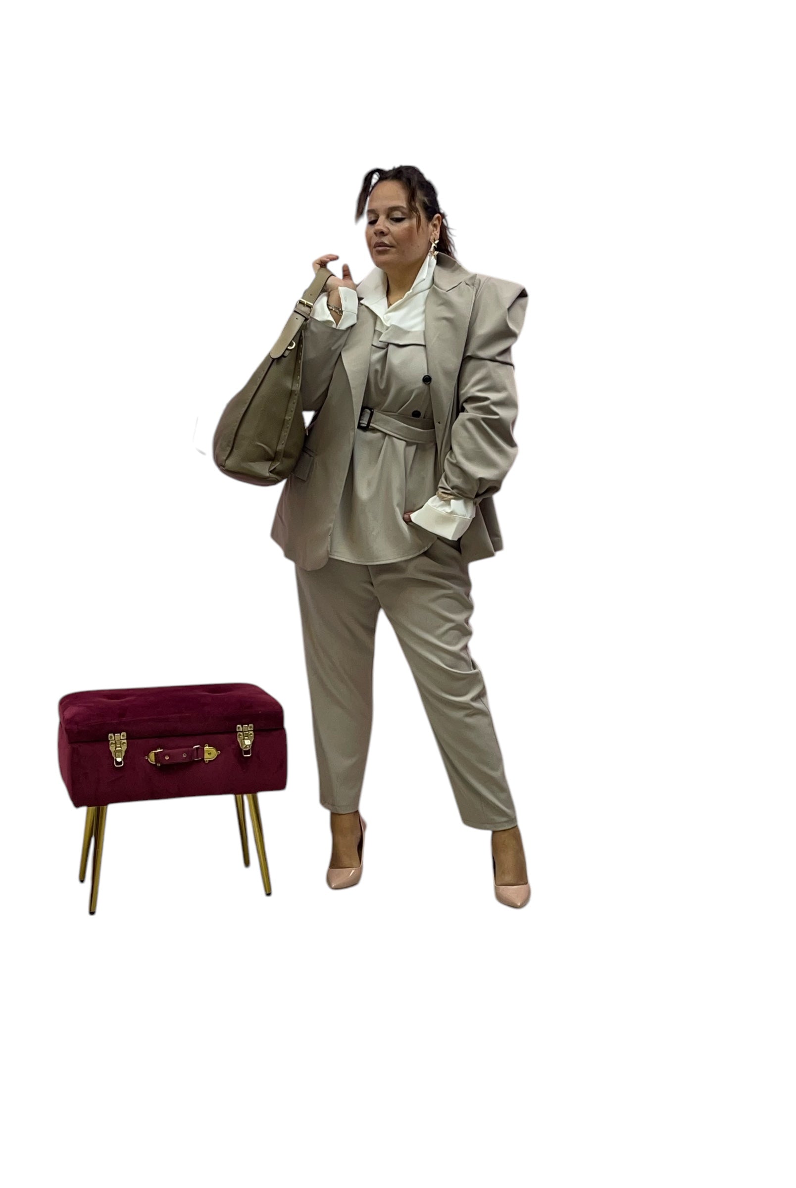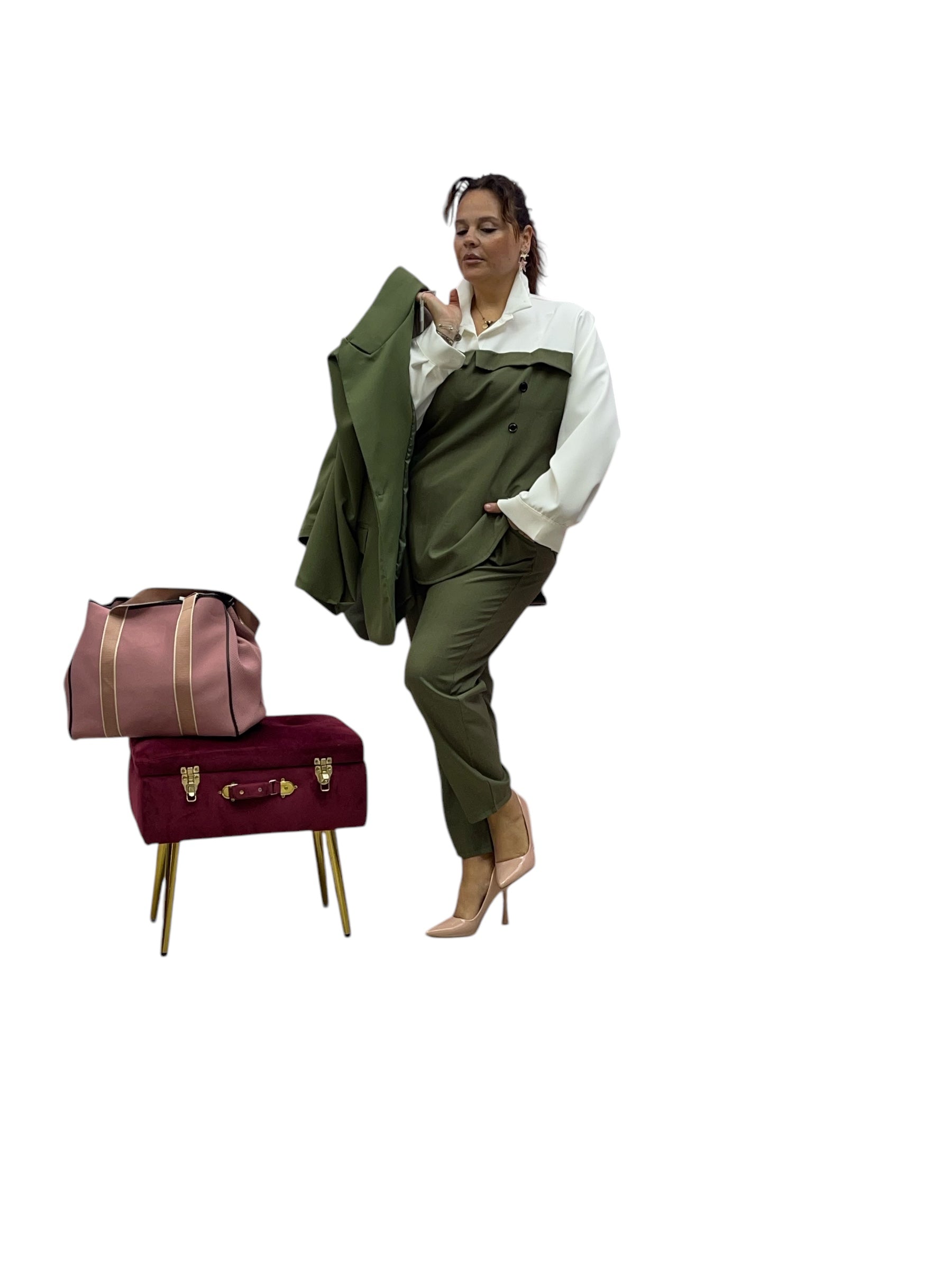 Completo over con pantaloni tasca america ed elastico in vita e blusa con cintura,colletto camicia e bottoni