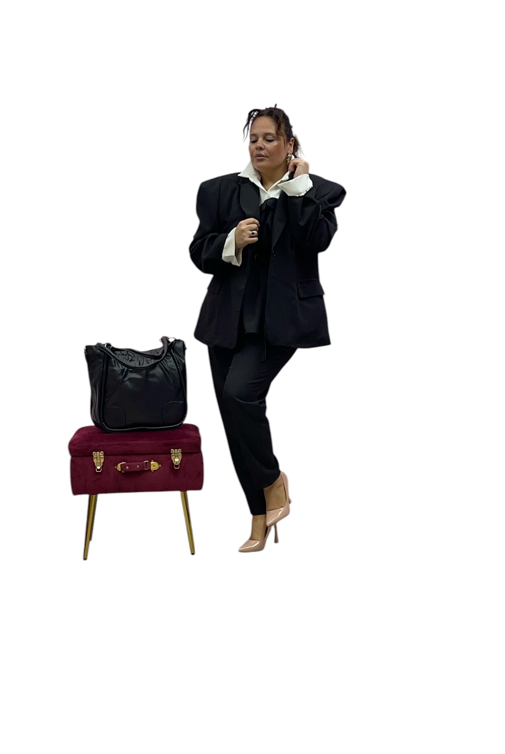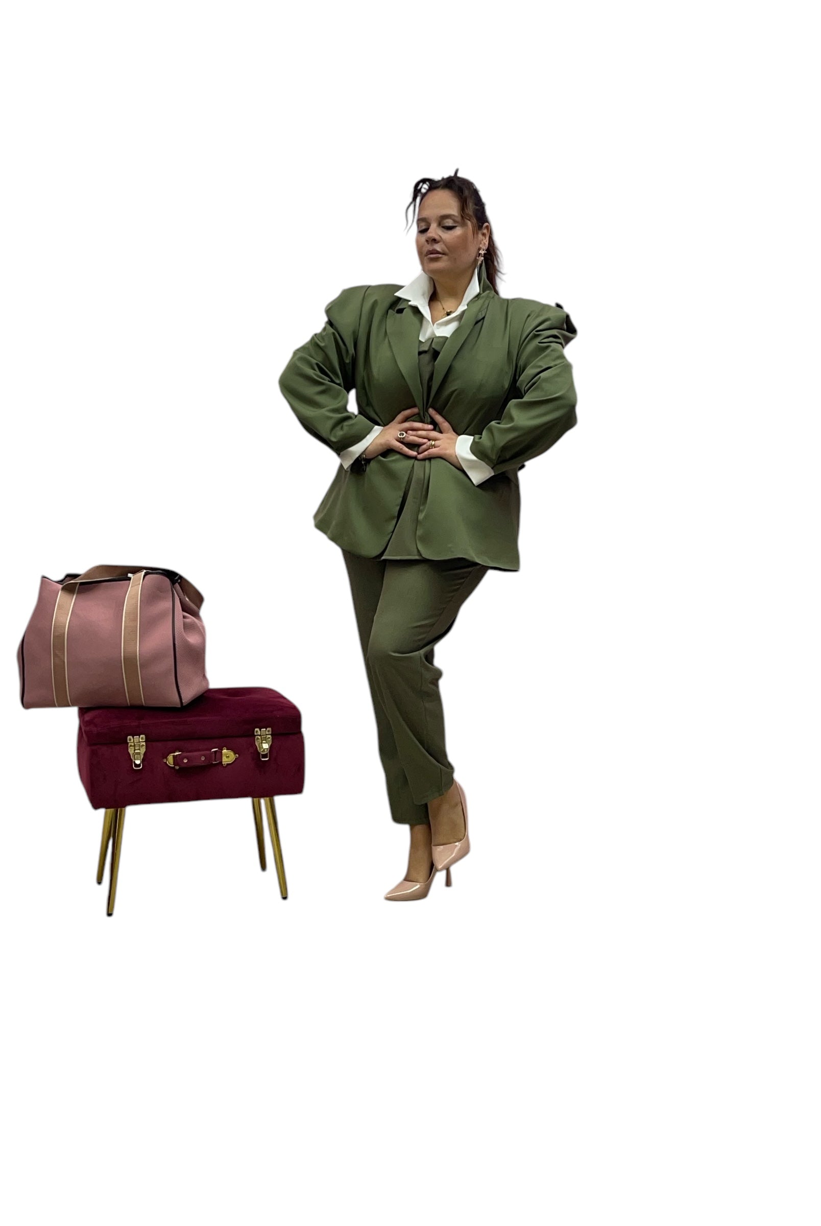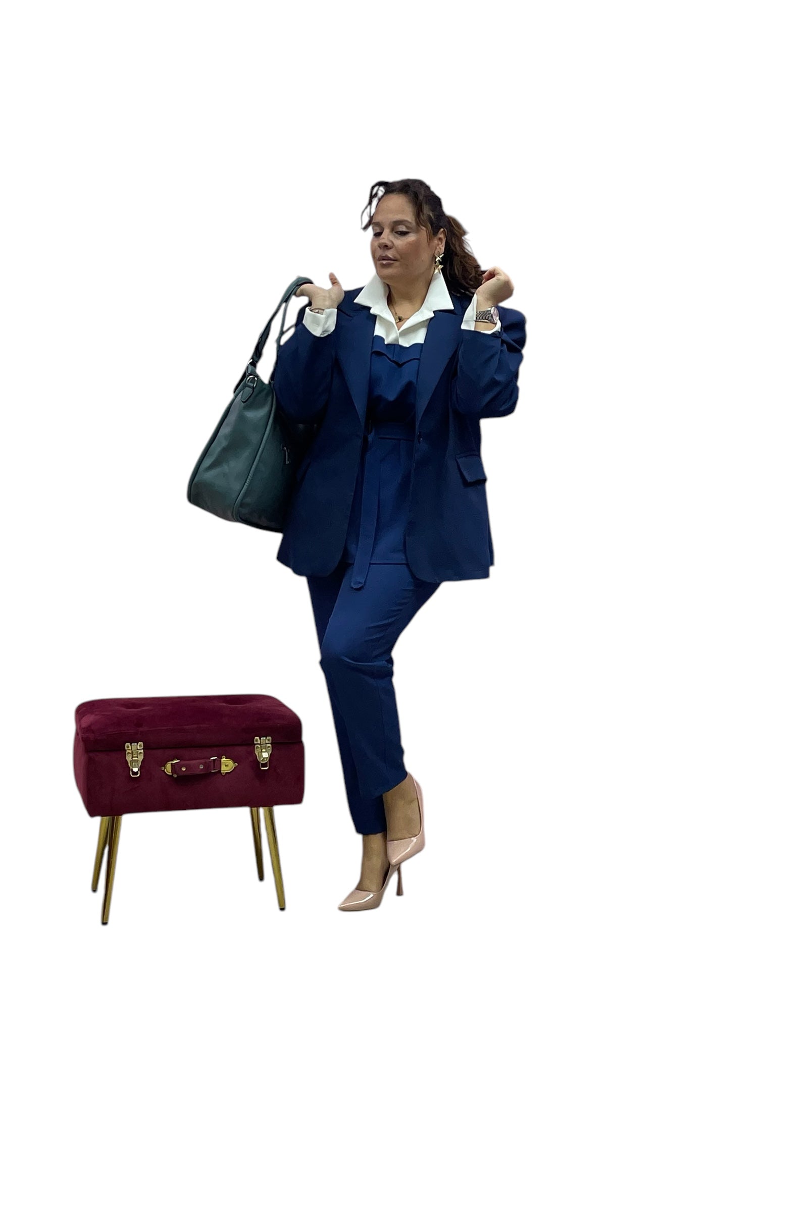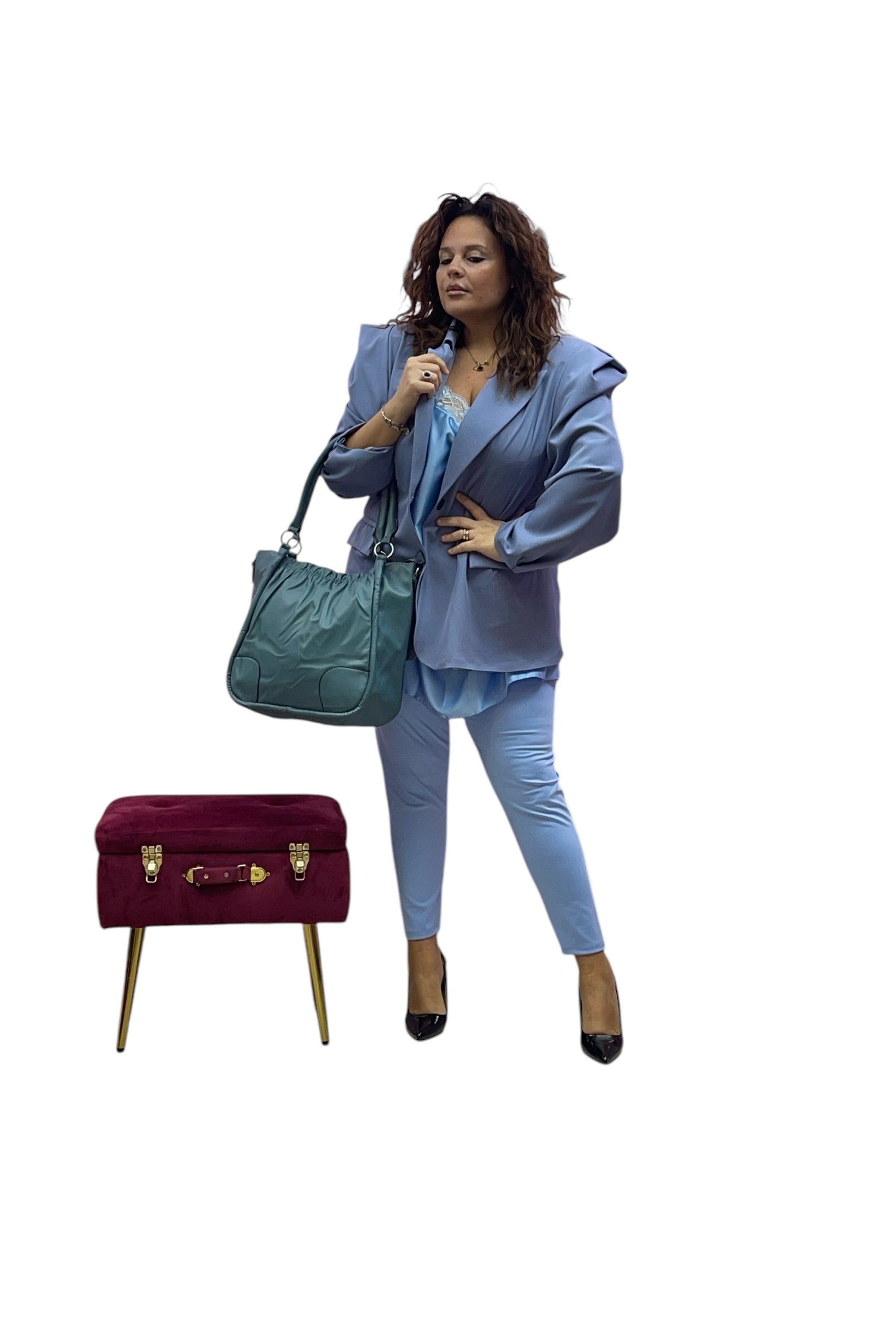 Completo over con pantaloni tasca america ed elastico in vita e blusa con cintura,colletto camicia e bottoni