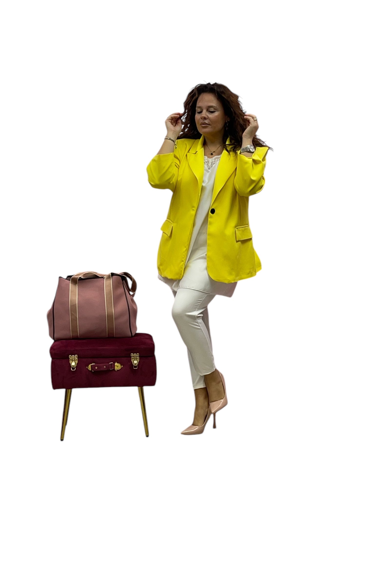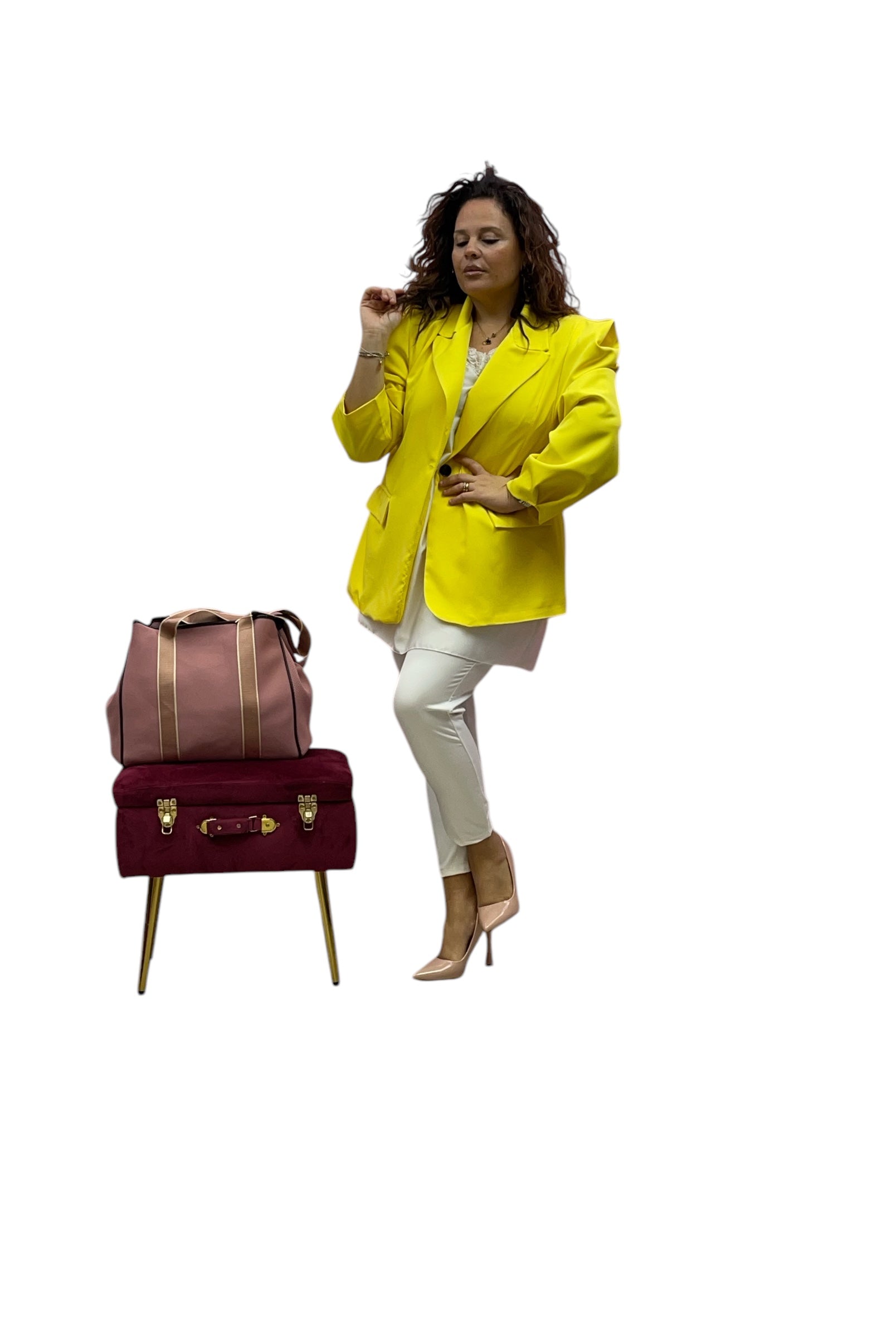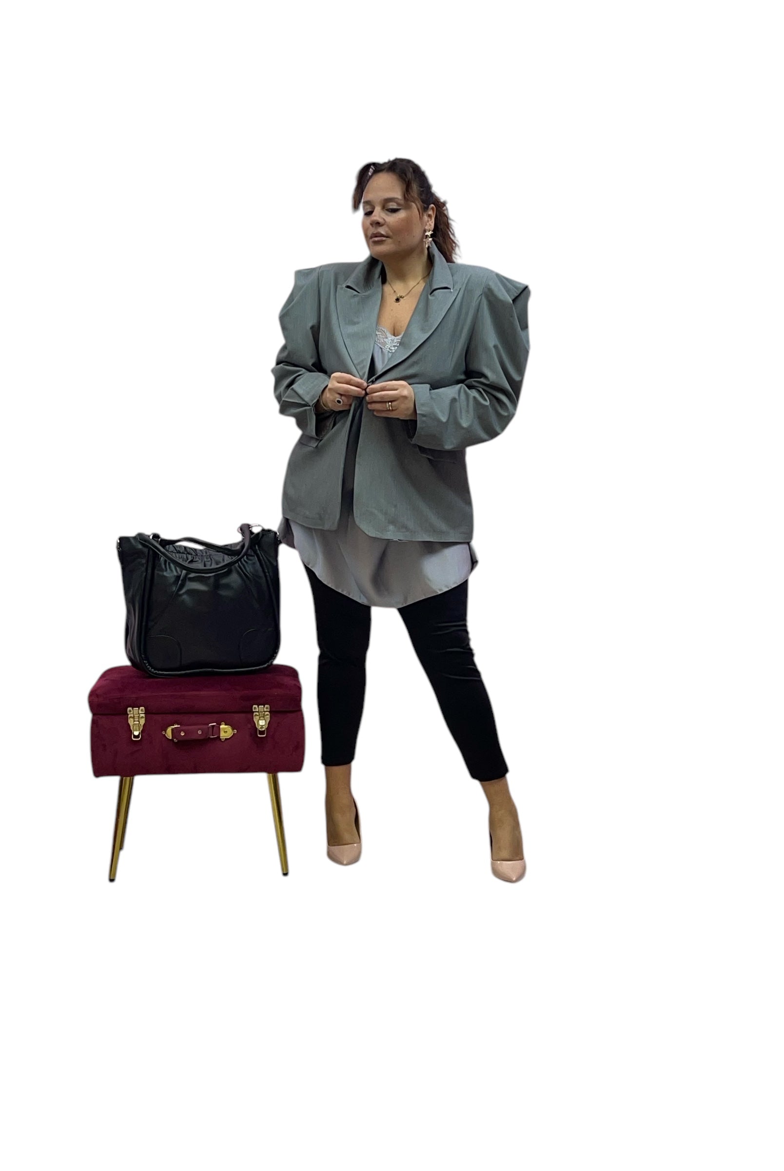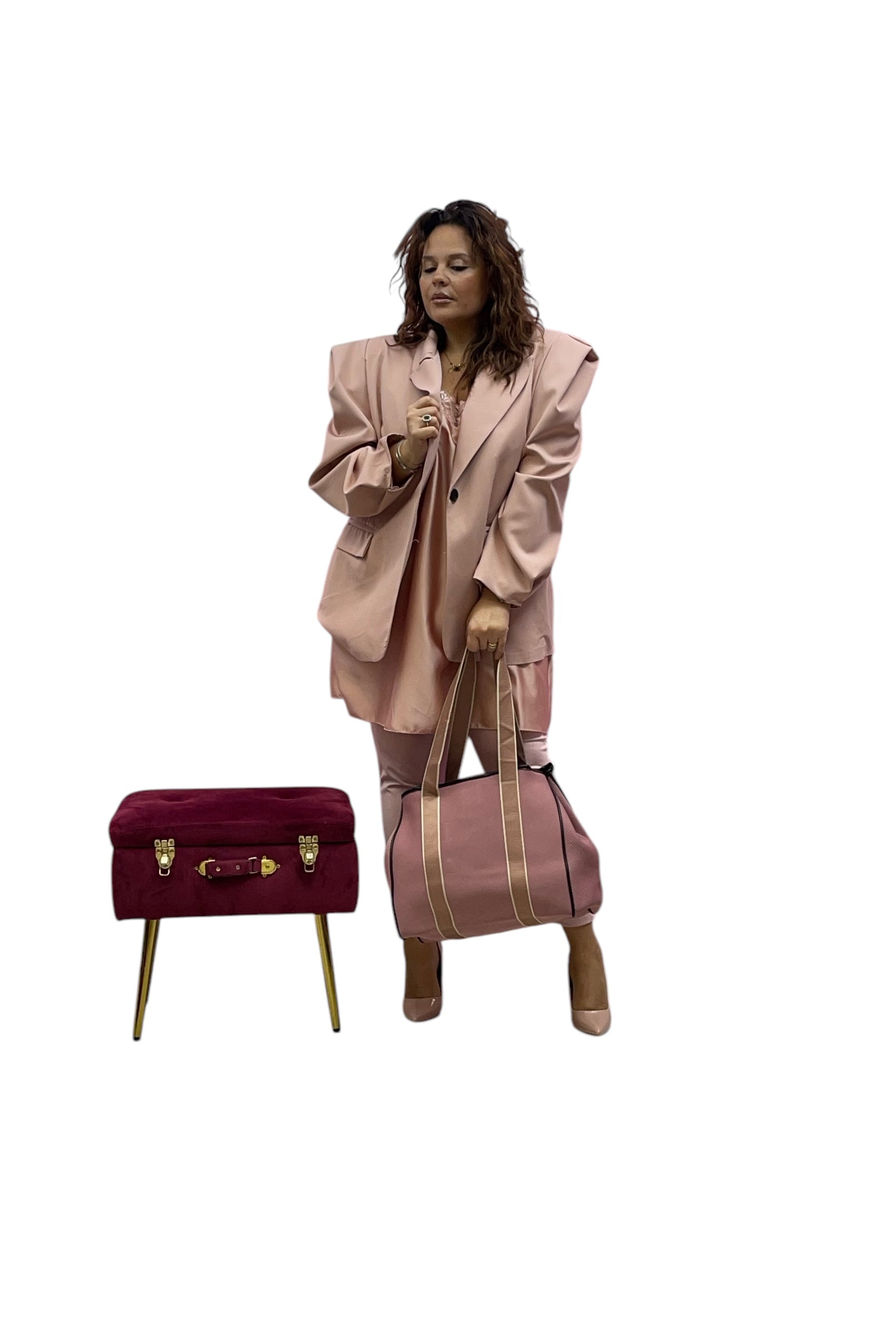 Completo over con pantaloni tasca america ed elastico in vita e blusa con cintura,colletto camicia e bottoni