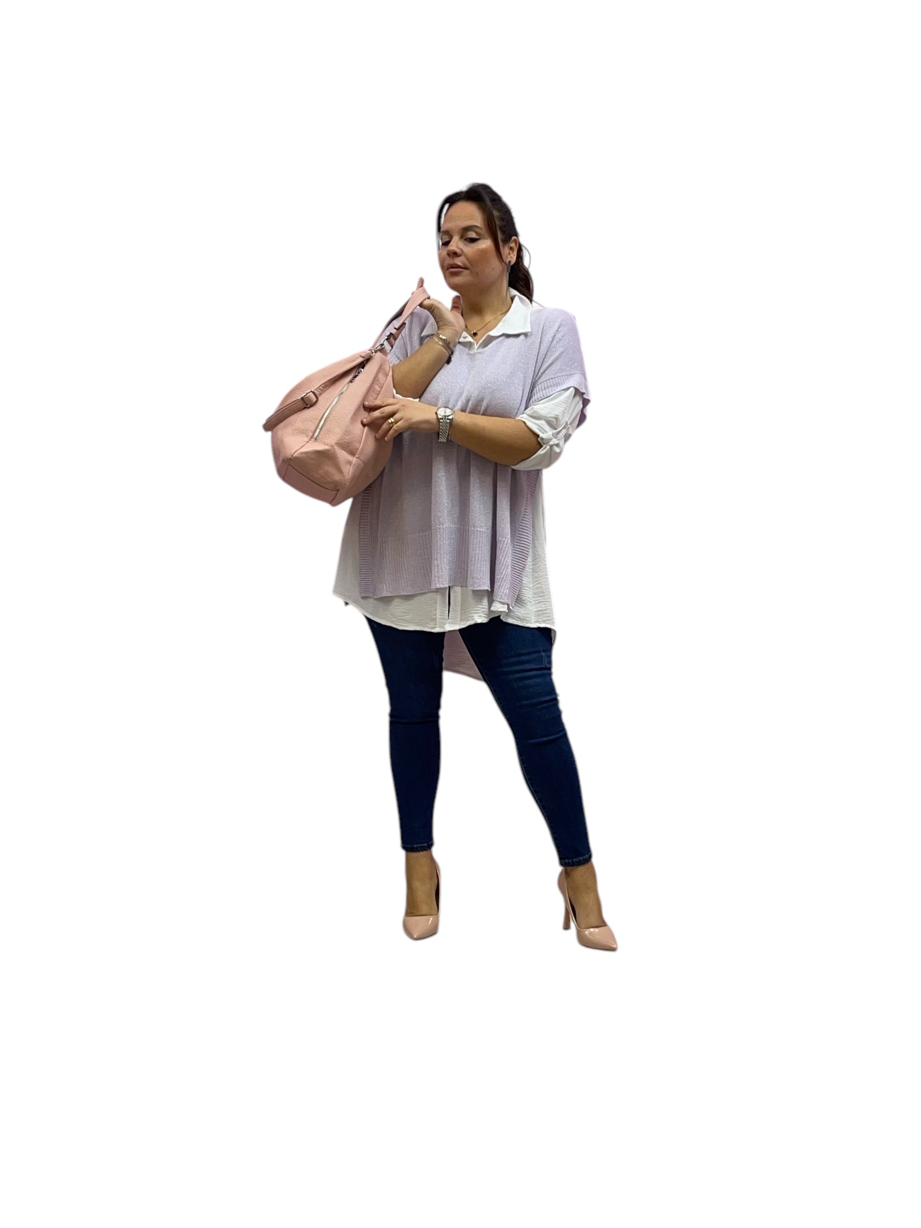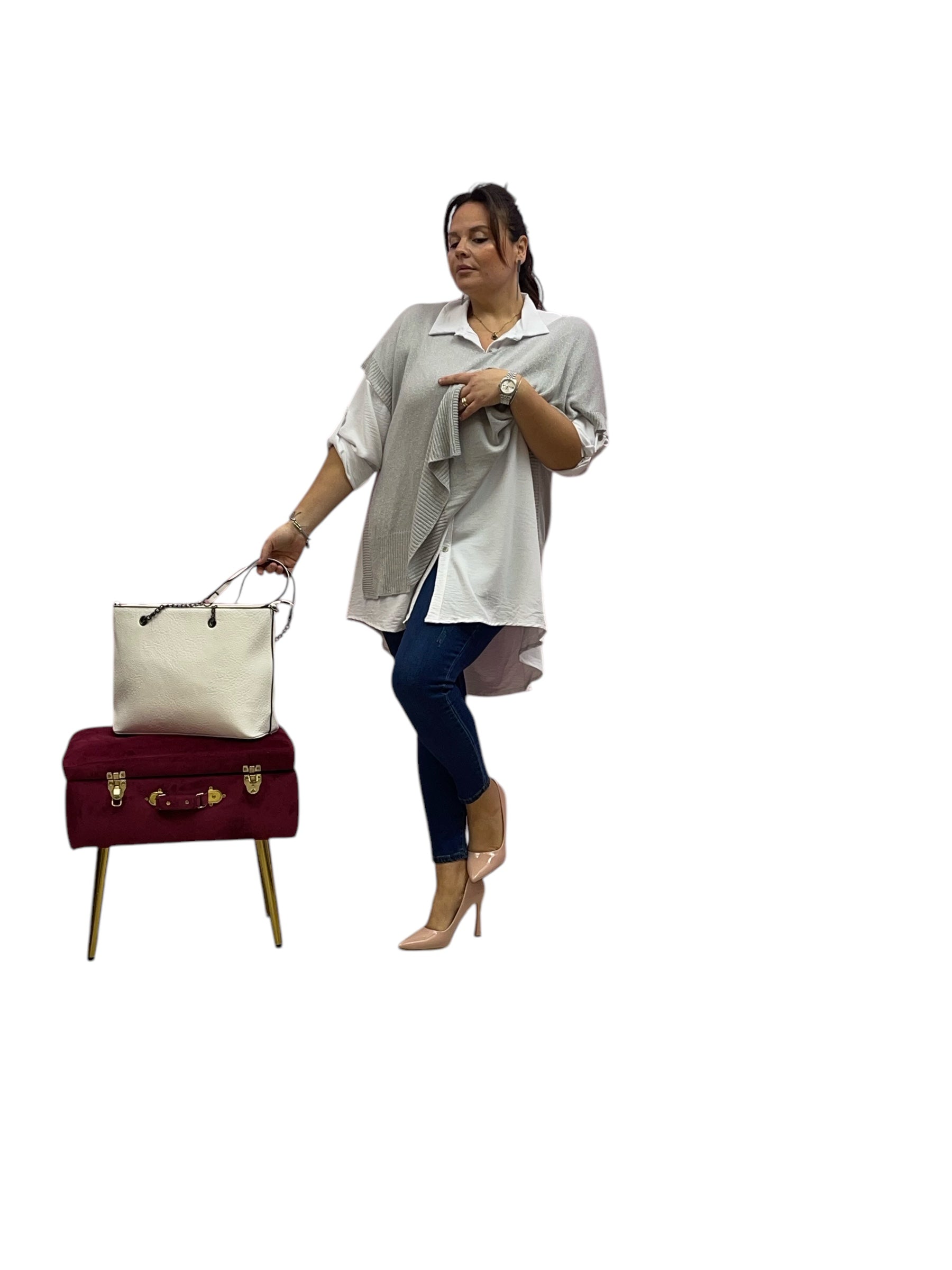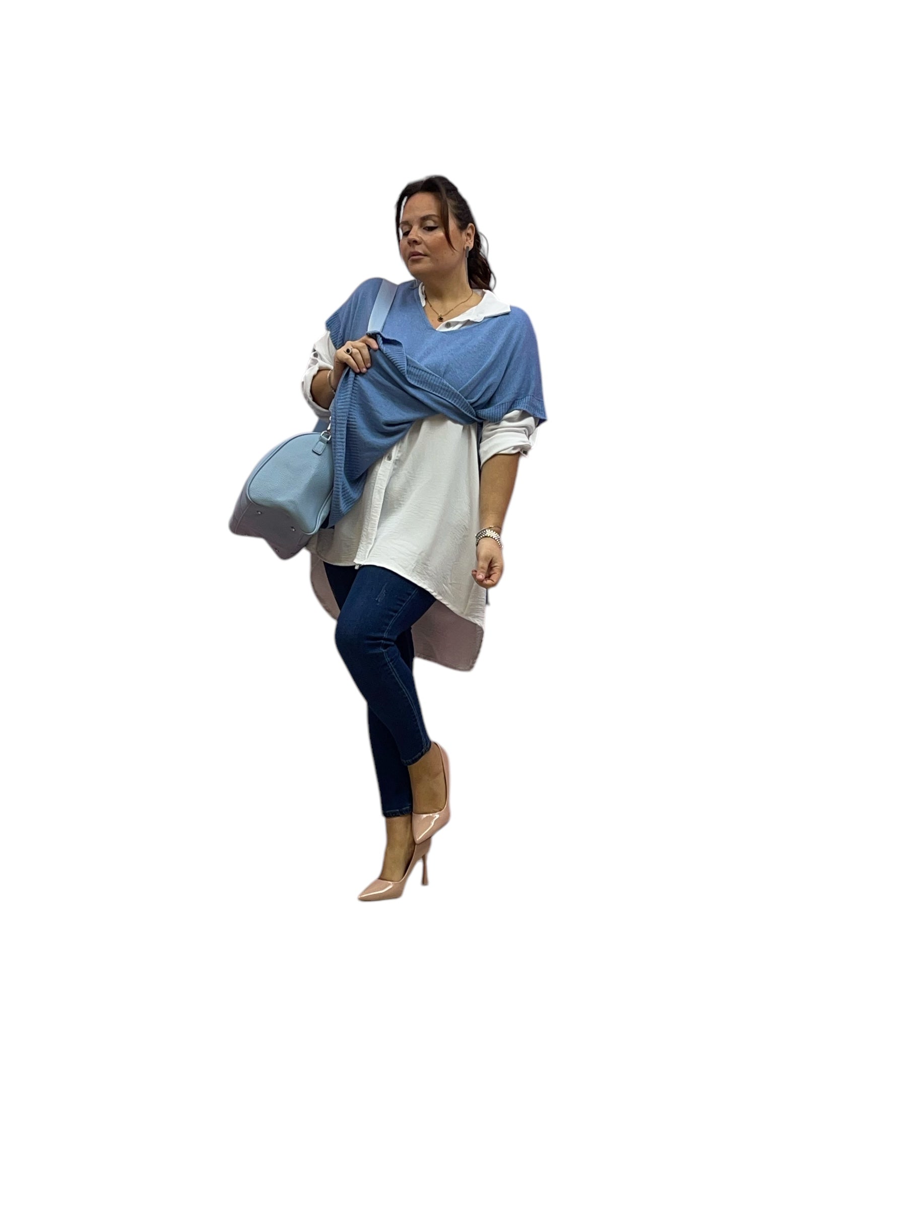 Twin set over con camiciaone e mantellina in filo con bottone laterale