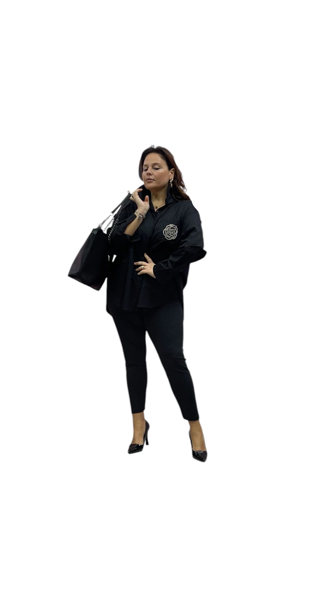Camicia over in cotone con applicazione al taschino in strass disegno fiore