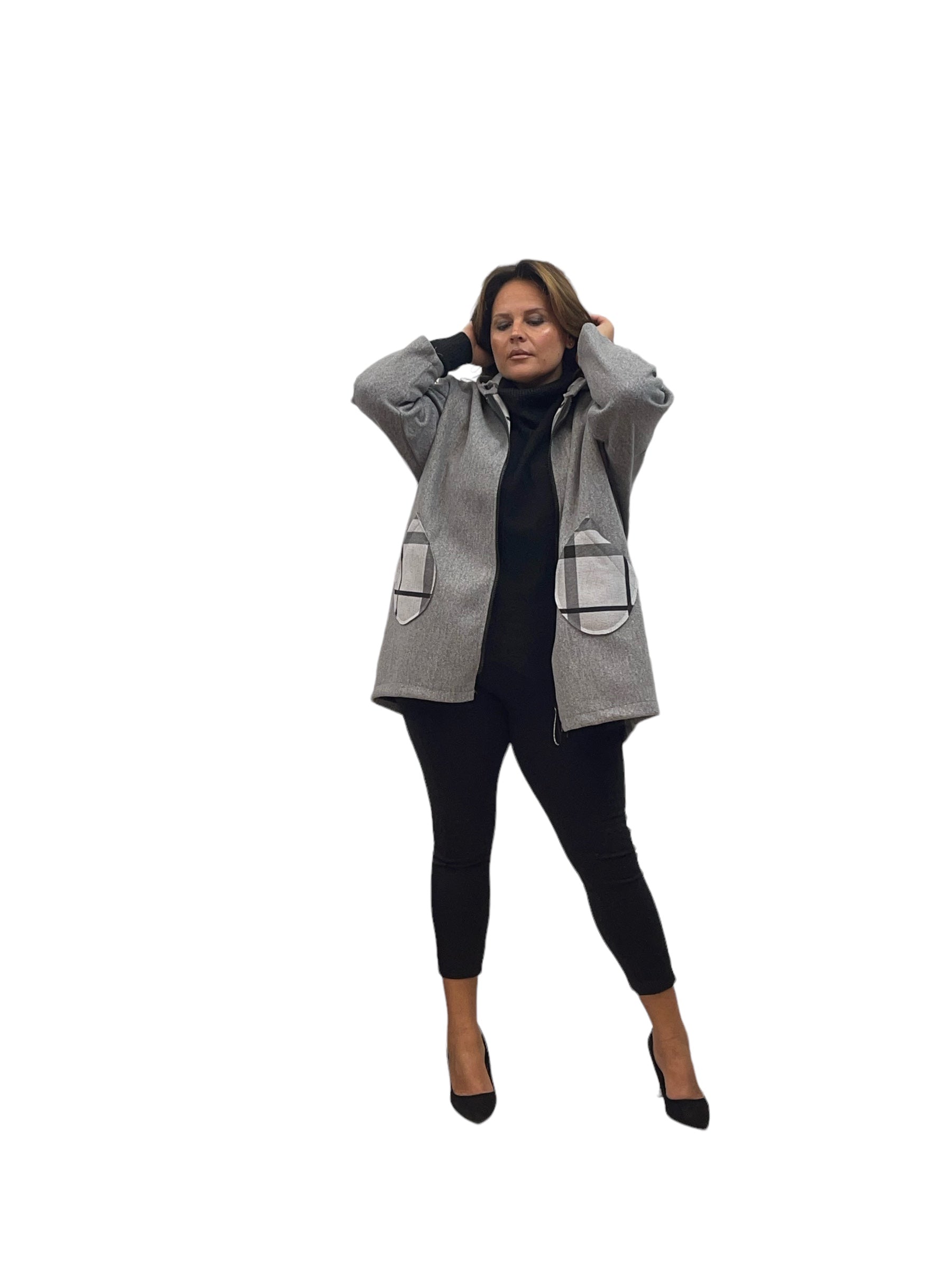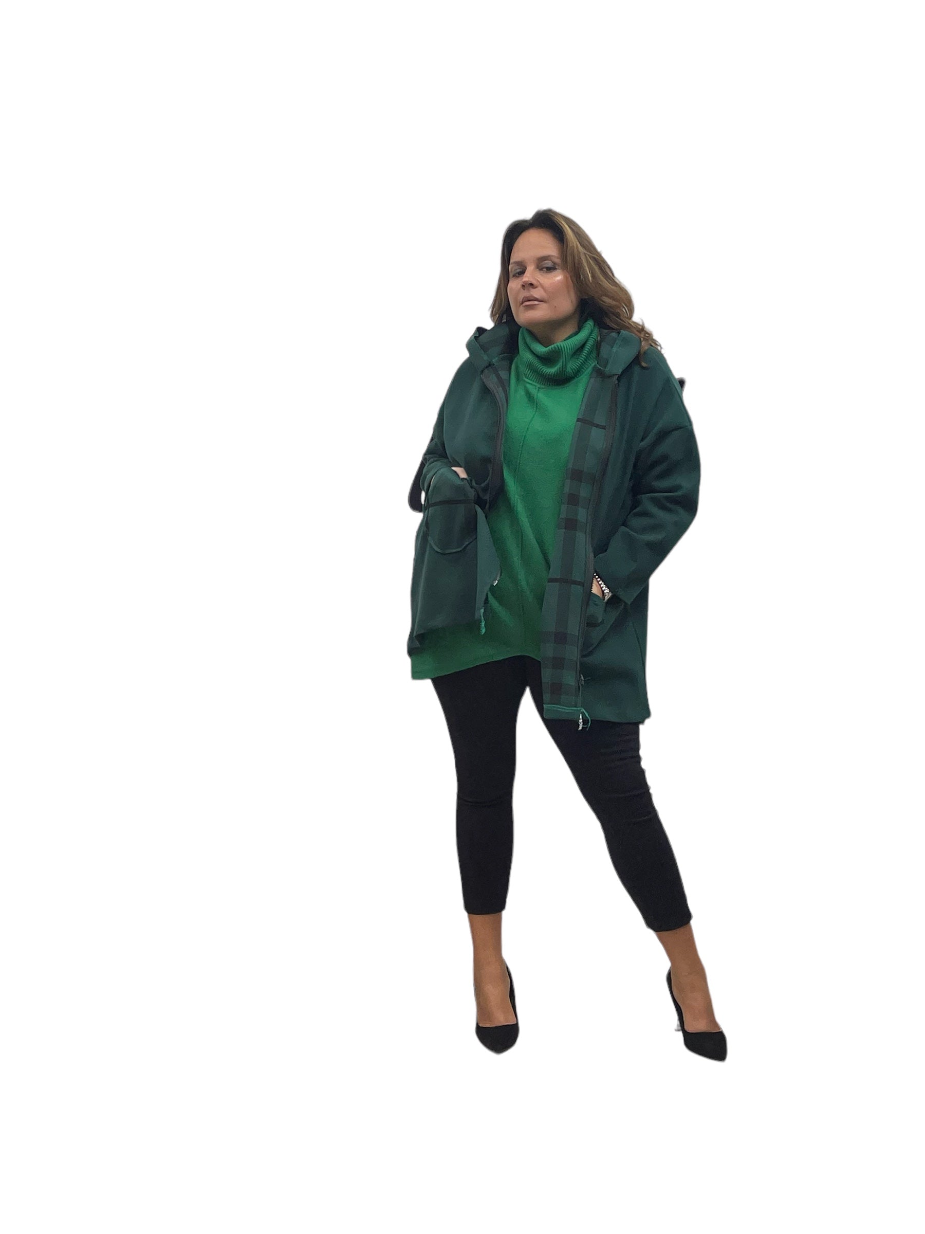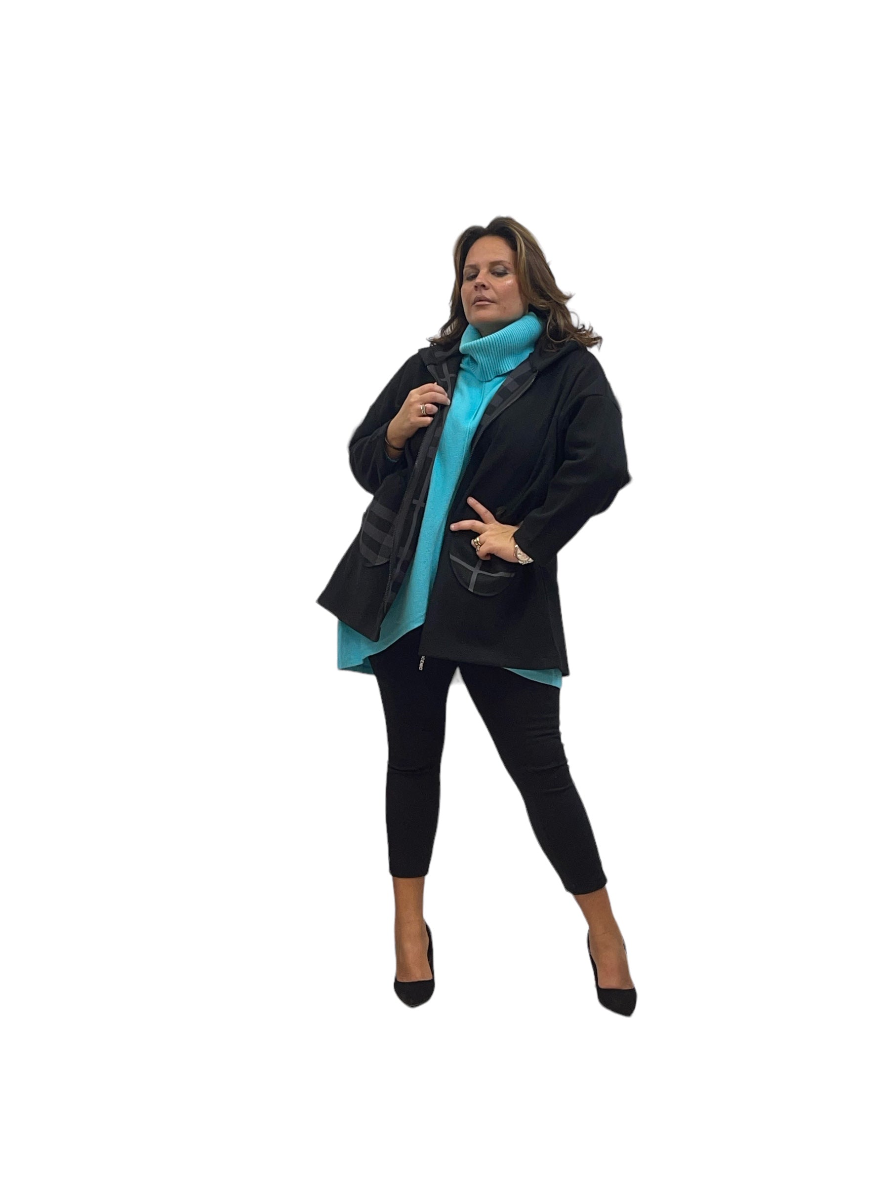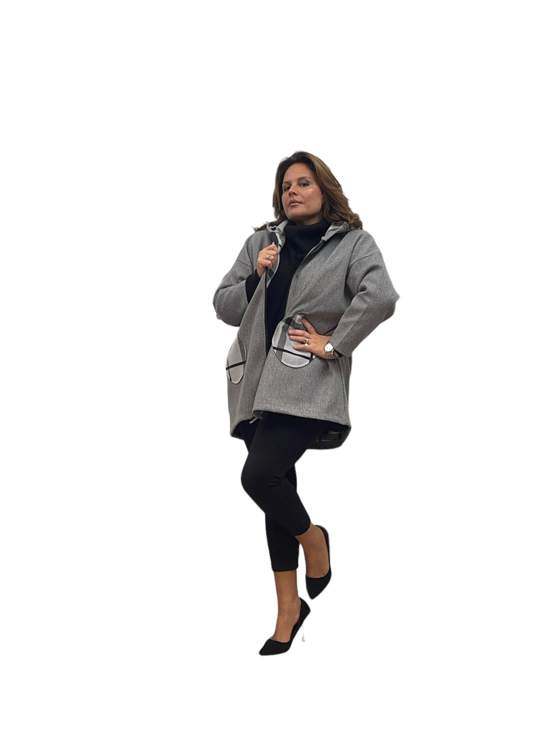 Cappotto corto effetto panno con cappuccio e tasconi quadri