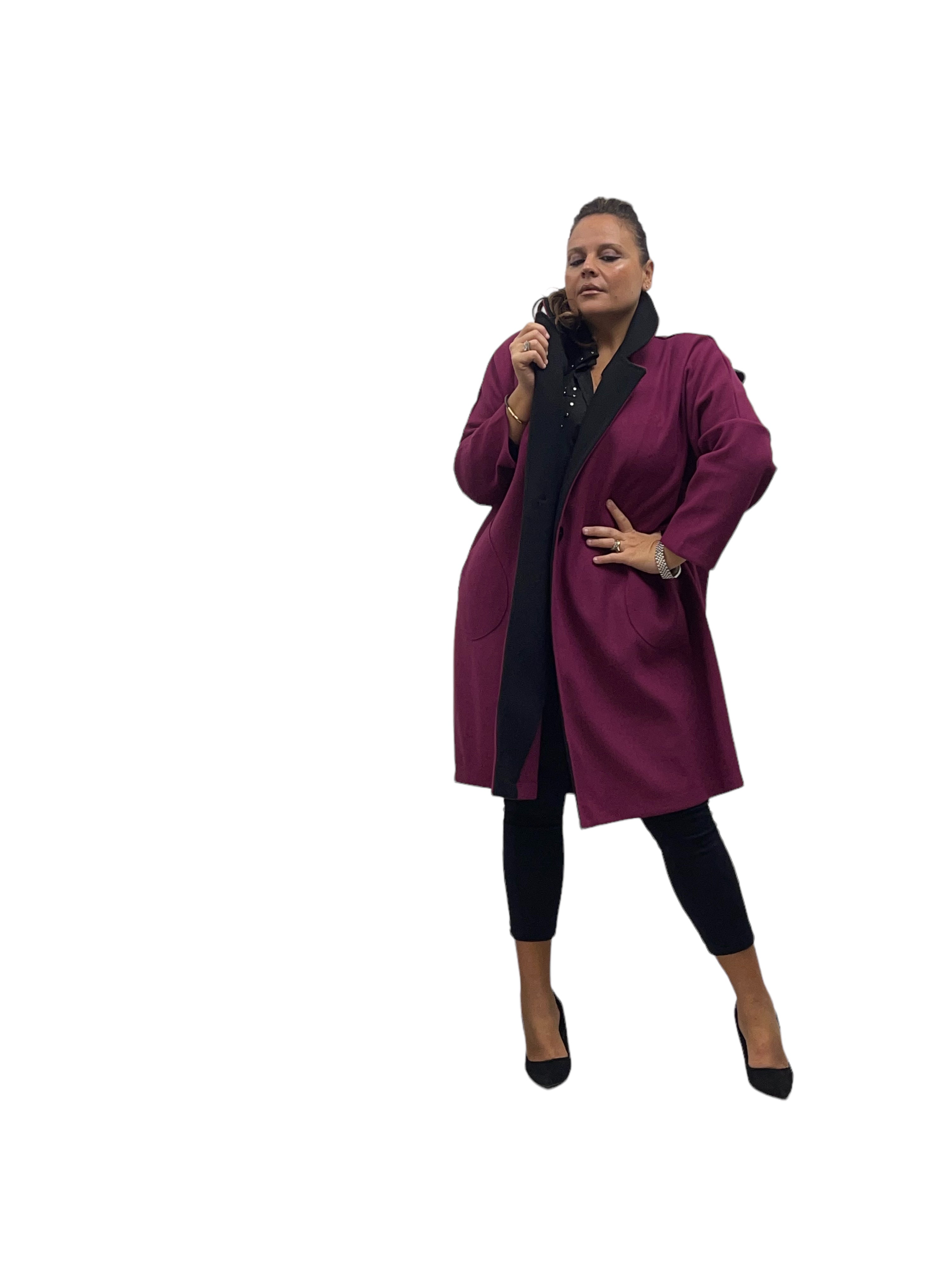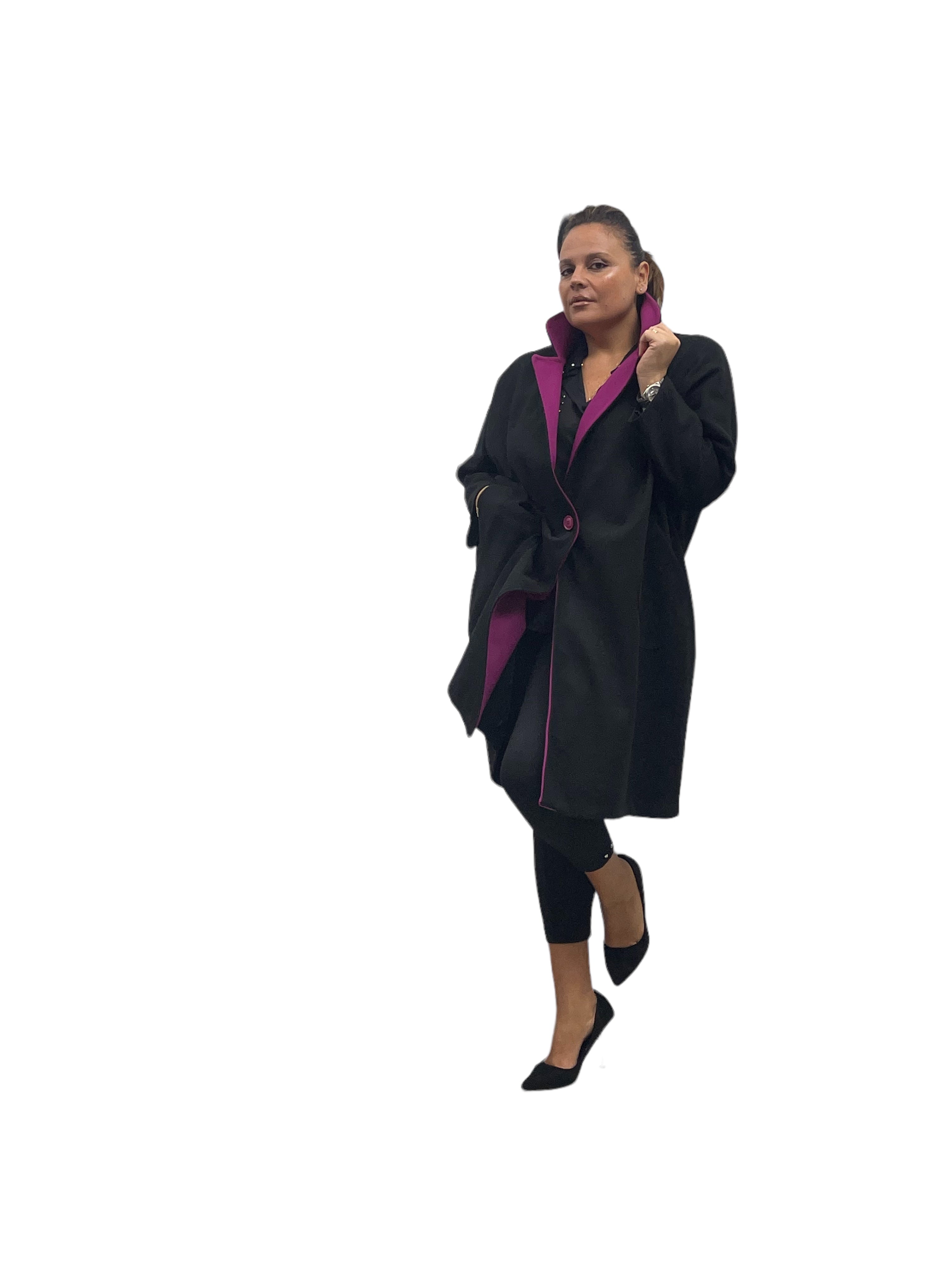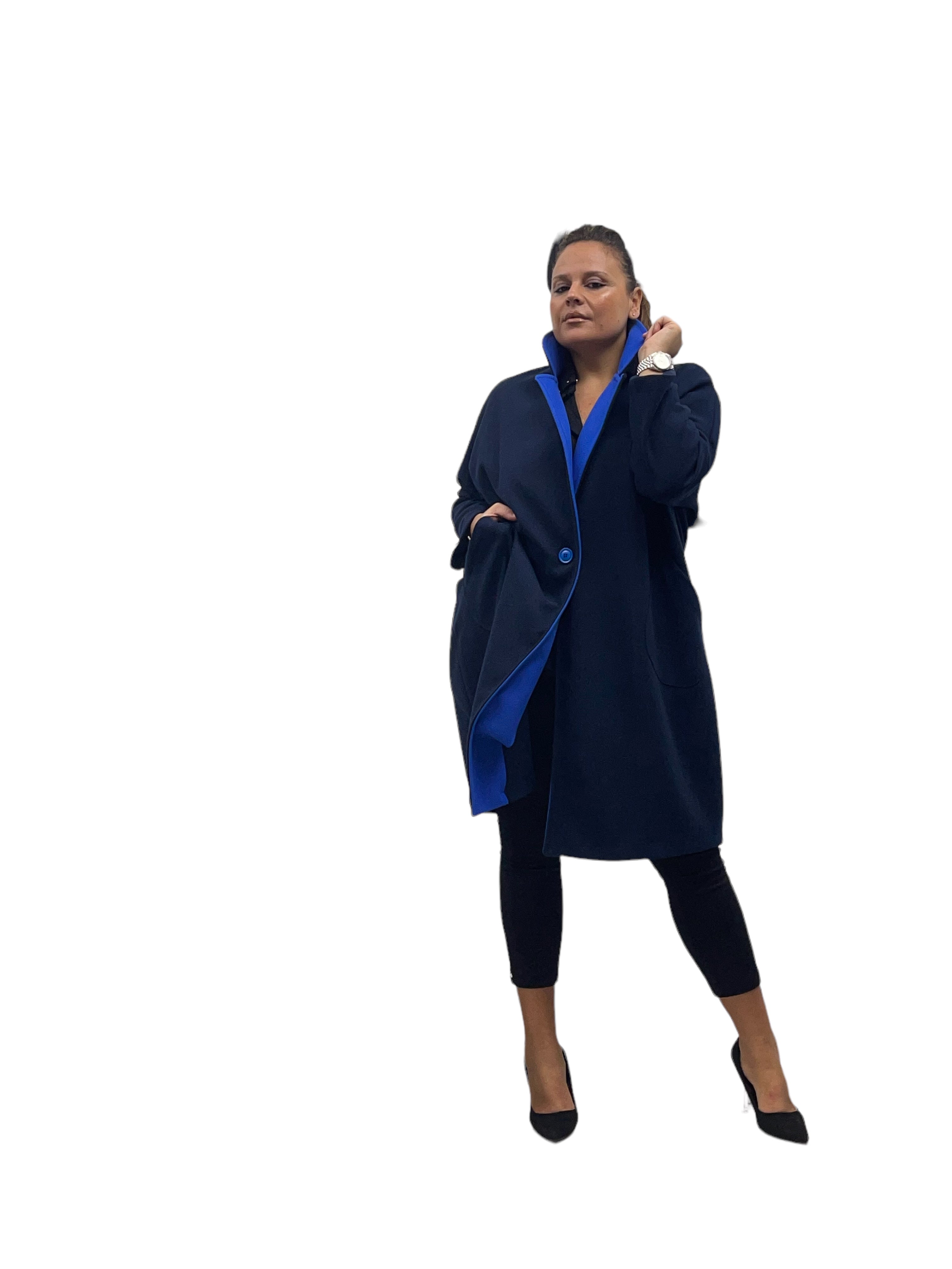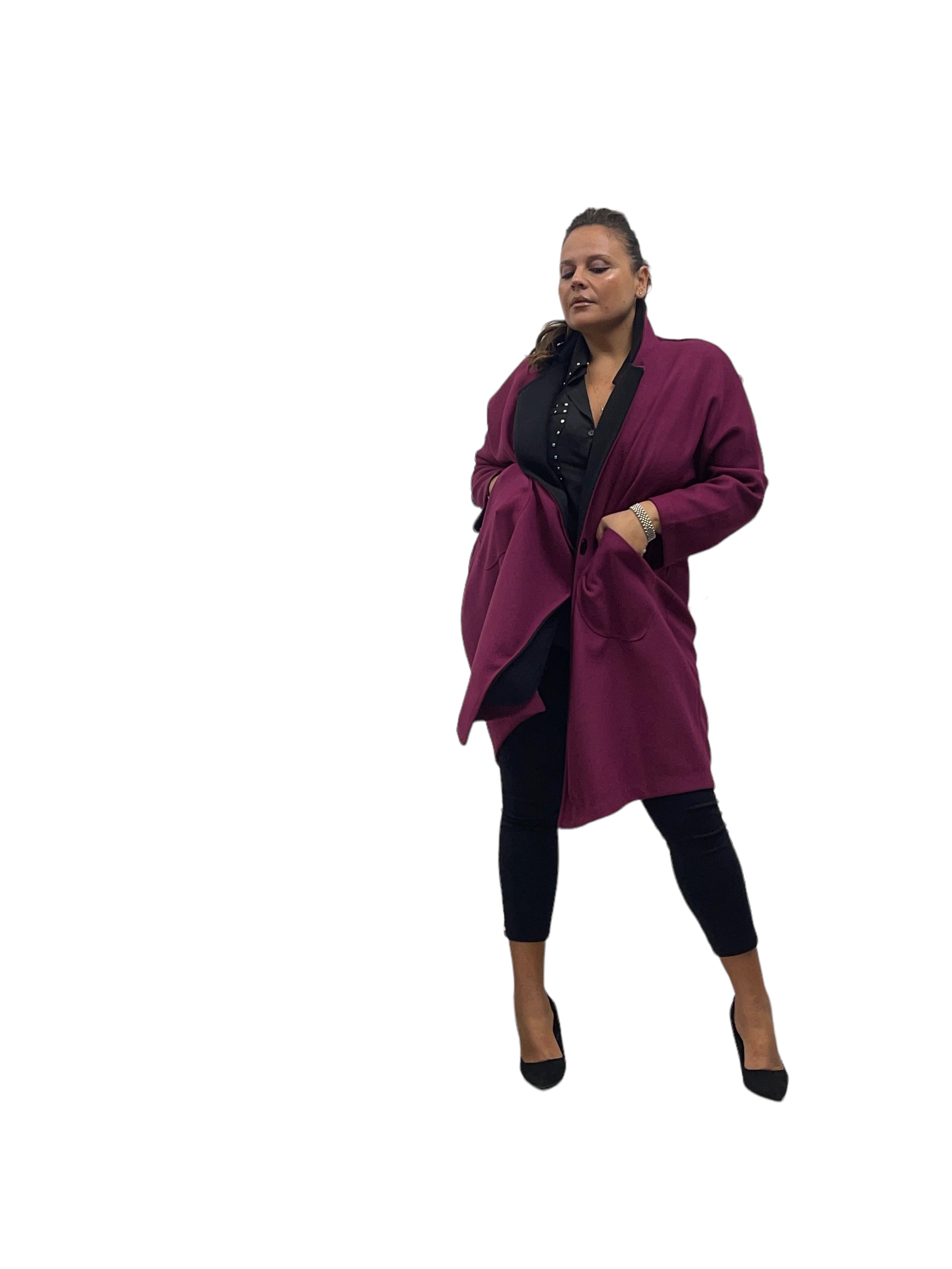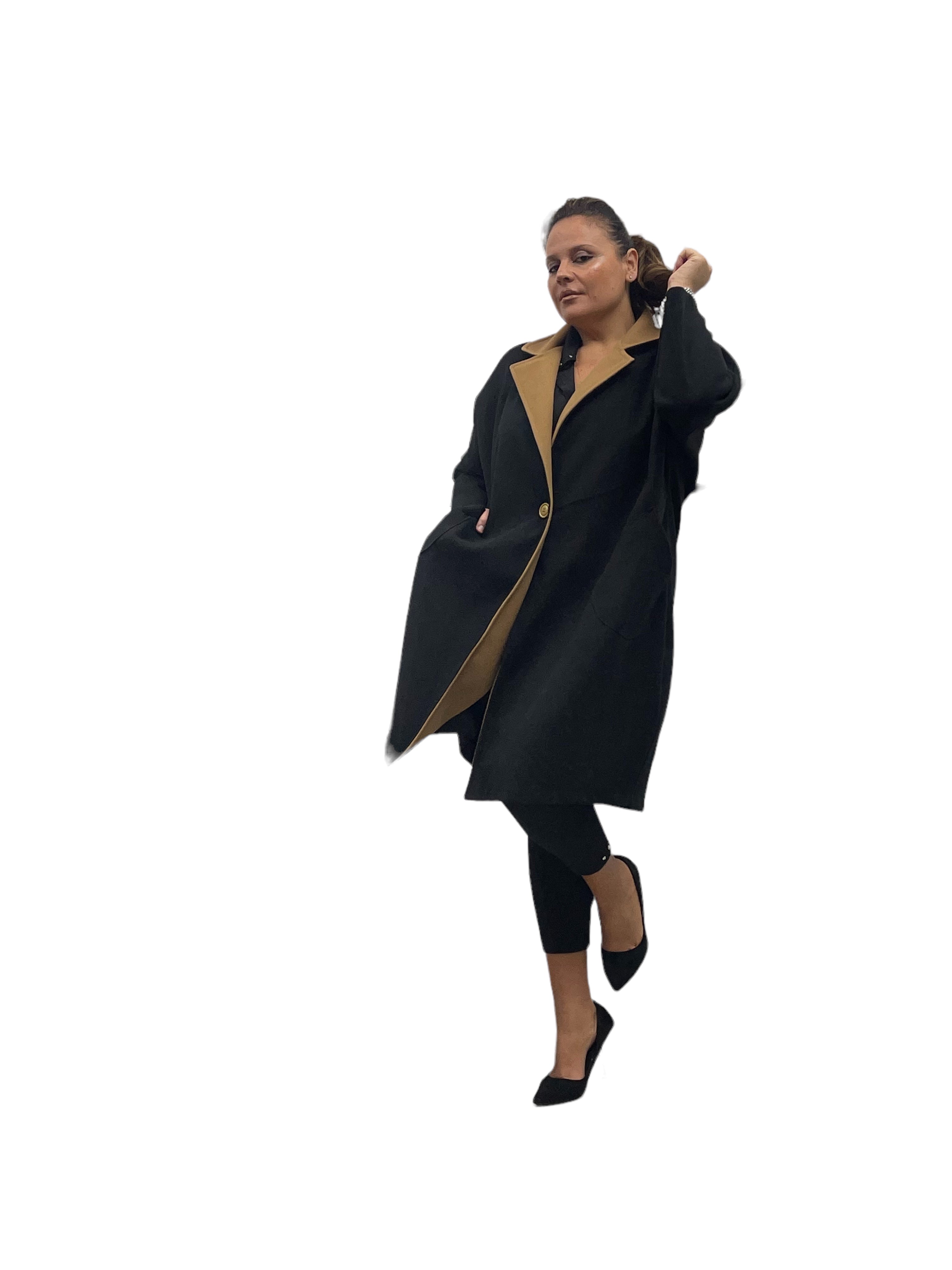 Cappotto over in panno con tasconi, doppio colore e bottone in tinta