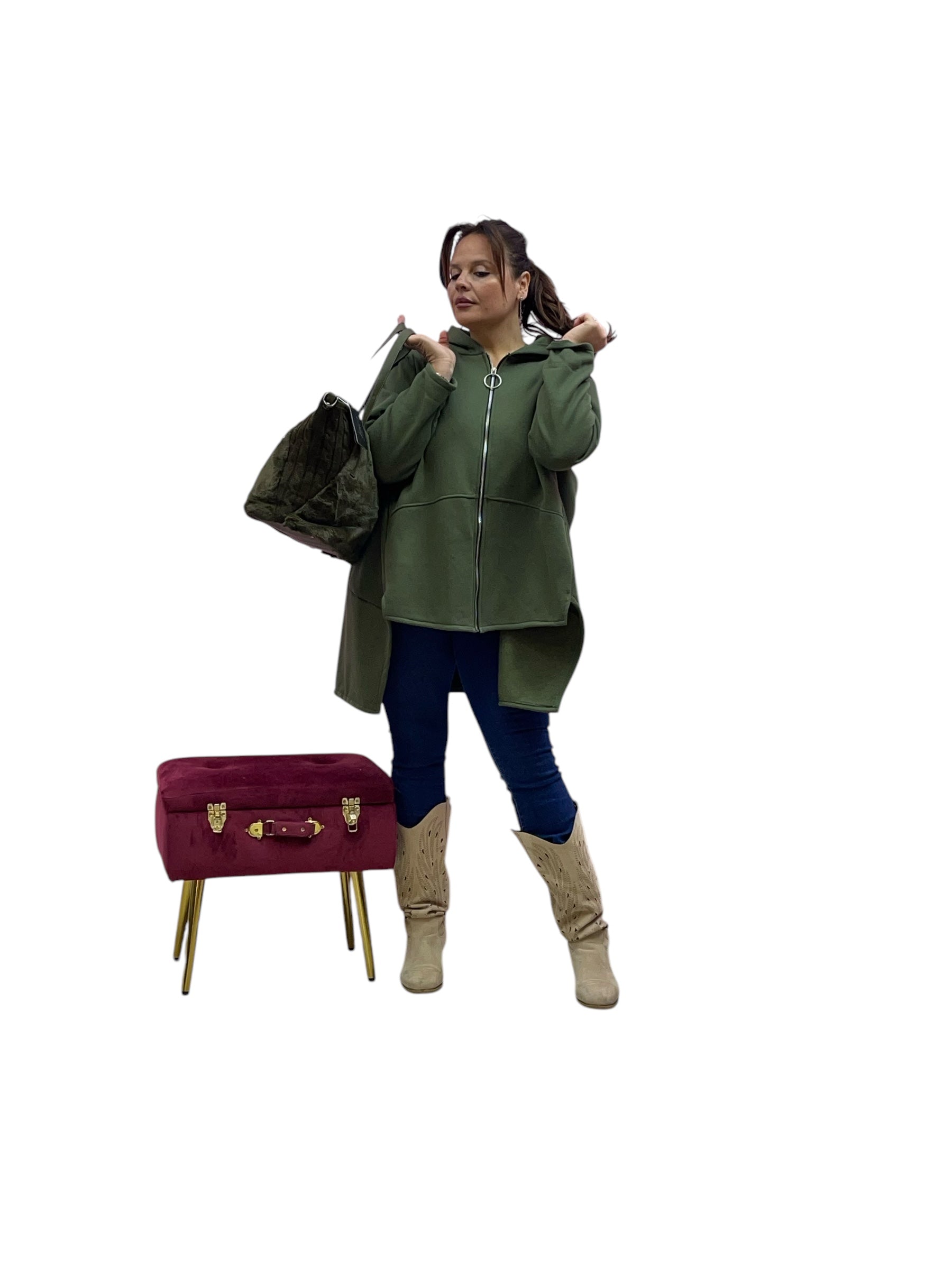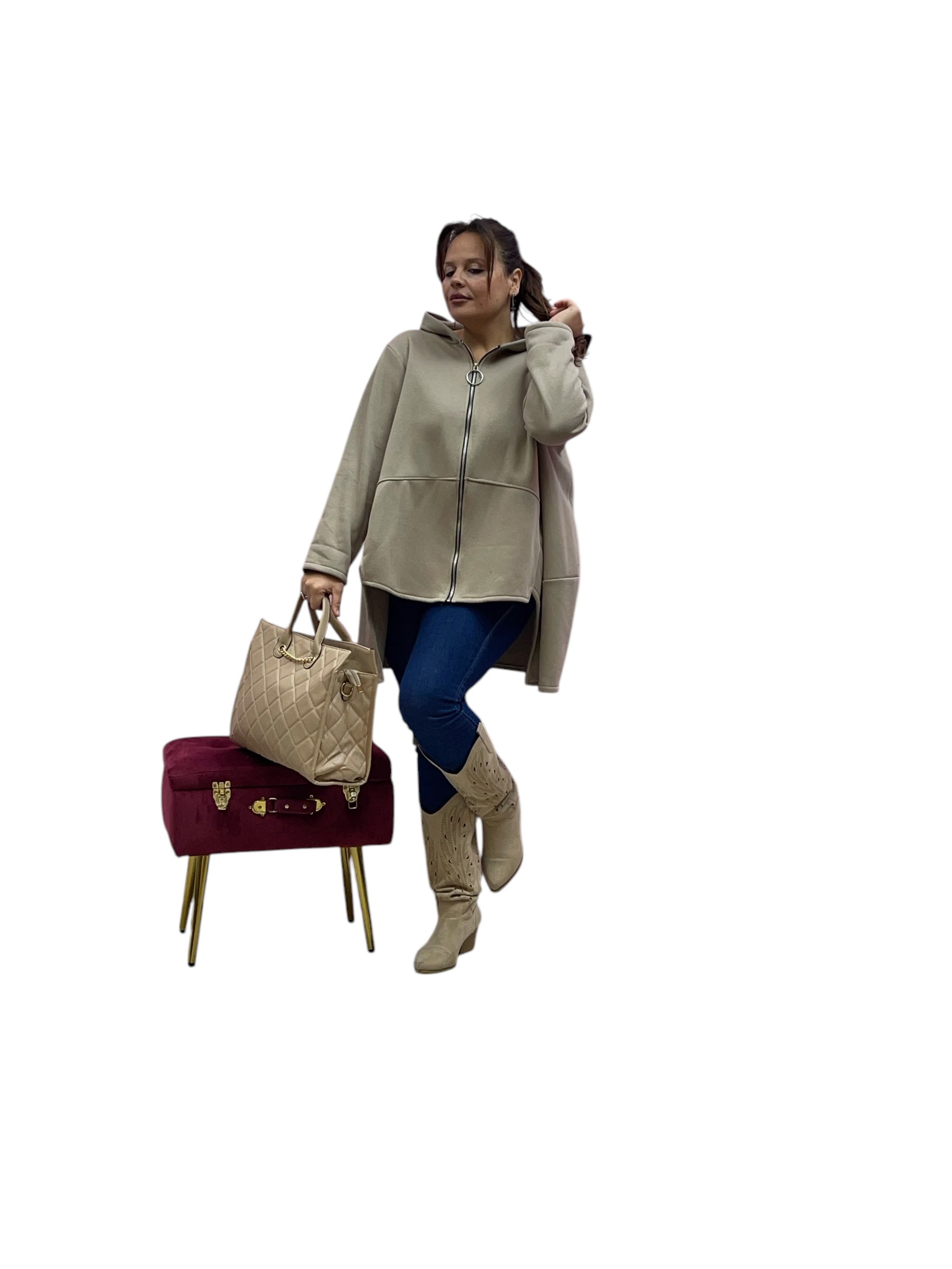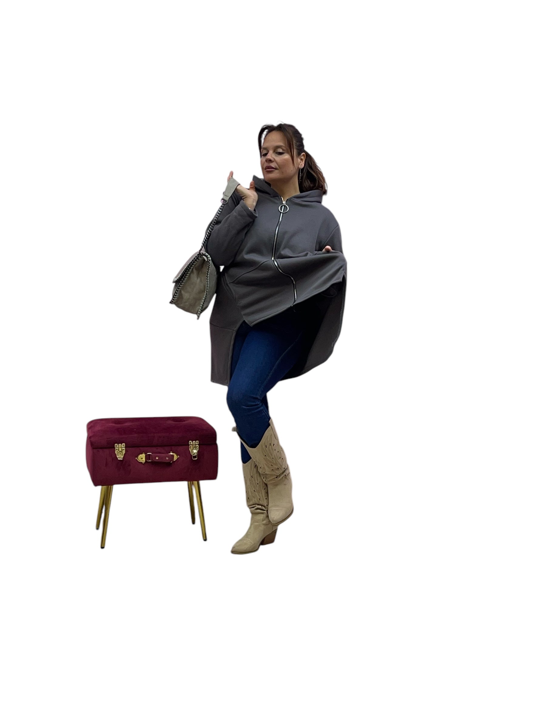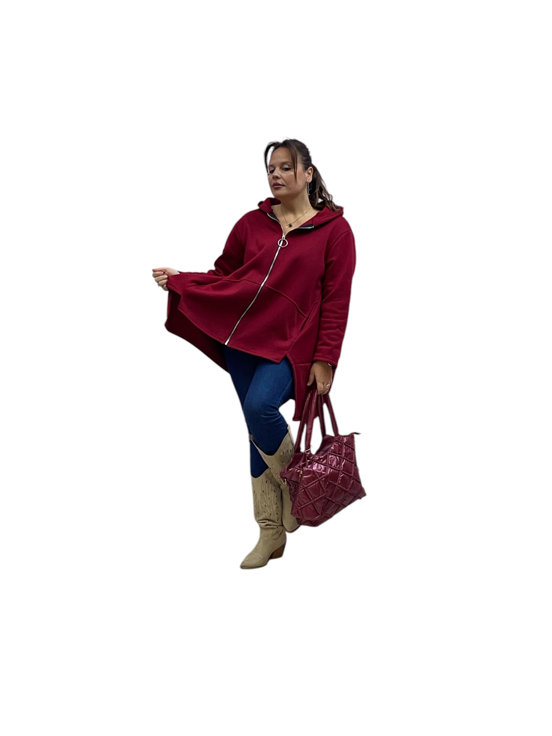 Cardigan in felpa con cappuccio e zip corto avanti e lungo dietrio felpato dentro
