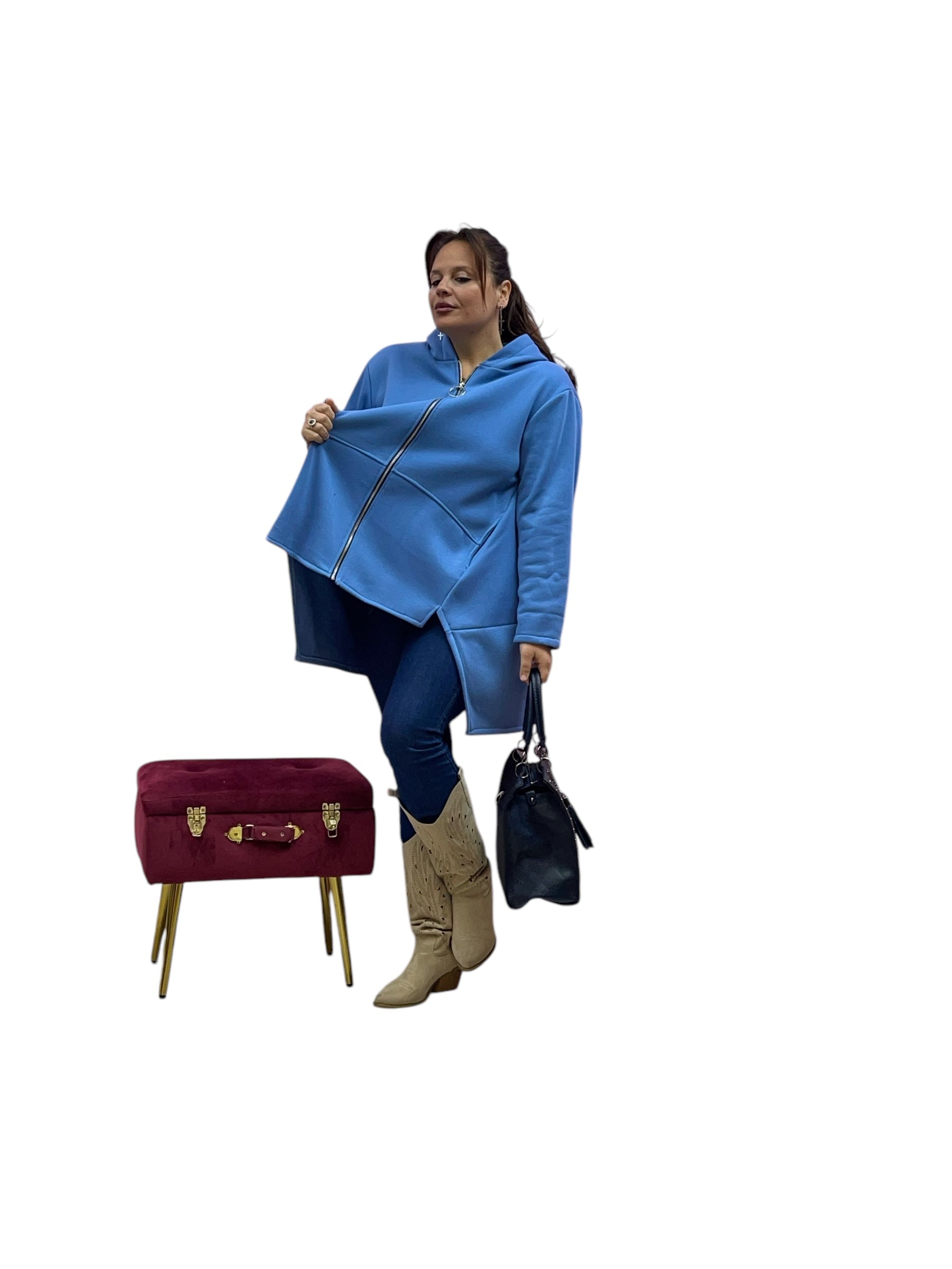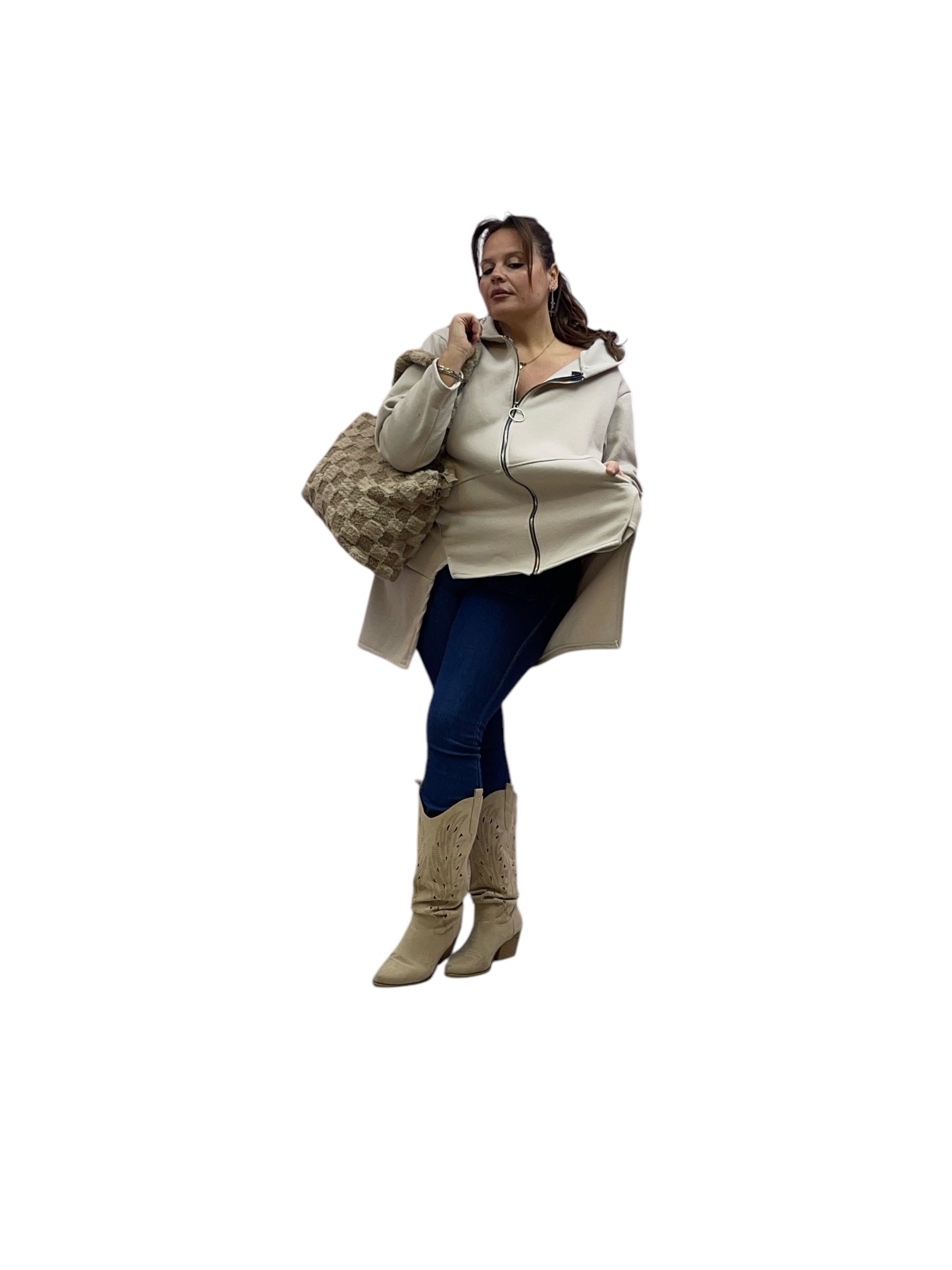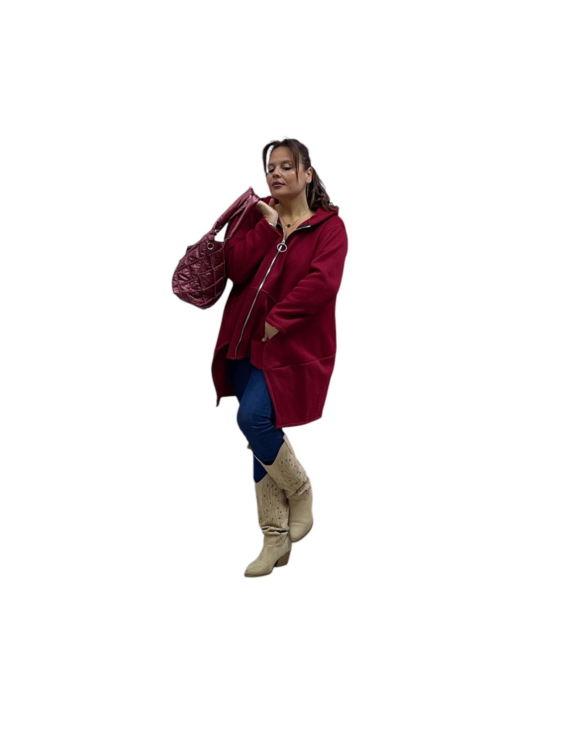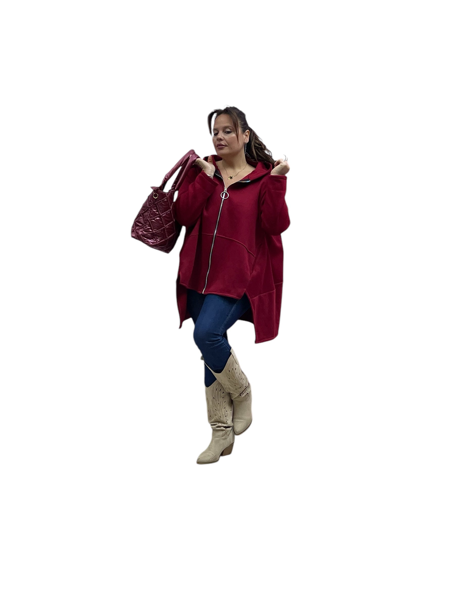Cardigan in felpa con cappuccio e zip corto avanti e lungo dietrio felpato dentro