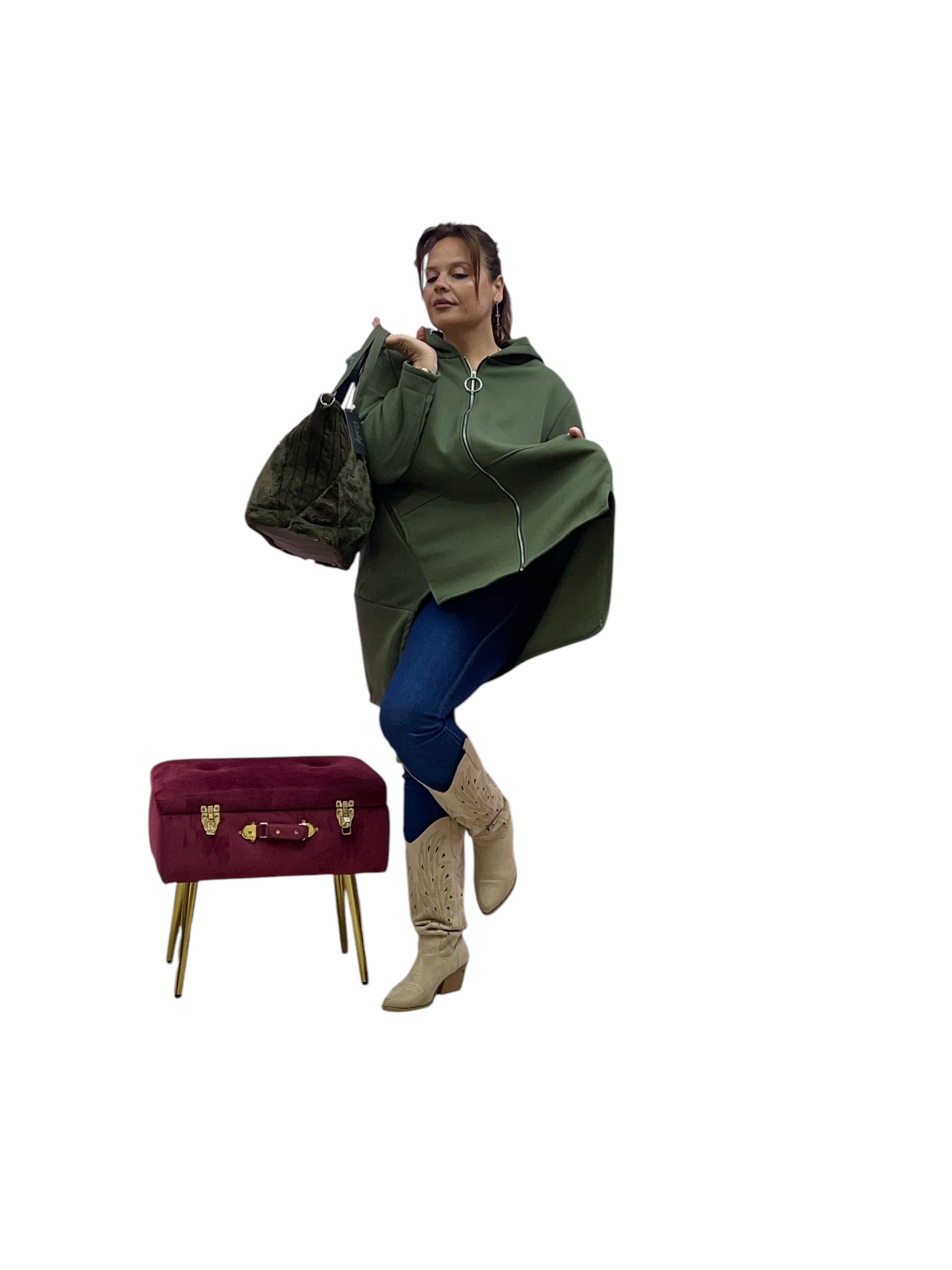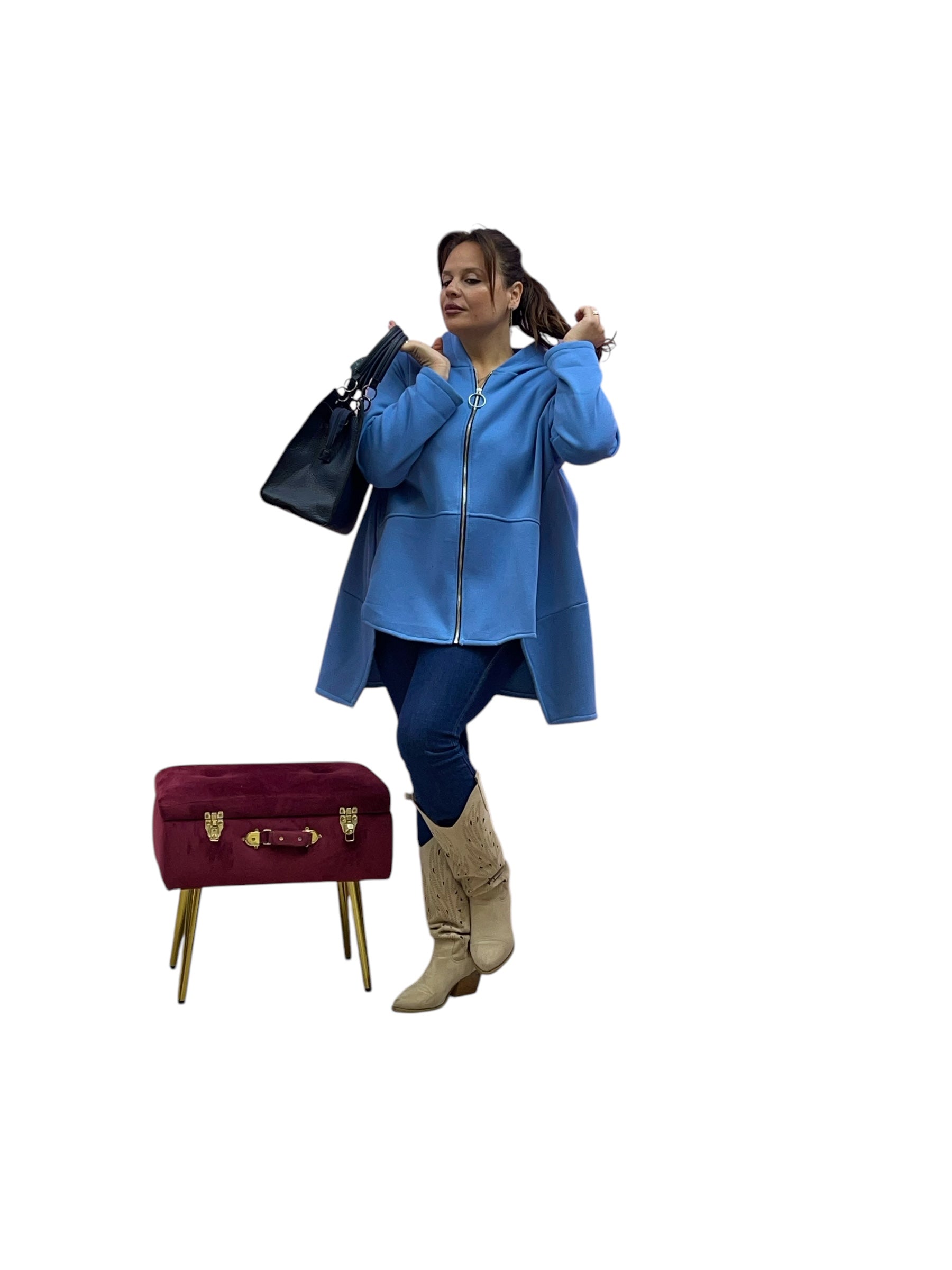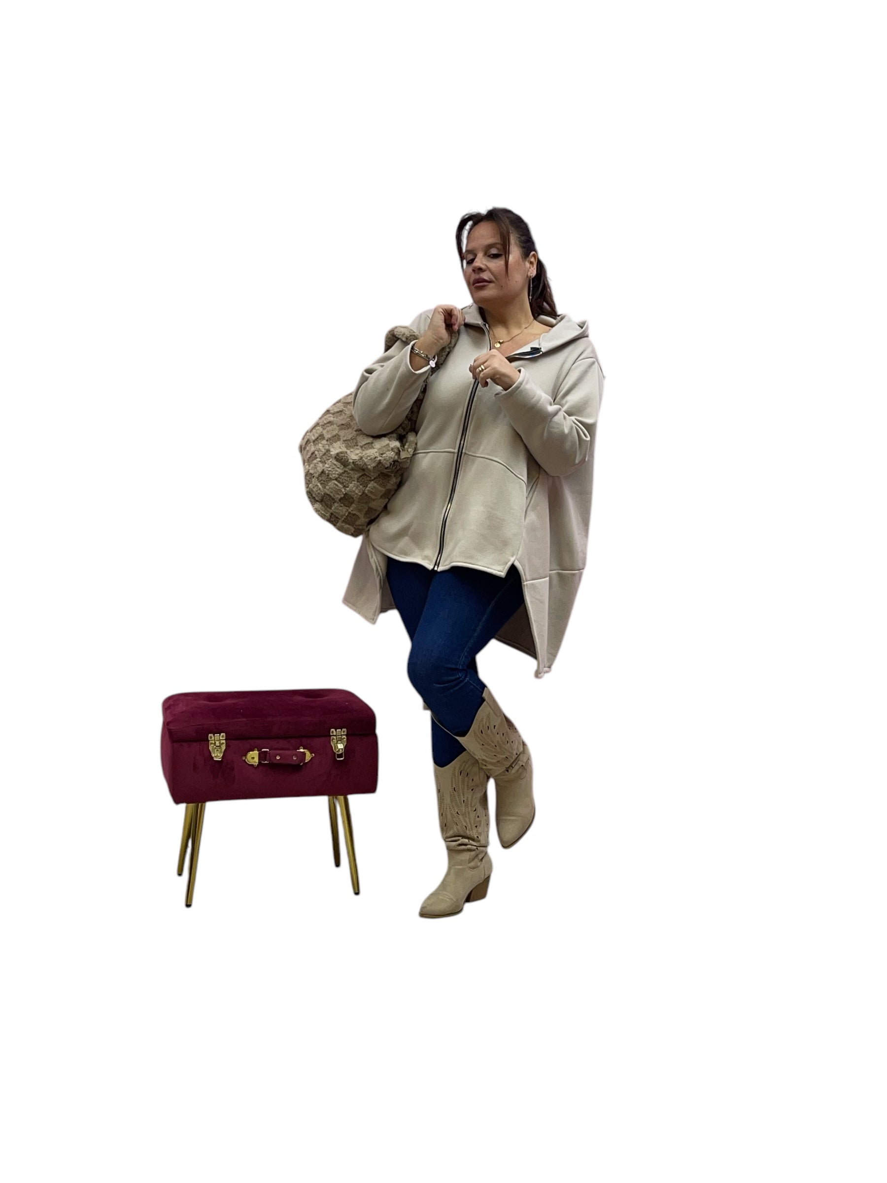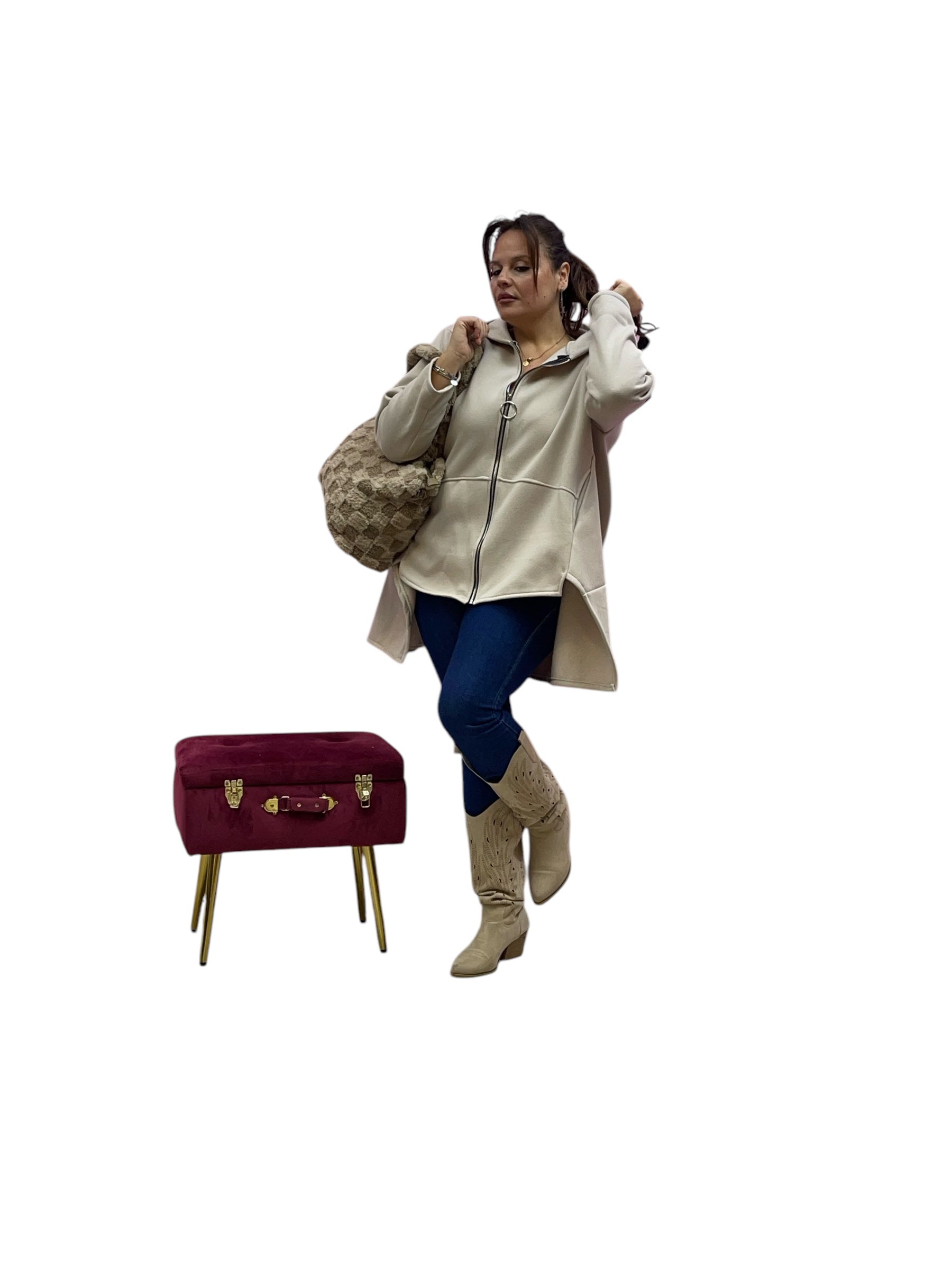 Cardigan in felpa con cappuccio e zip corto avanti e lungo dietrio felpato dentro