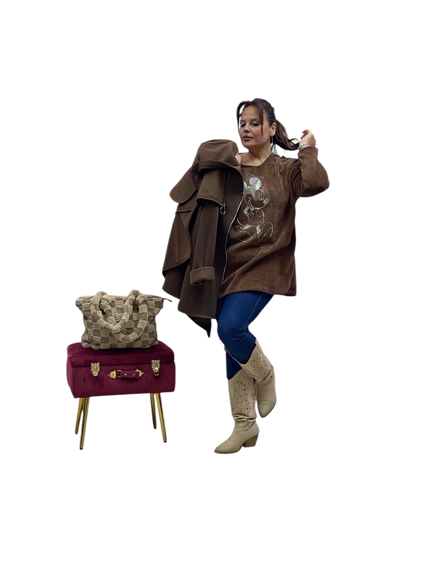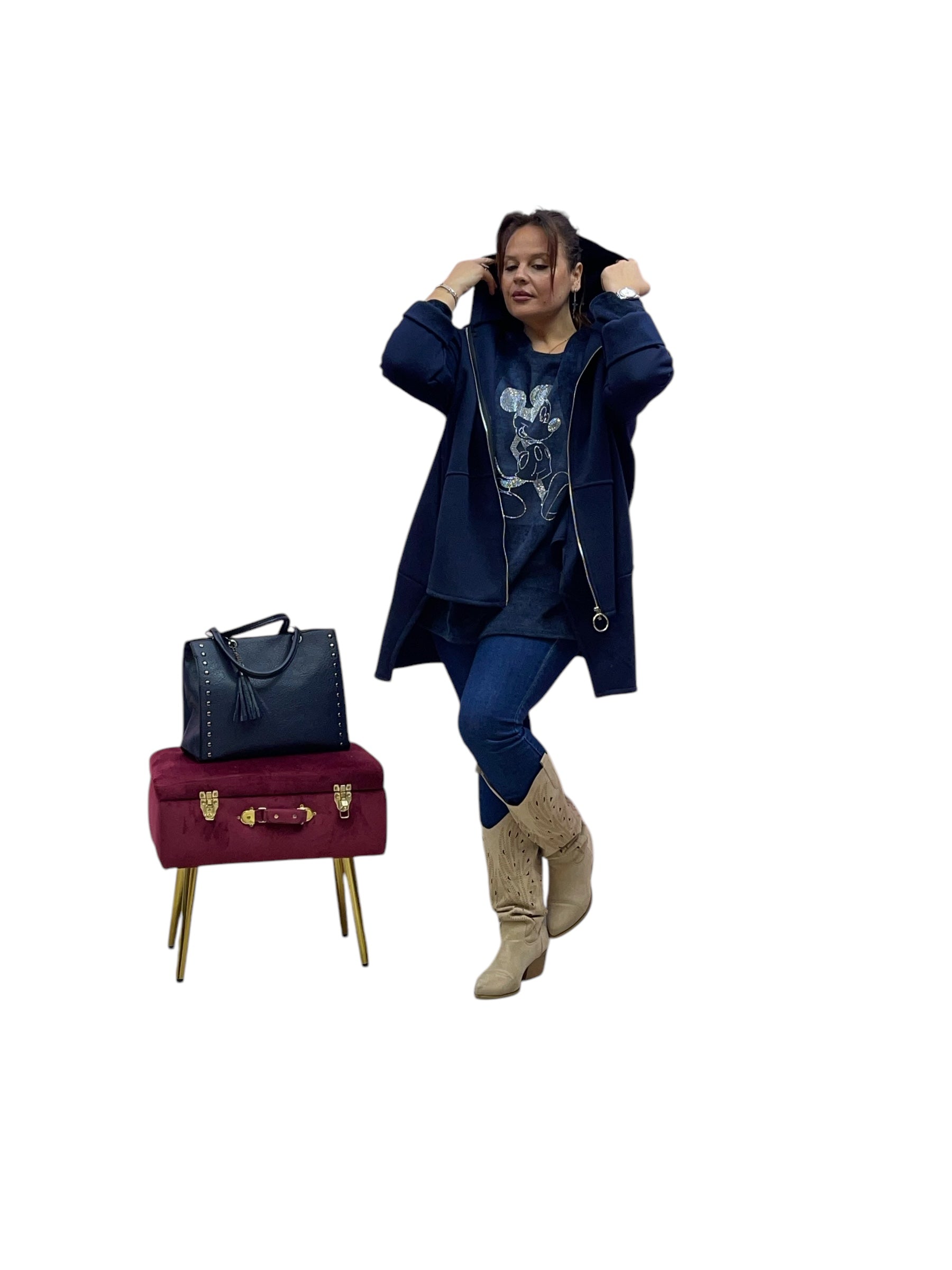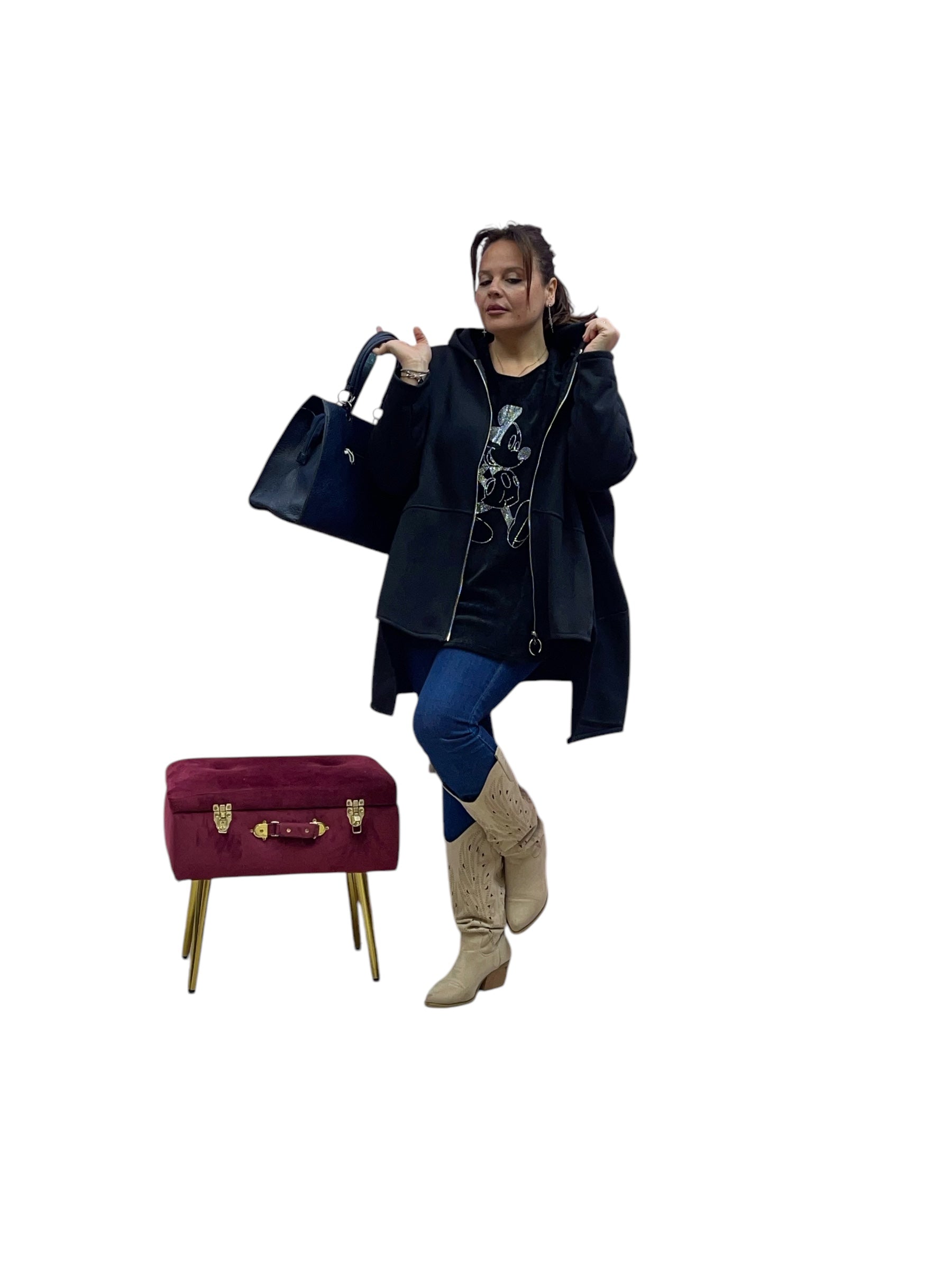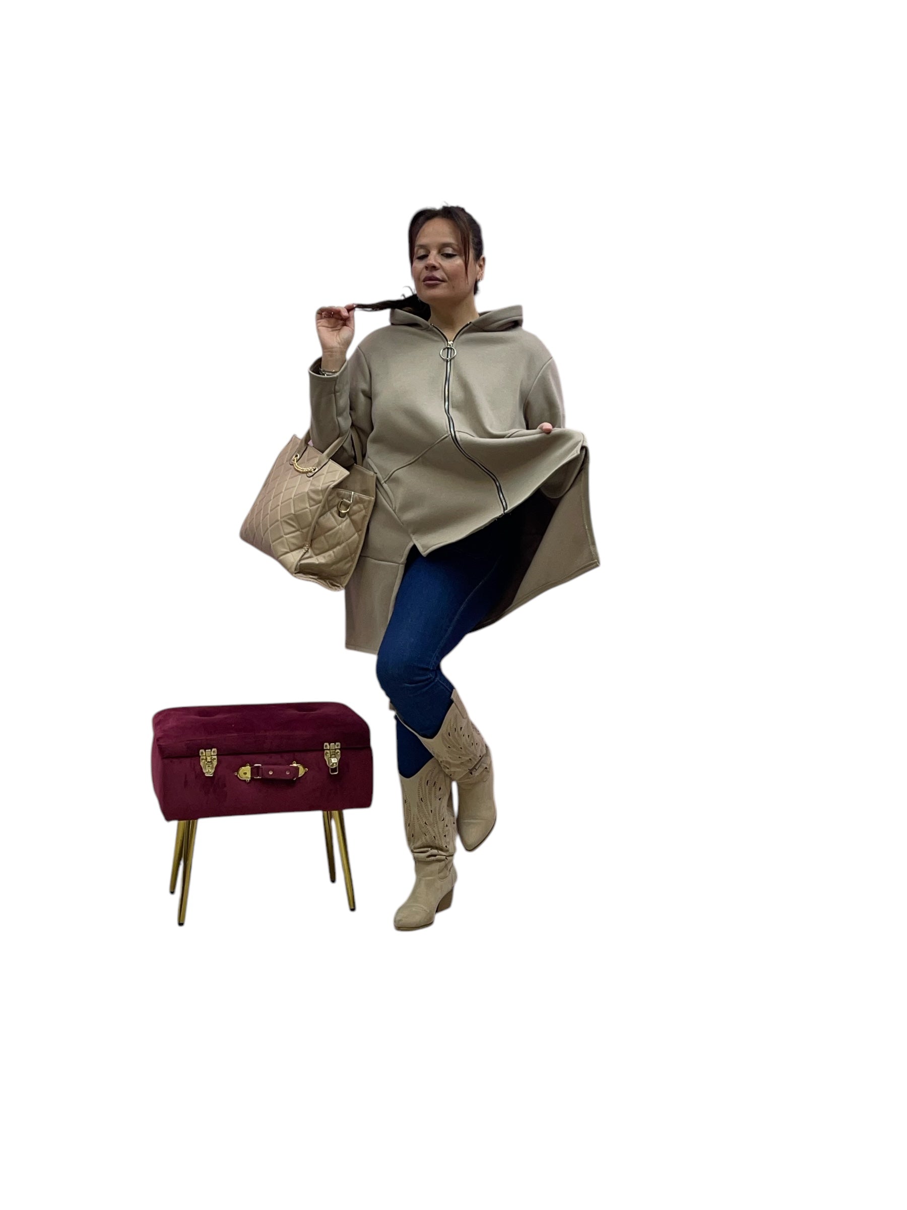 Cardigan in felpa con cappuccio e zip corto avanti e lungo dietrio felpato dentro