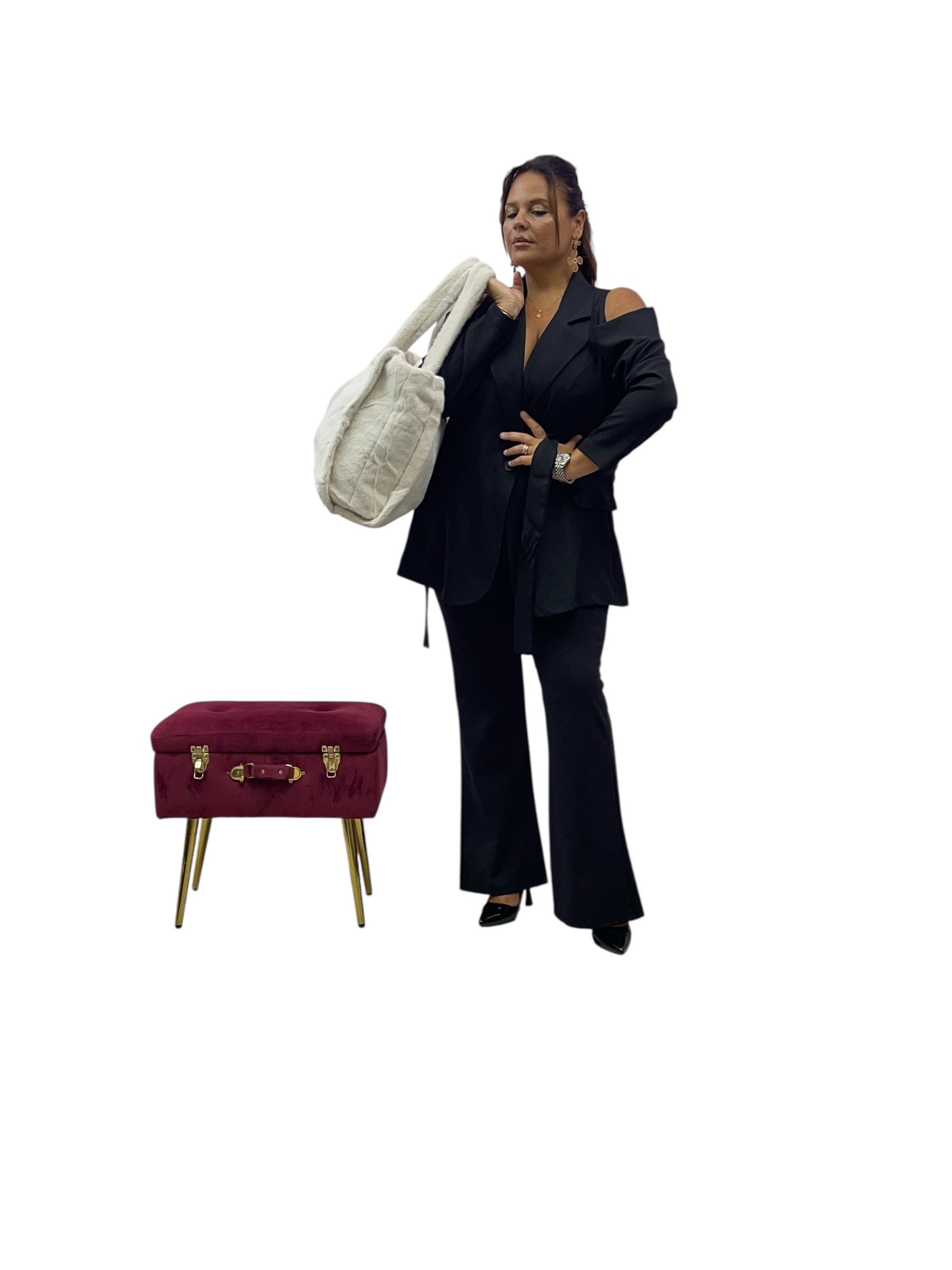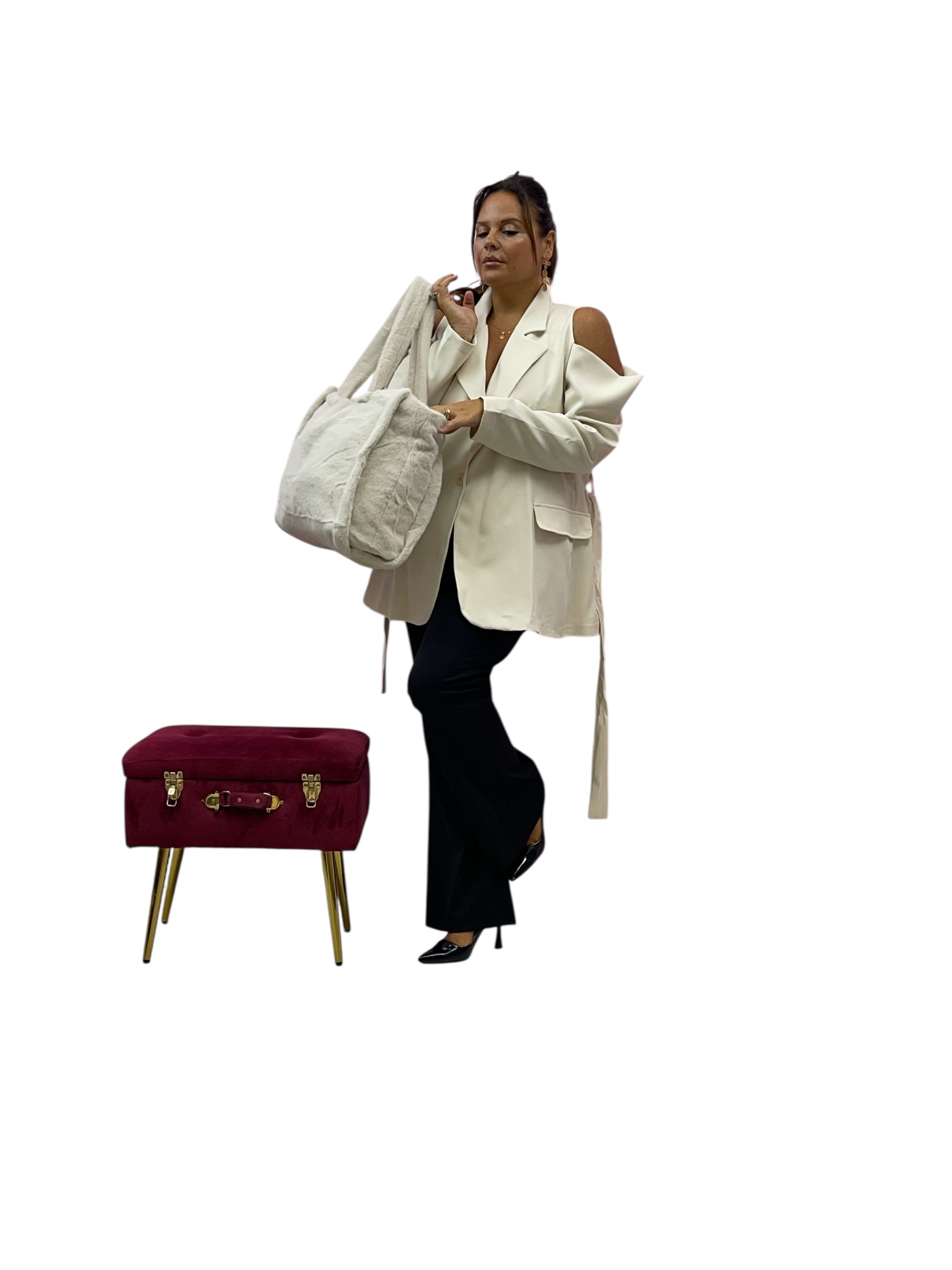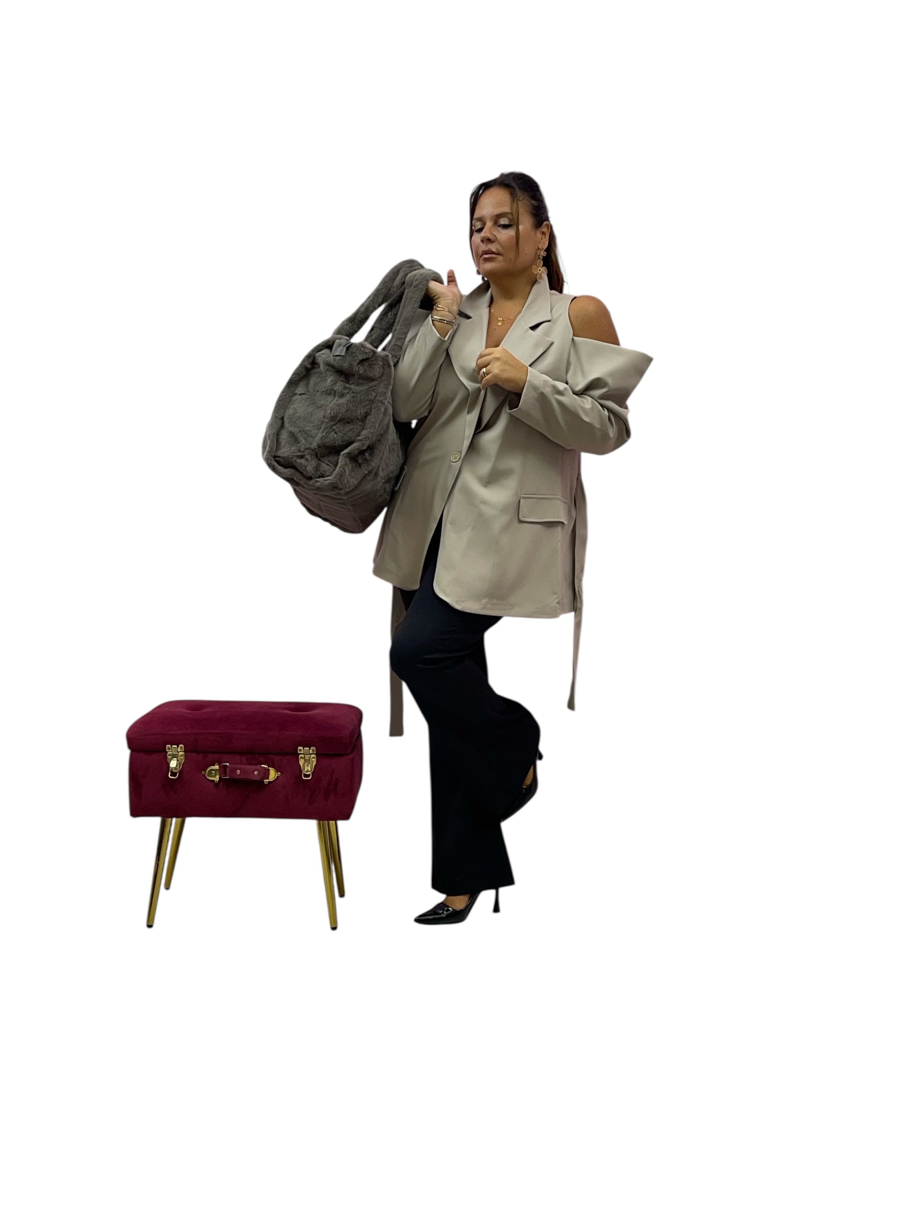 Giacca over foderata con bottone ,cintura ,aperta alle spalle con effeto sbuffo