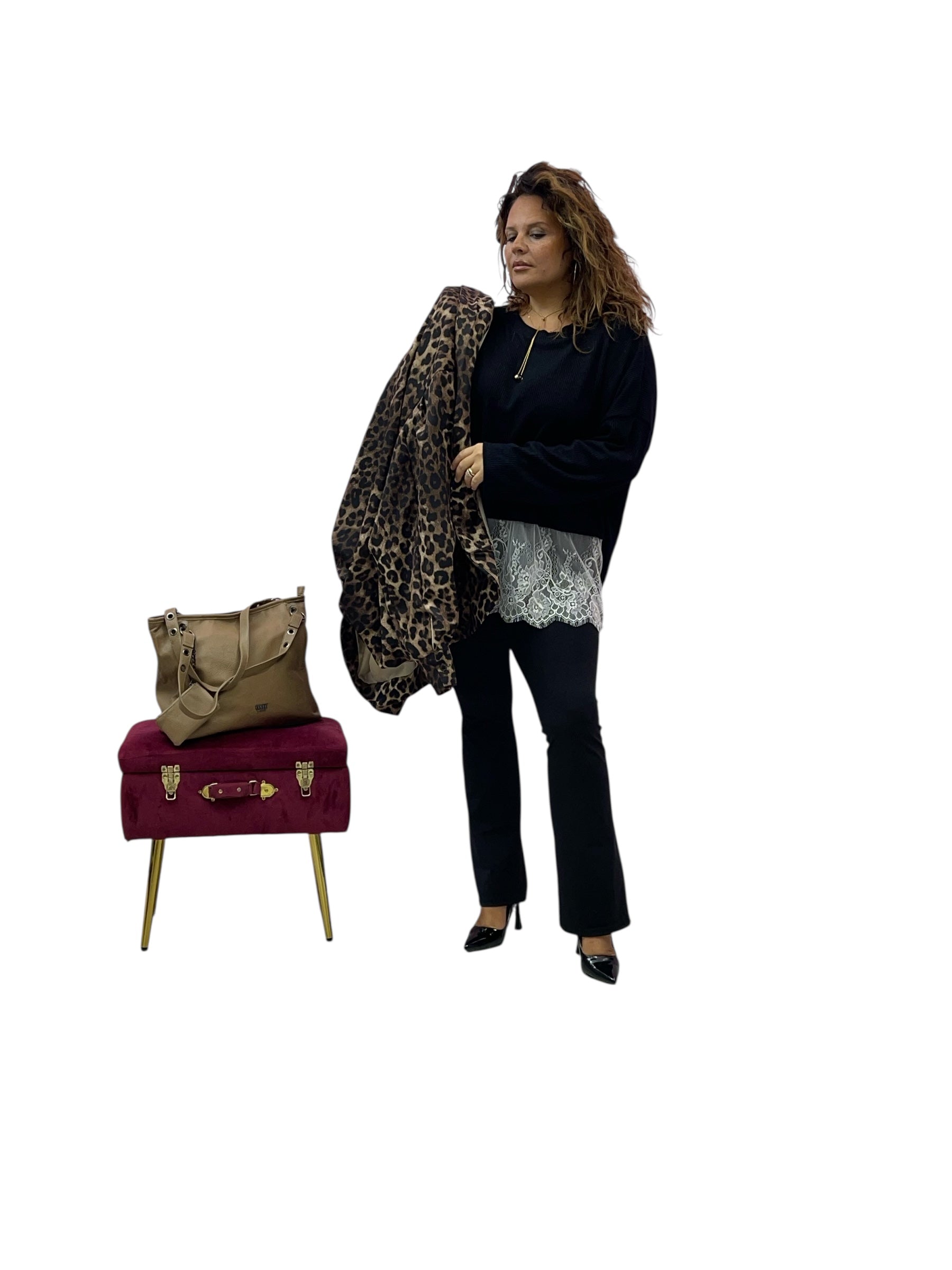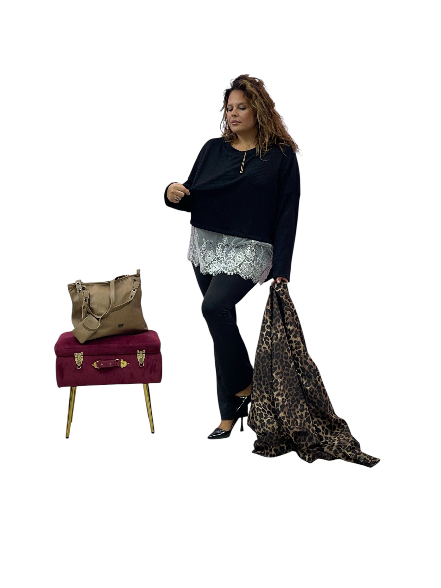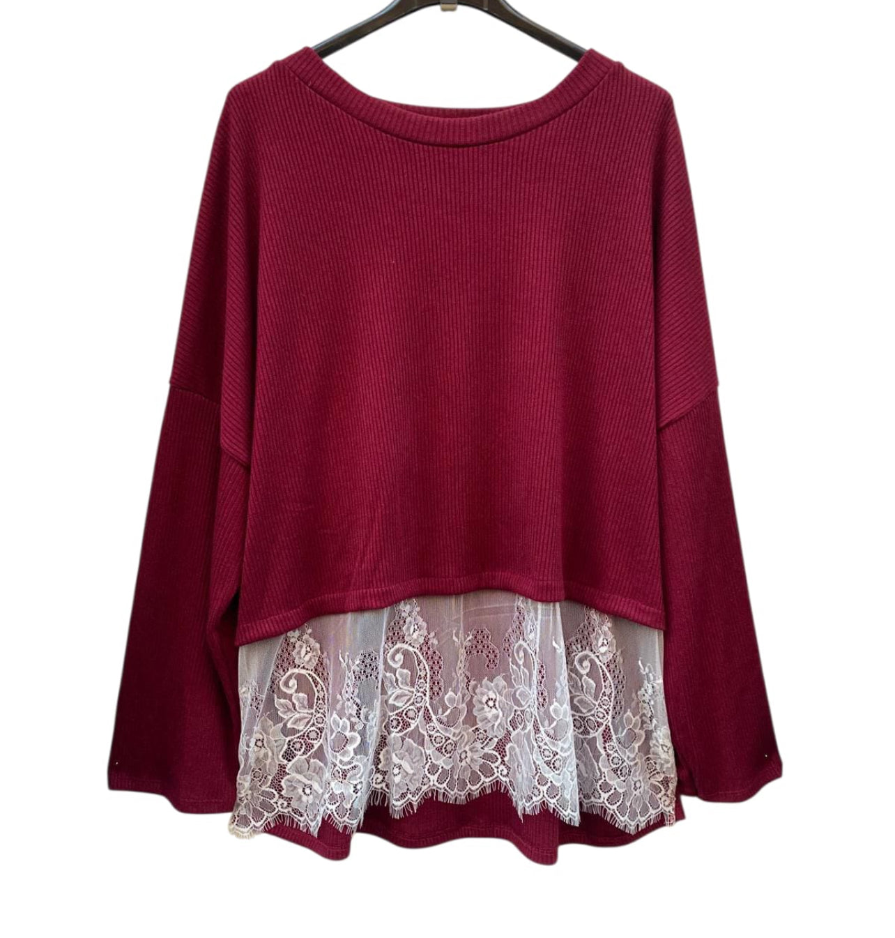 Maglia over effetto a costine con filo laminato e fascia in pizzo trasparente avanti