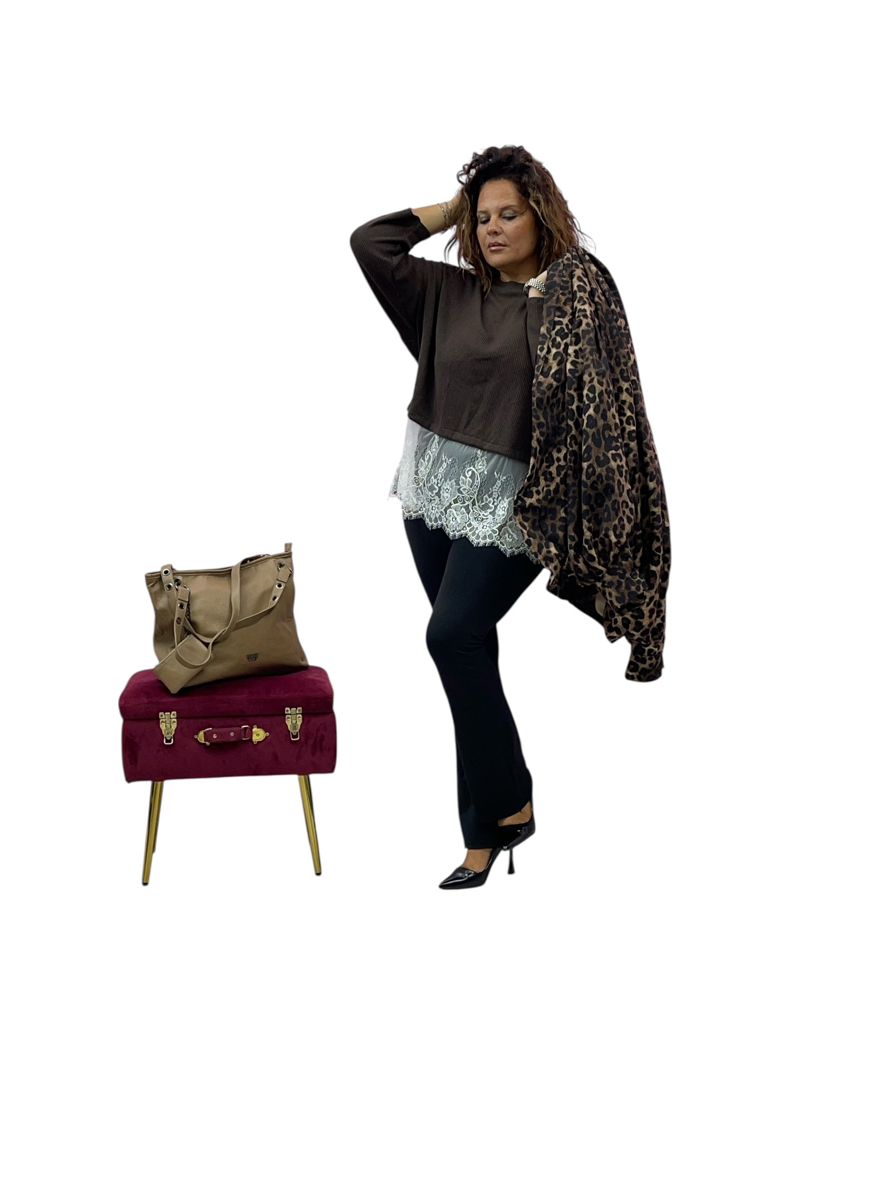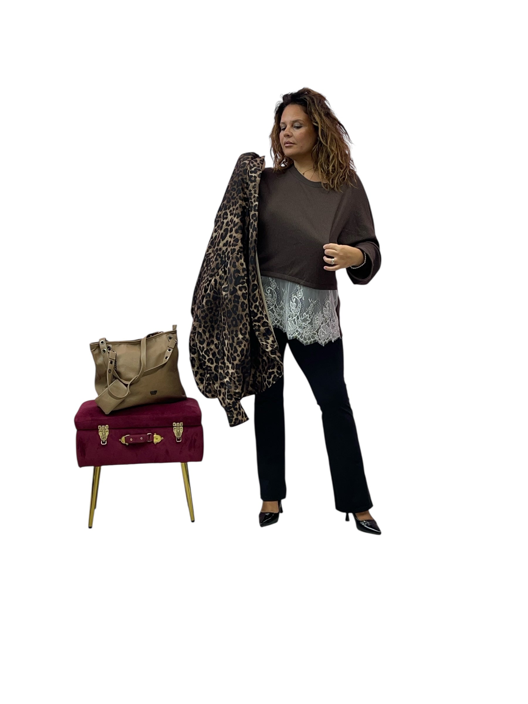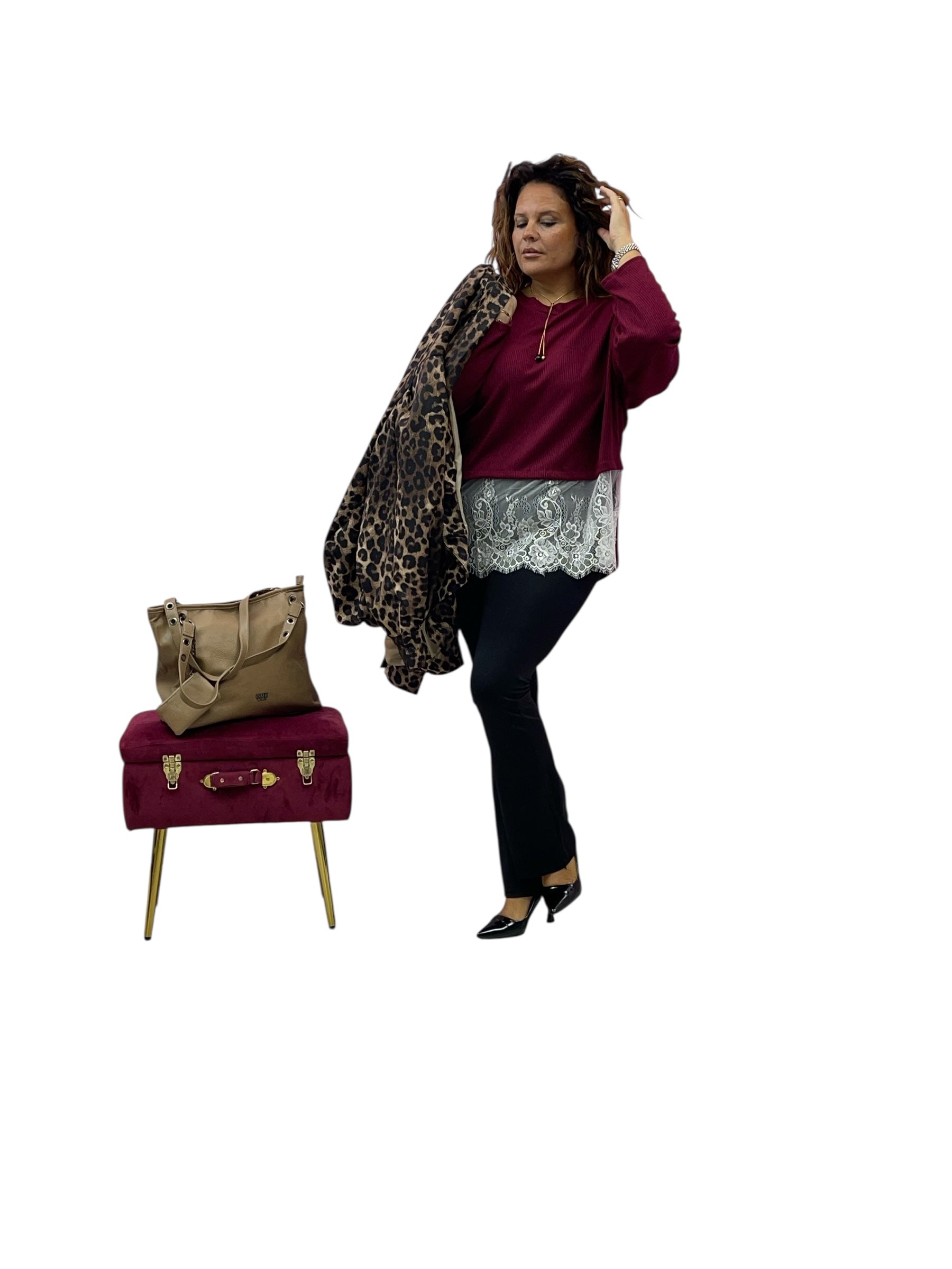 Maglia over effetto a costine con filo laminato e fascia in pizzo trasparente avanti