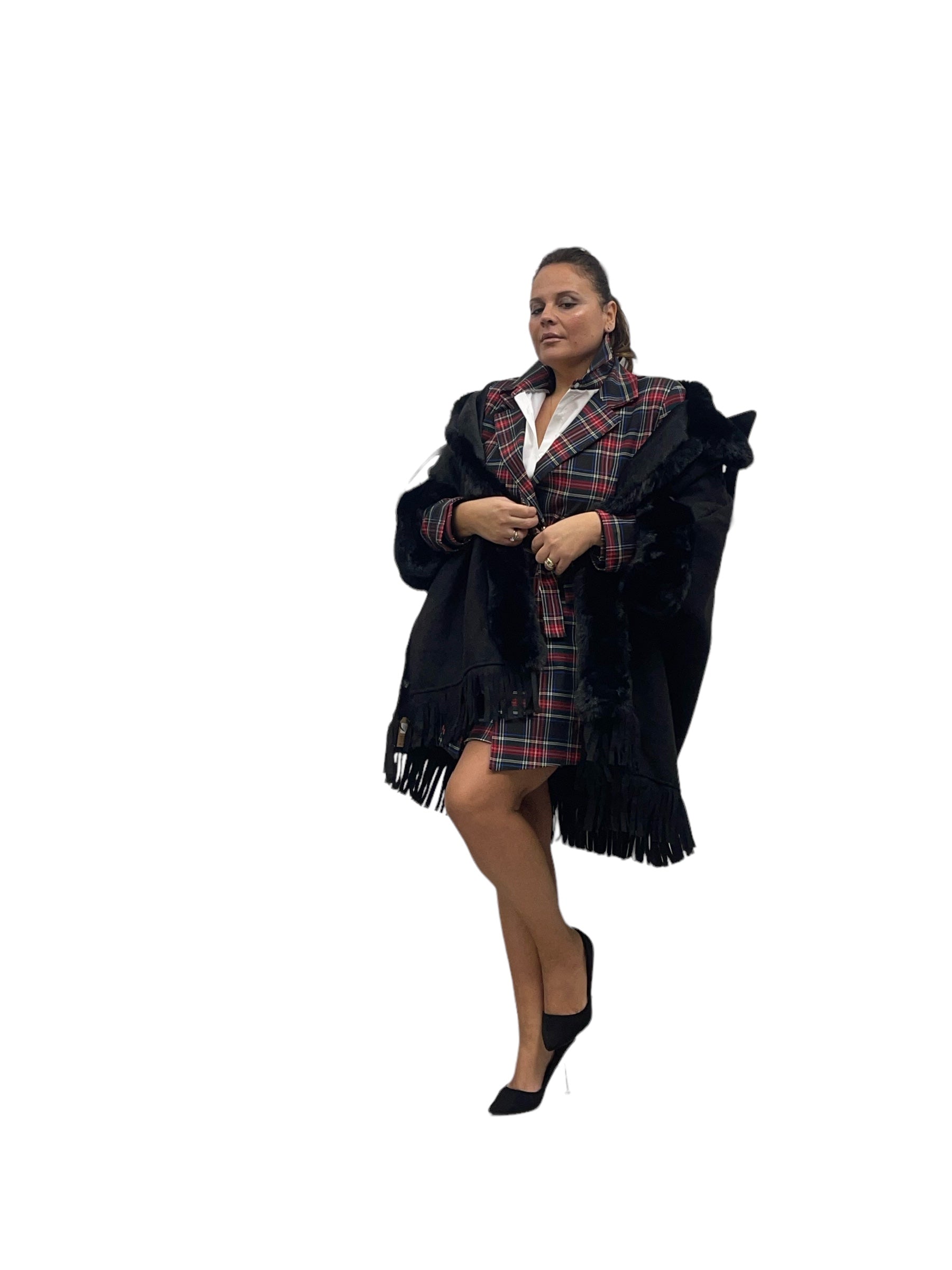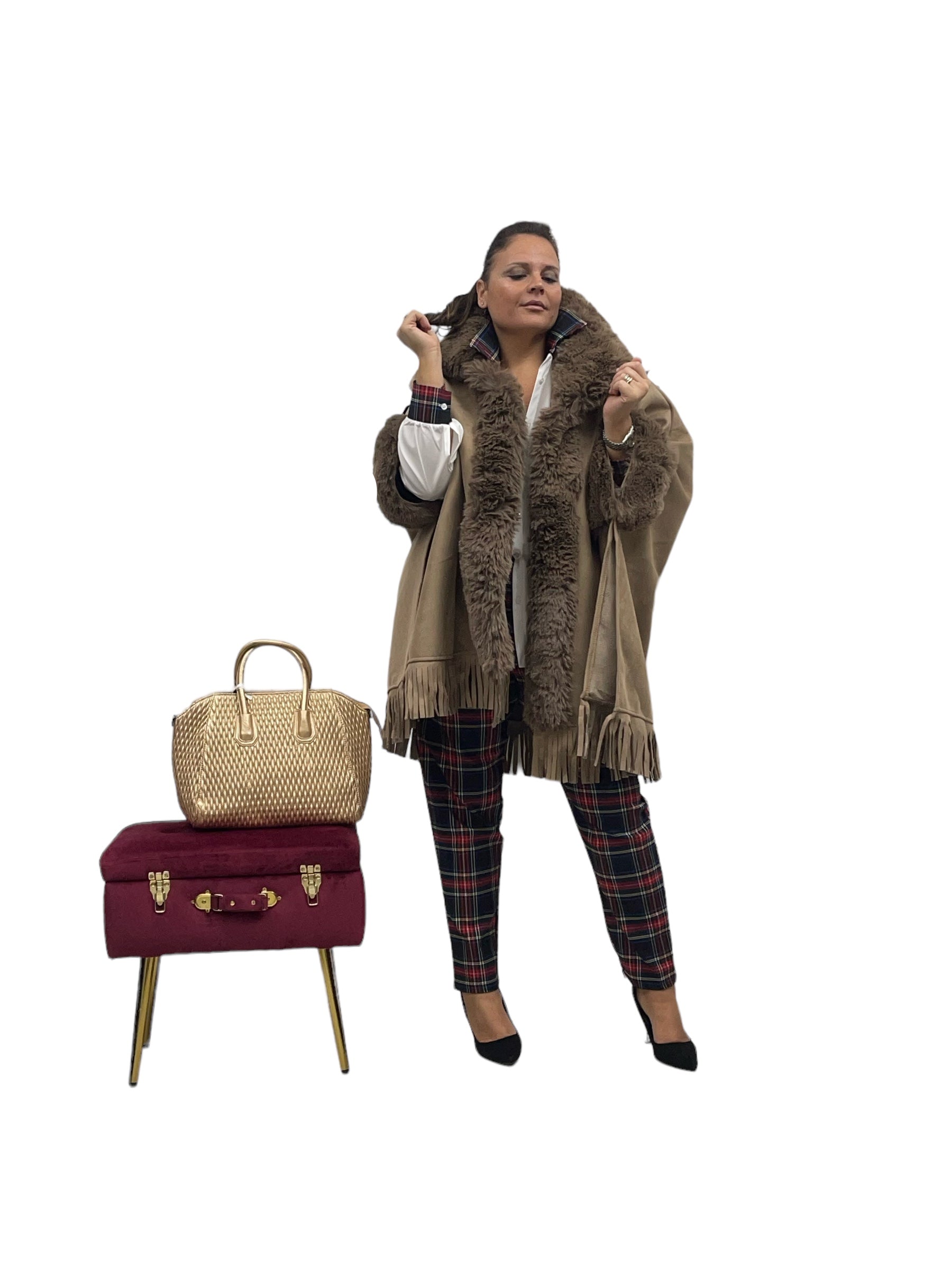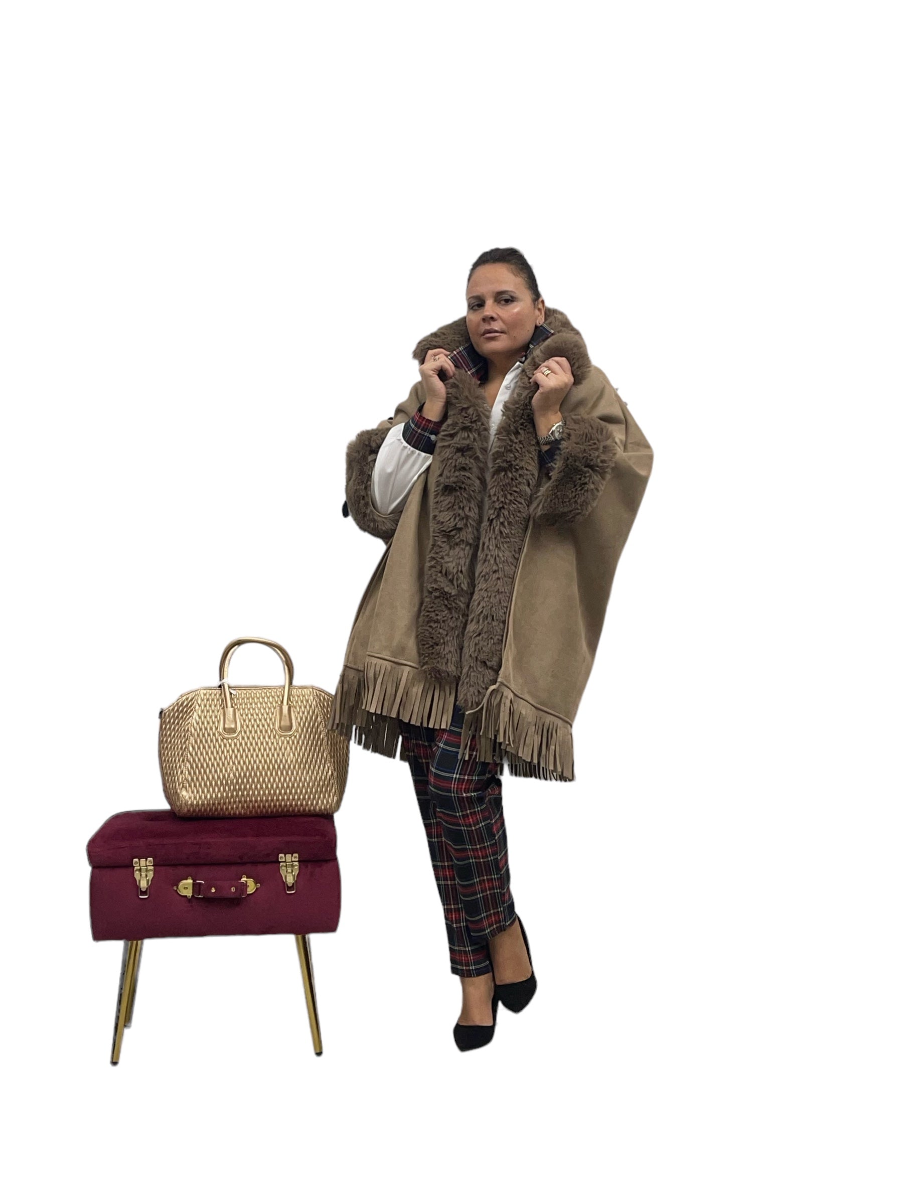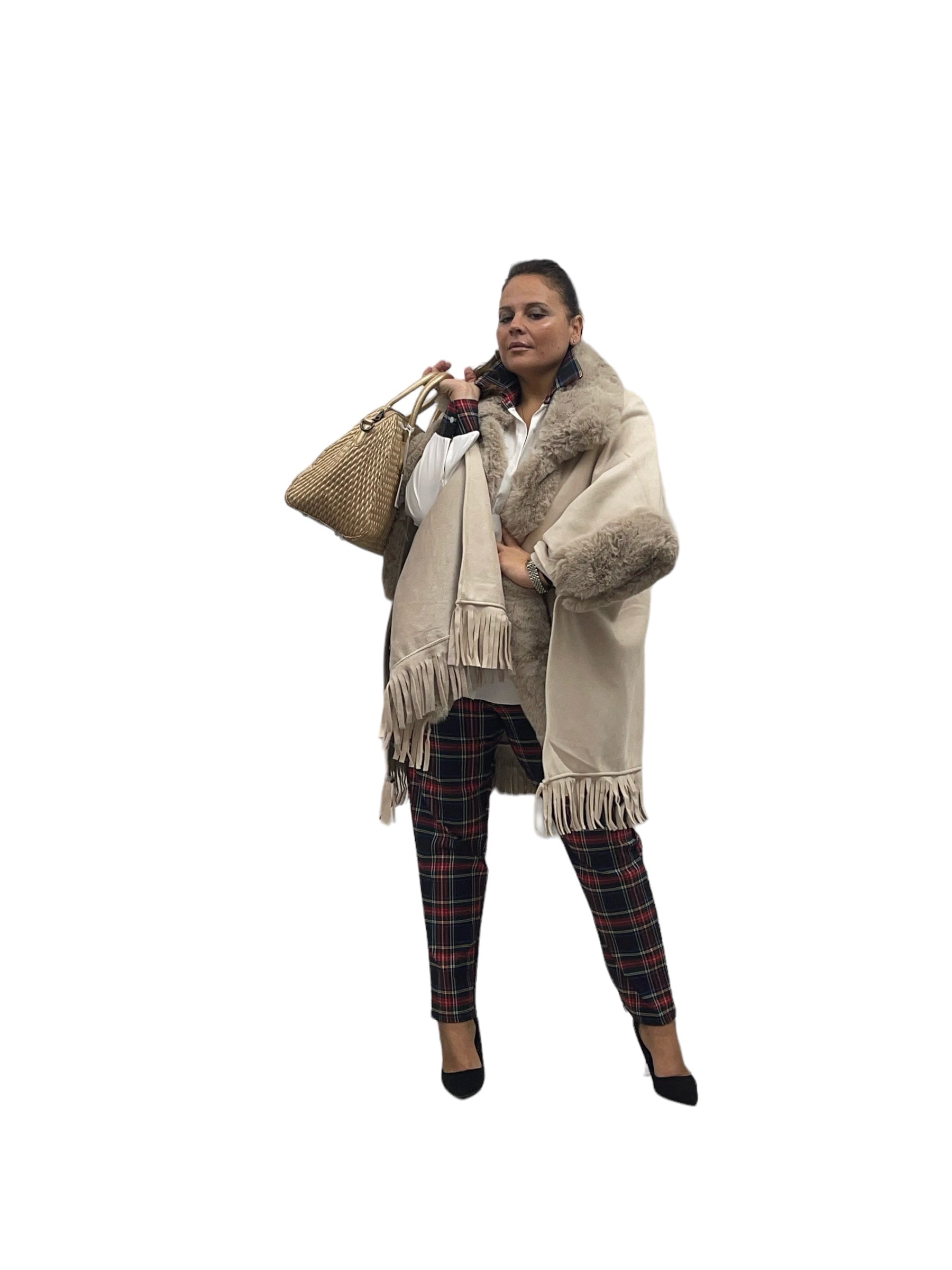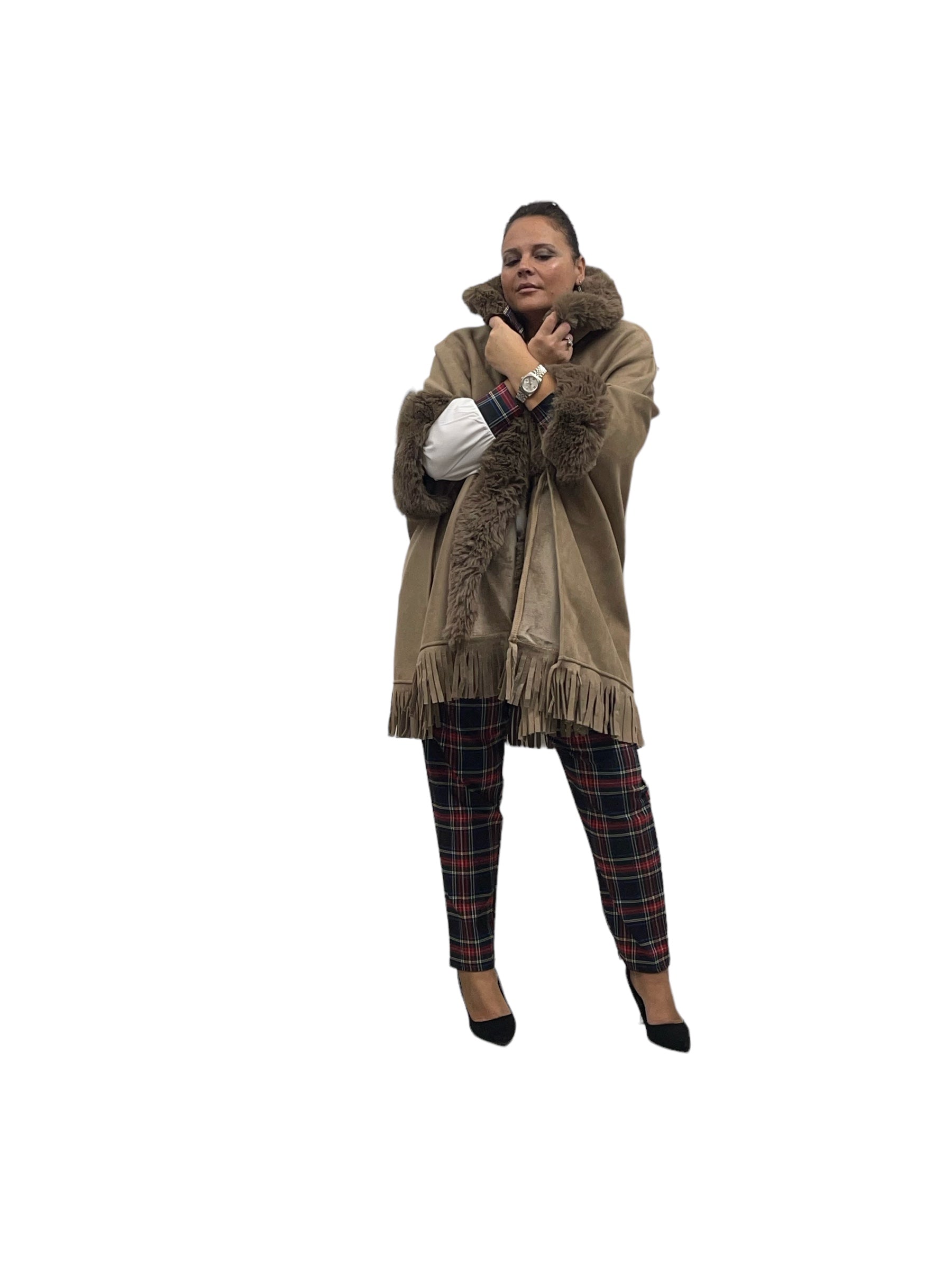 Mantella over in ecodaino con ecopelliccia frange e felpata internamente con cashmere