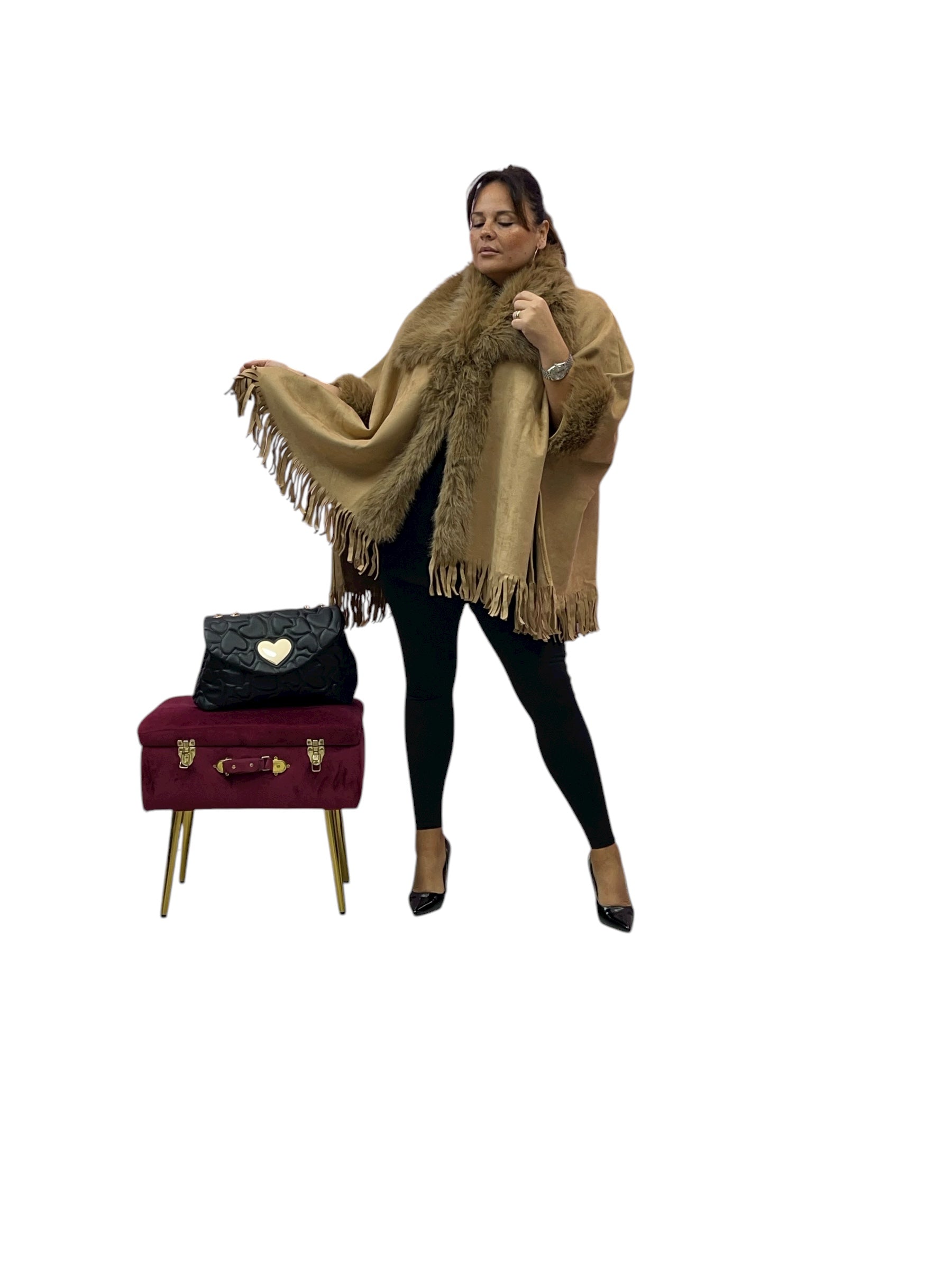 Mantella over in ecodaino con frange internamente felpato ed ecopelliccia