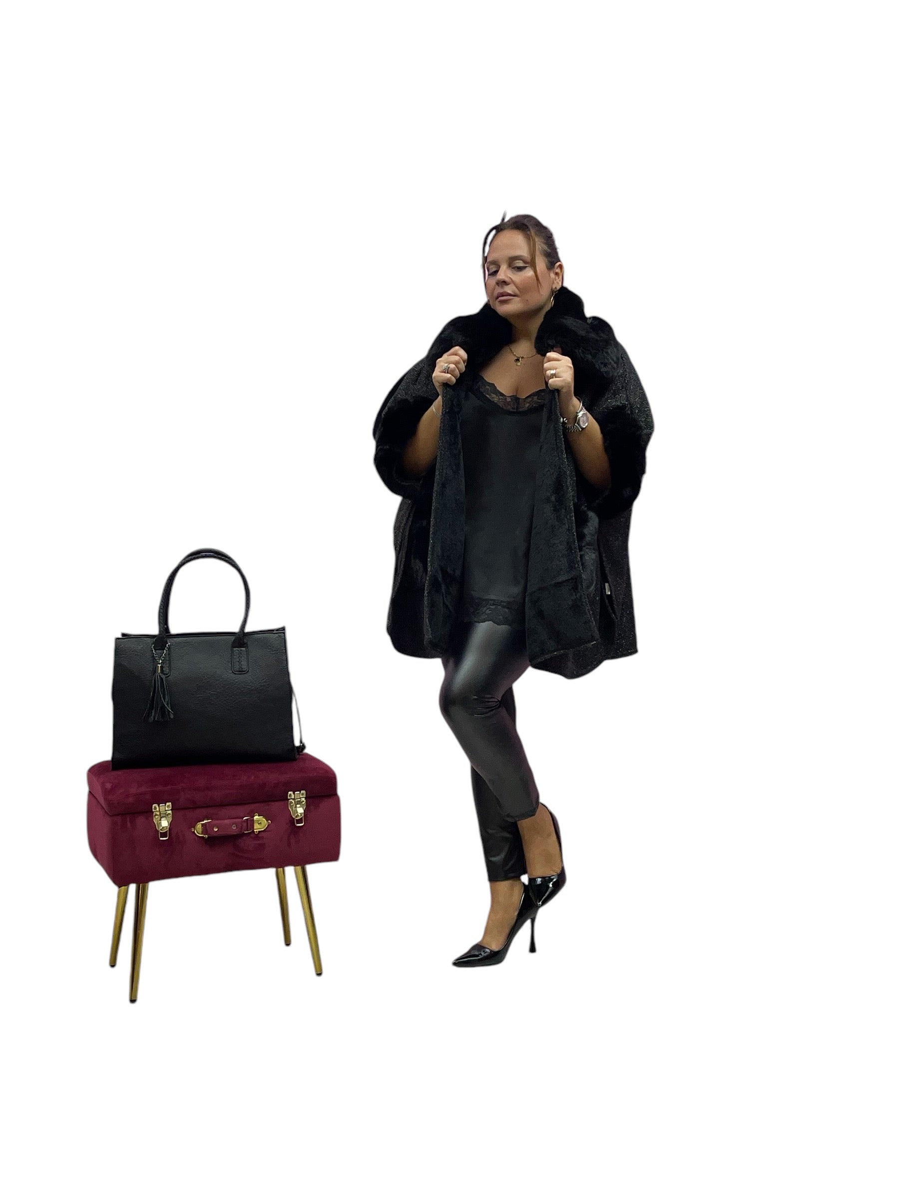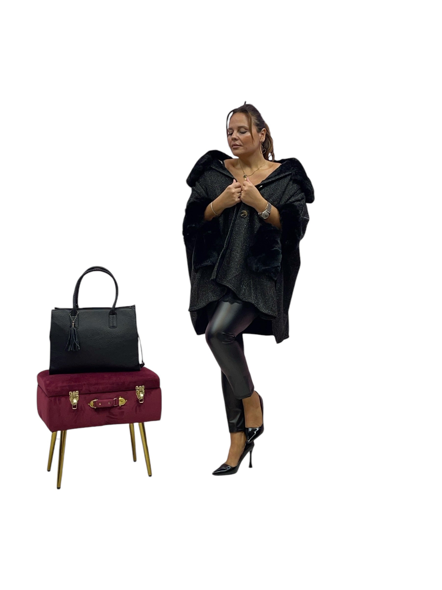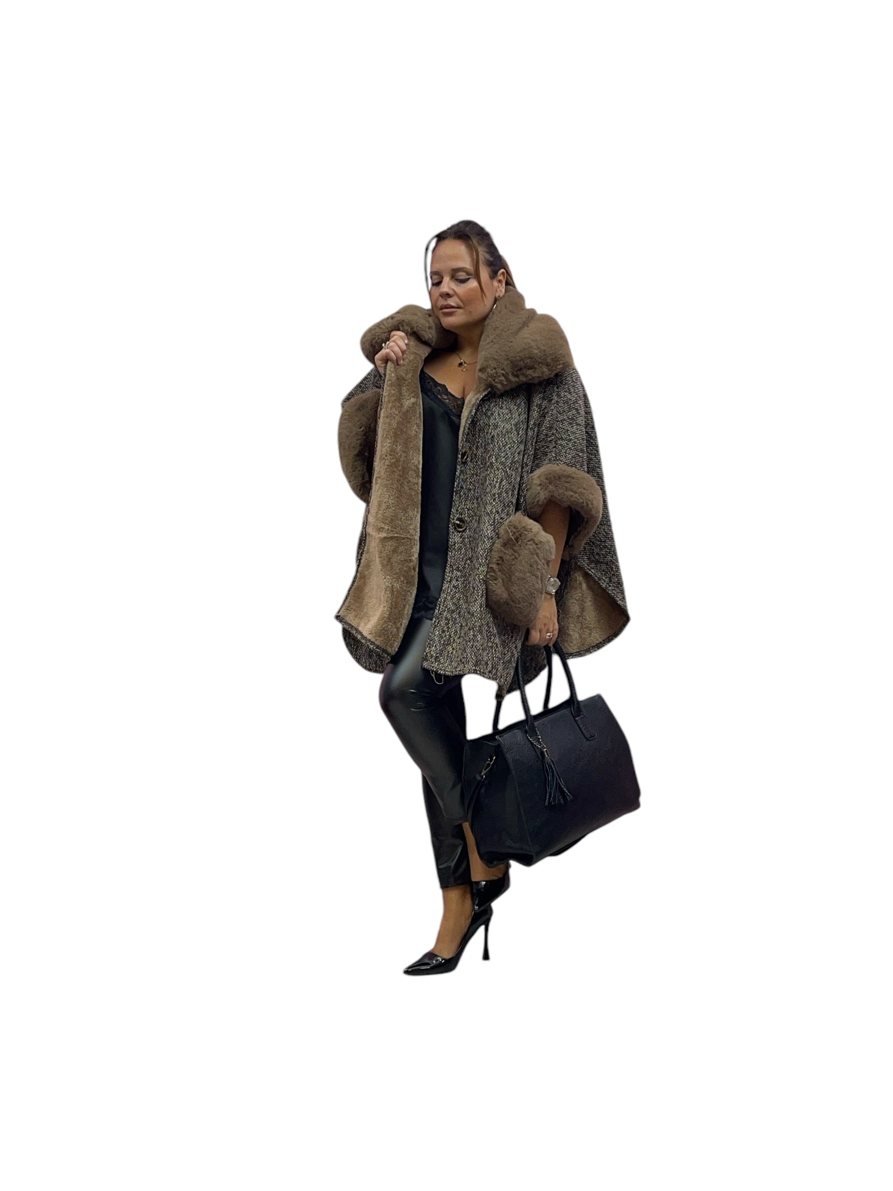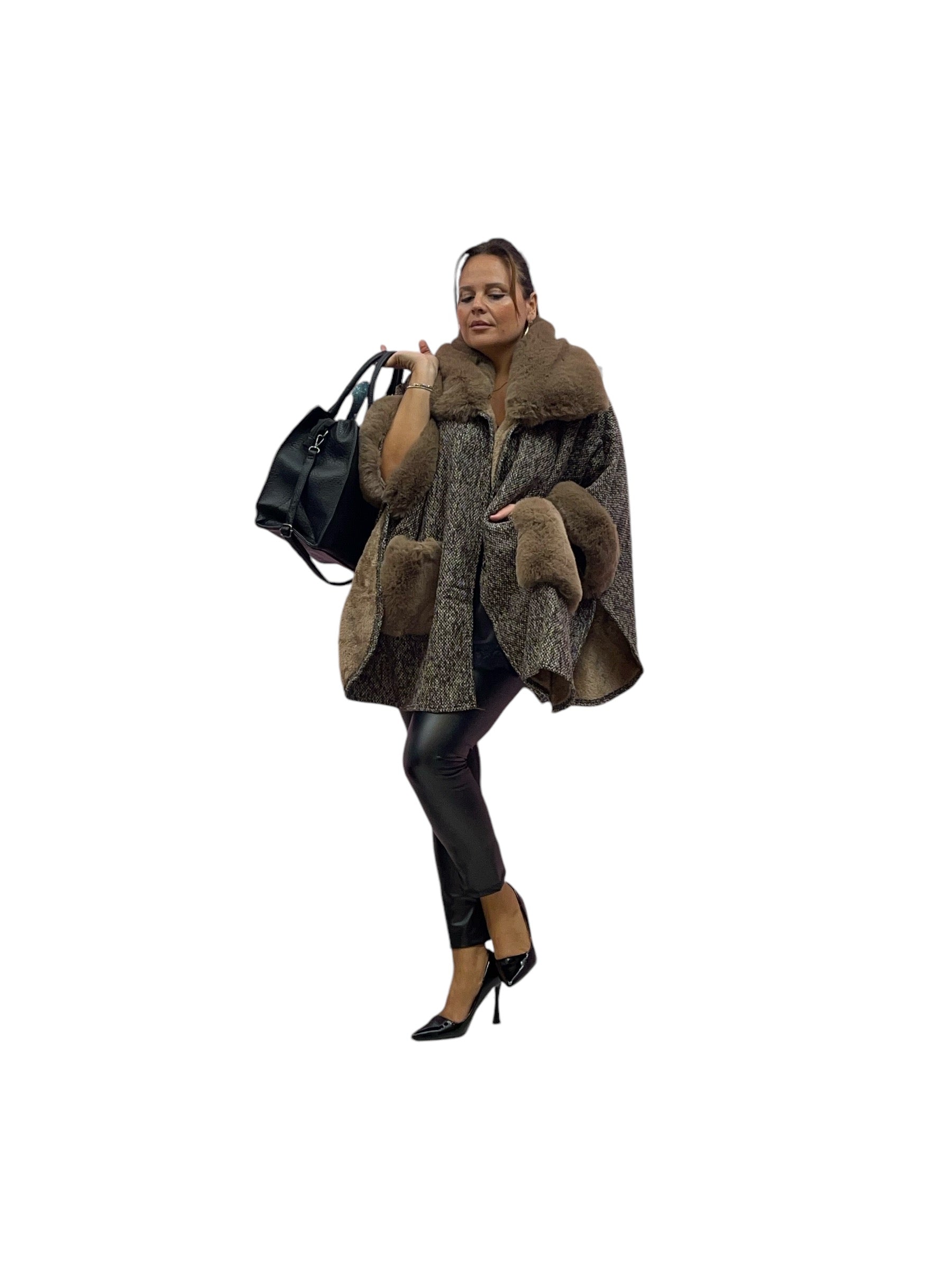 Mantella over con ecopelliccia ai polsi e collo e pelliccia interna