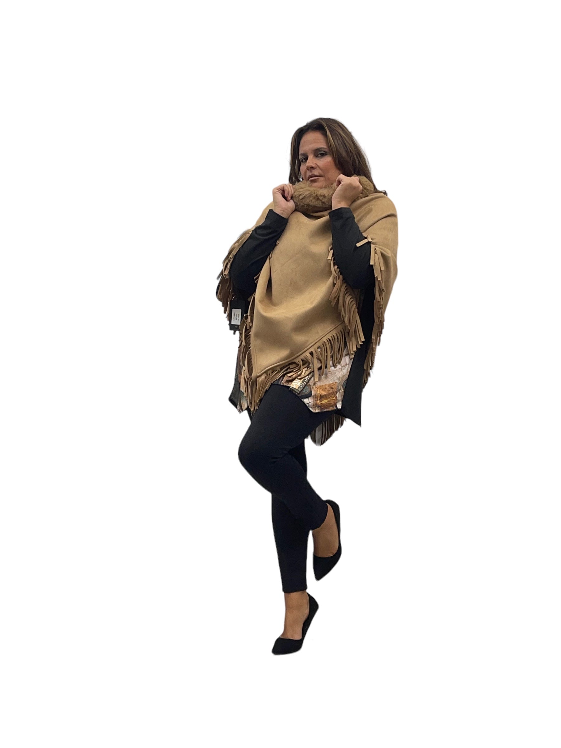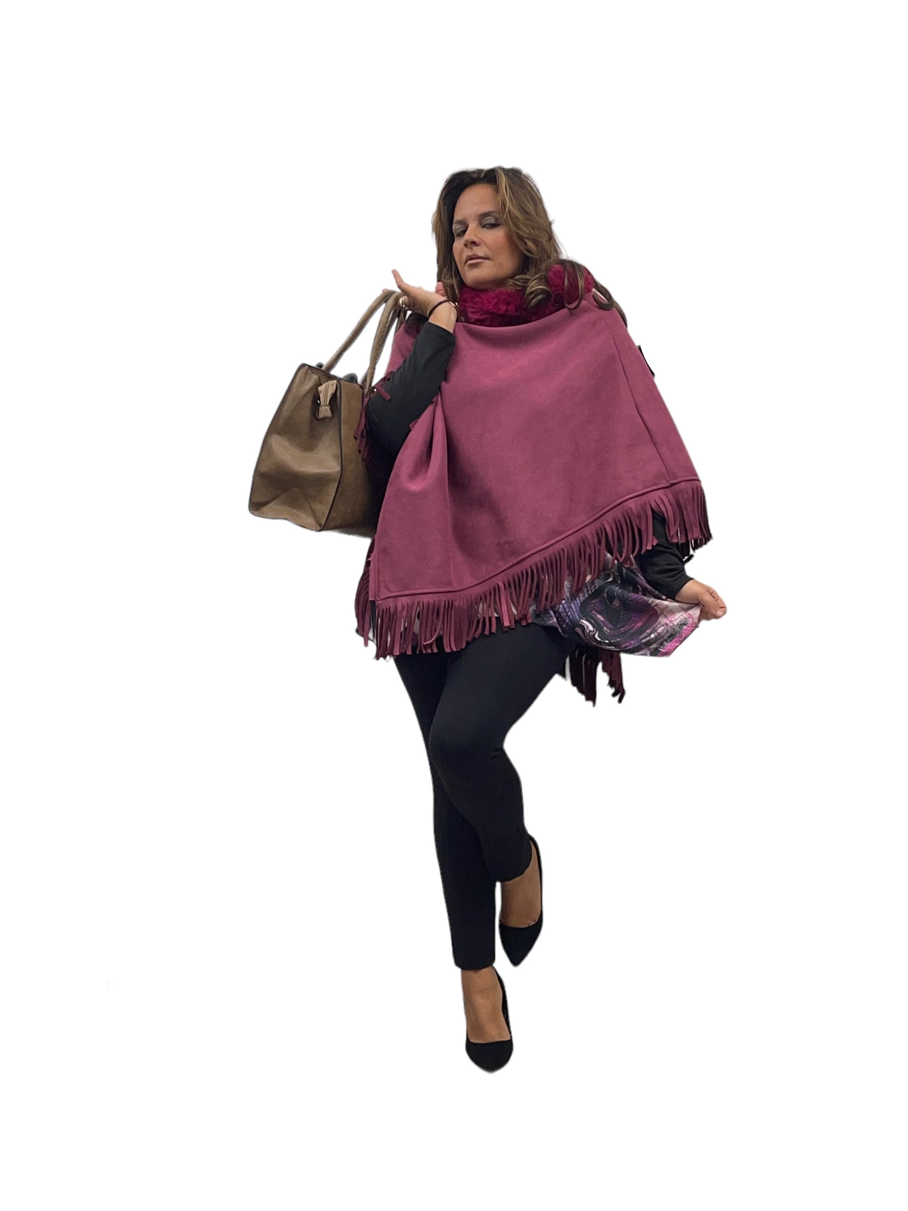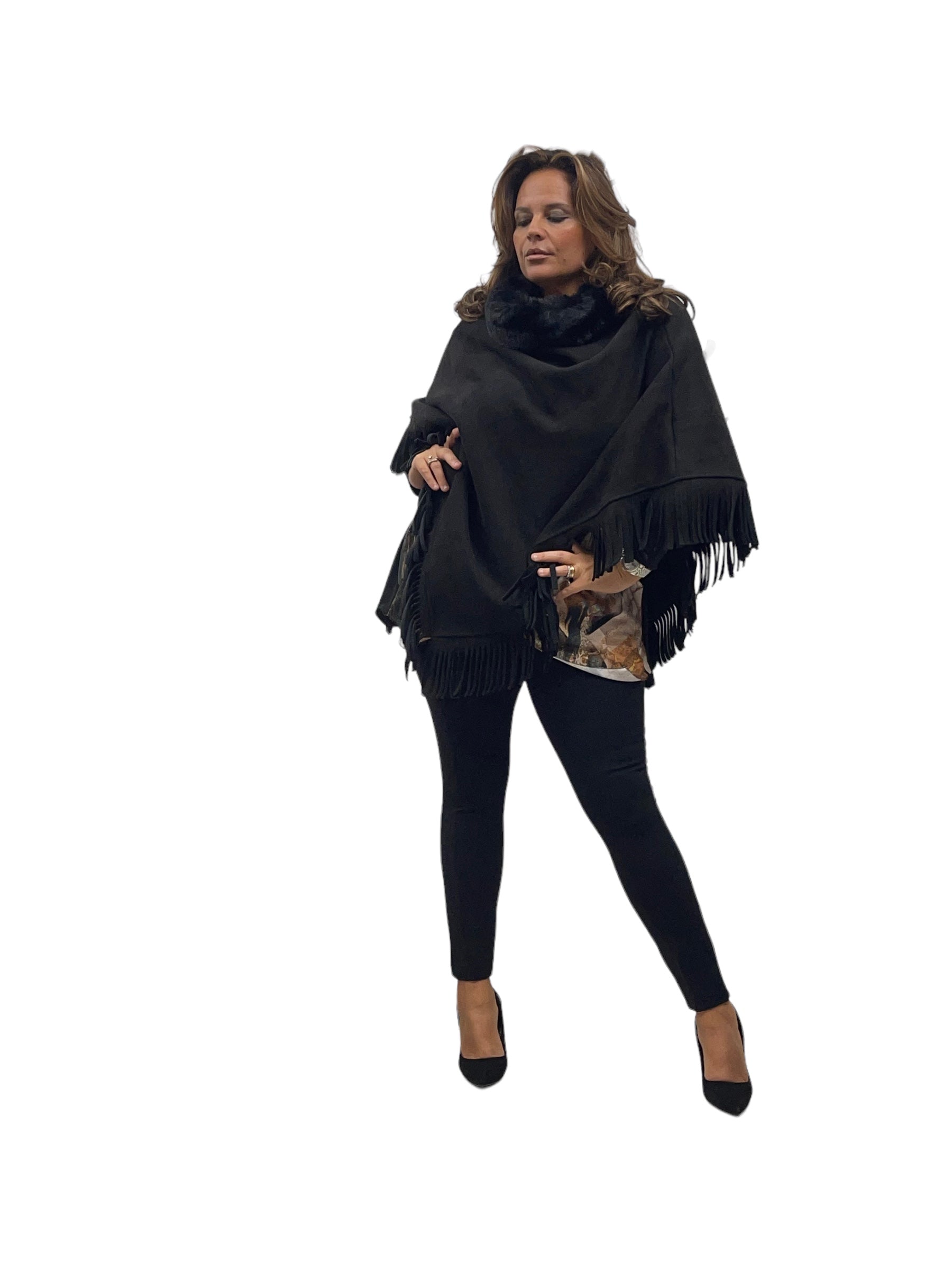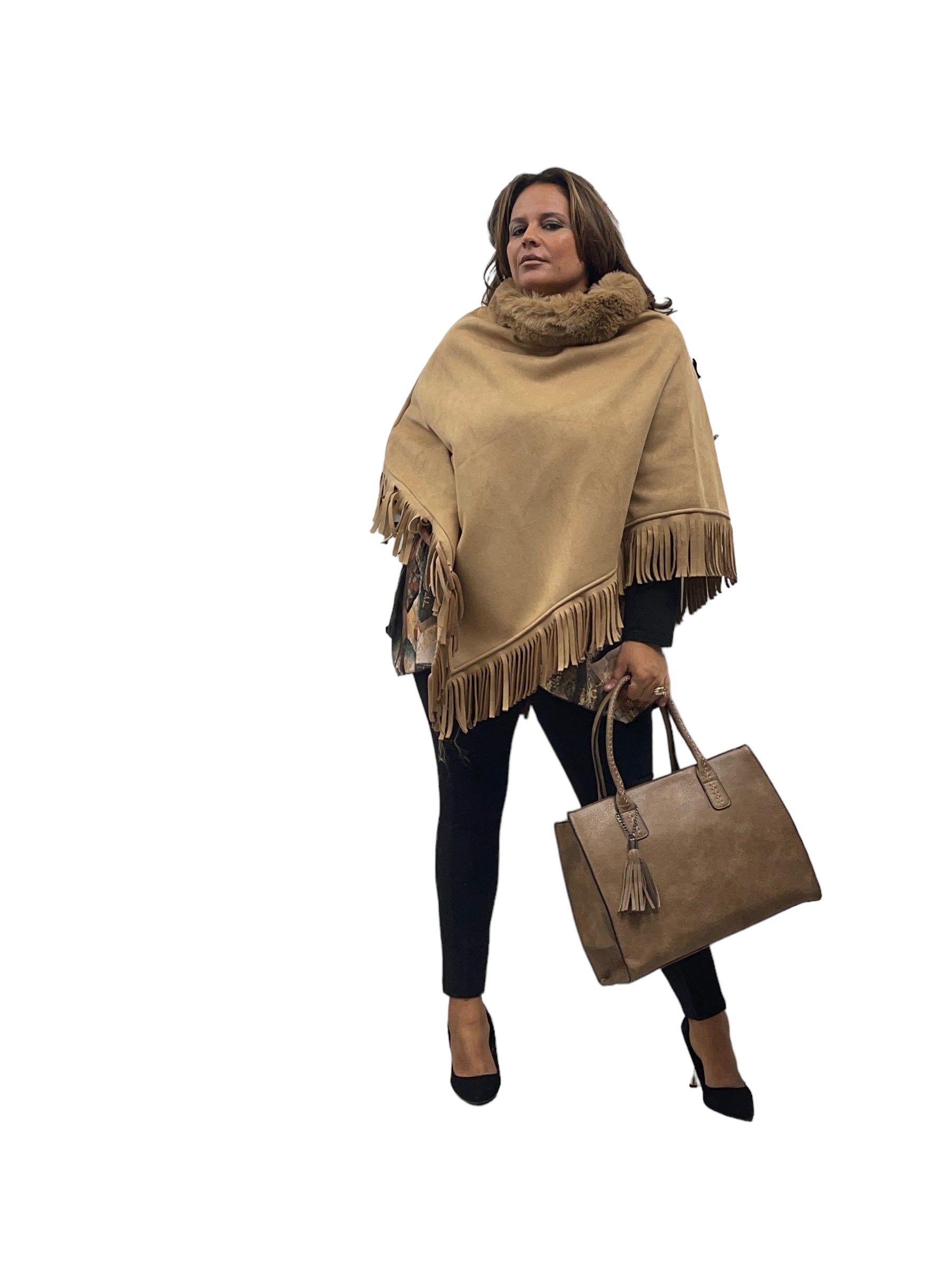 Mantella in ecodaino con frange,giro collo in ecopelliccia e felpata internamente