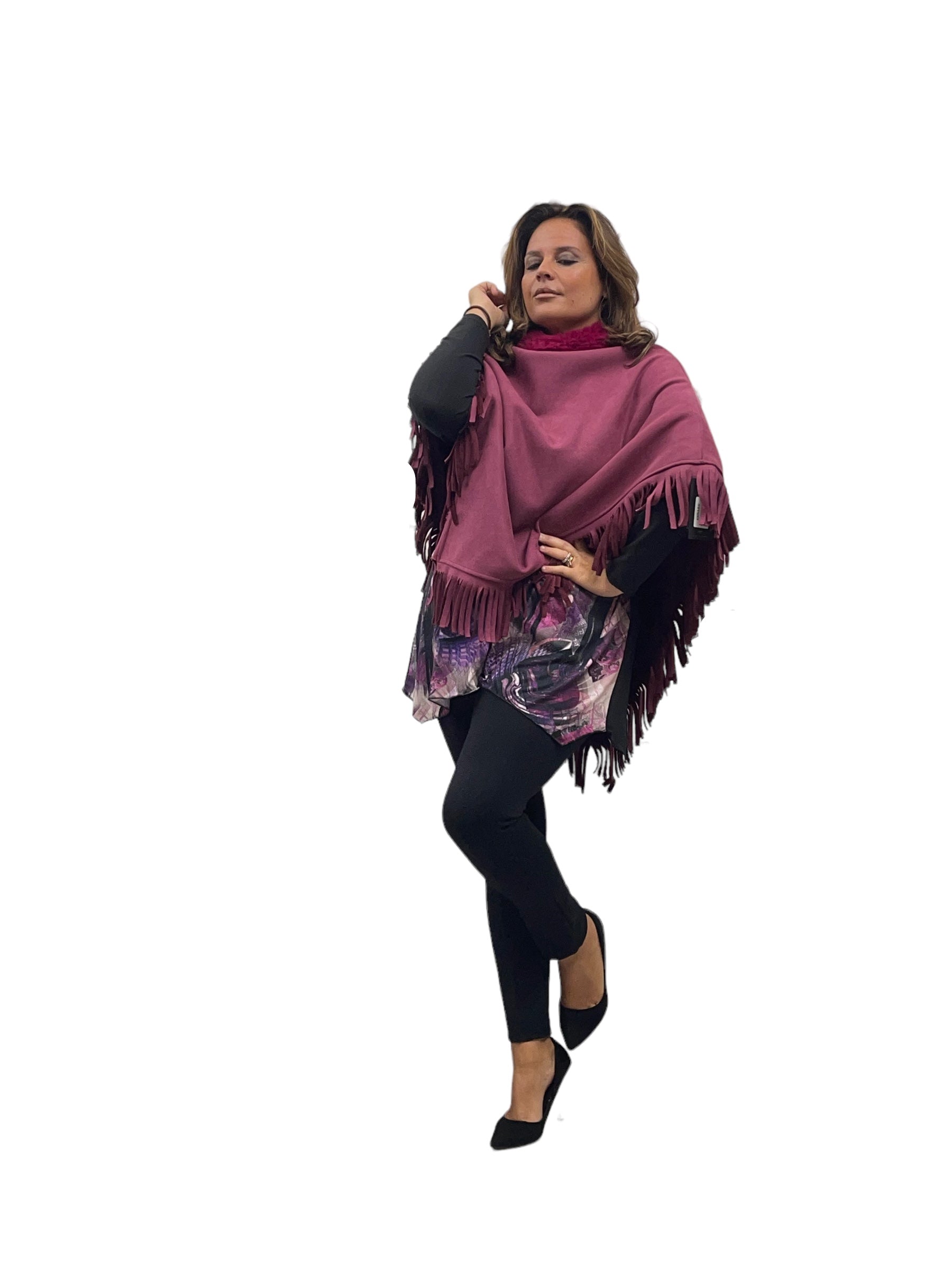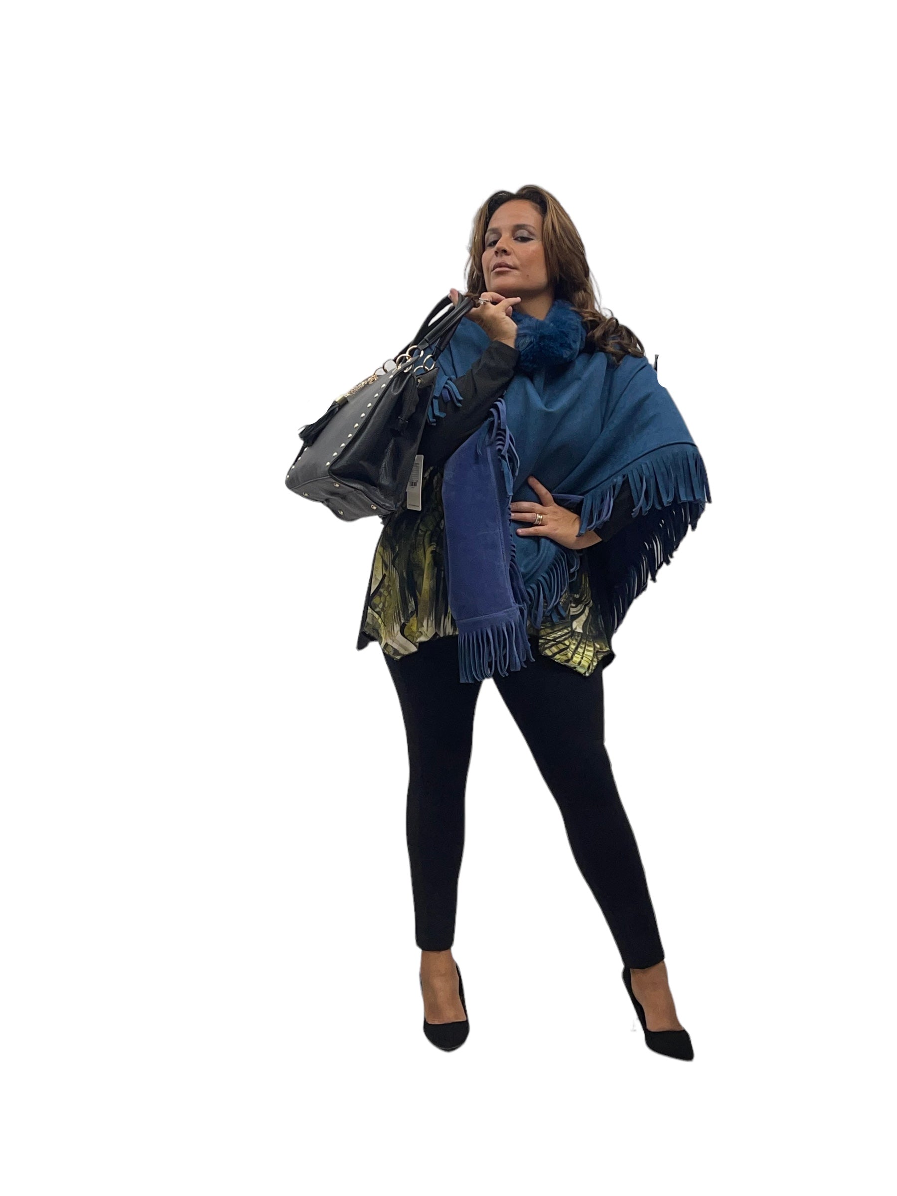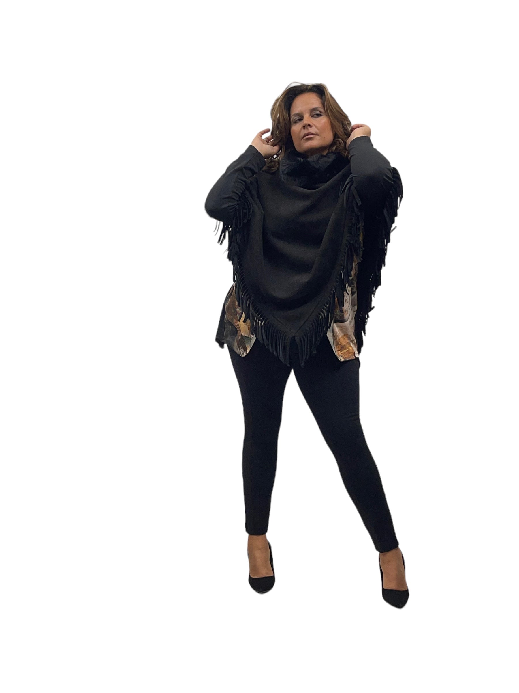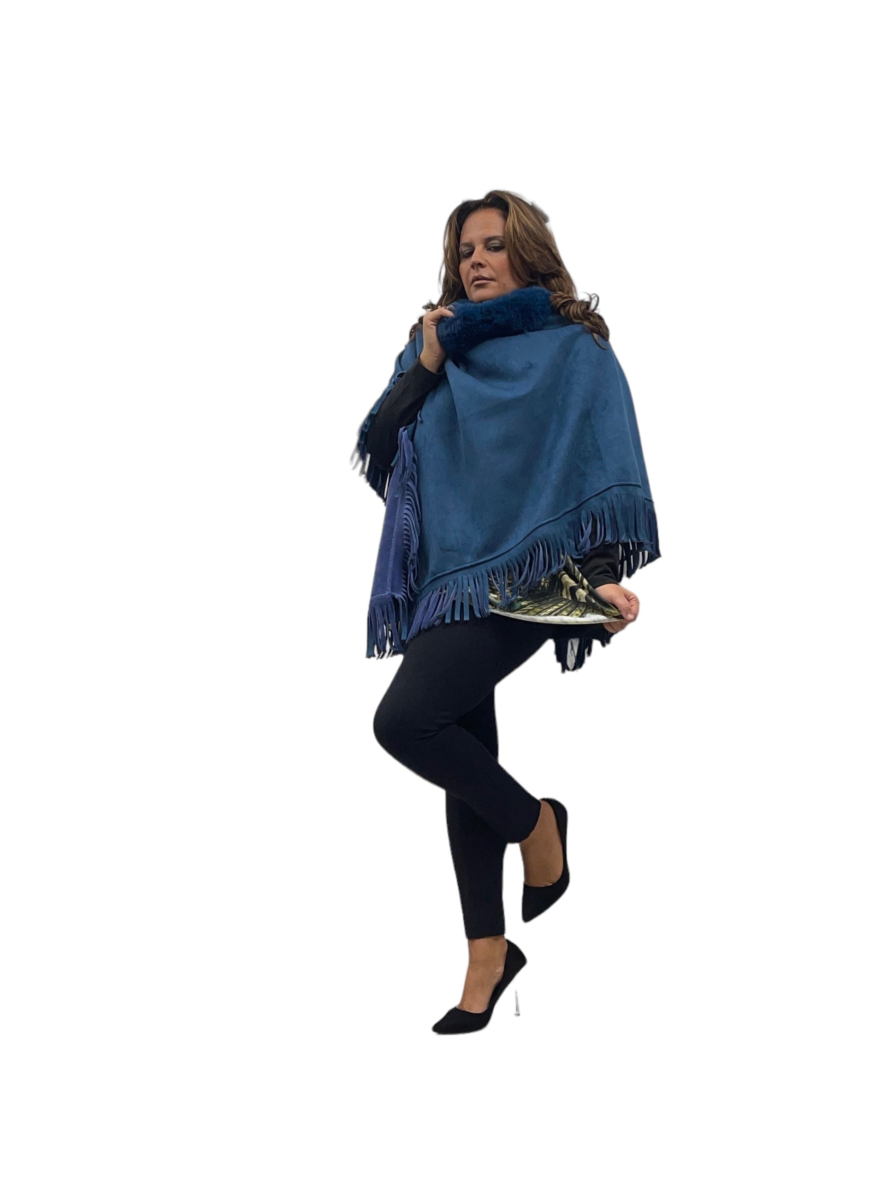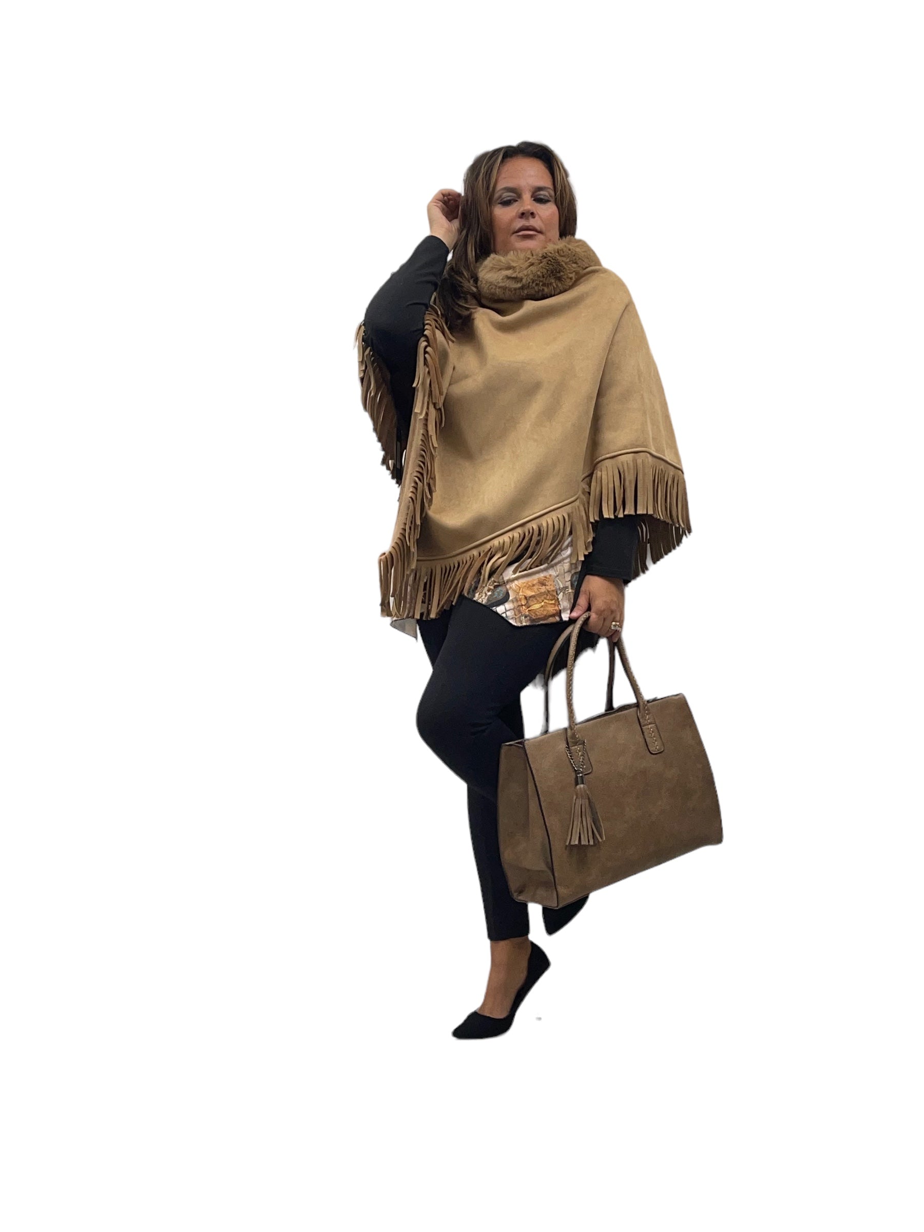 Mantella in ecodaino con frange,giro collo in ecopelliccia e felpata internamente