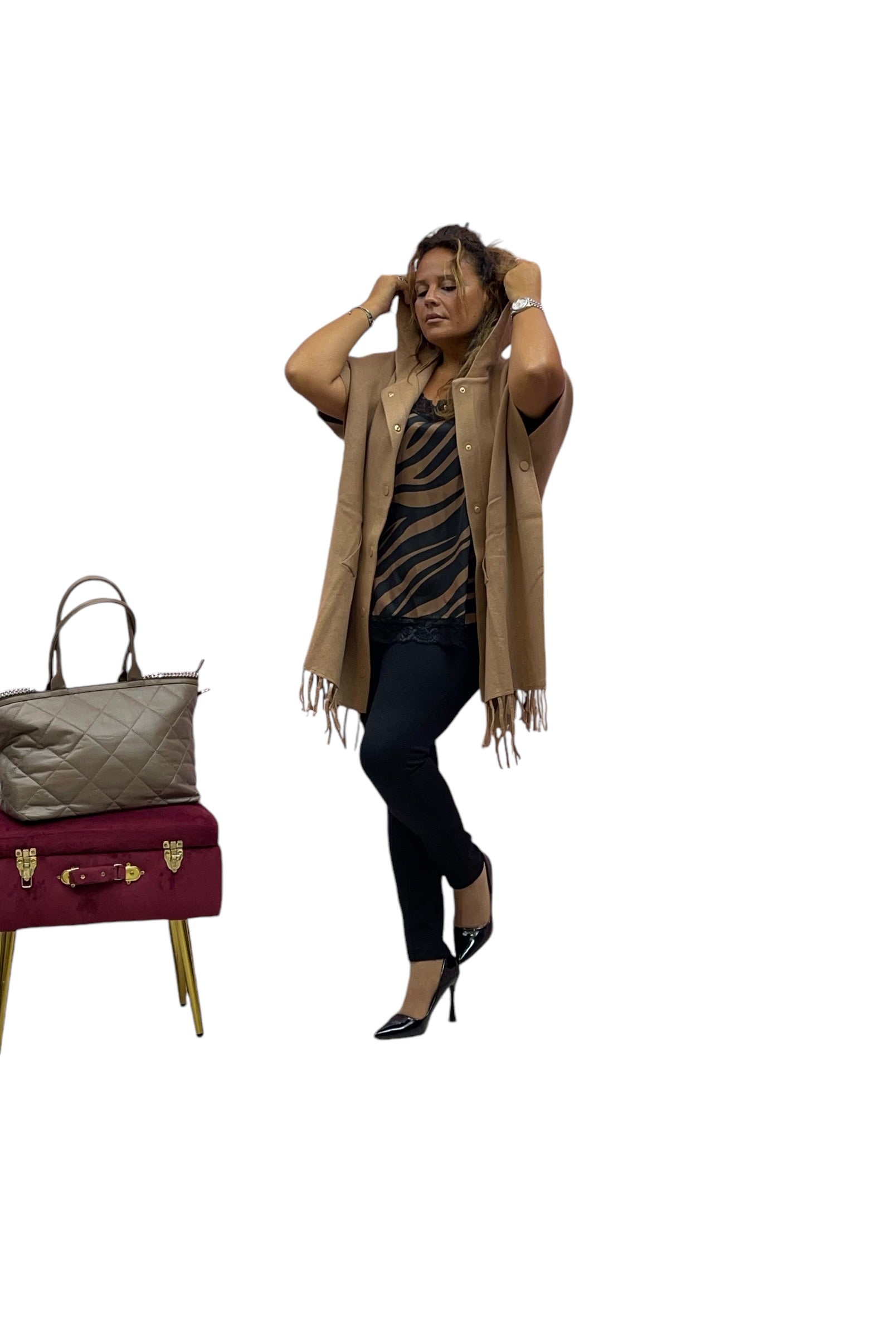 Mantella/kappa lunga con frange ,bottoni e cappuccio.Lateralmente chiusa con un bottone