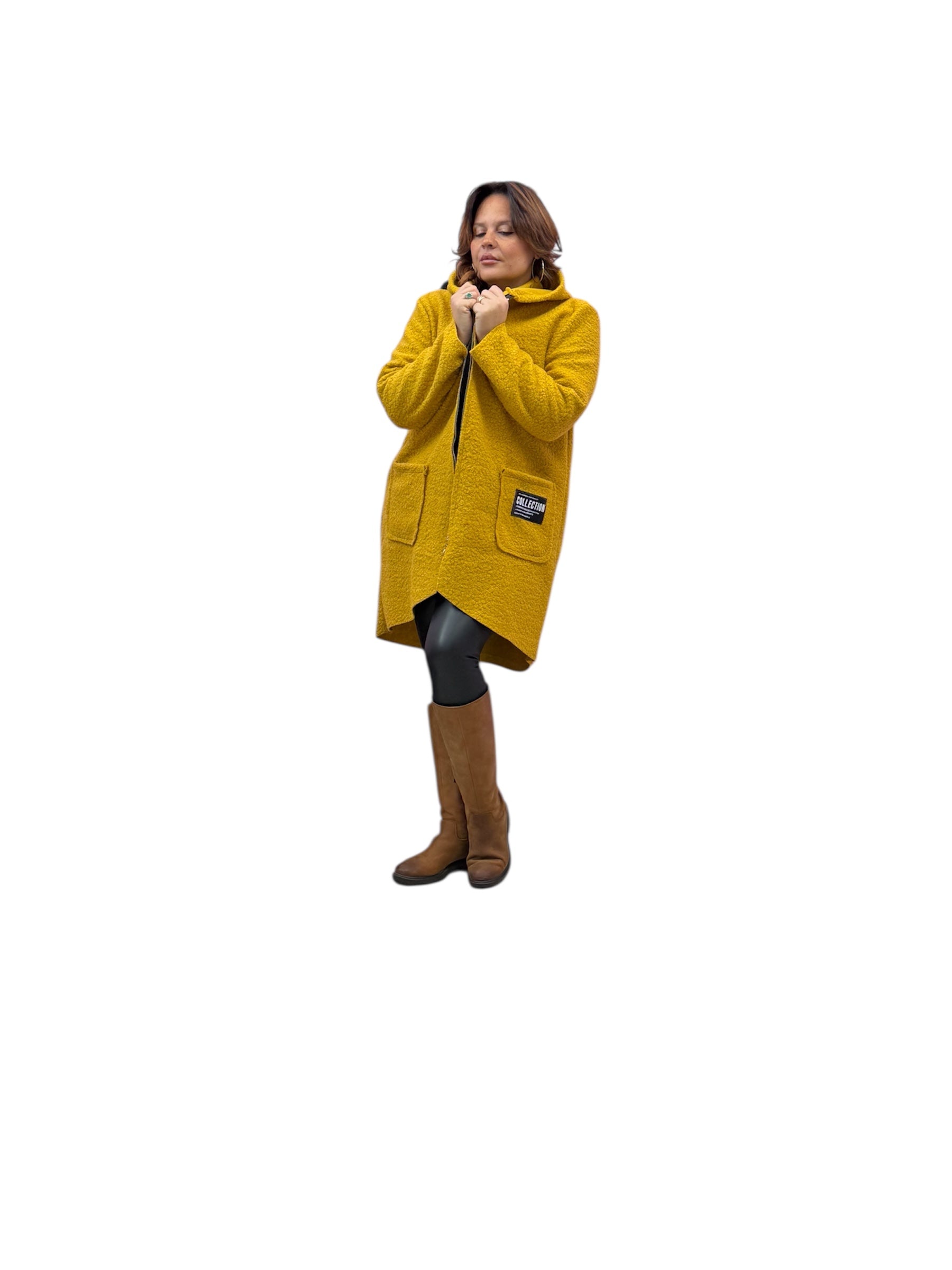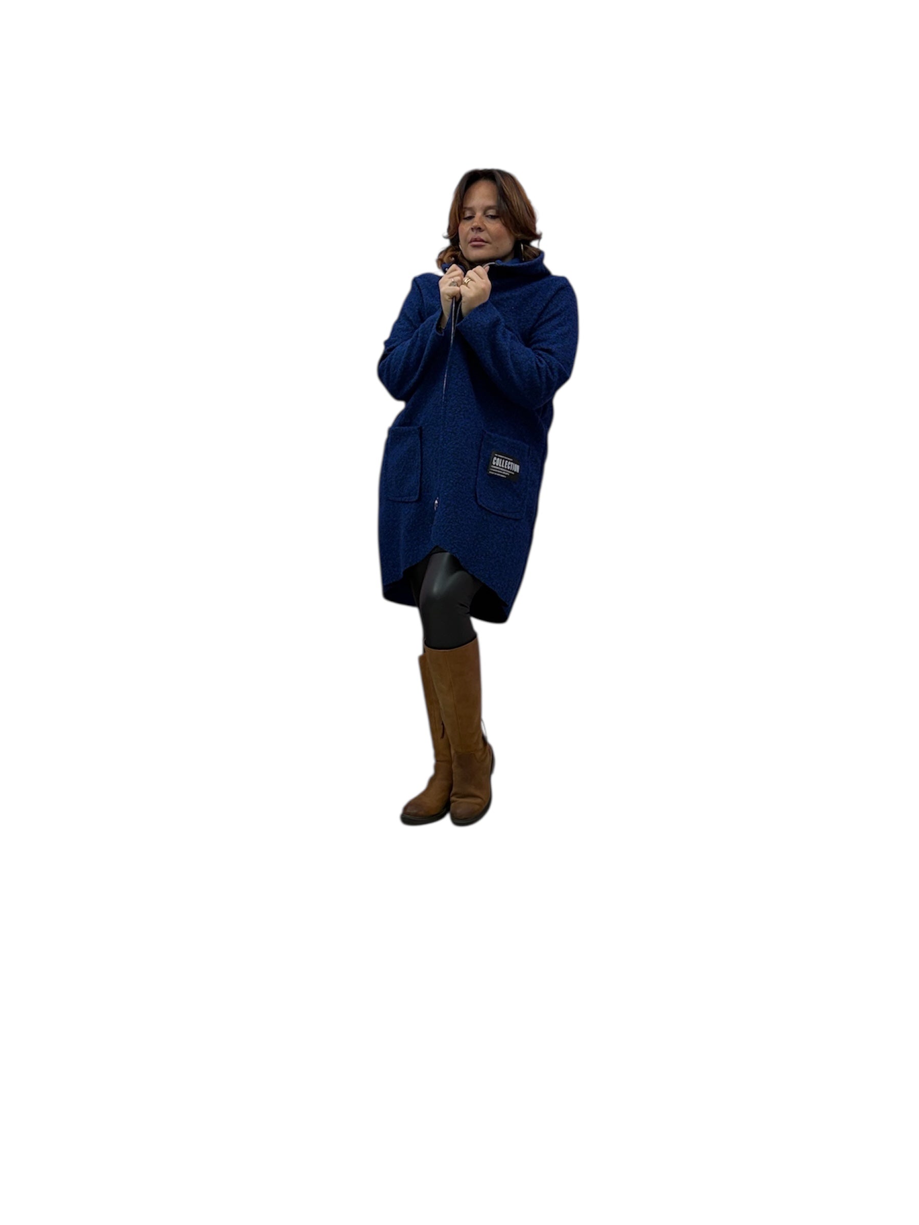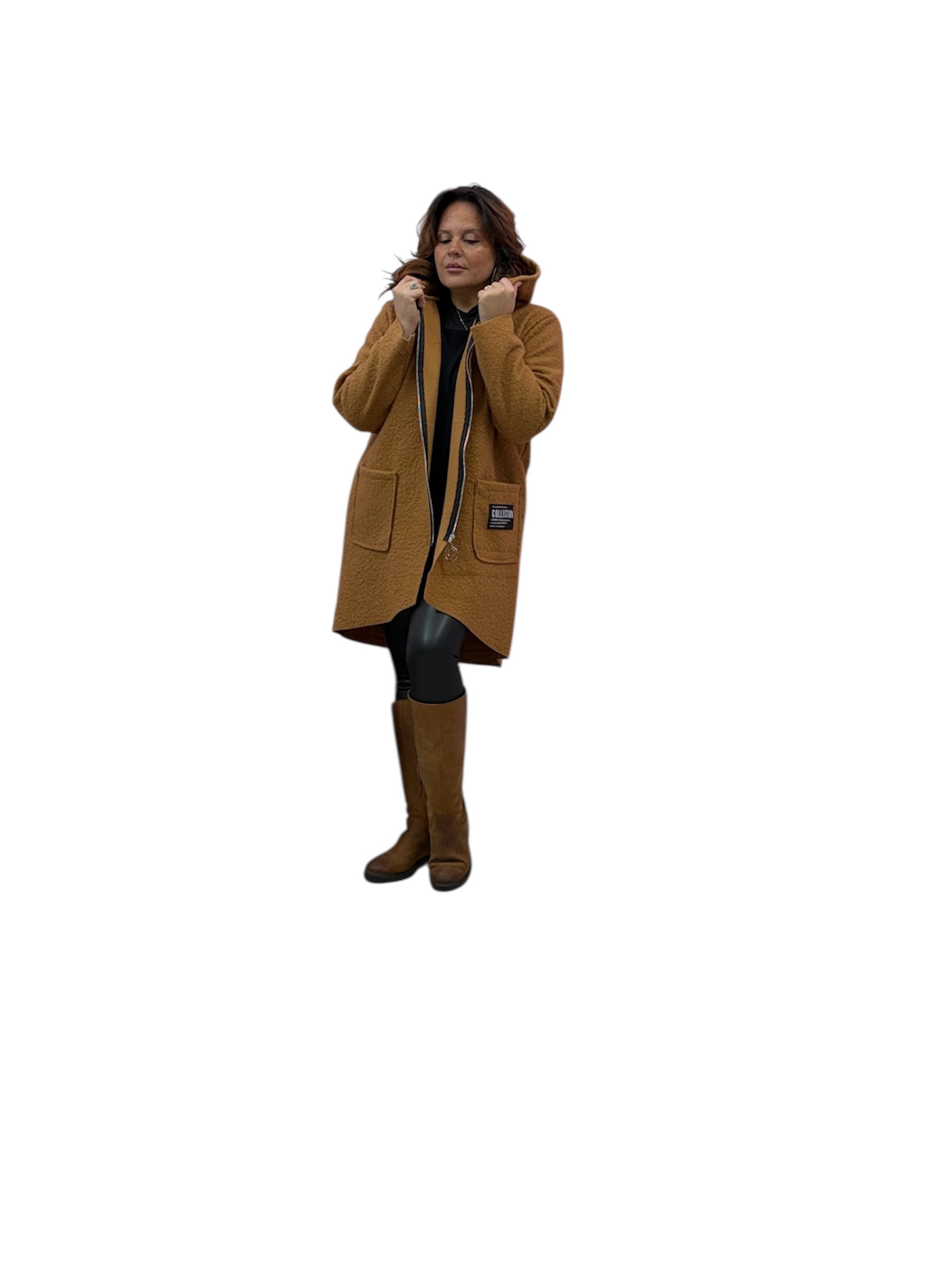Cappotto over con cappuccio e zip in boucle'