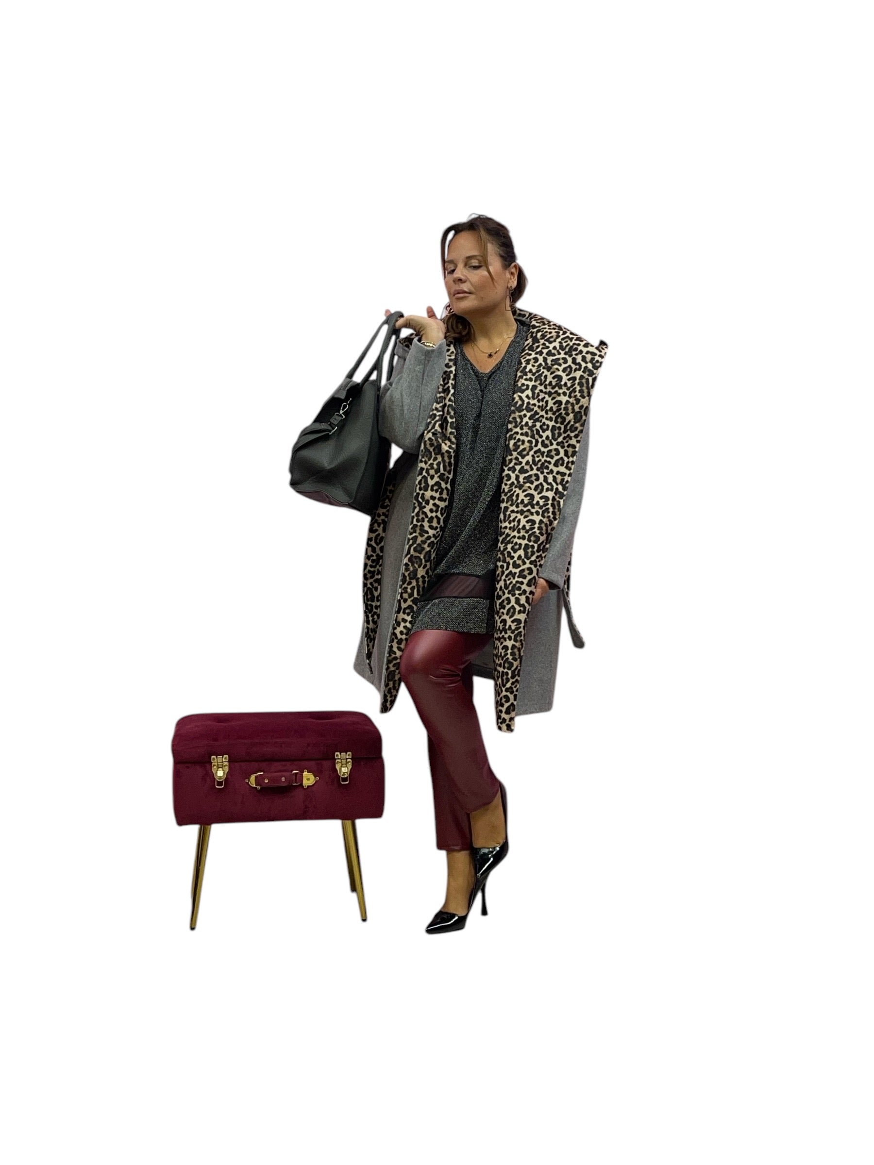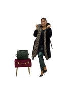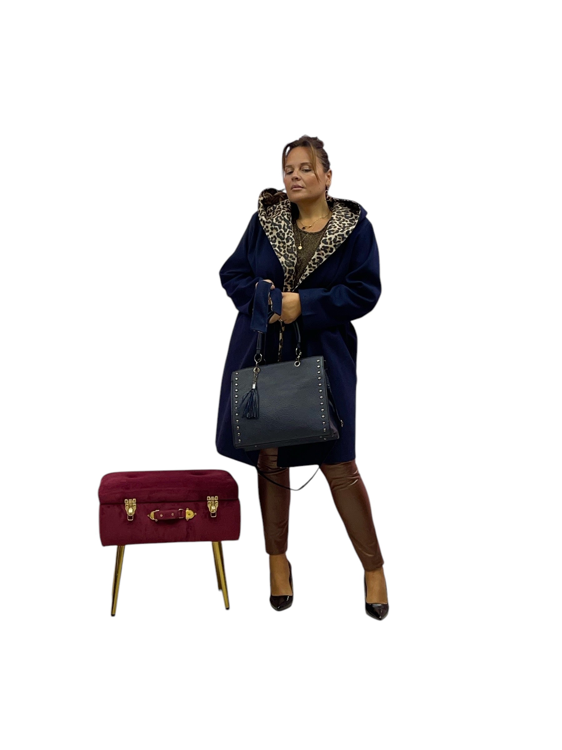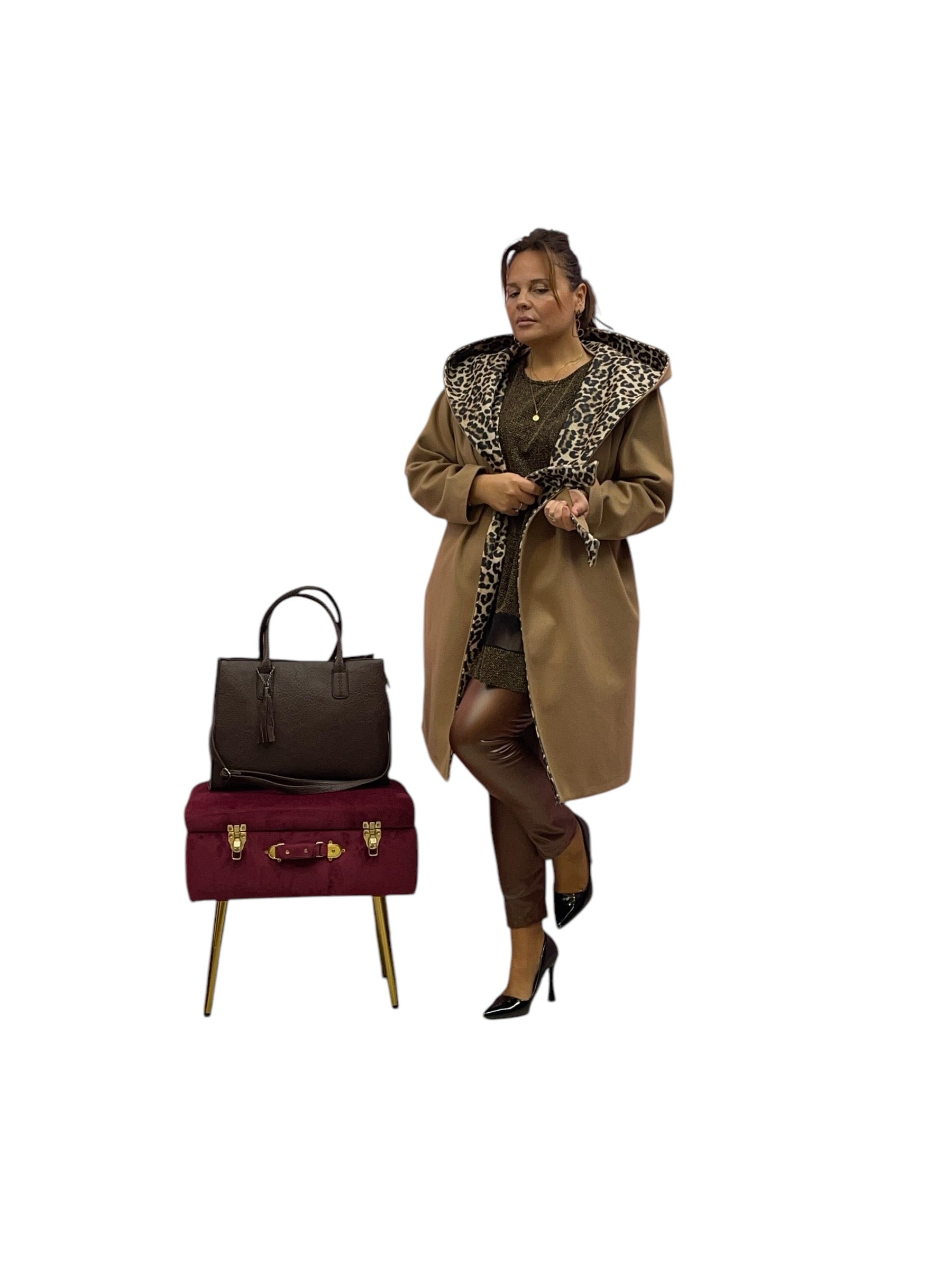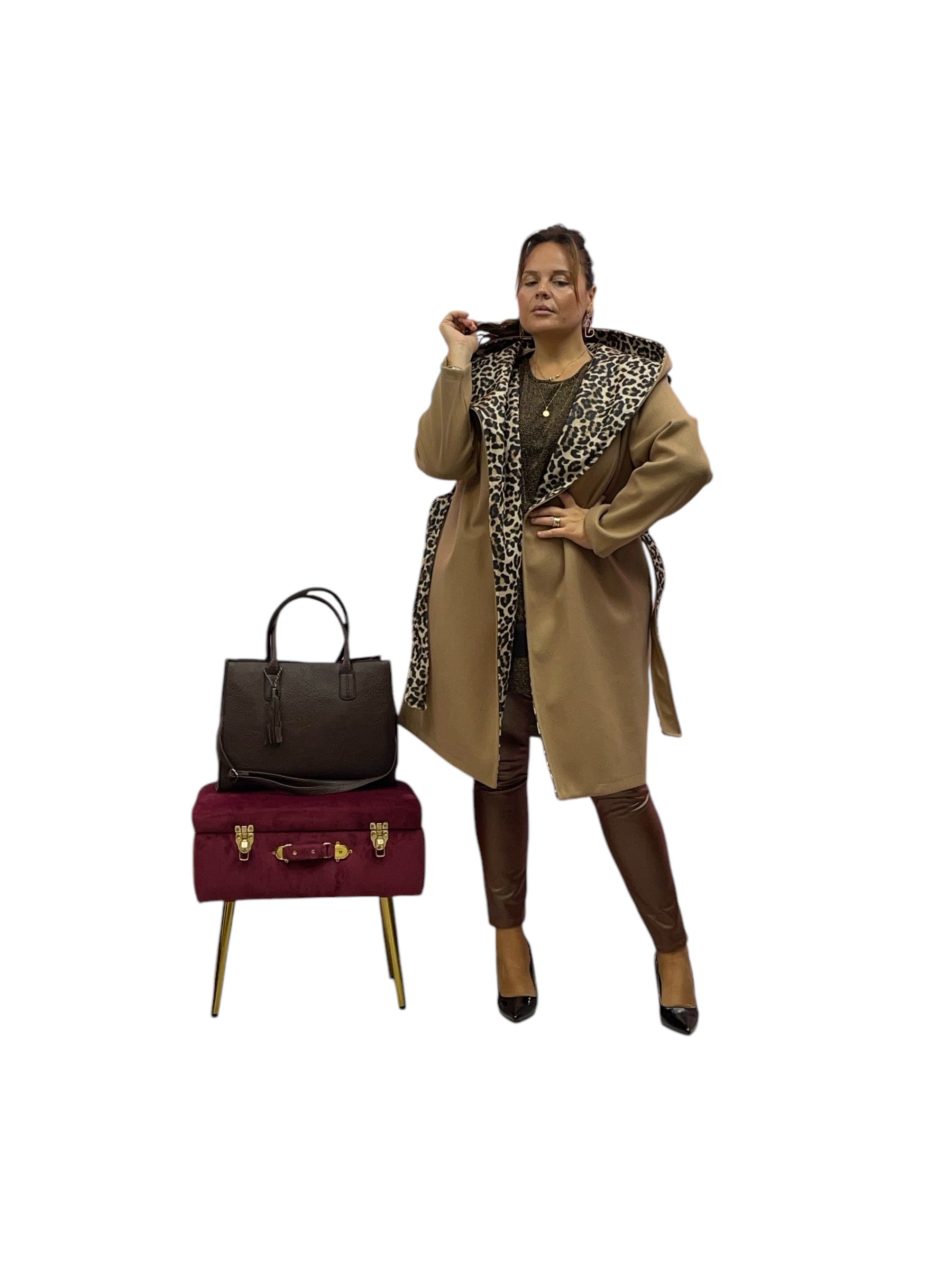 Cappotto over con cappuccio e cintura internamente maculato