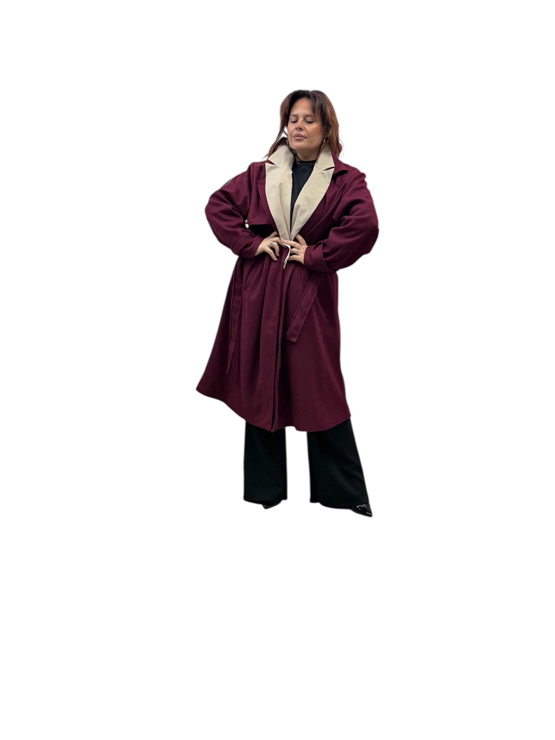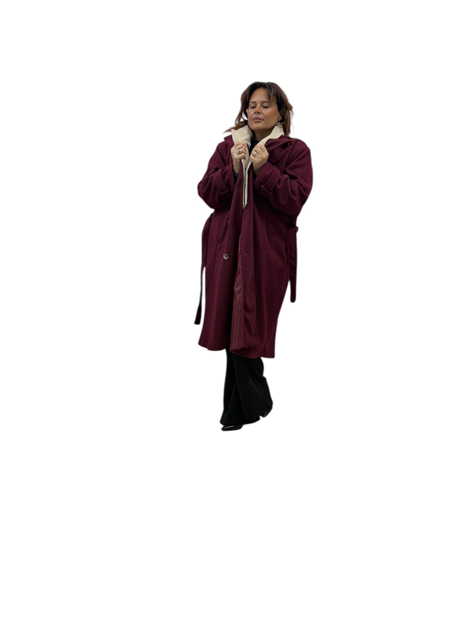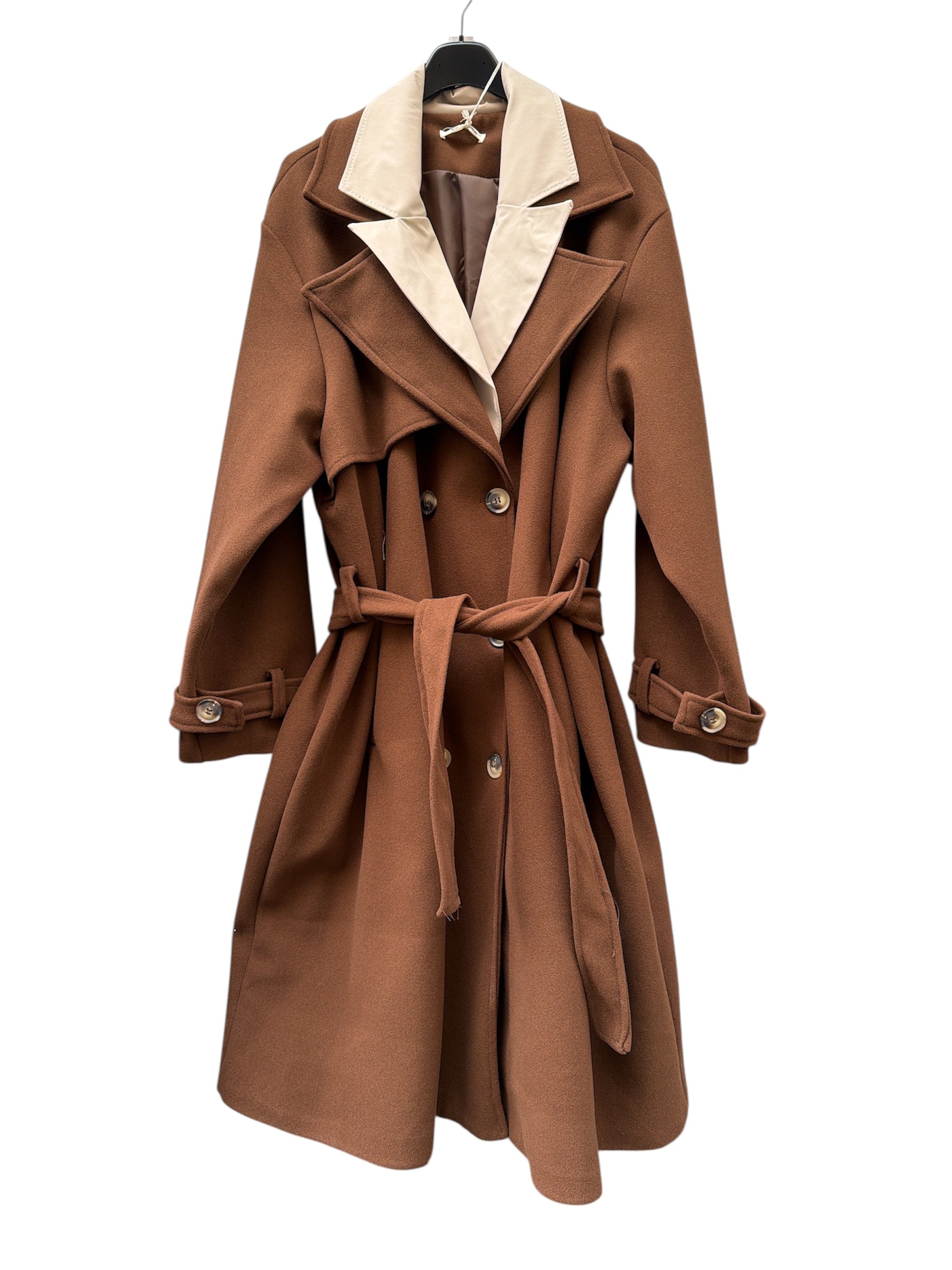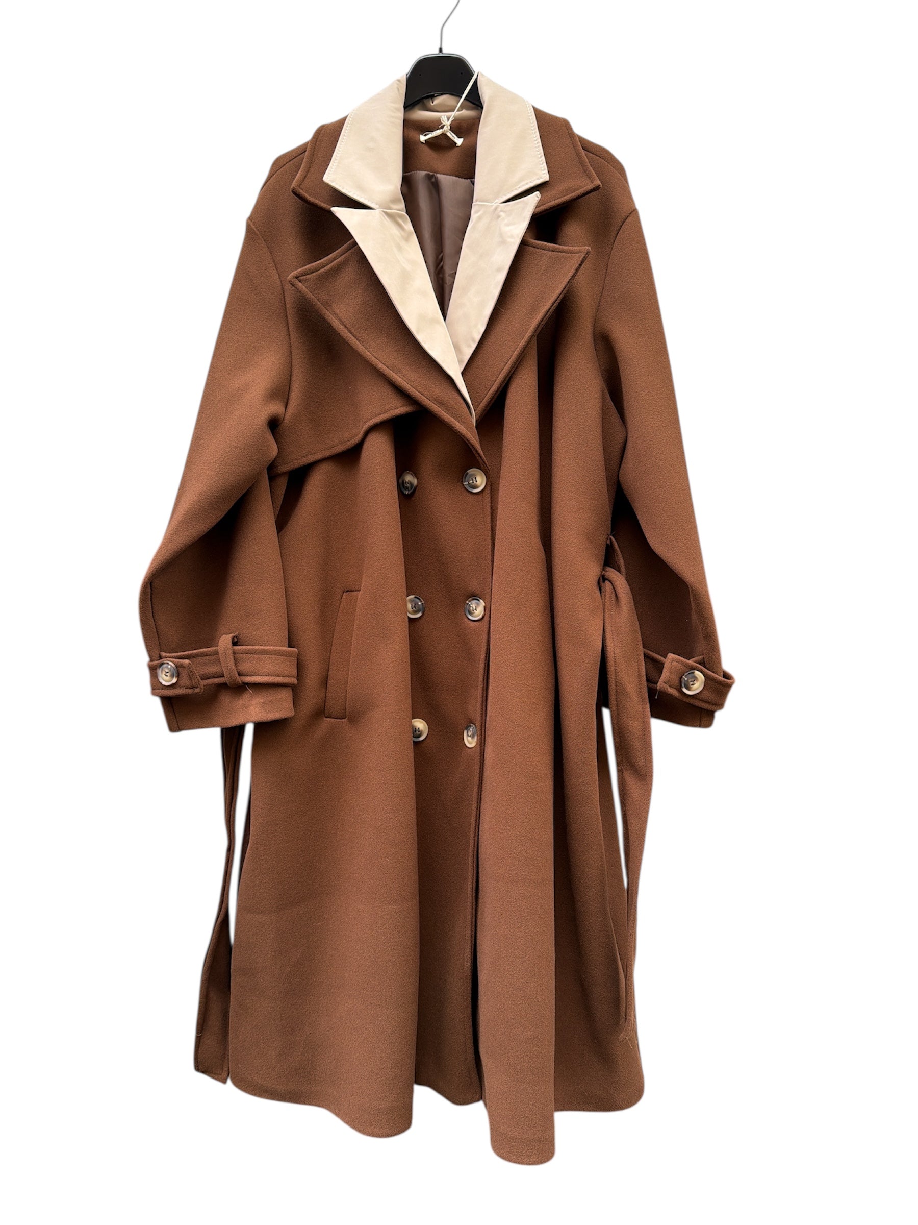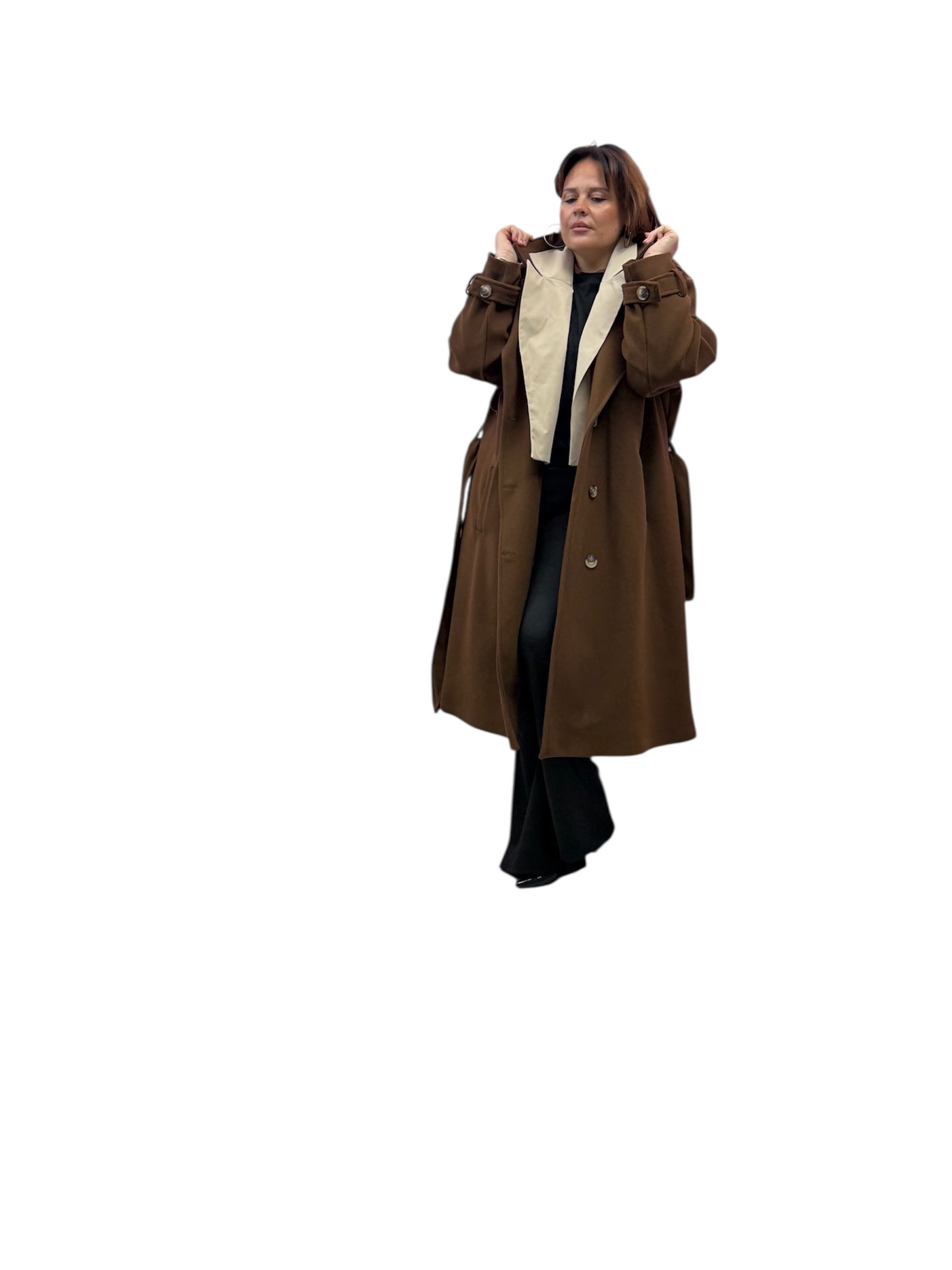Cappotto over lungo foderato con doppio bavero,cintura e bottoni