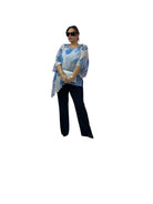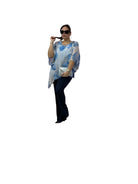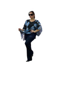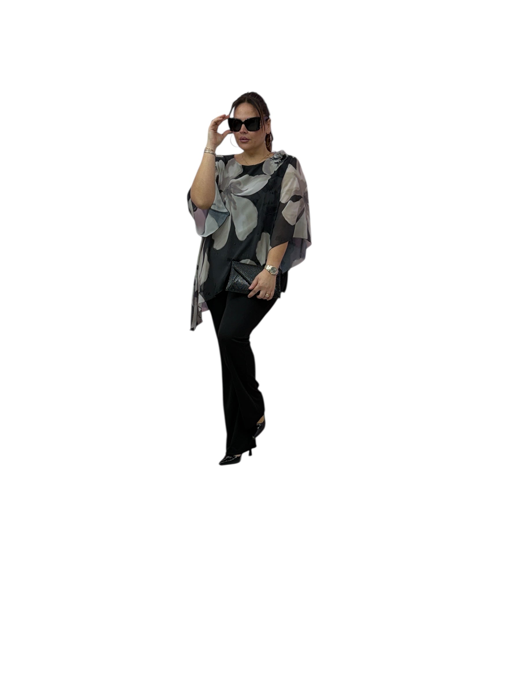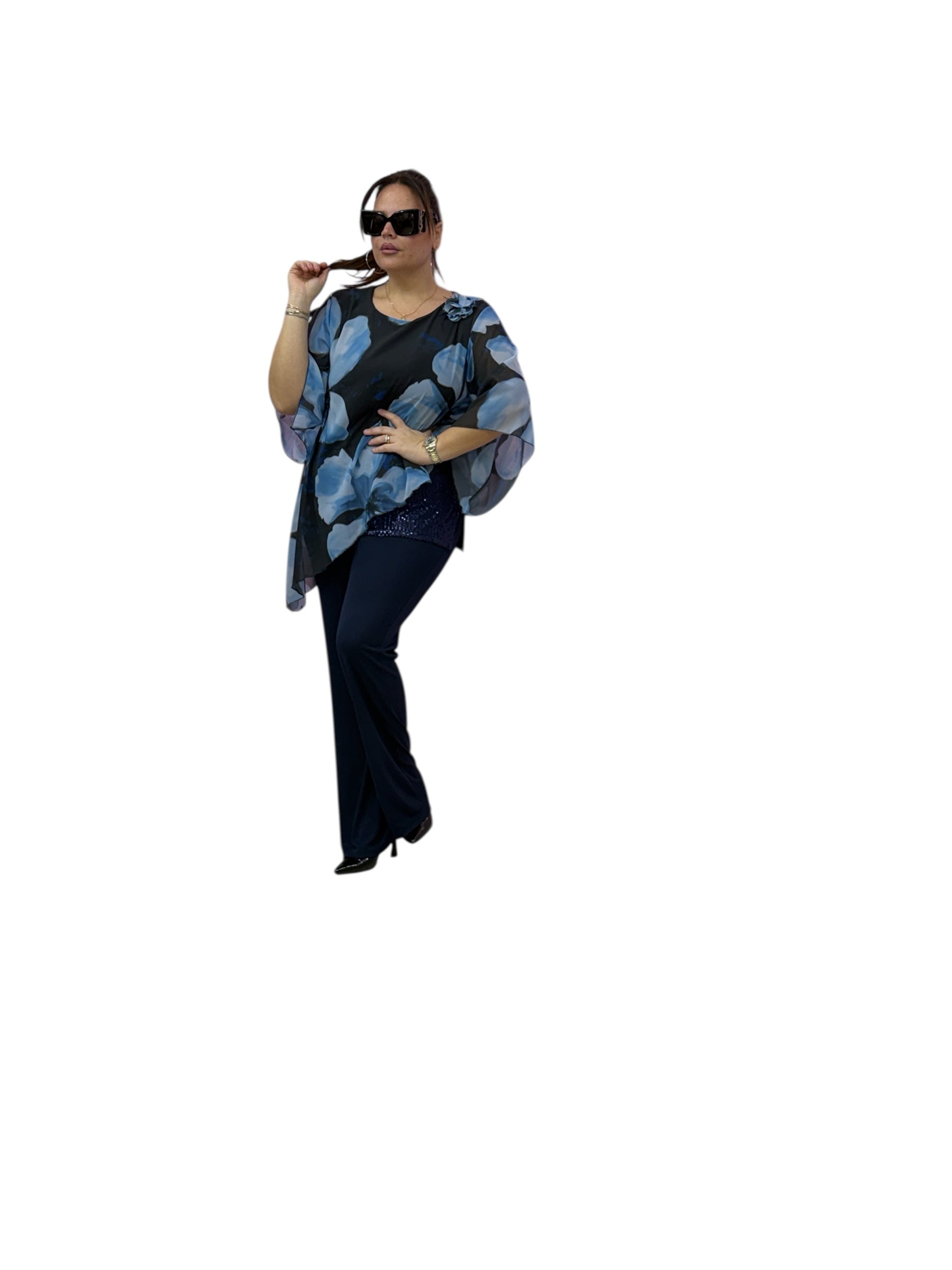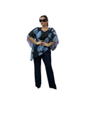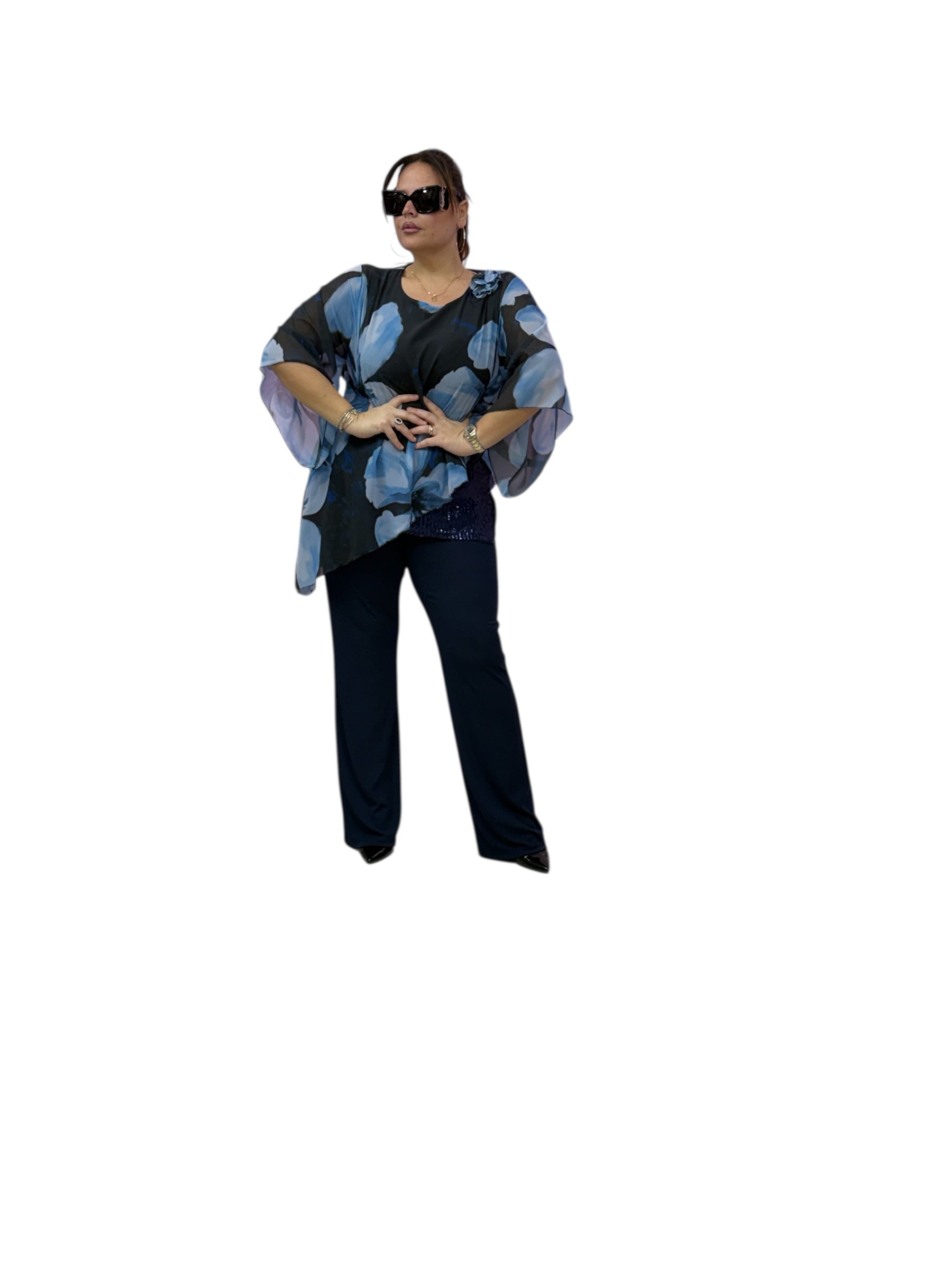 Casacca over in georgette asimmetrica fantasia con top in jersey e fascia in paiette