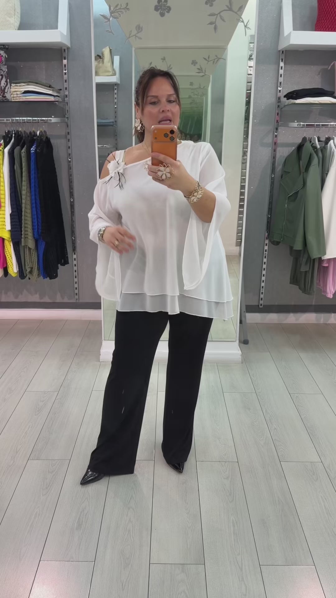 Casacca over doppio pannello in georgette con bretella alla spalla e fiore con manica svasata