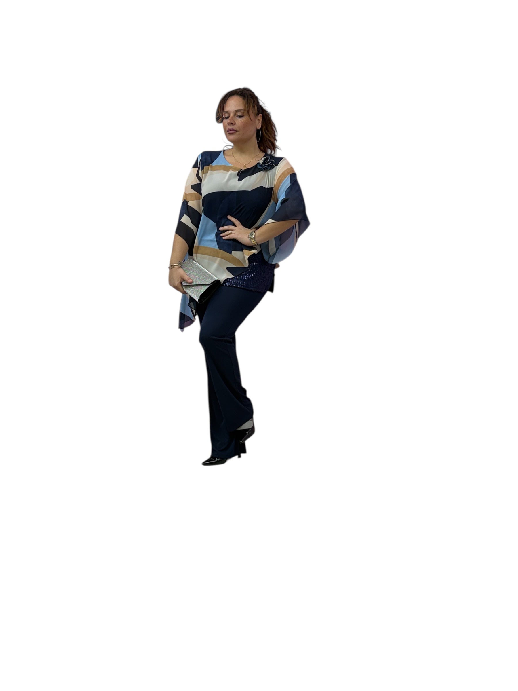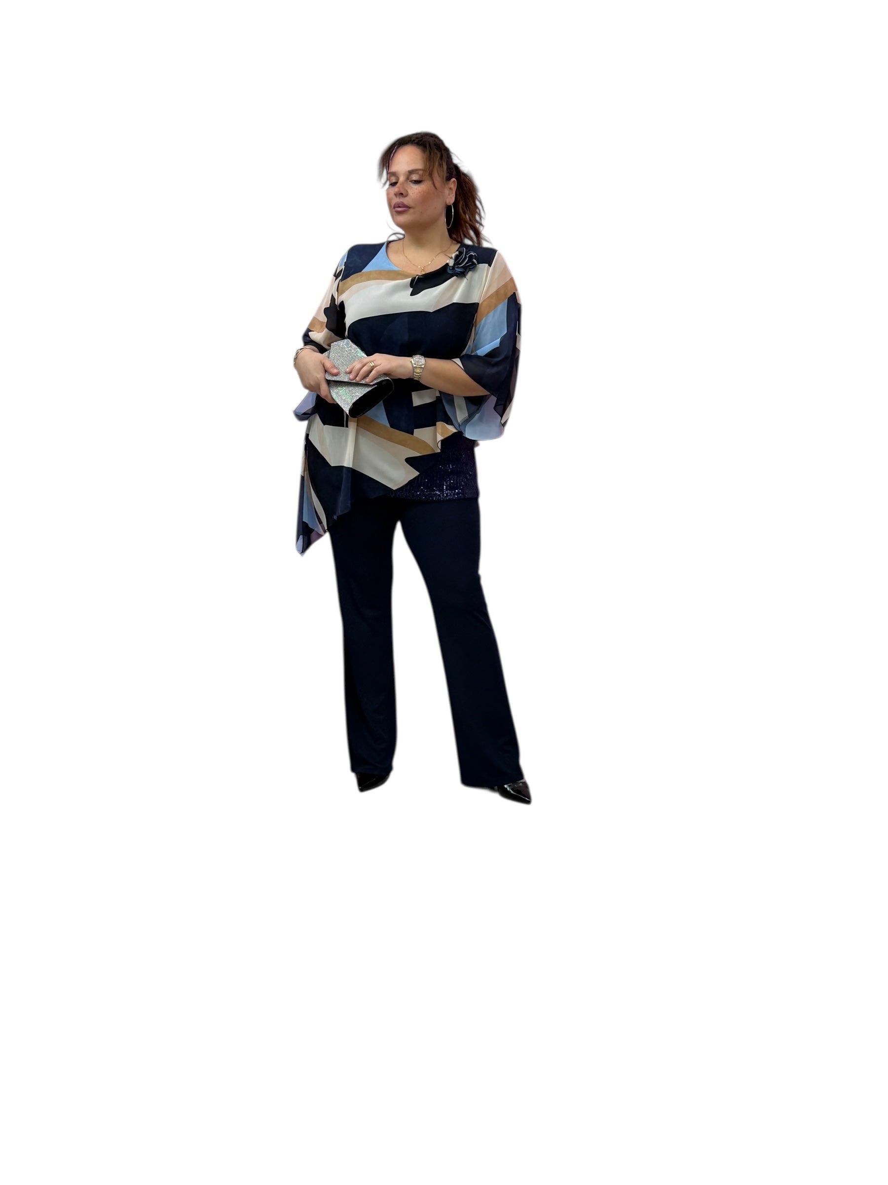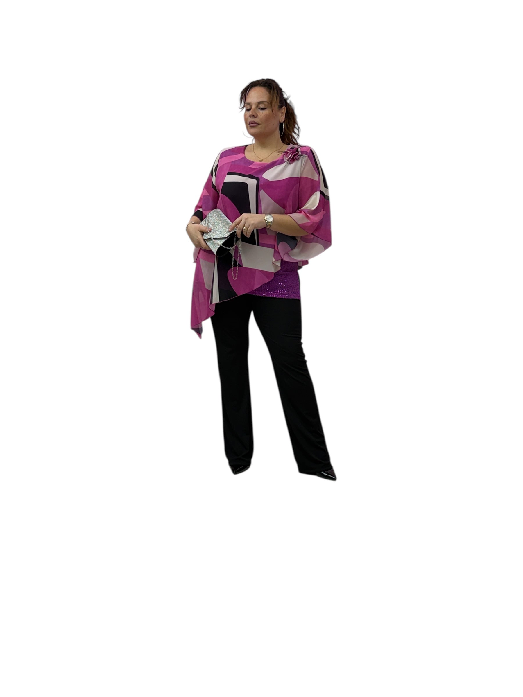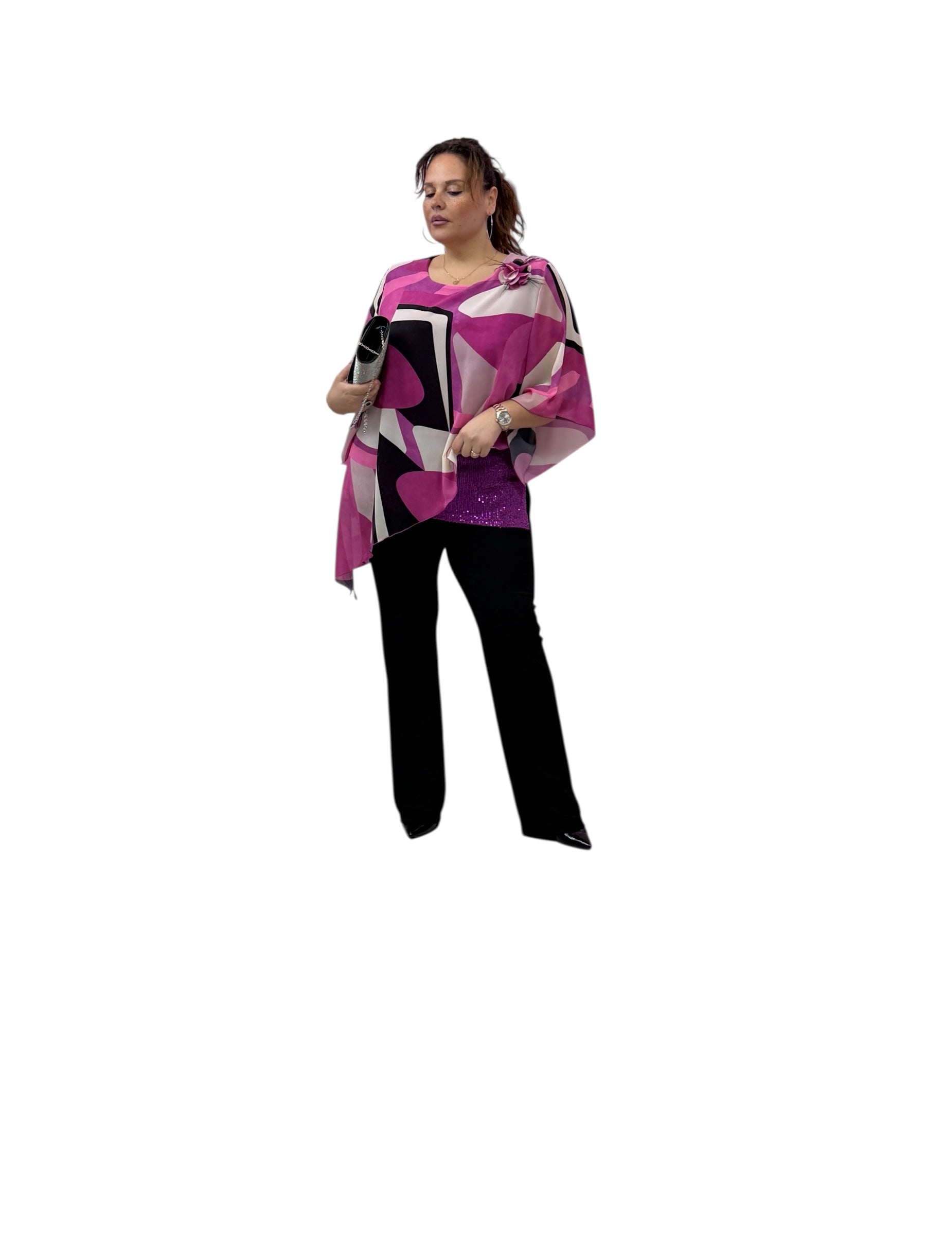 Casacca over in georgette fantasia con top in Jersey e fascia in paiette