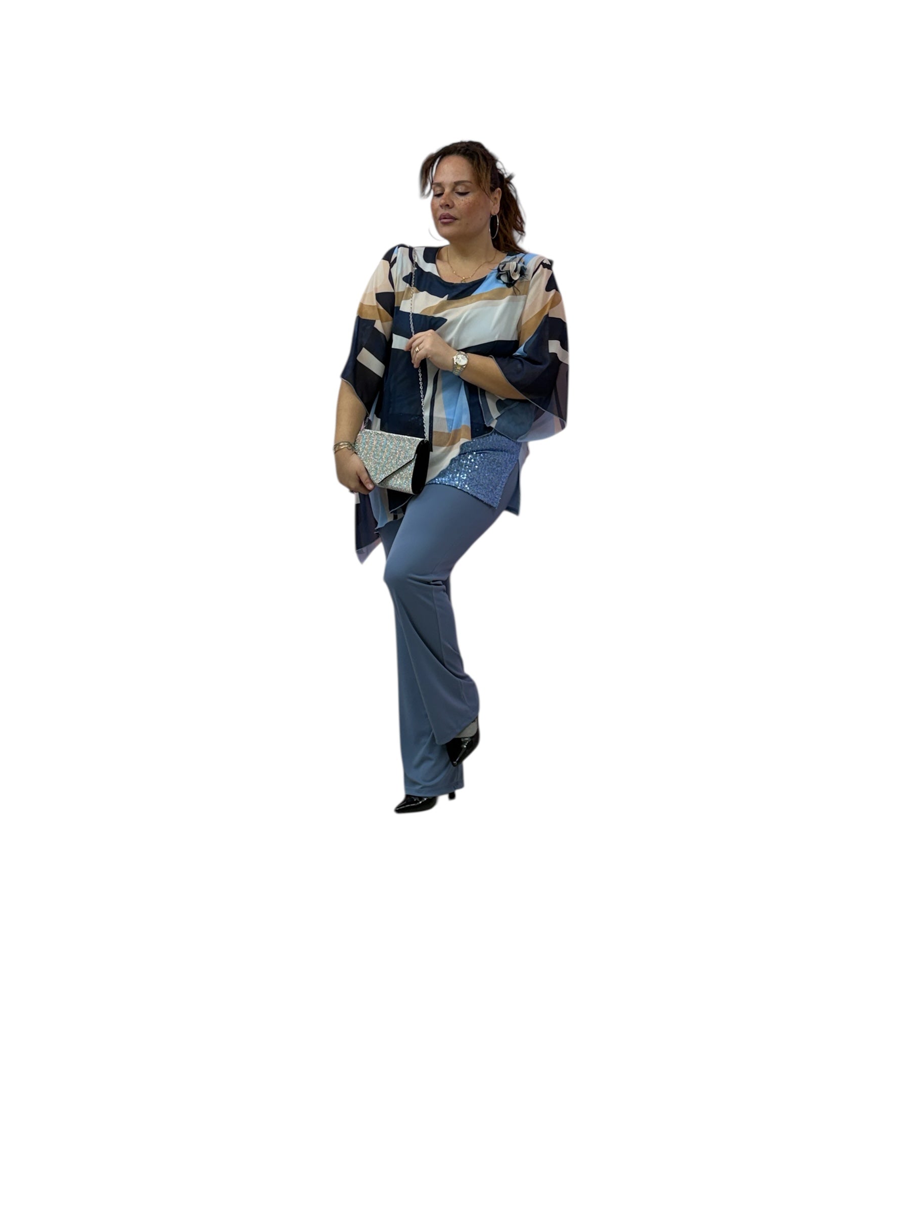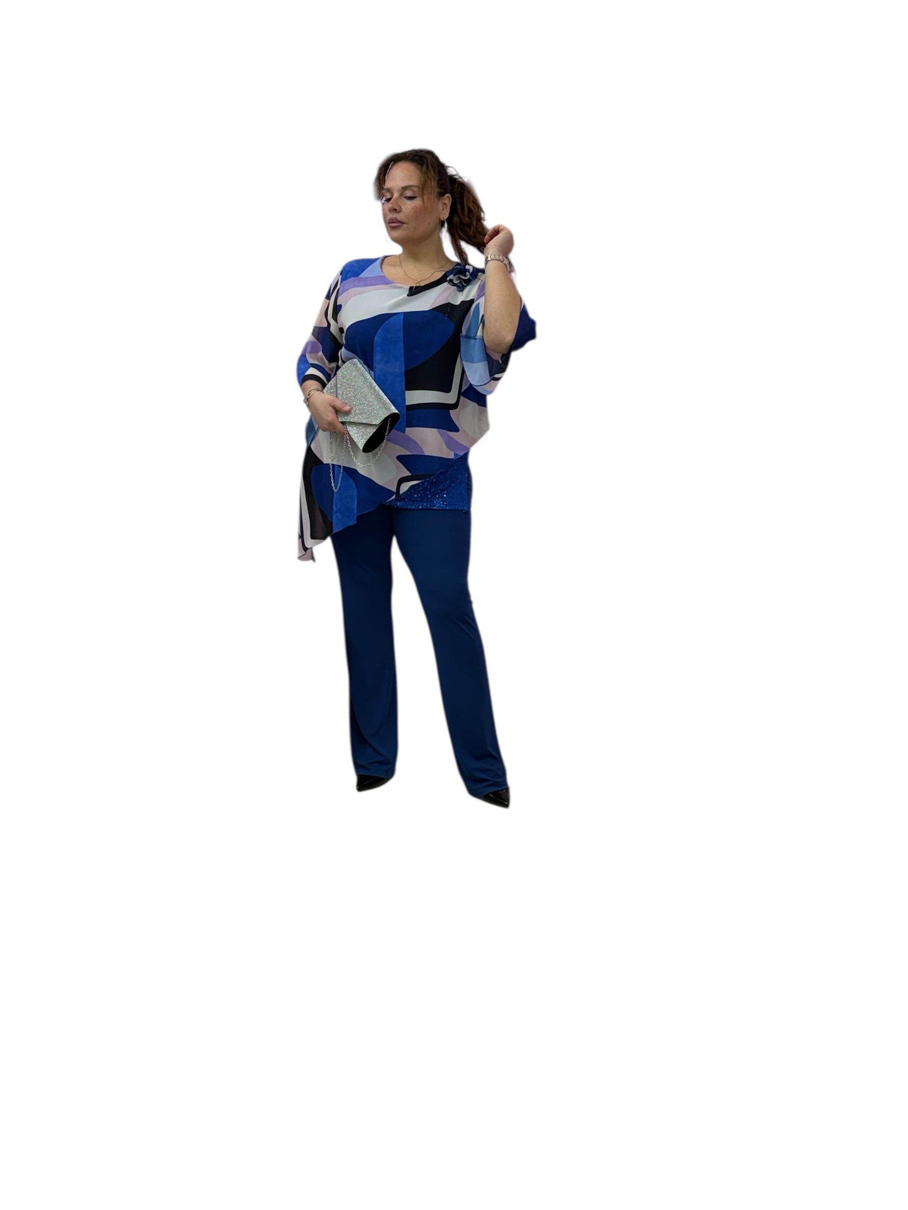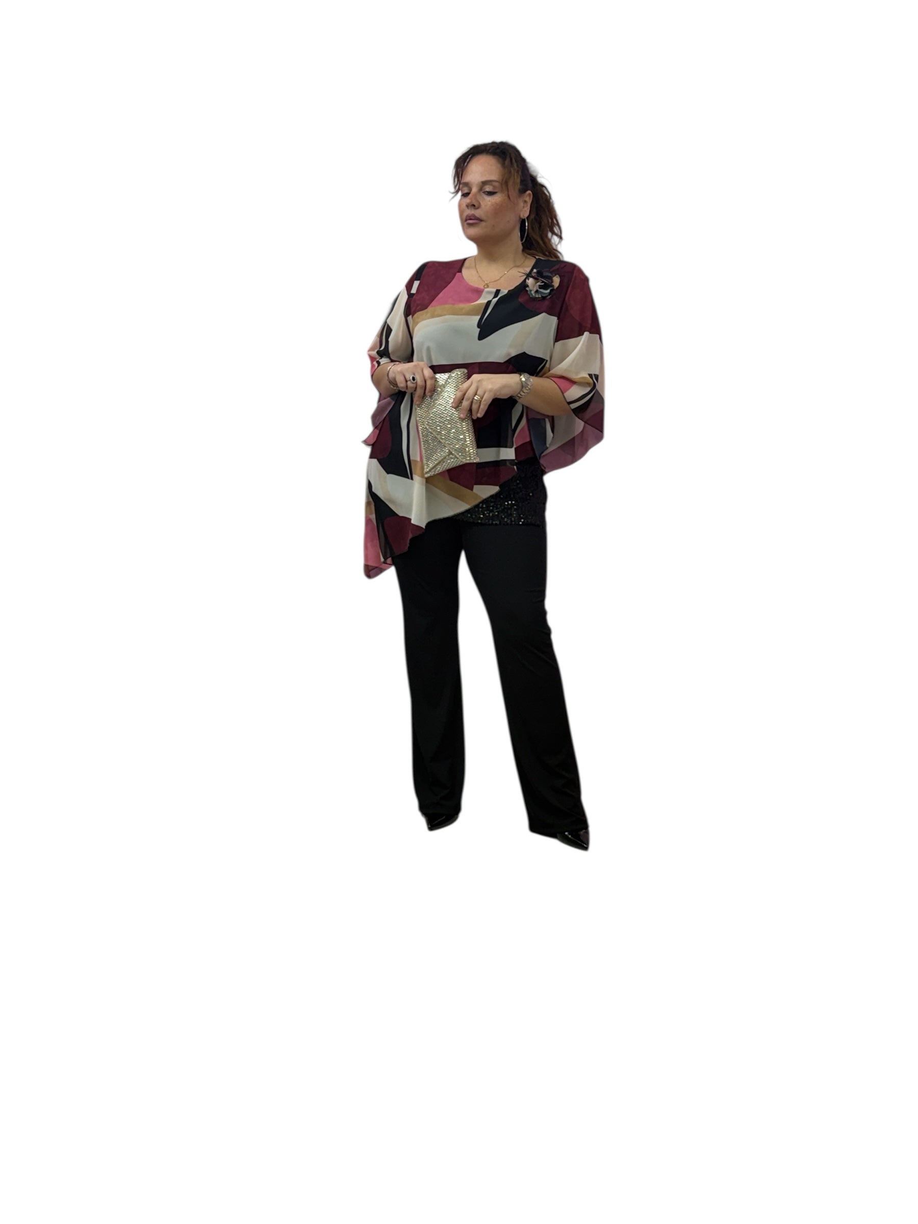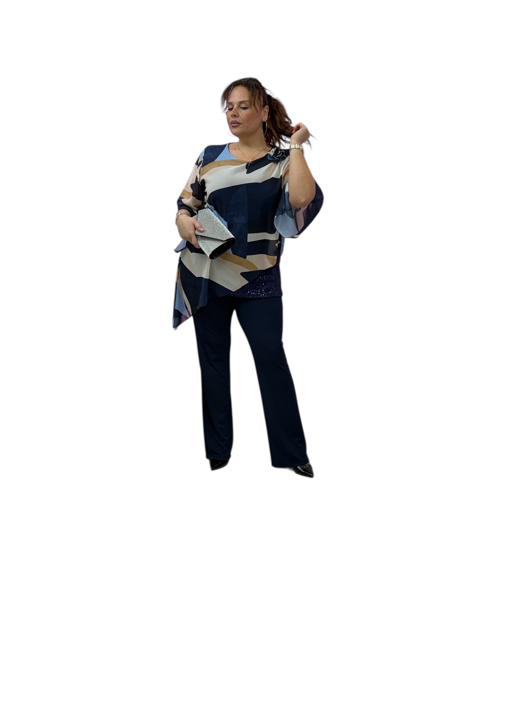Casacca over in georgette fantasia con top in Jersey e fascia in paiette