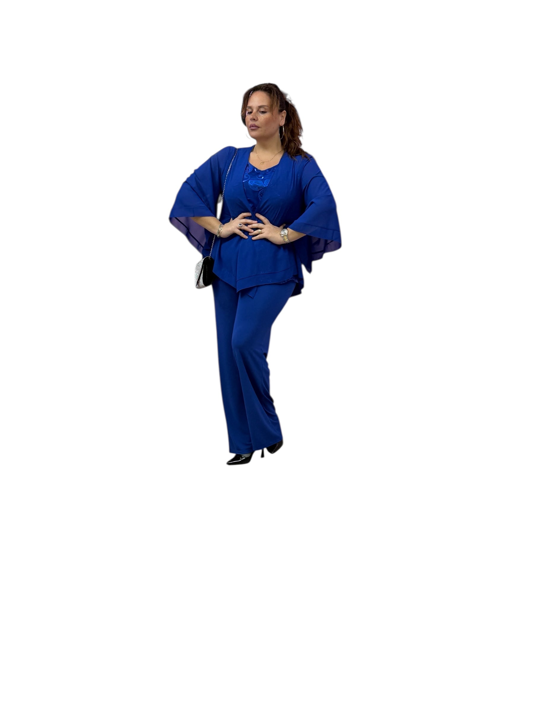 Completo over 3 pezzi con spolverino in georgette,top in maglina con pannello lavorato avanti rete e paiette, pantaloni palazzo in jersey con elastico in vita