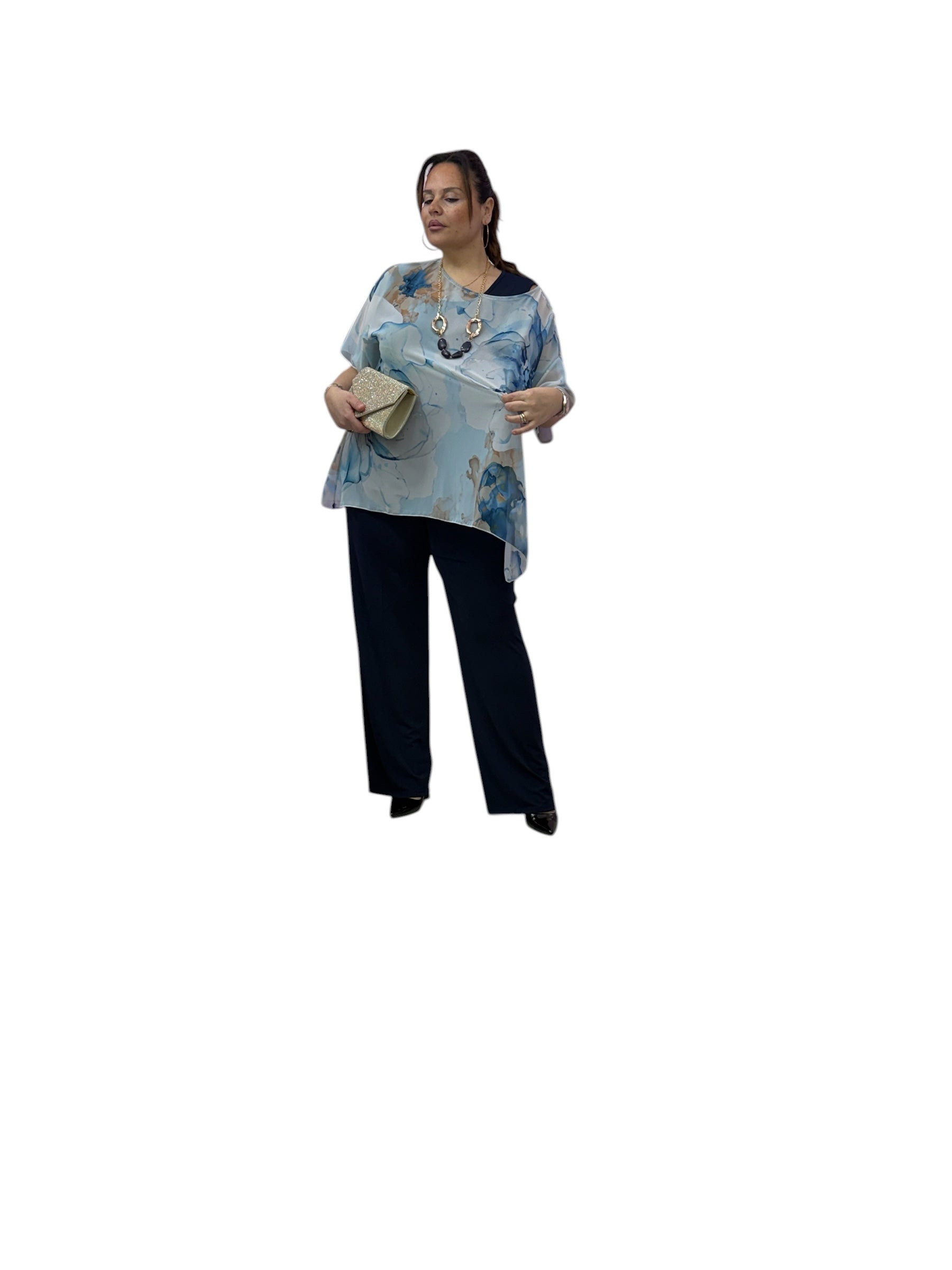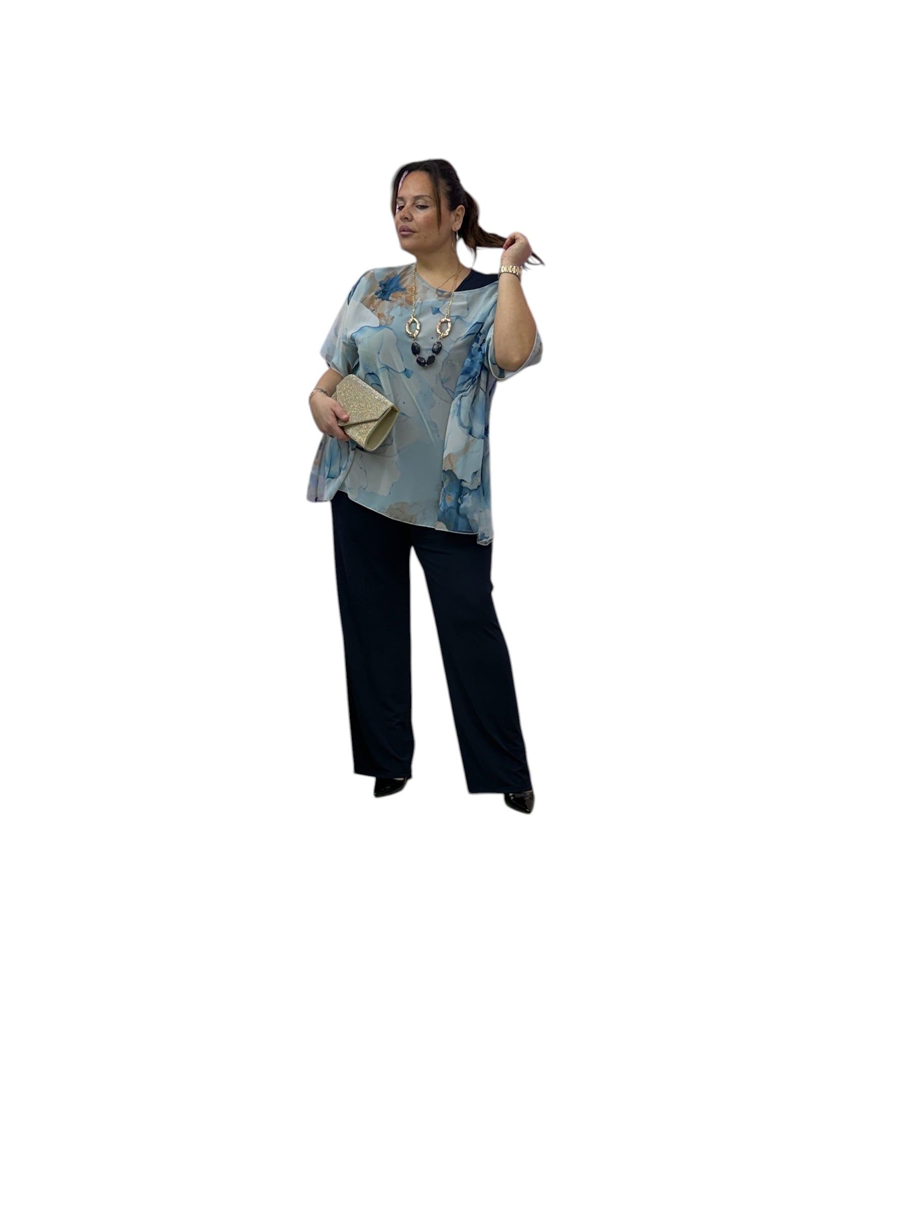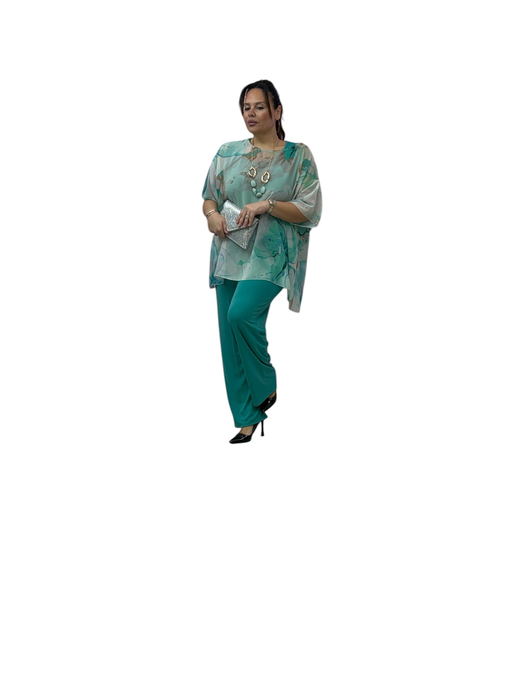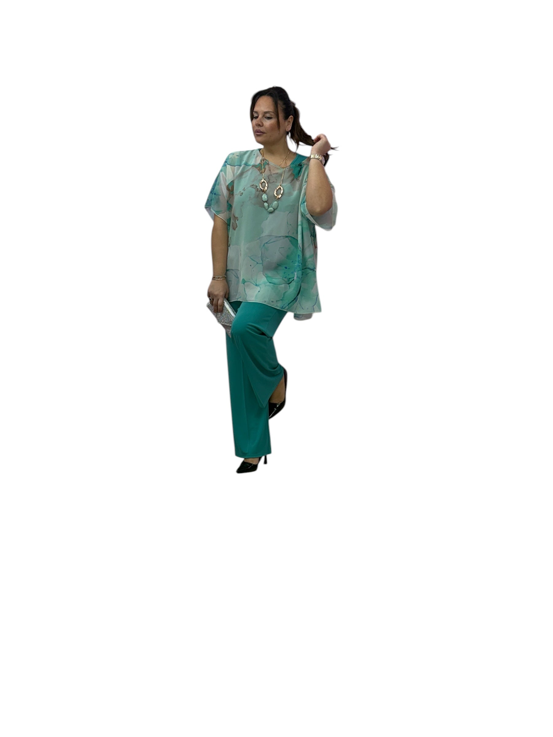 Completo over elegante con twin-set ,top in Jersey e casacca in georgette fantasia e pantaloni palazzo in Jersey con elastico in vita