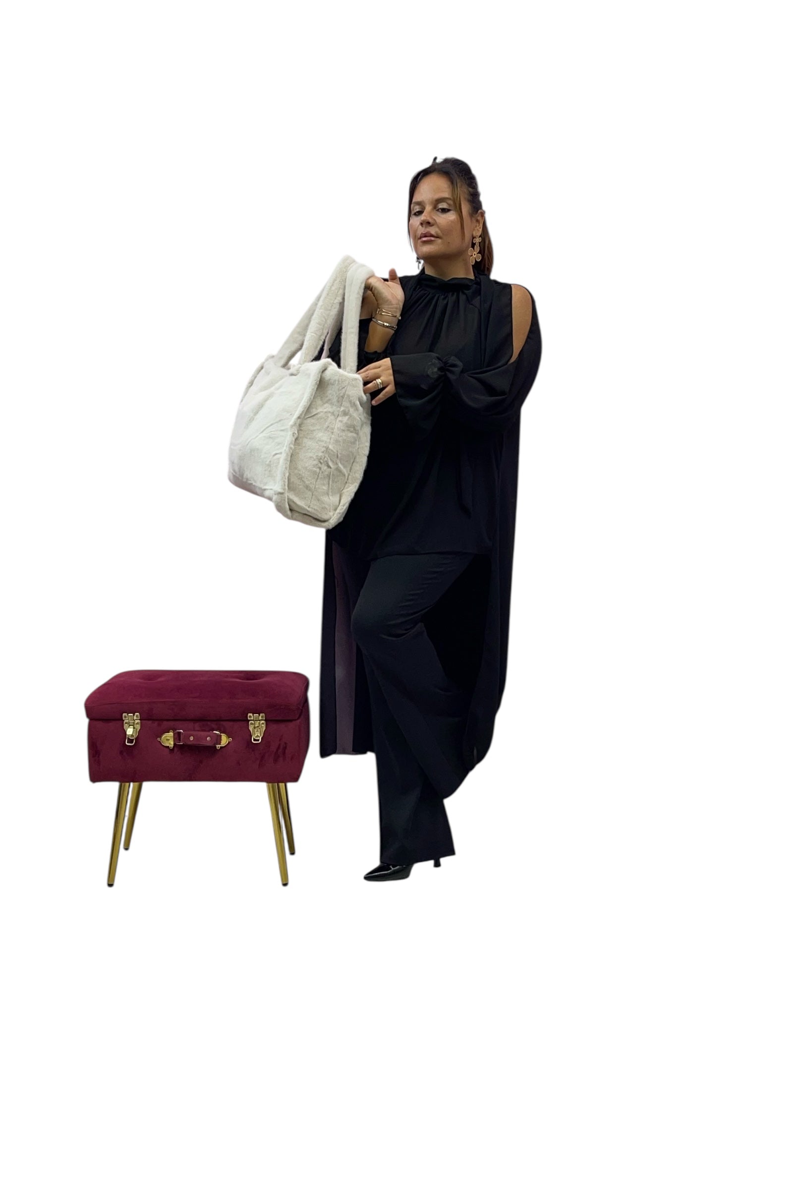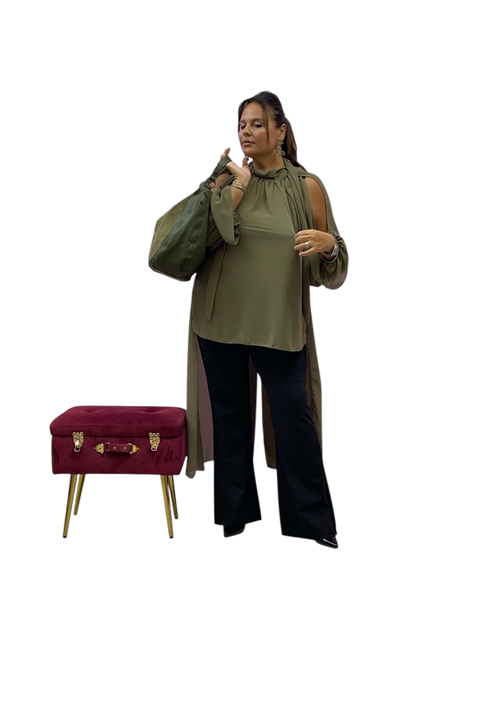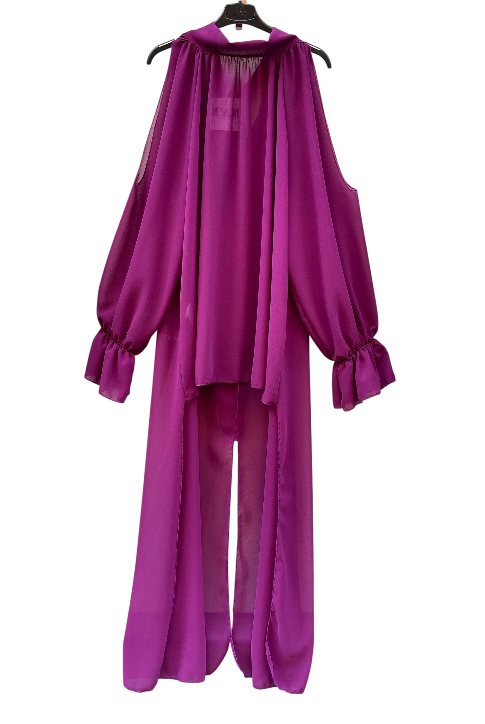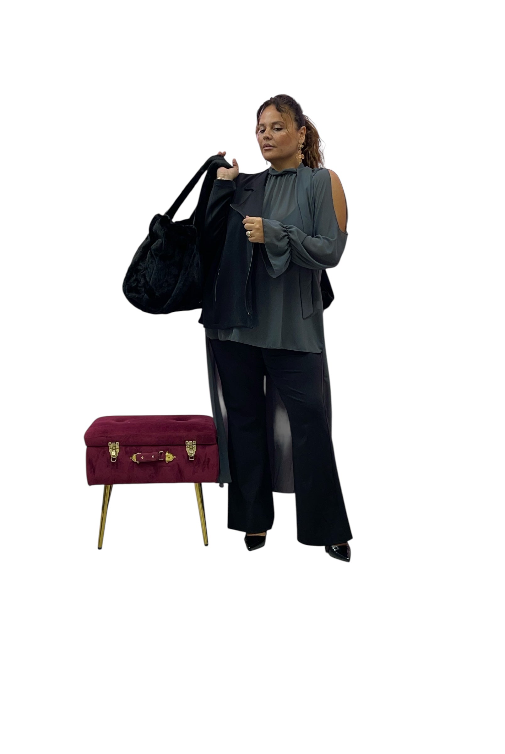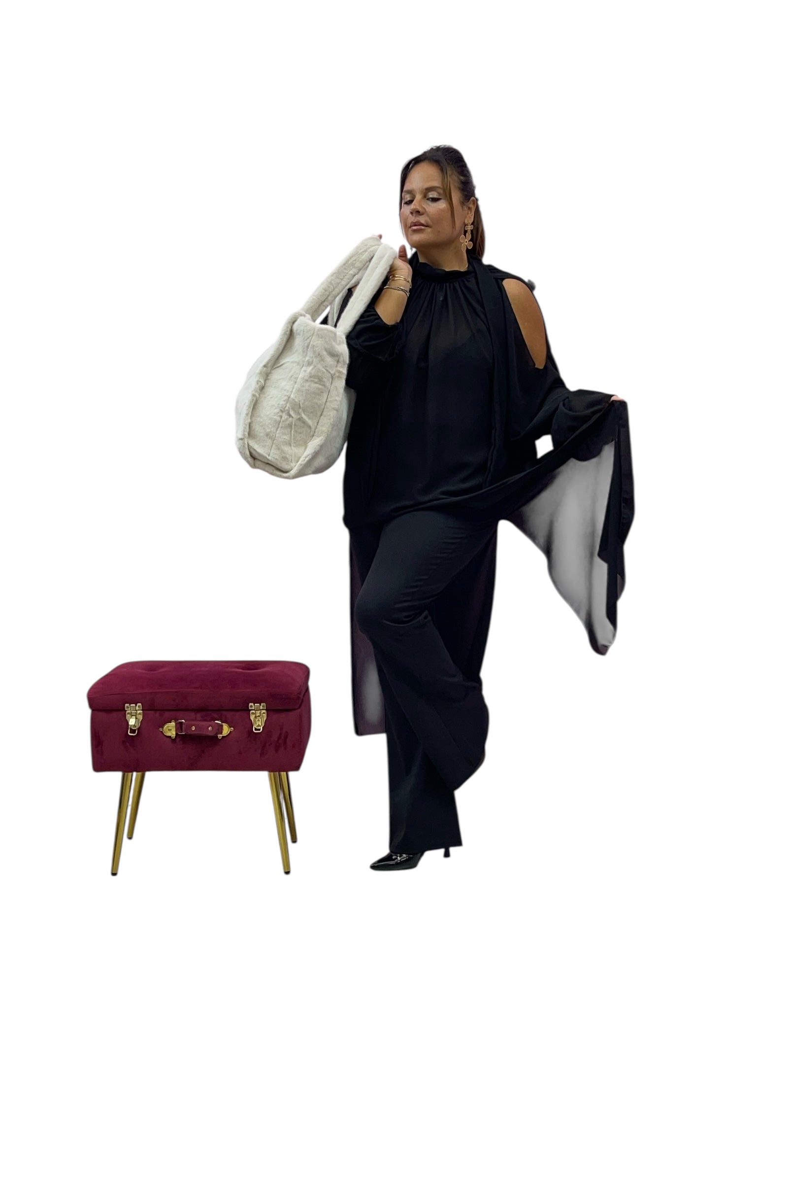 Completo in pizzo e velluto foderato con pantaloni palazzo a zampa ed elastico in vita