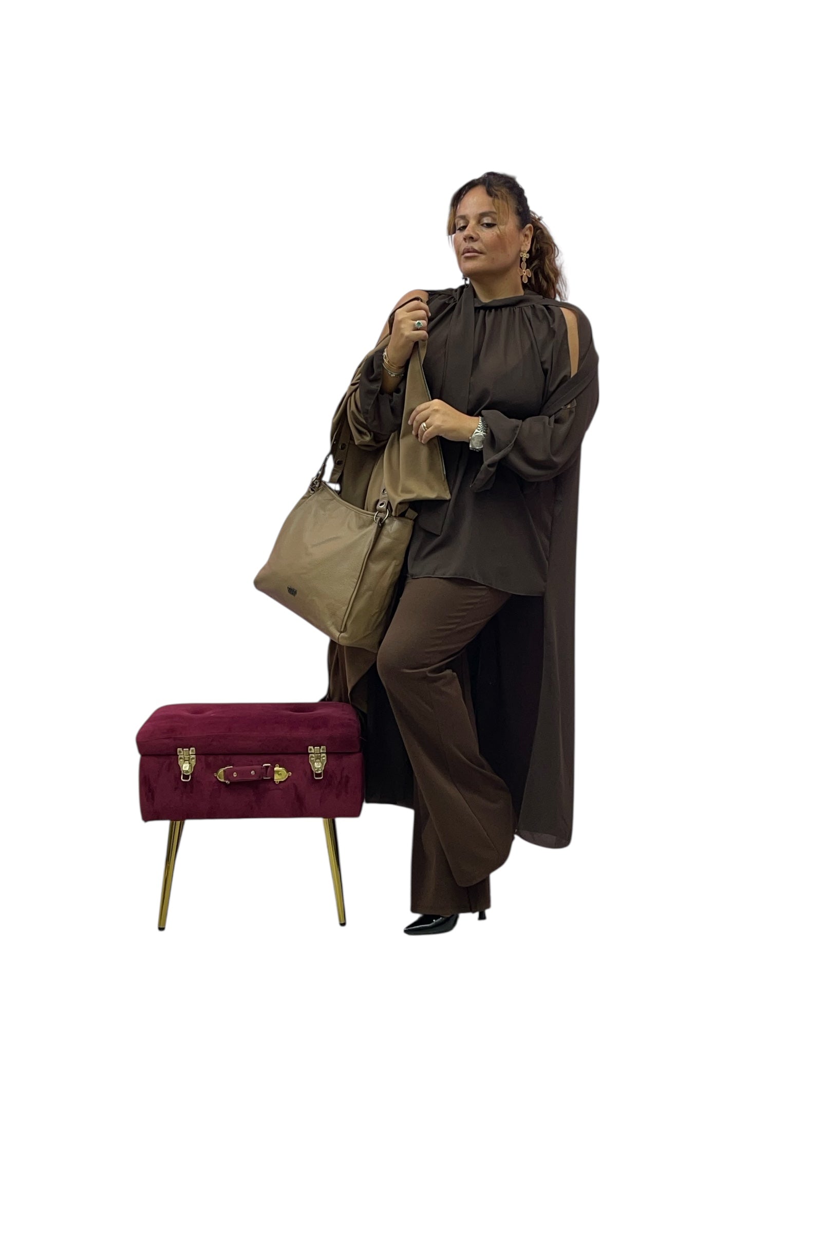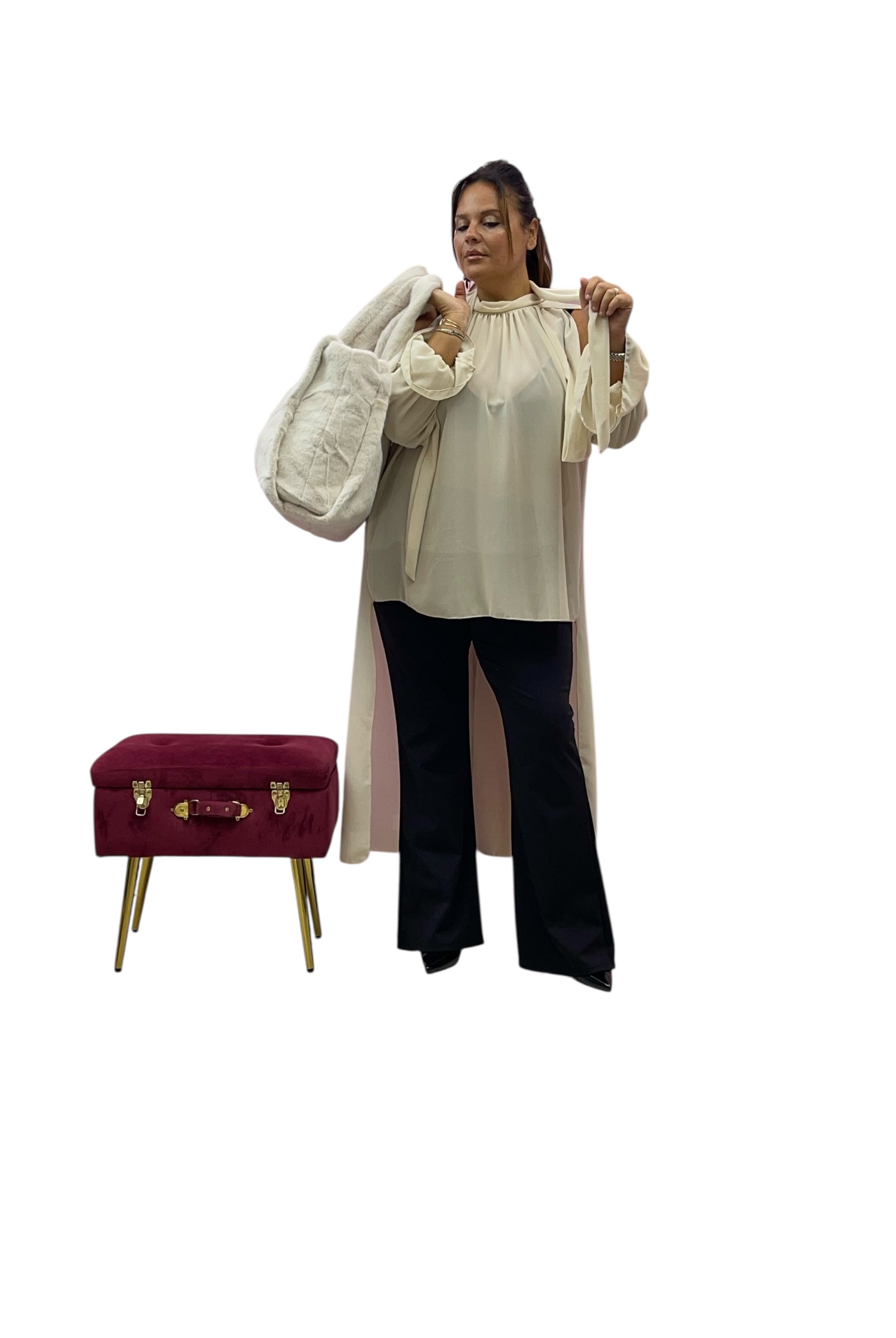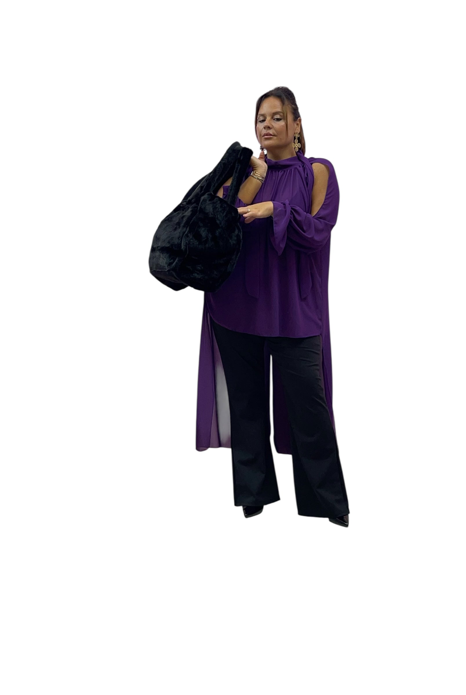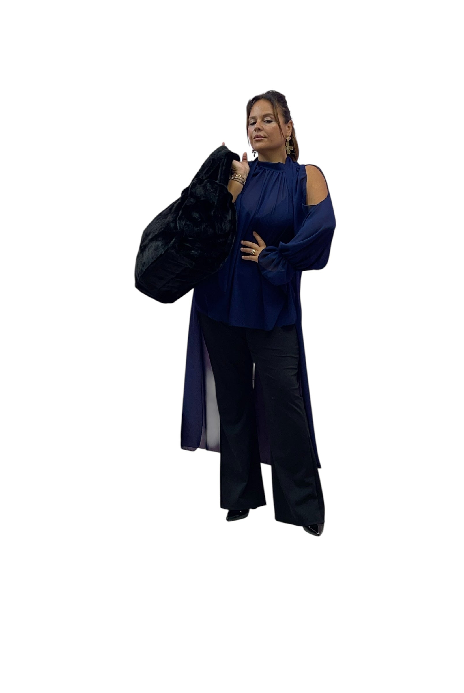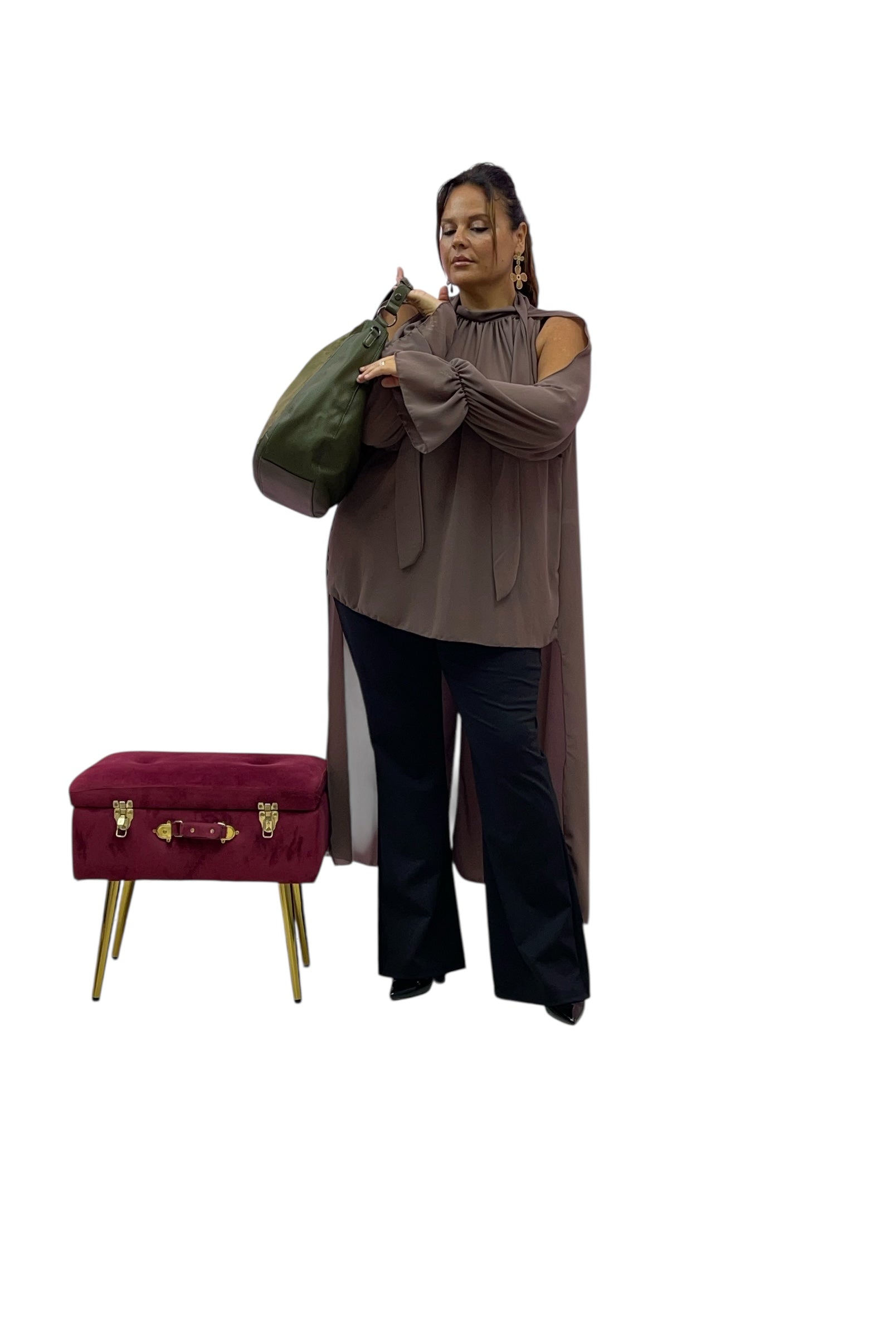 Completo in pizzo e velluto foderato con pantaloni palazzo a zampa ed elastico in vita