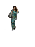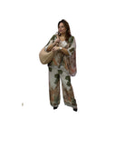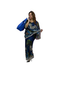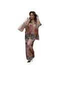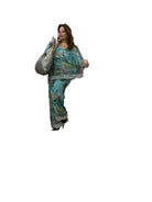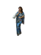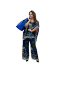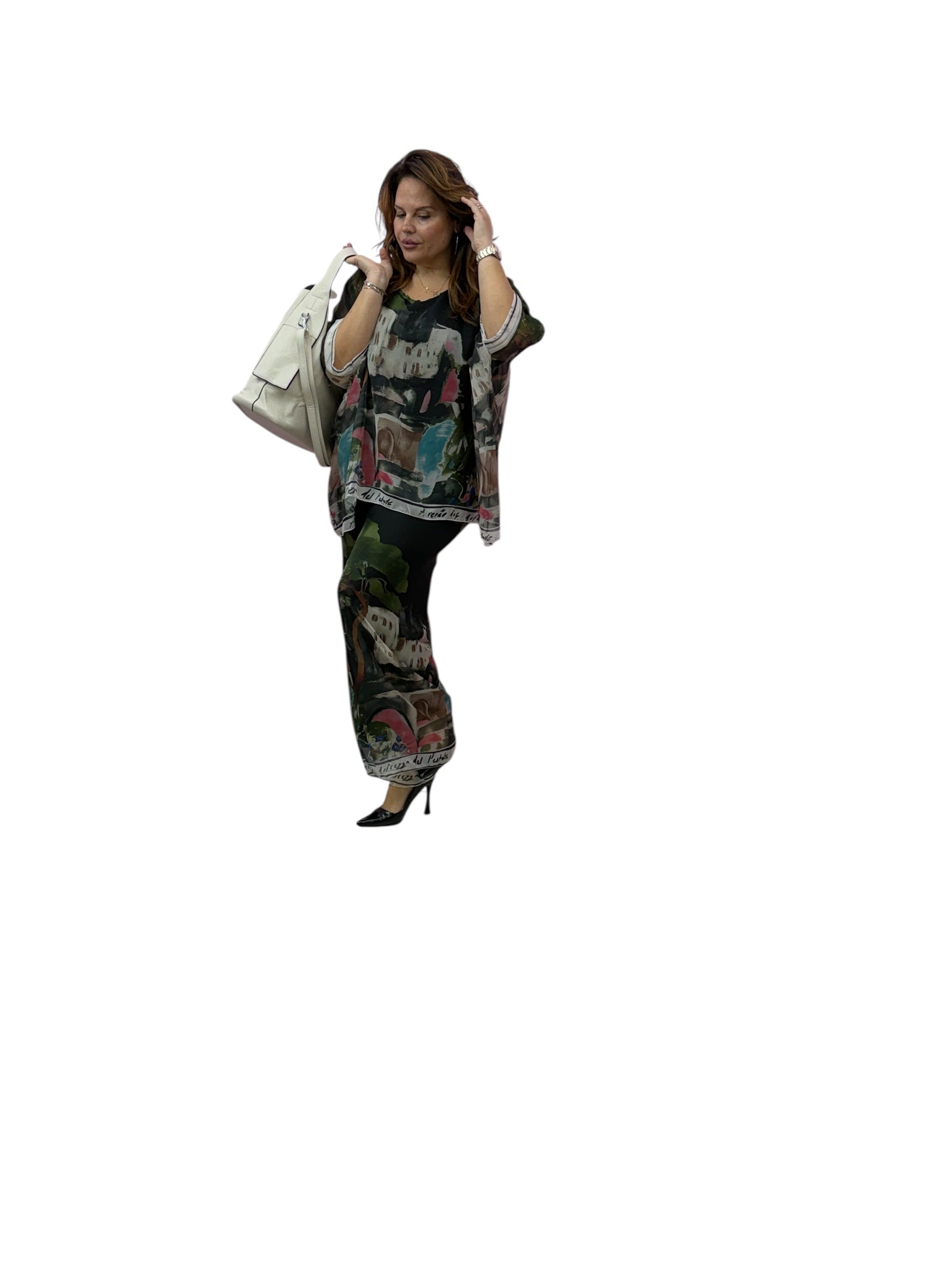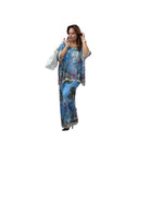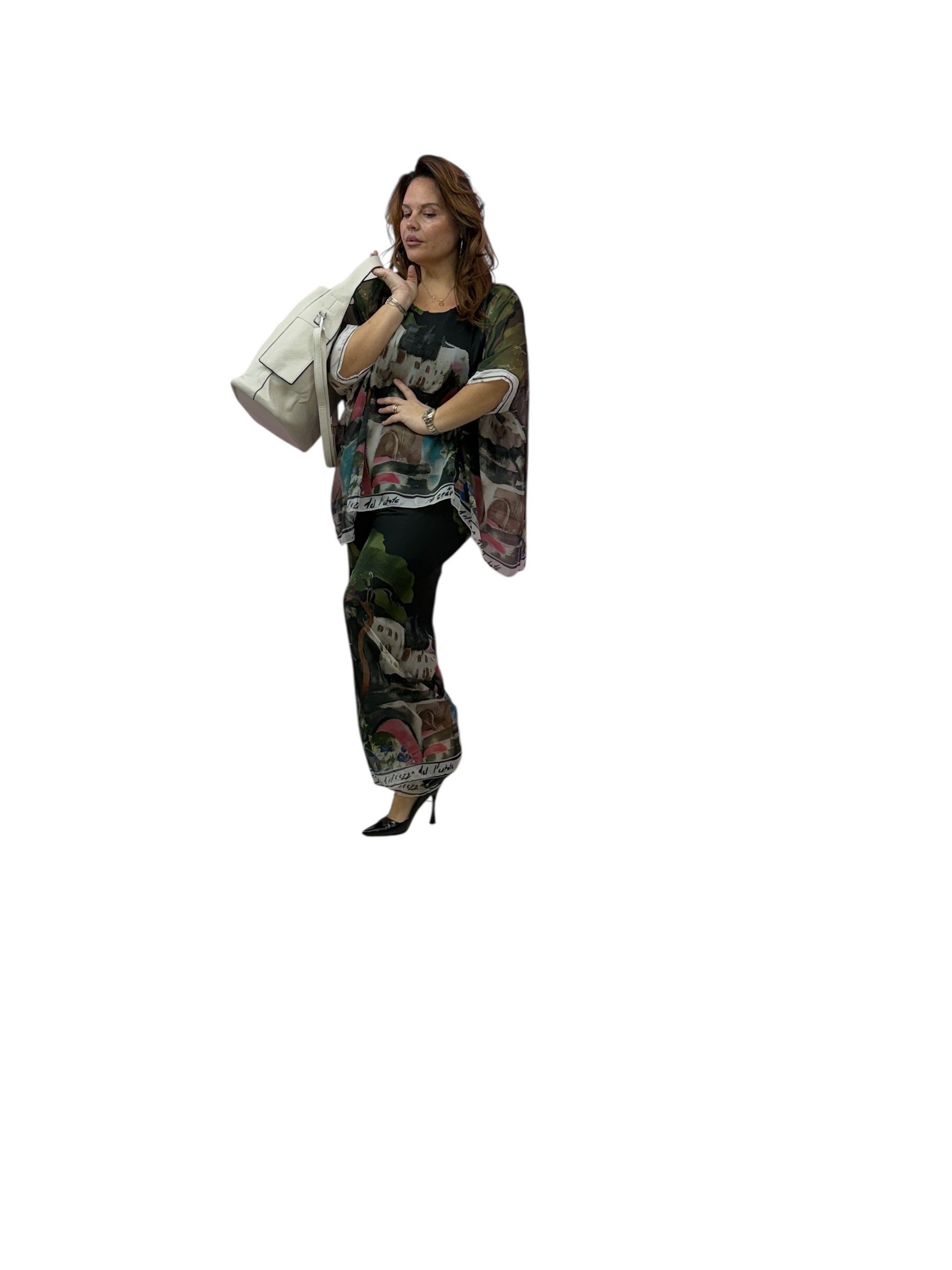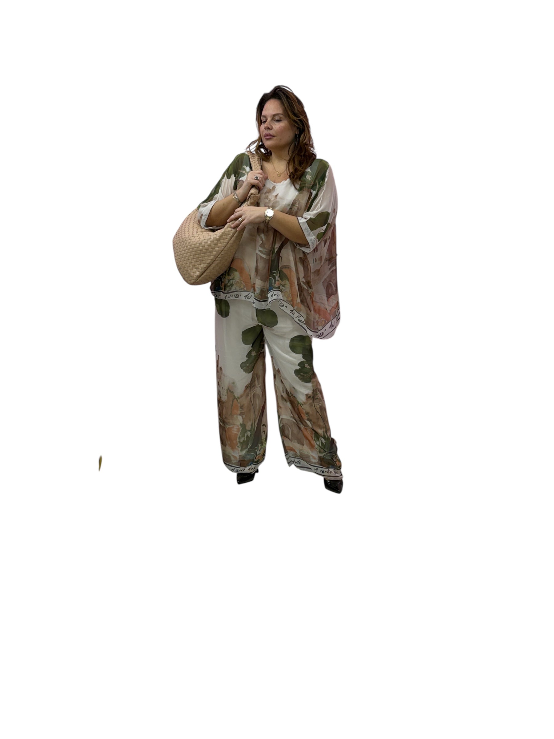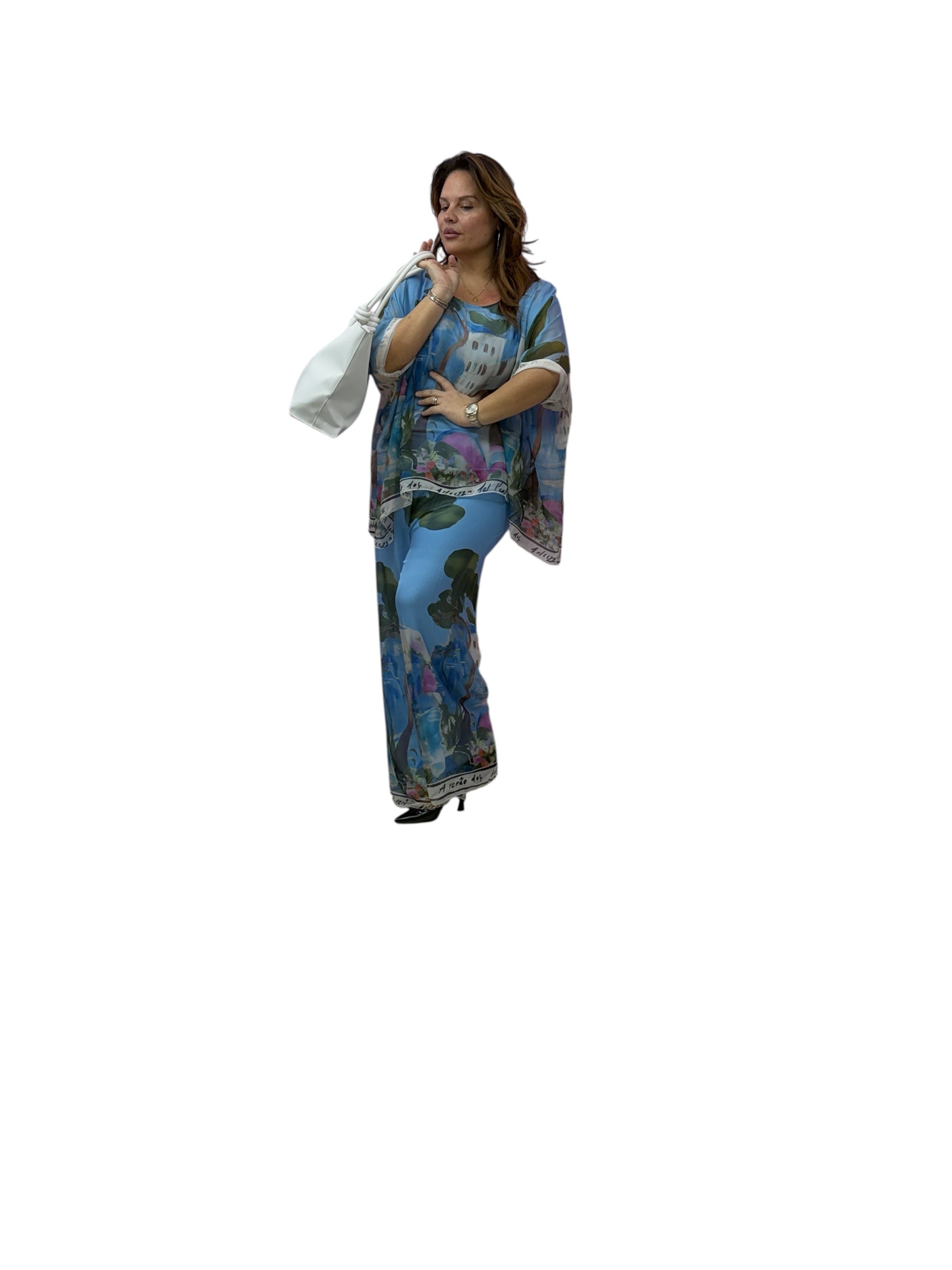 Completo over con casacca modello fazzoletto in georgette e top in maglina cucito,pantaloni con il sotto in maglina e sopra in georgette
