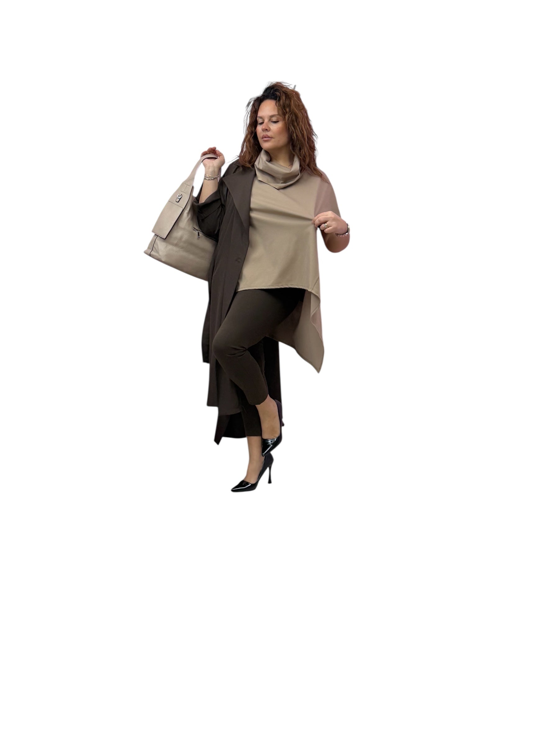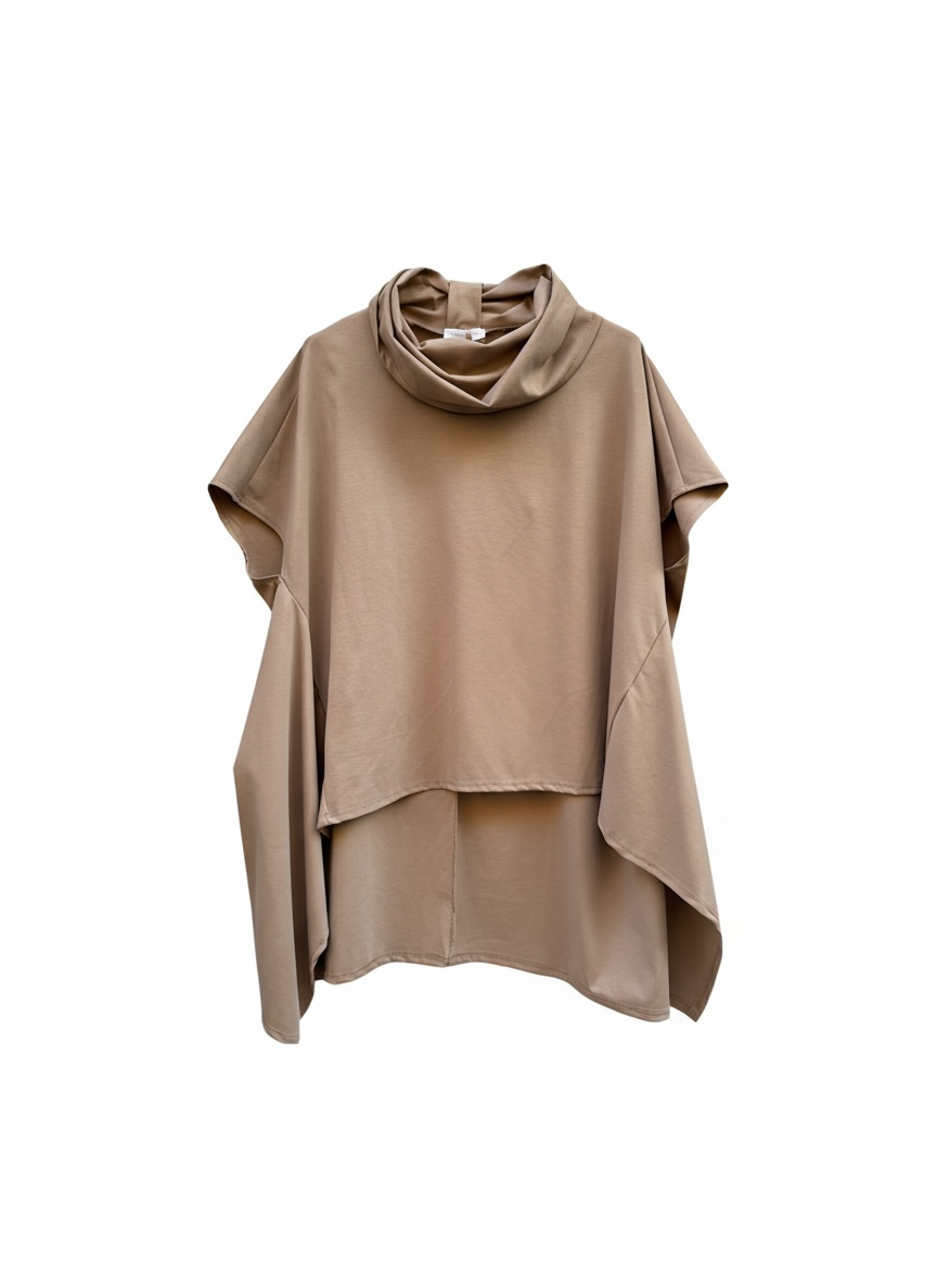 Magliettone over mezza manica,collo ad anello ,corto avanti lungo dietro e svasato lateralmente