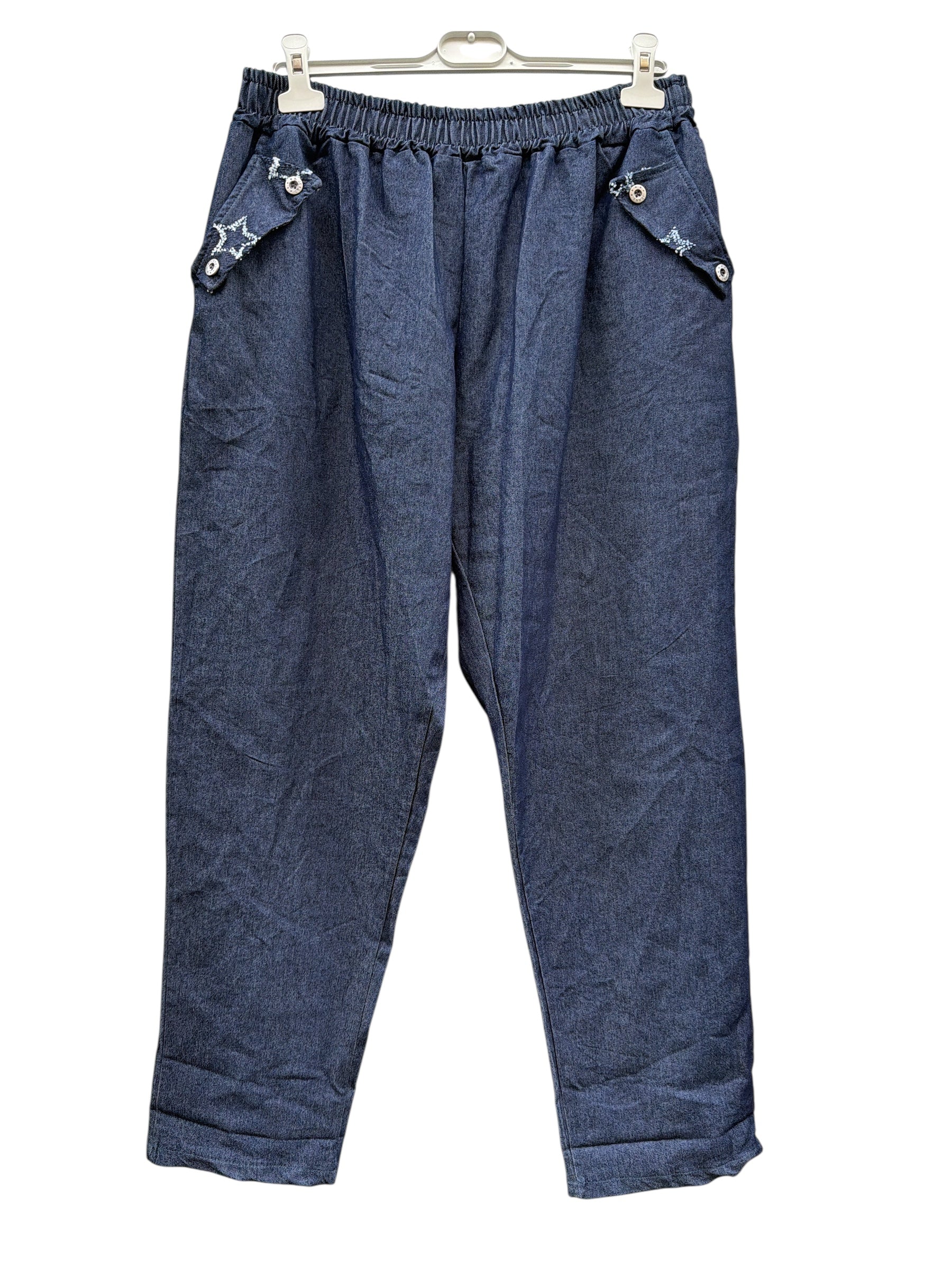Pantaloni over modello morbido con elastico in vita e tasche con stelle ricamate