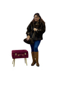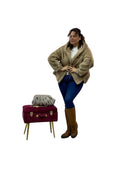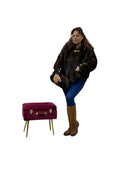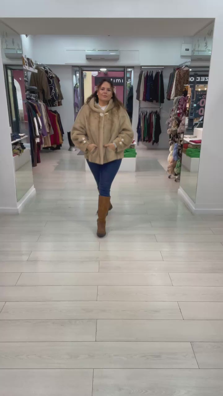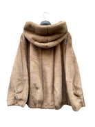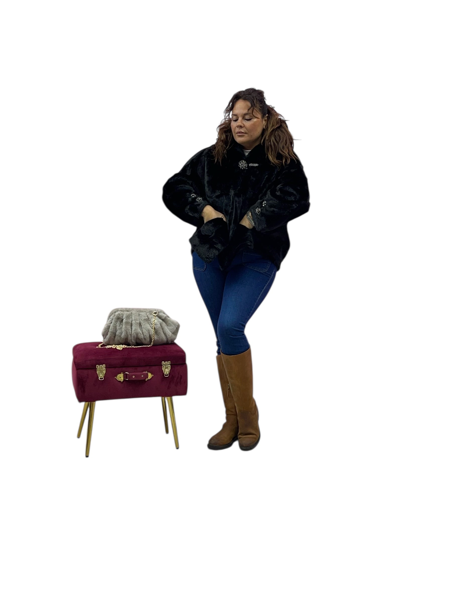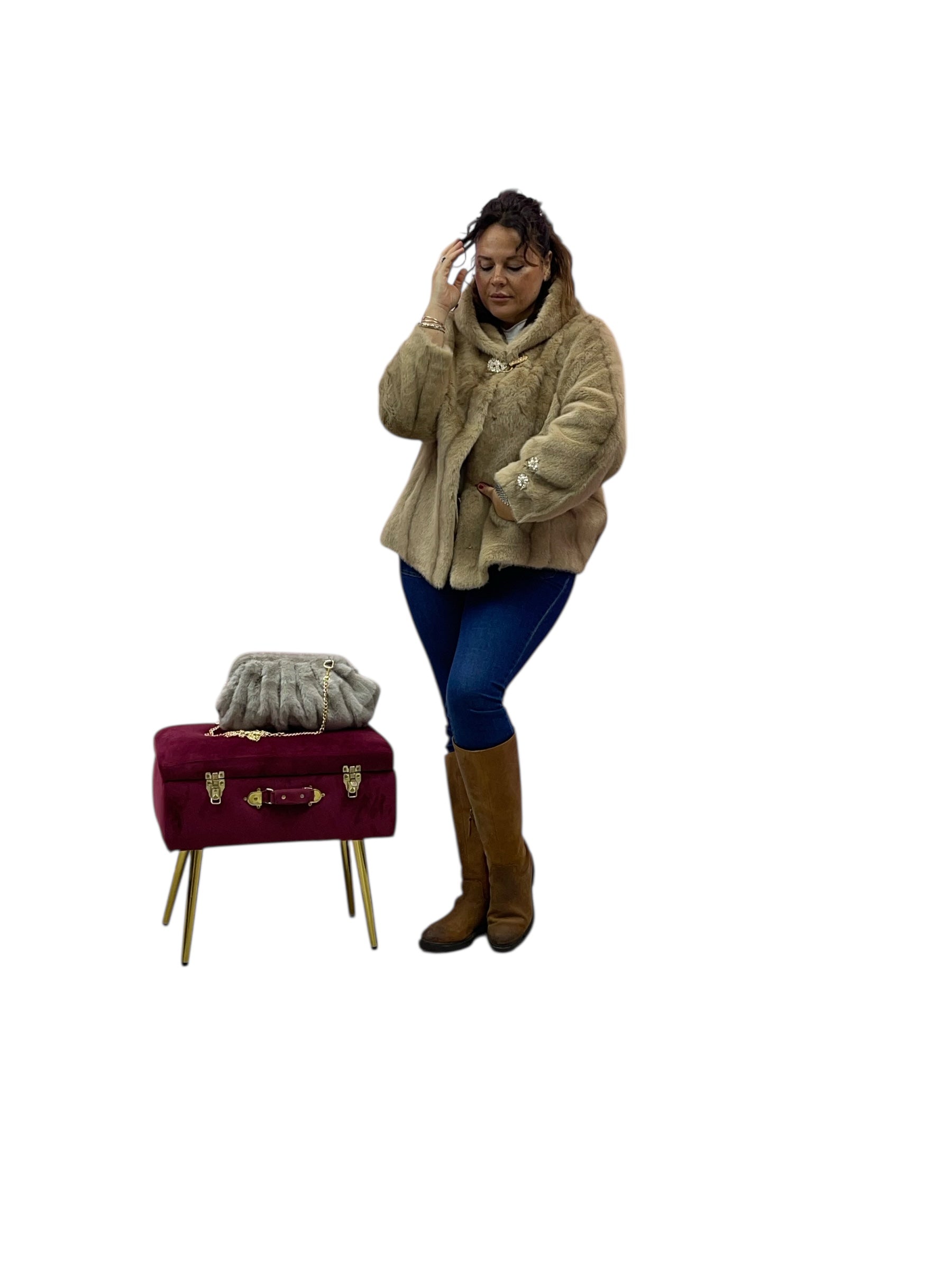 Ecopelliccia con cappuccio interno in ecodaino chiusura al collo con grande clip gioiello e bottoni gioiello al polso